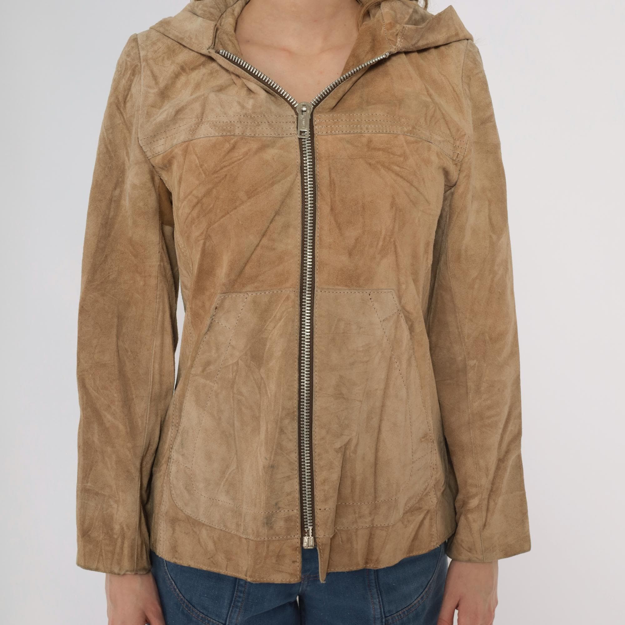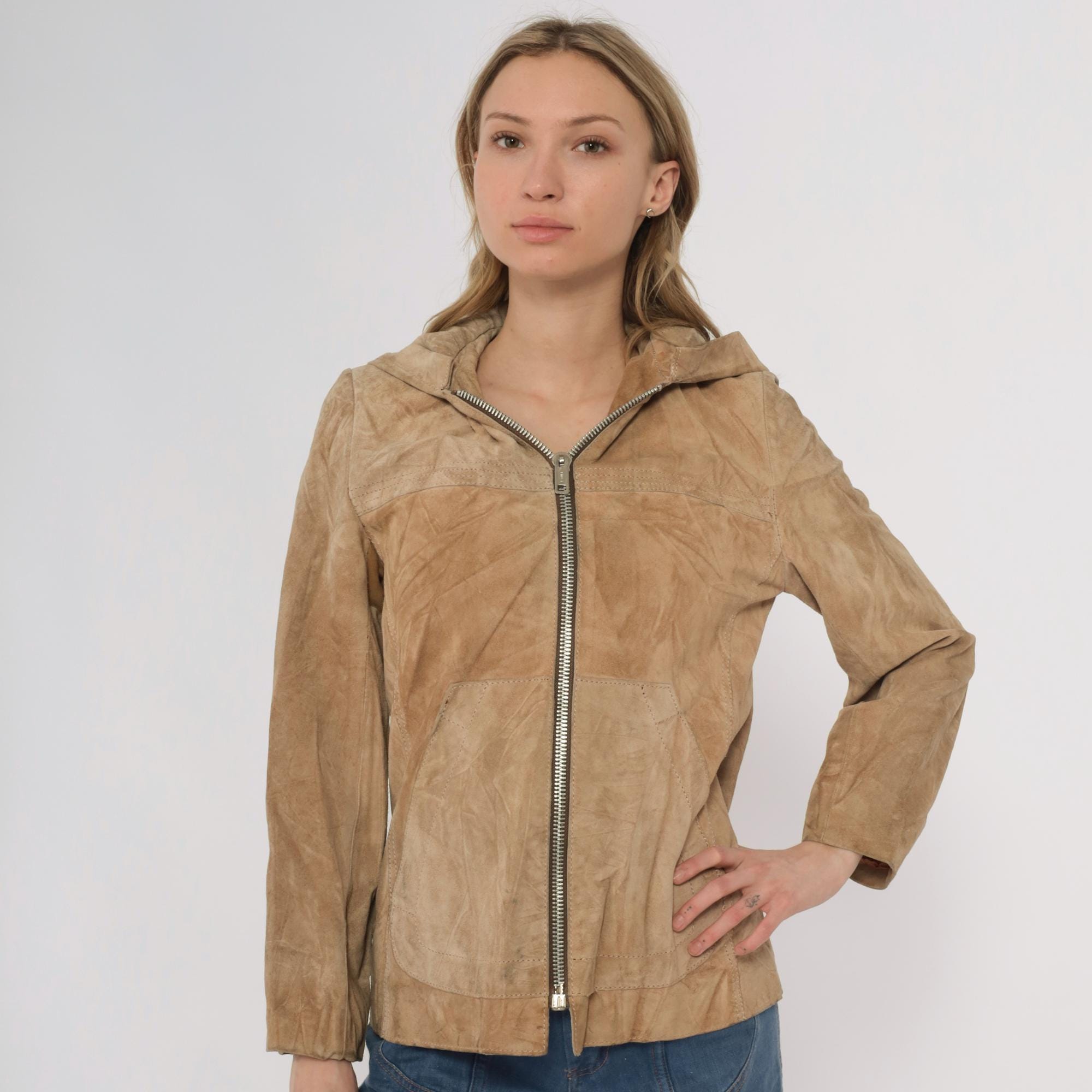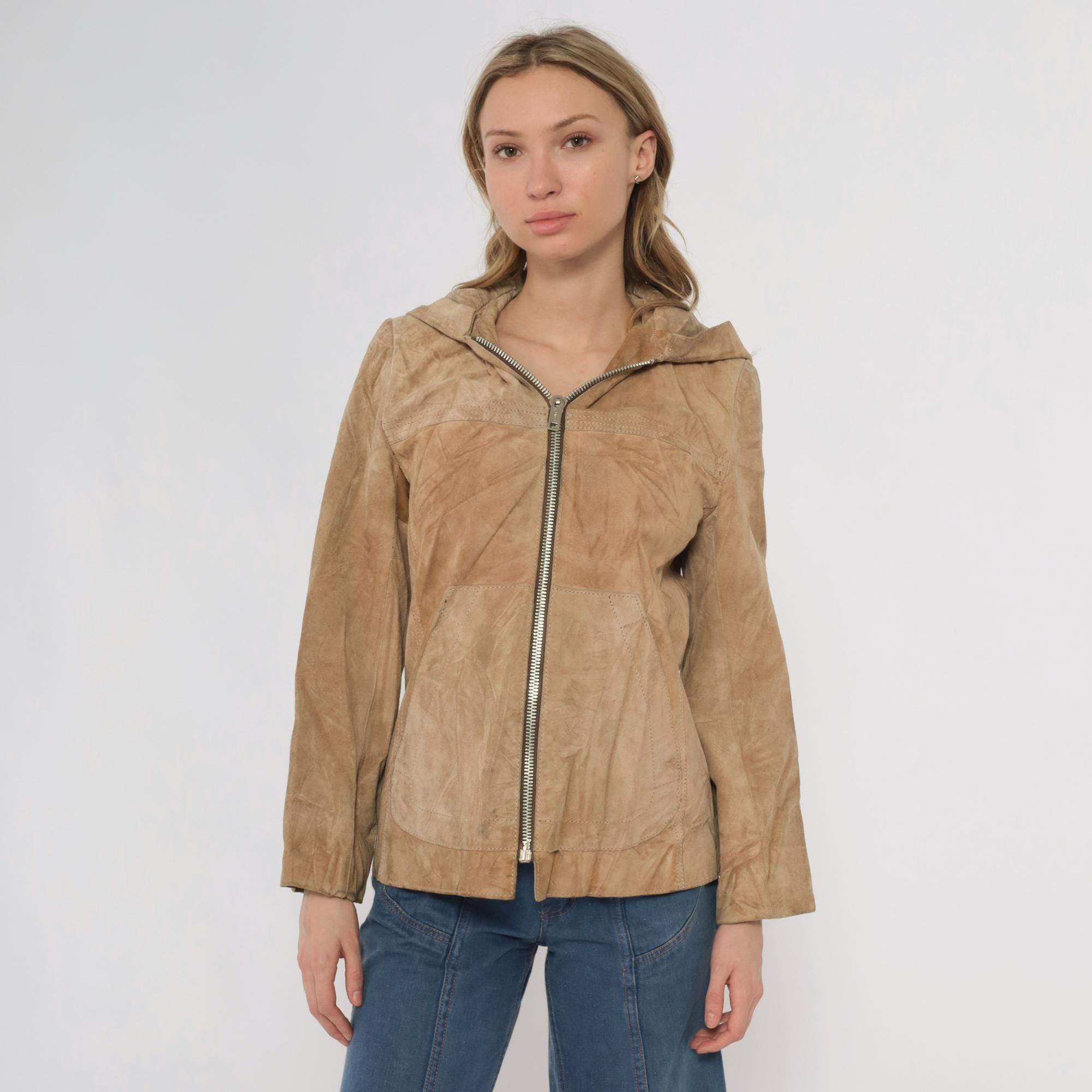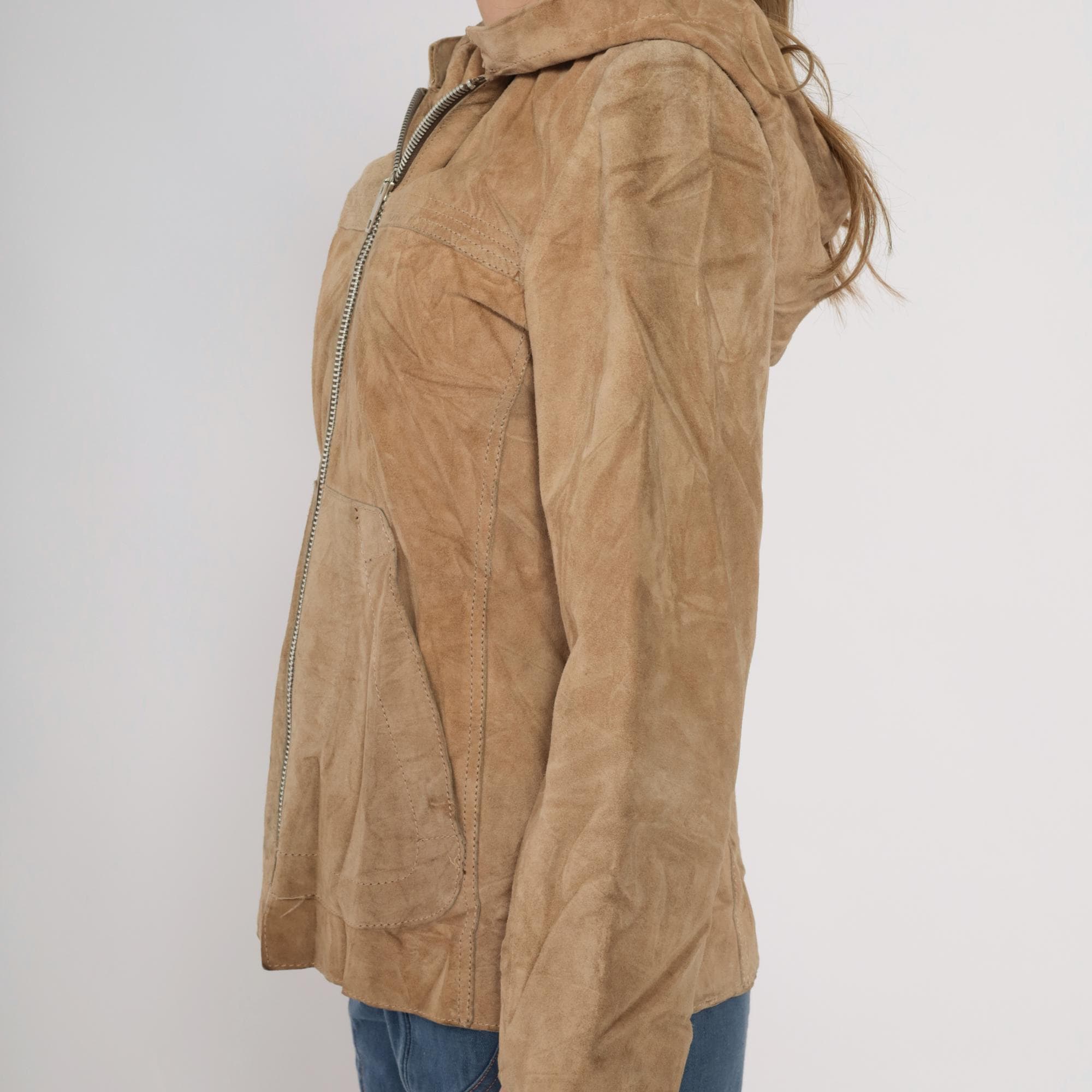 70s tan suede hooded jacket with front zip closure. Features attached hood and silver zipper hardware.