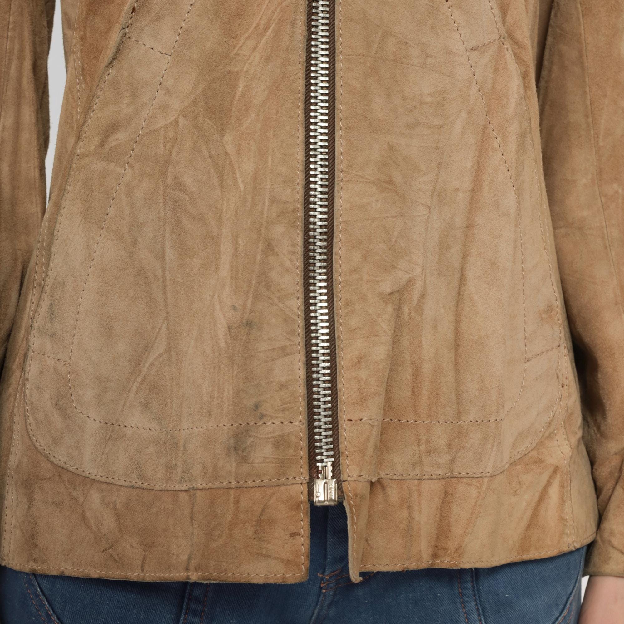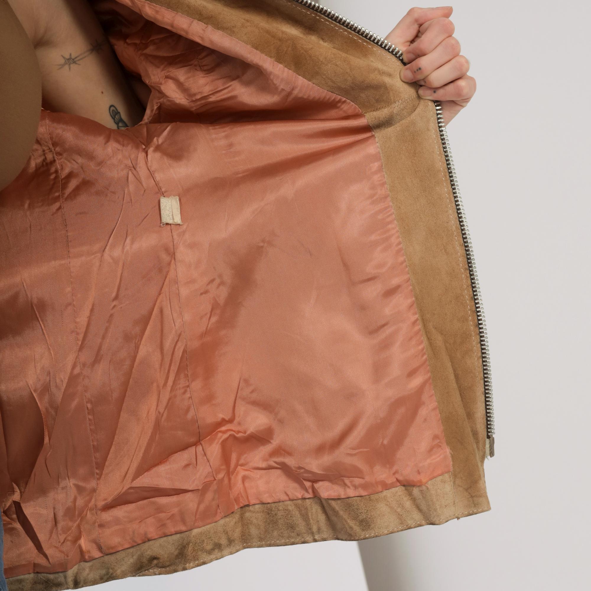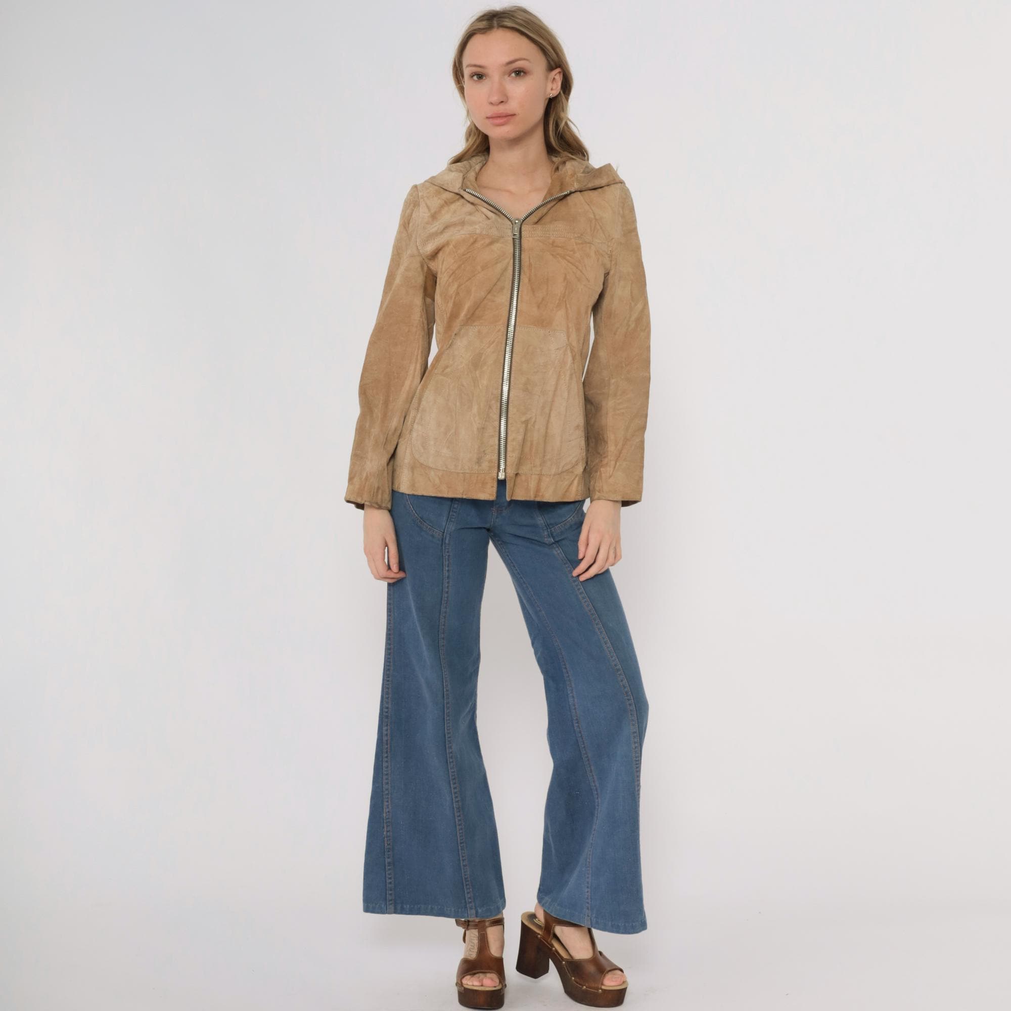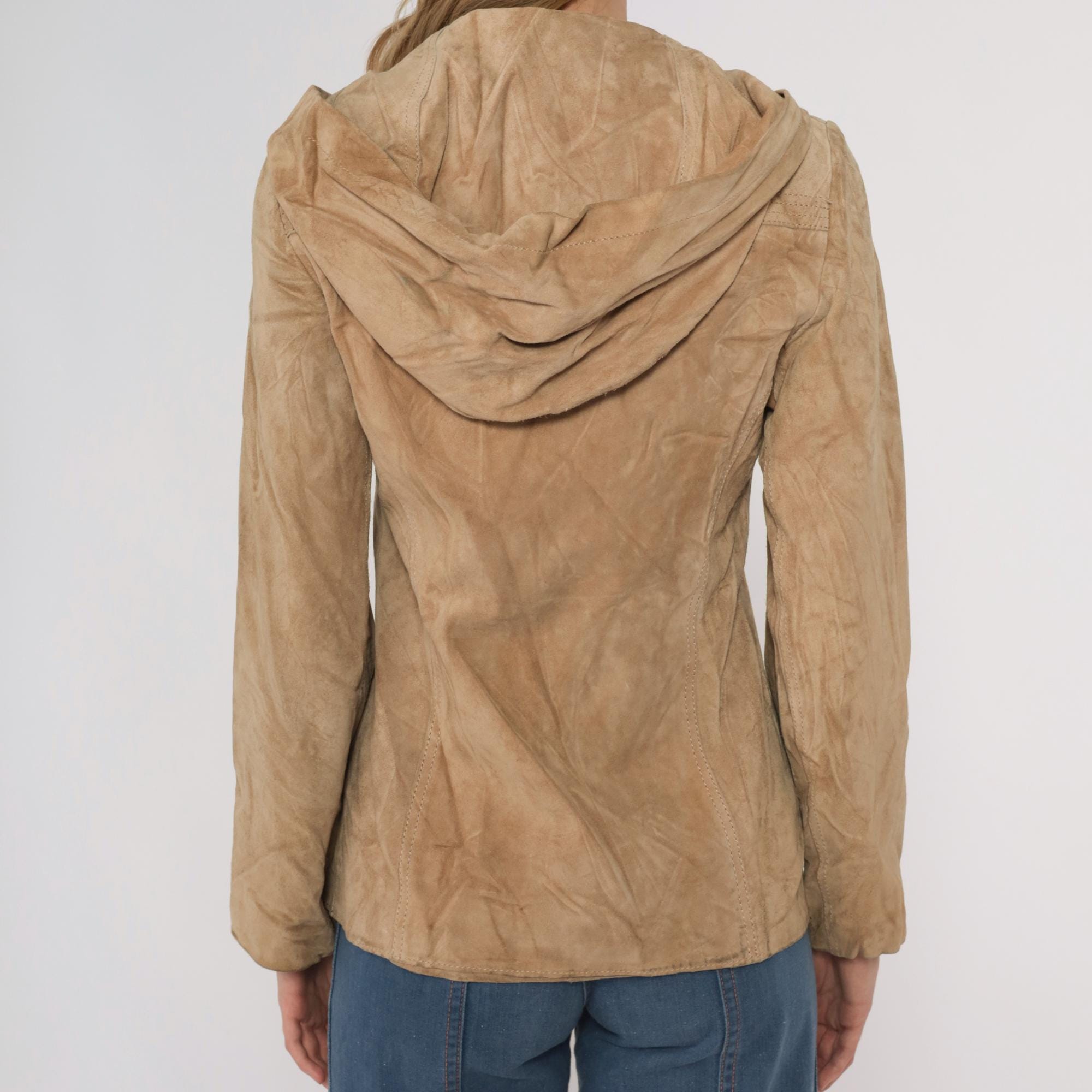 70s tan suede hooded jacket with front zip closure. Features attached hood and silver zipper hardware.