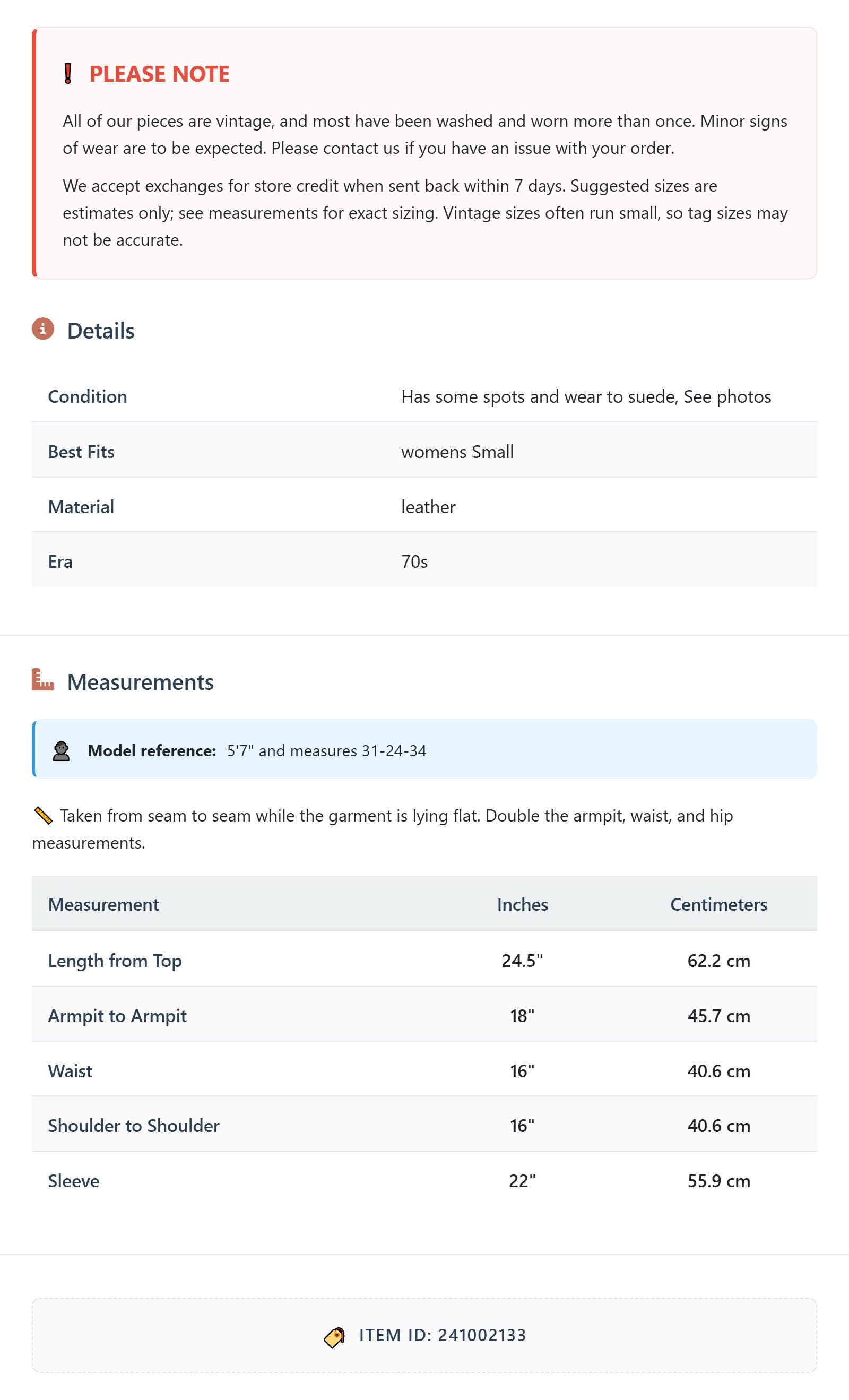 Every garment we sell is authentic vintage and one-of-a-kind! You will receive the exact item photographed.