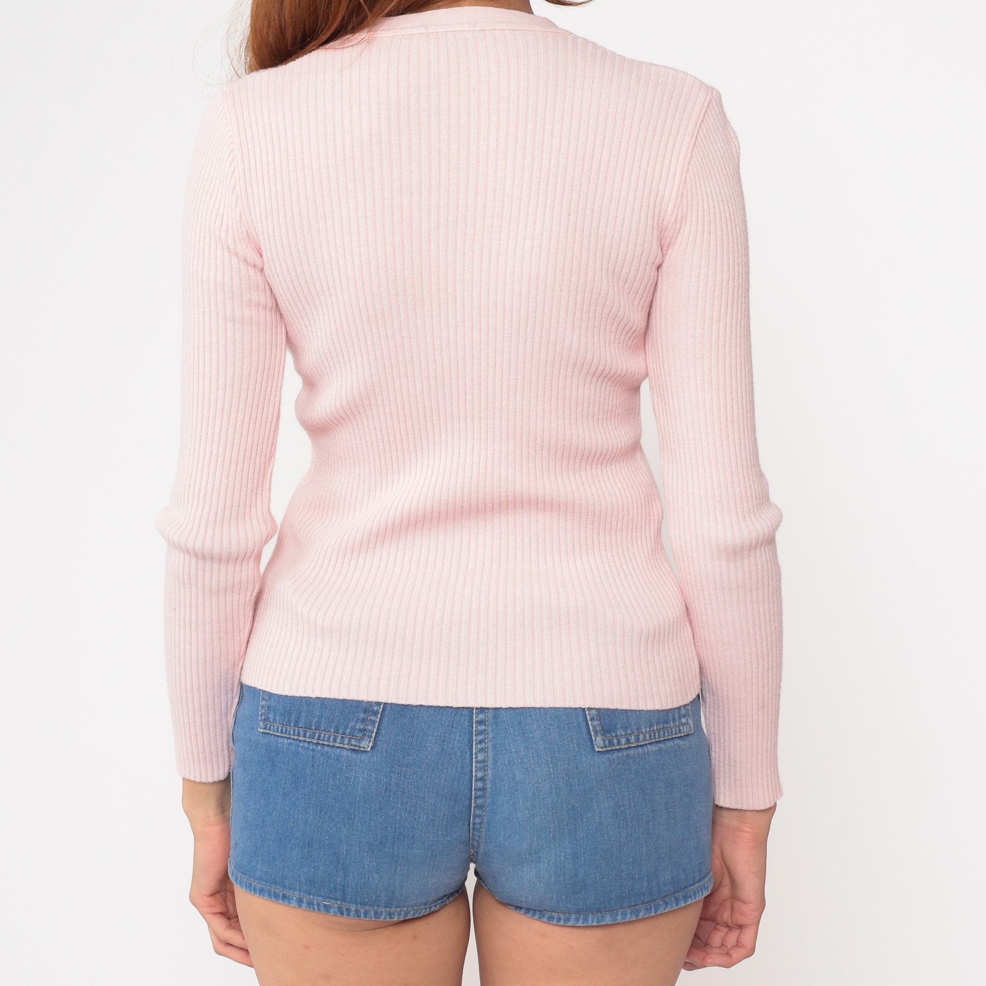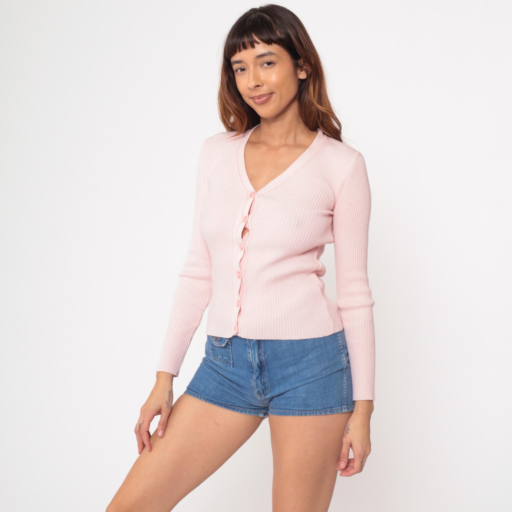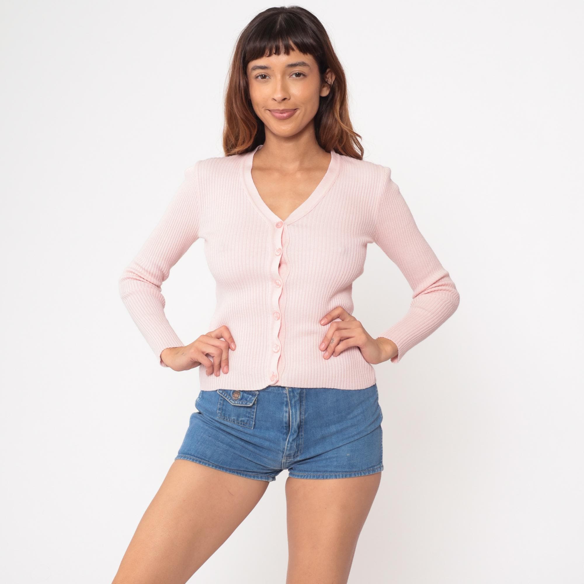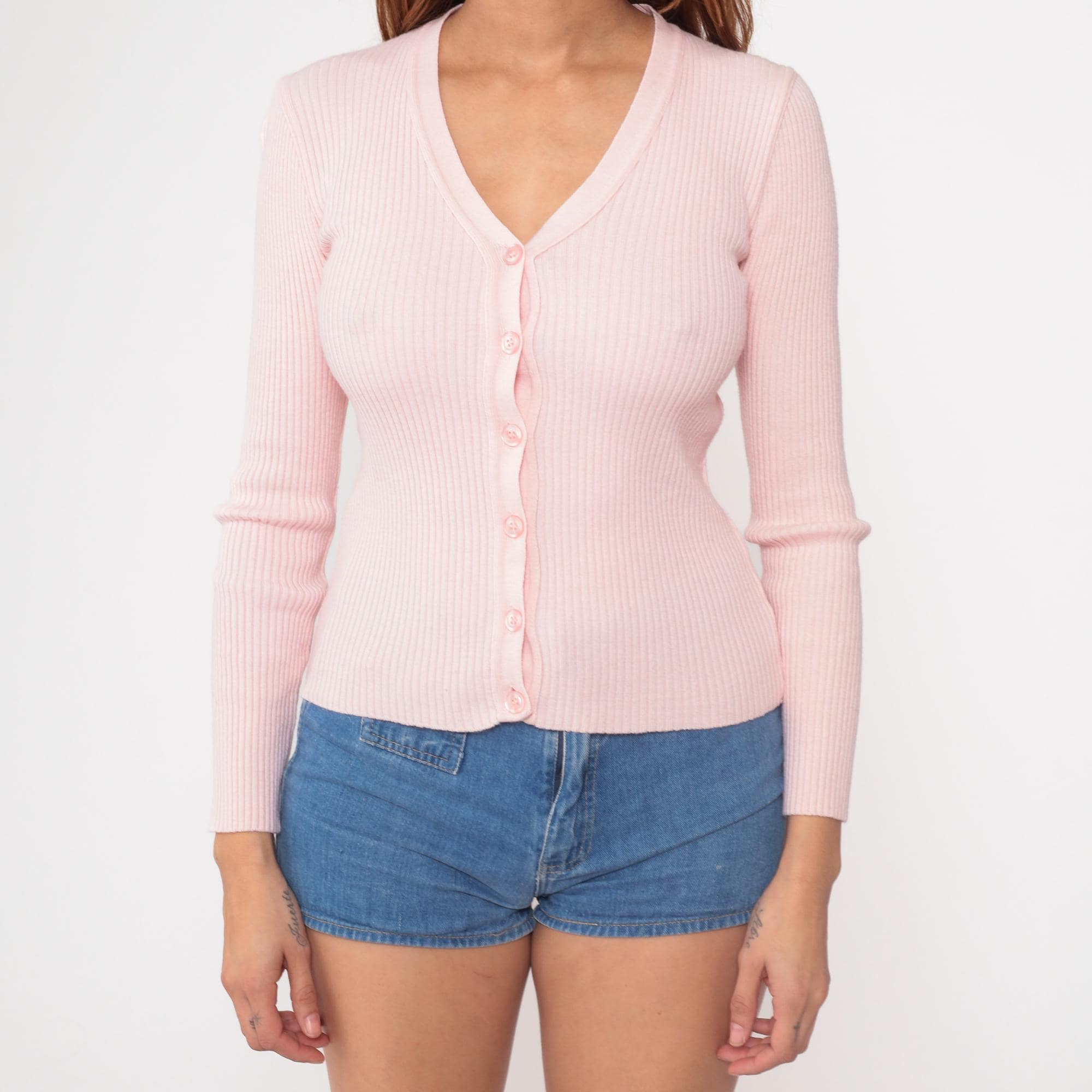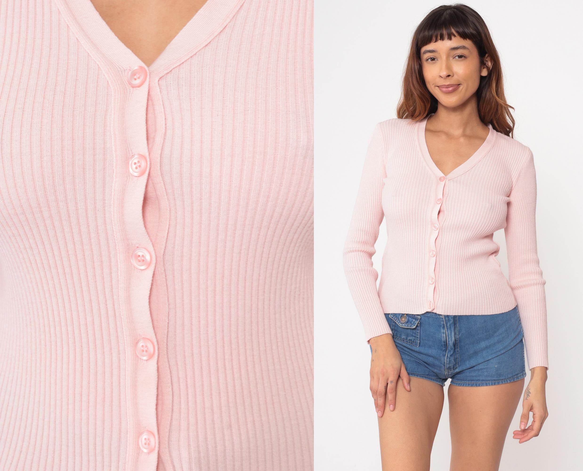 Y2K era pink ribbed cardigan from popular Australian brand Kookai. Features a flattering v-neckline with button-up front and matching pink buttons.