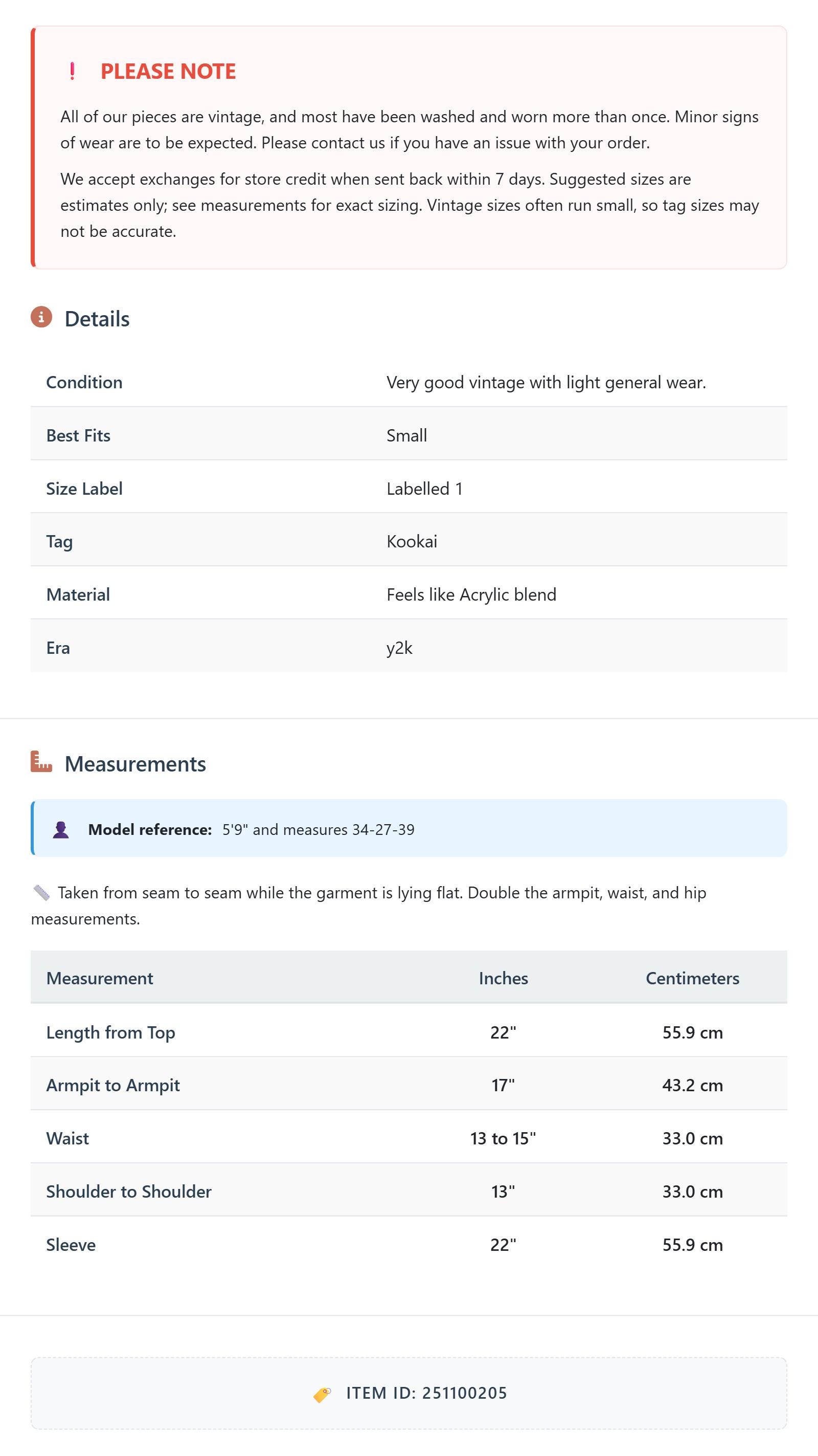 All of our pieces are vintage, and most have been washed and worn more than once. Minor signs of wear are to be expected. Please contact us if you have an issue with your order. We accept exchanges for store credit when sent back within 7 days.