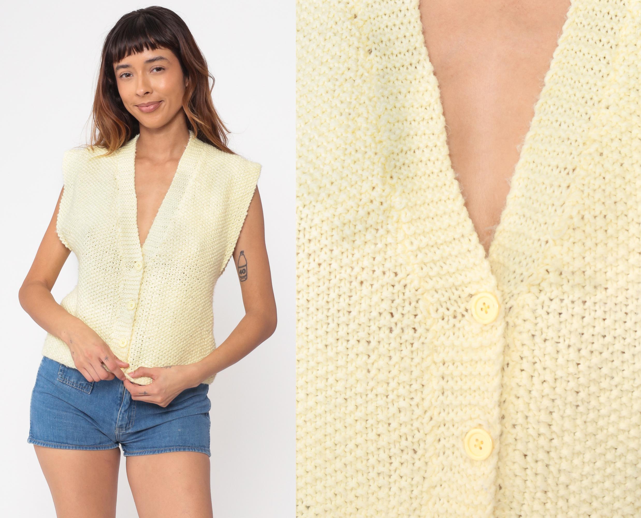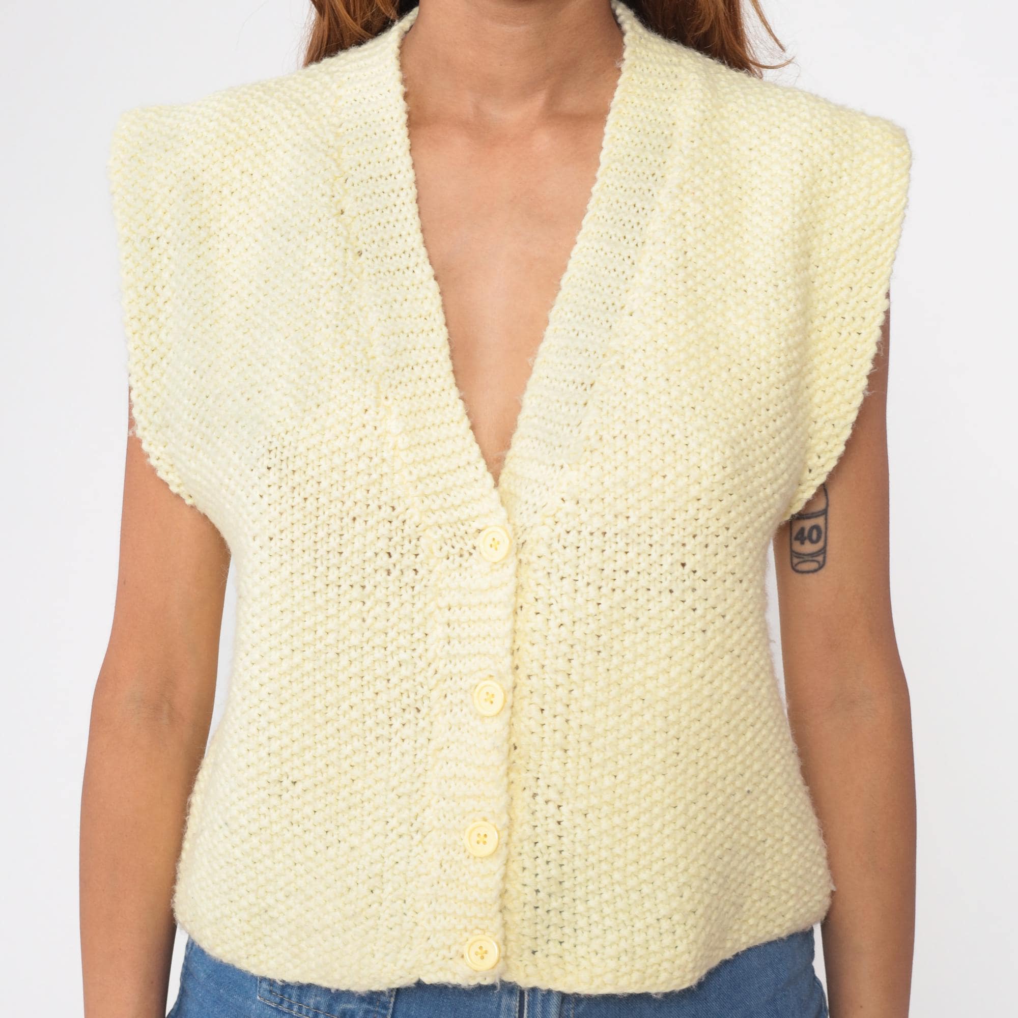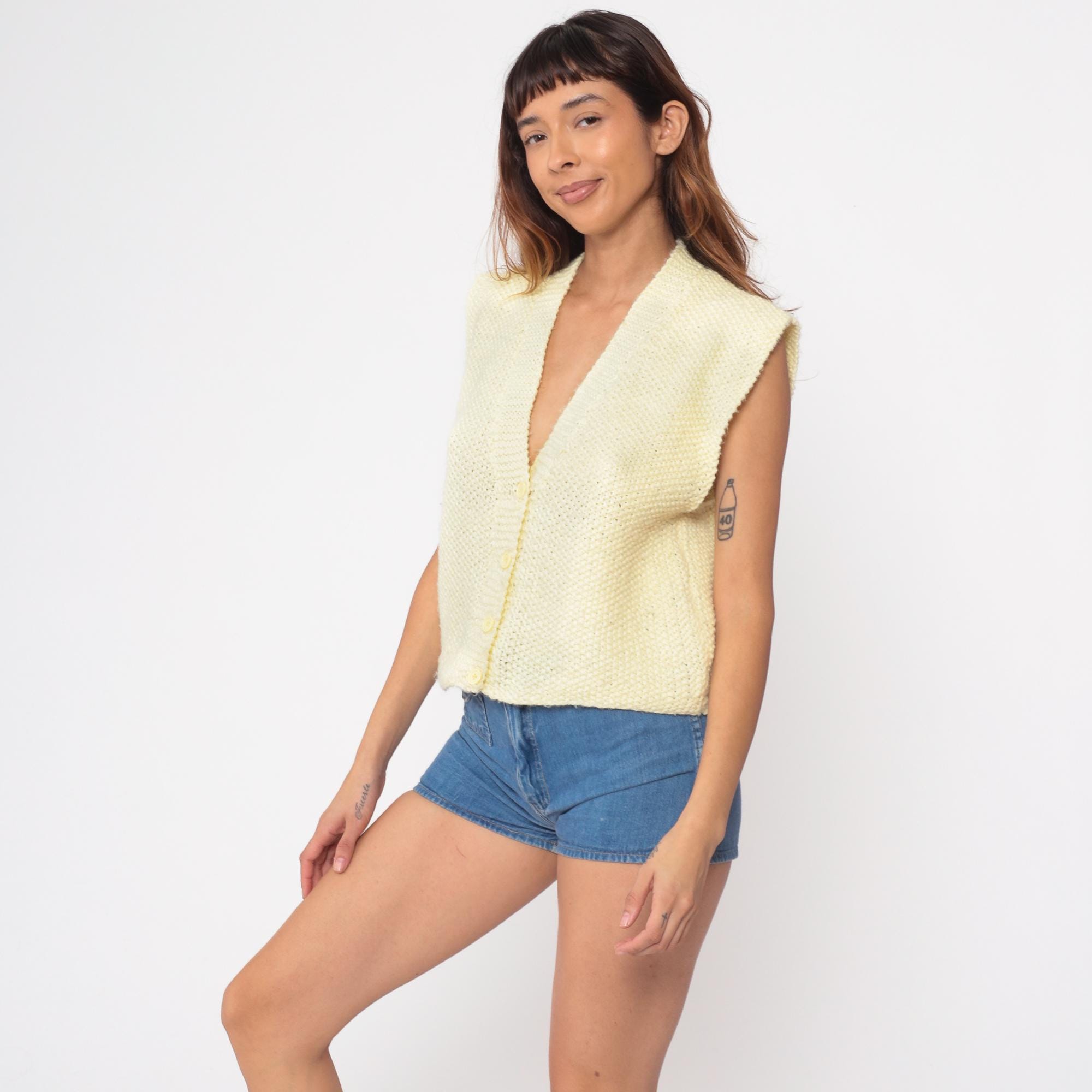 80s butter yellow sweater vest. Features a deep V-neckline with button-up front closure. Sleeveless design with textured knit pattern. Cropped length with ribbed trim.