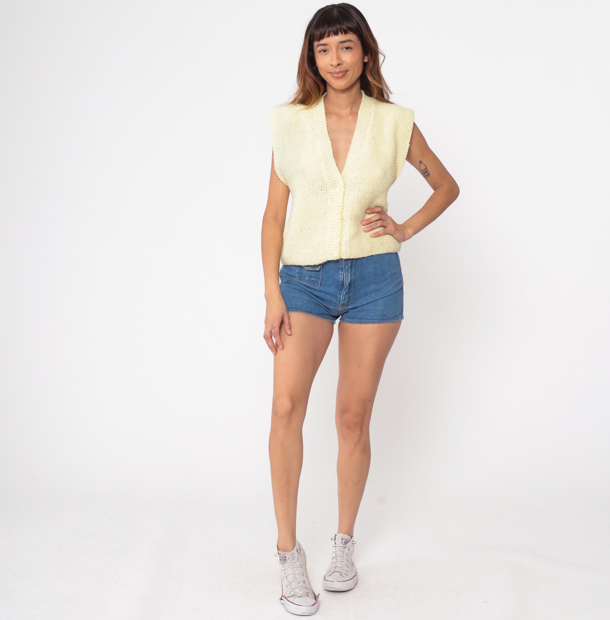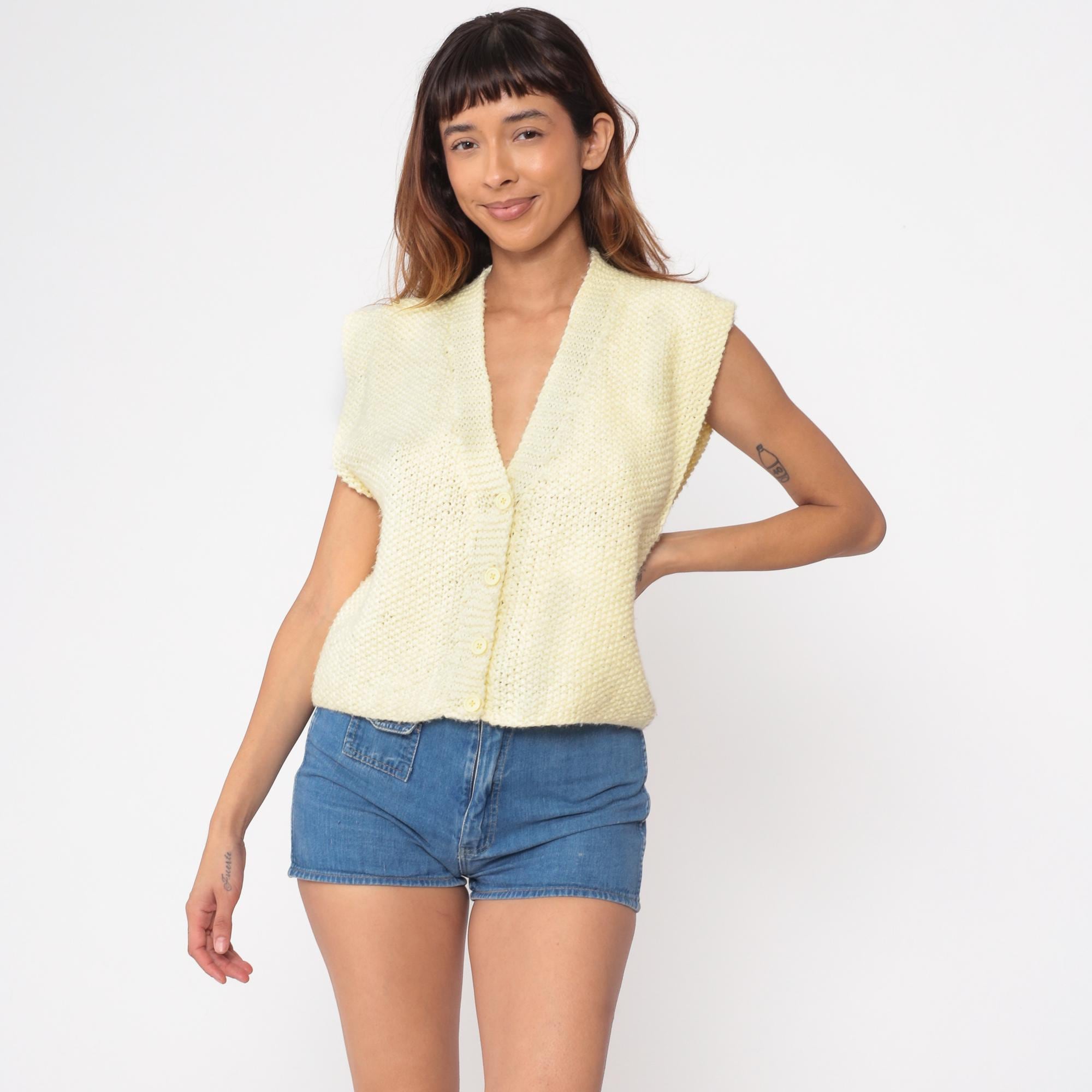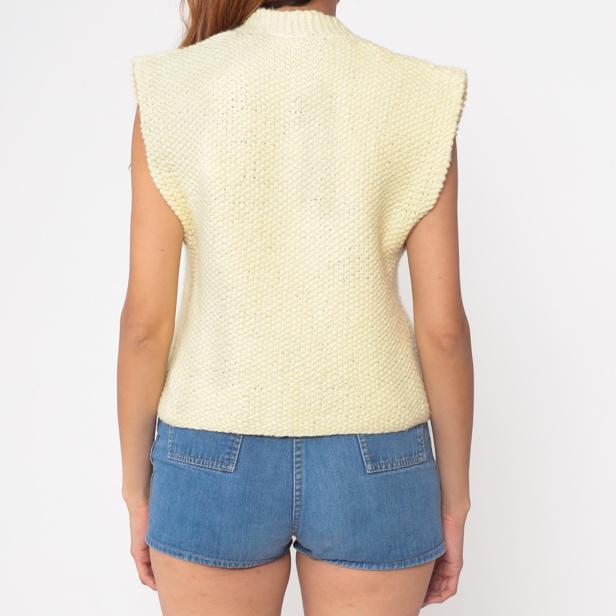 80s butter yellow sweater vest. Features a deep V-neckline with button-up front closure. Sleeveless design with textured knit pattern. Cropped length with ribbed trim.