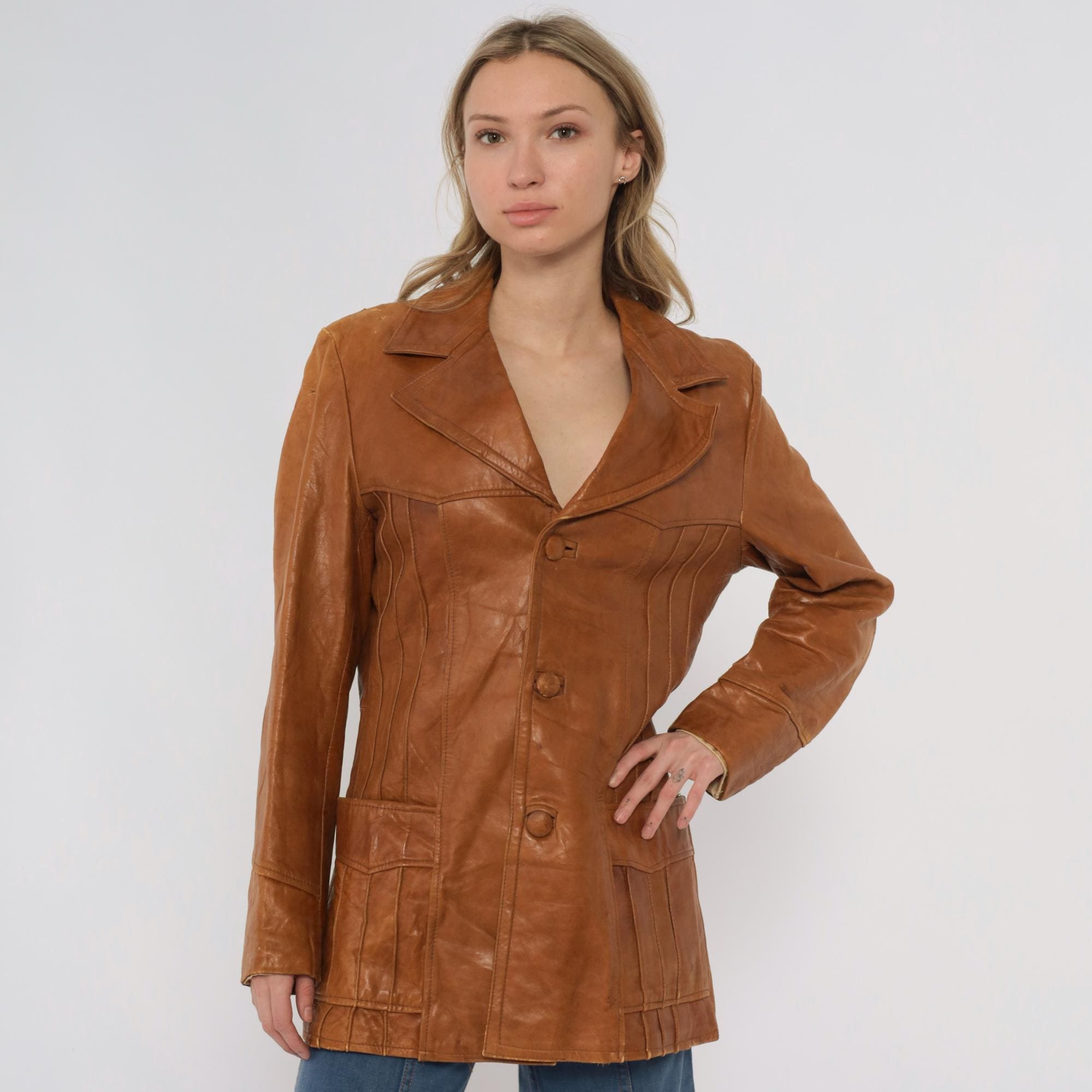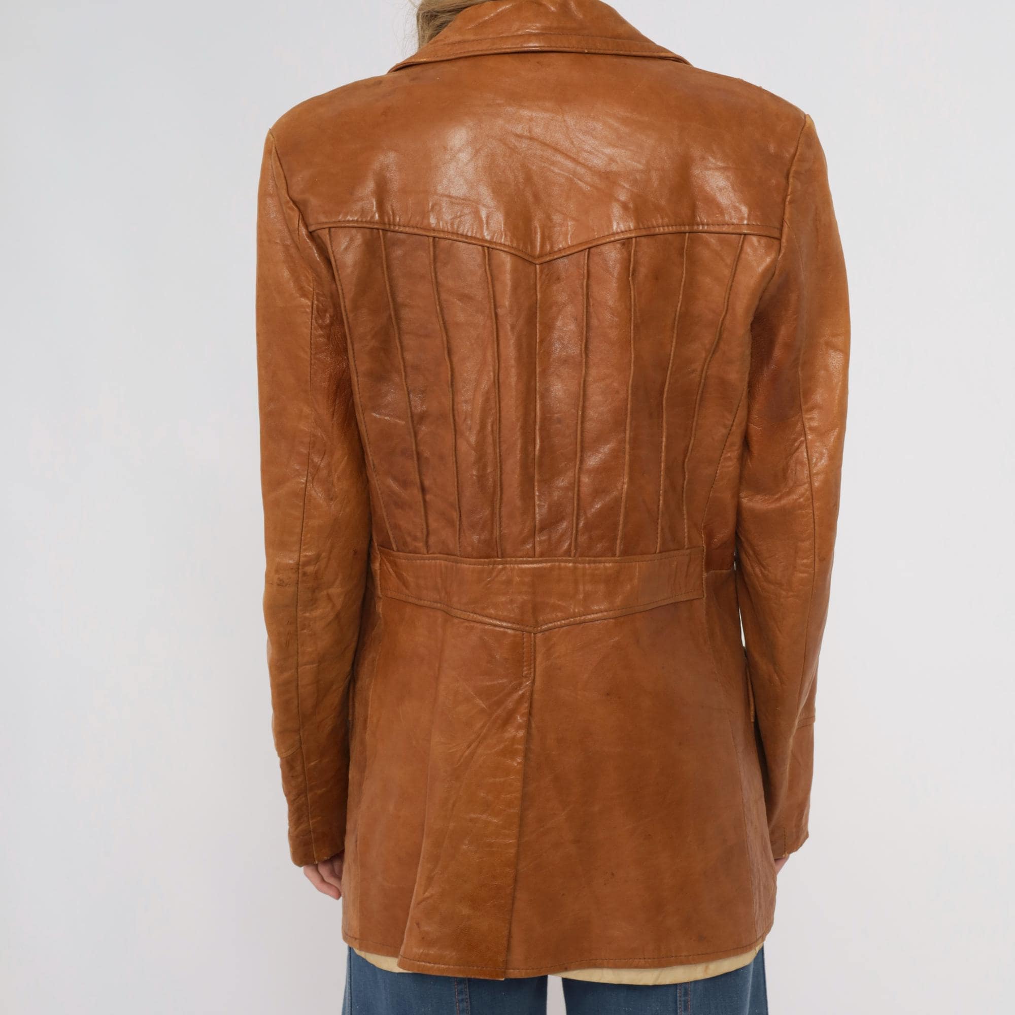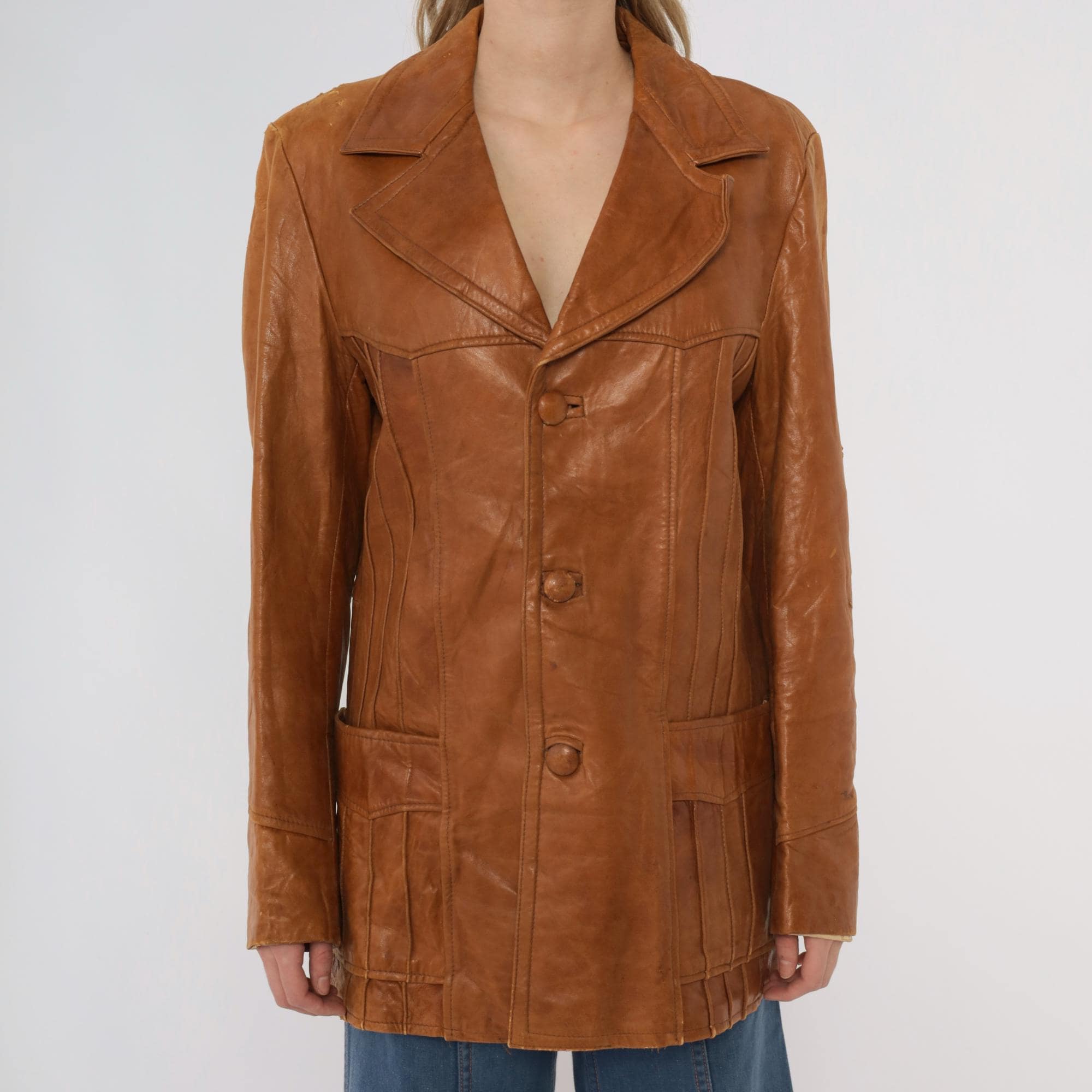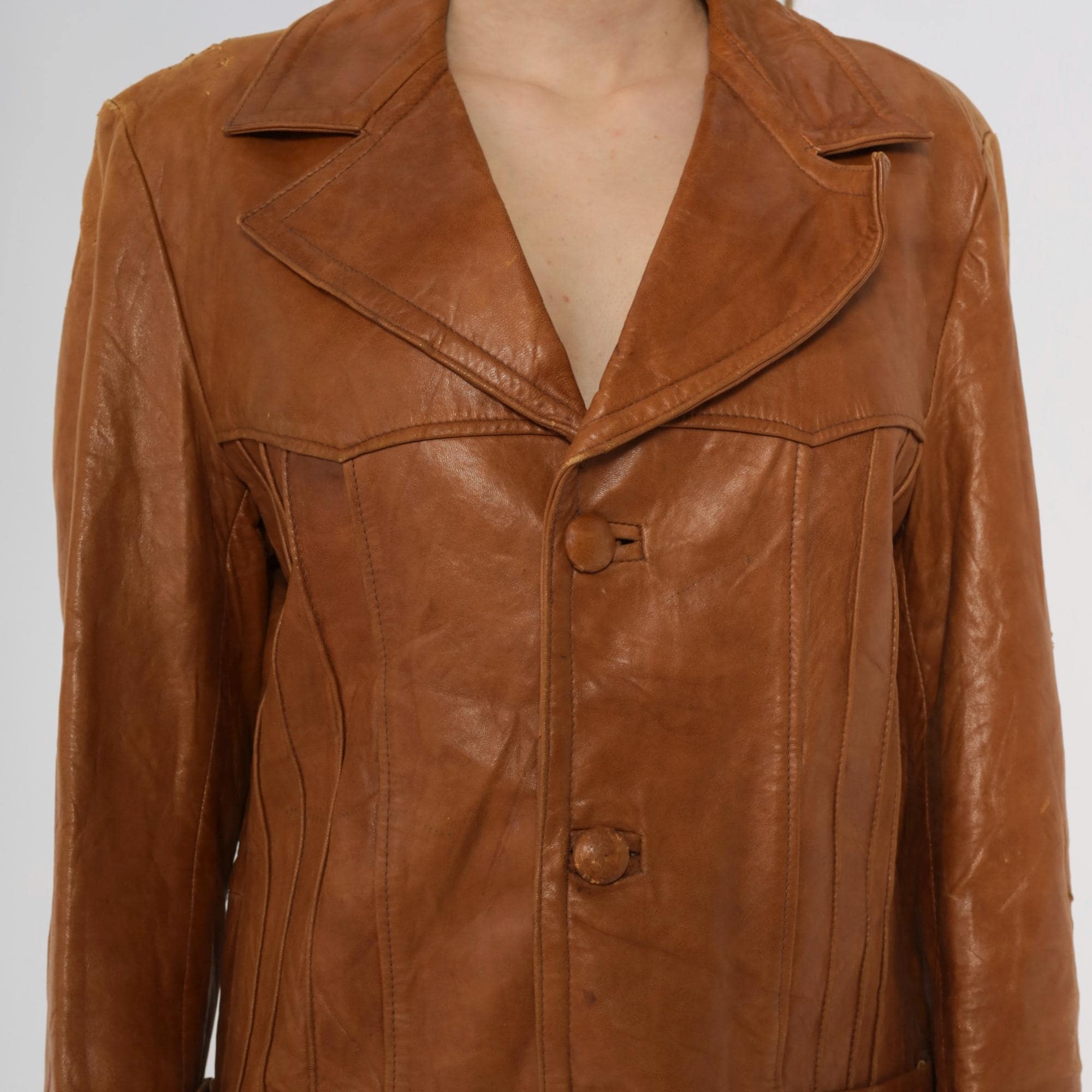 70s brown leather blazer by Roberts Fine Leather. Features button front closure with wide lapels and detailed stitching on front panels. Patch pockets at hip. Long sleeves with clean cuffs. Soft, genuine leather in caramel tan color. Has distressed areas and wear throughout