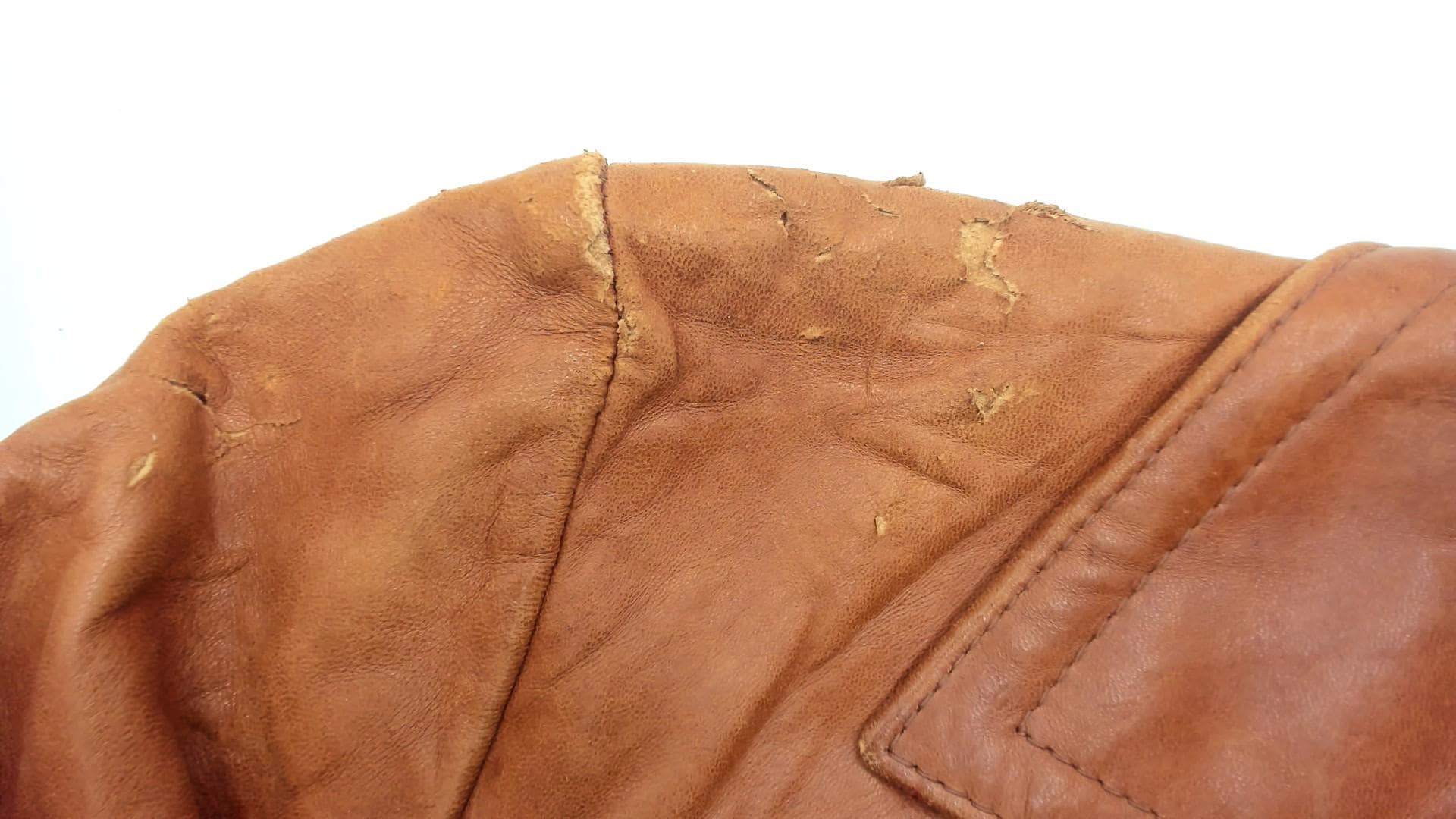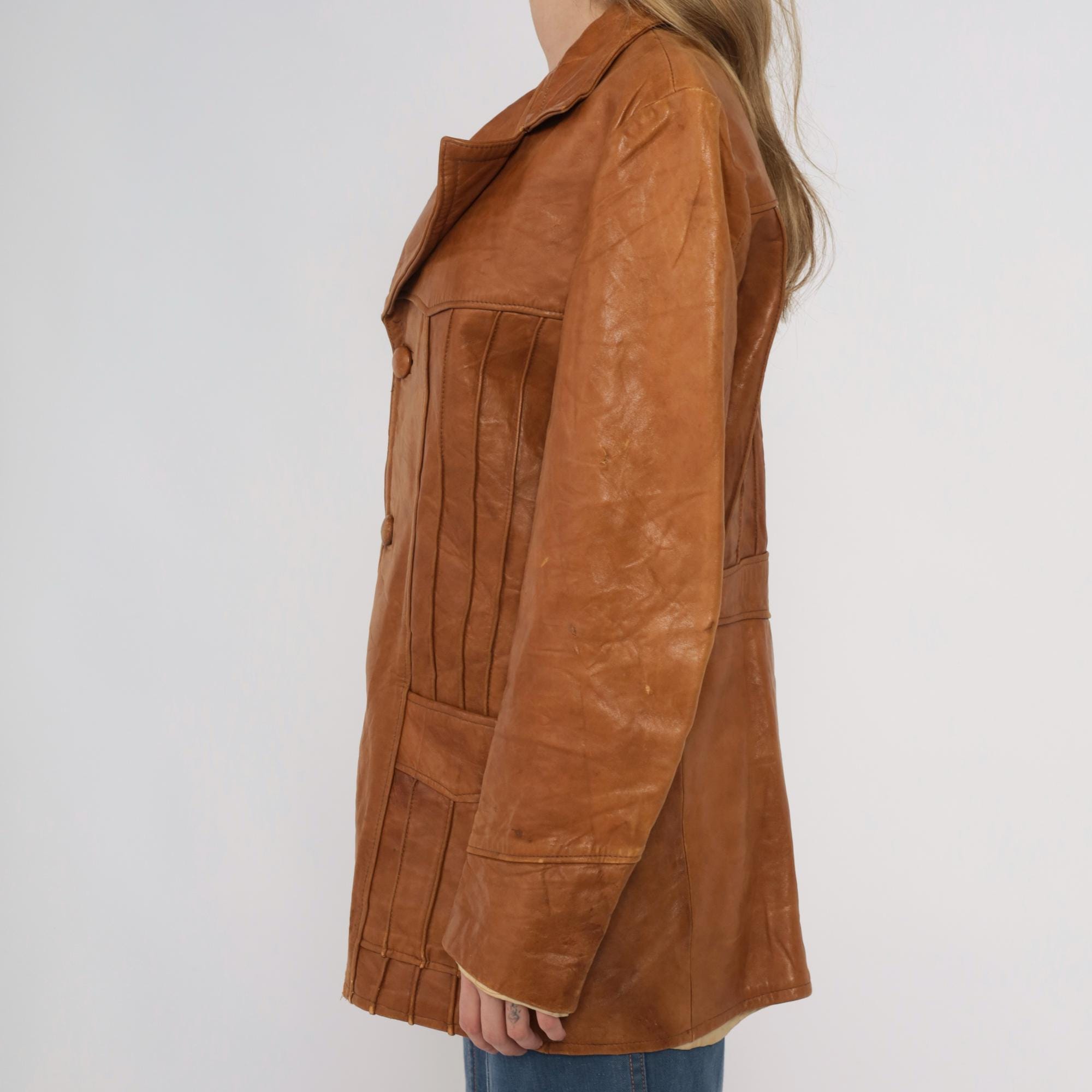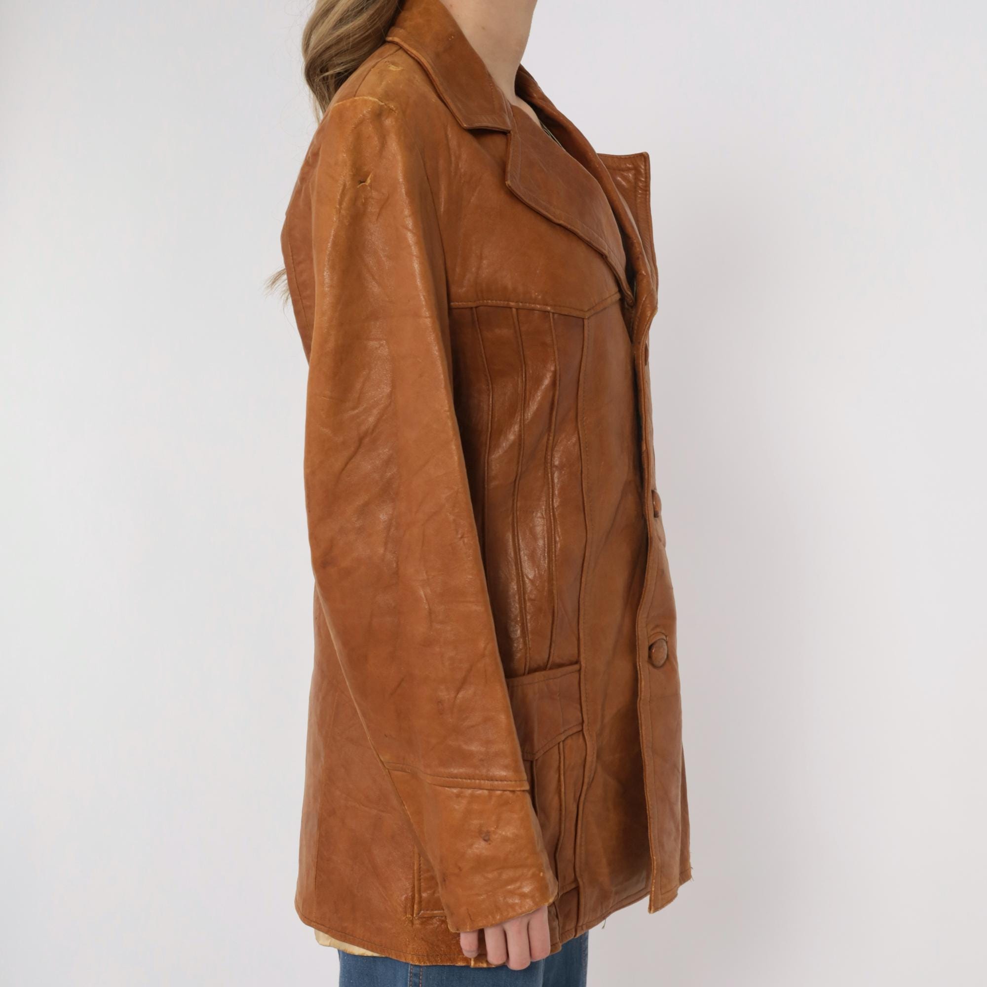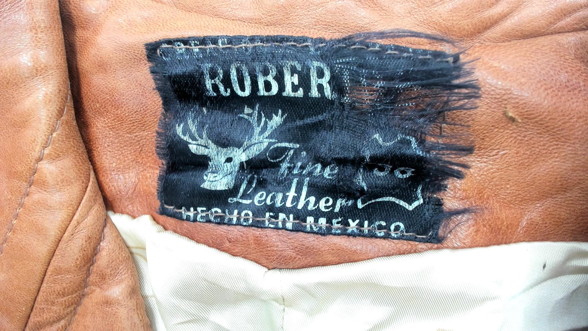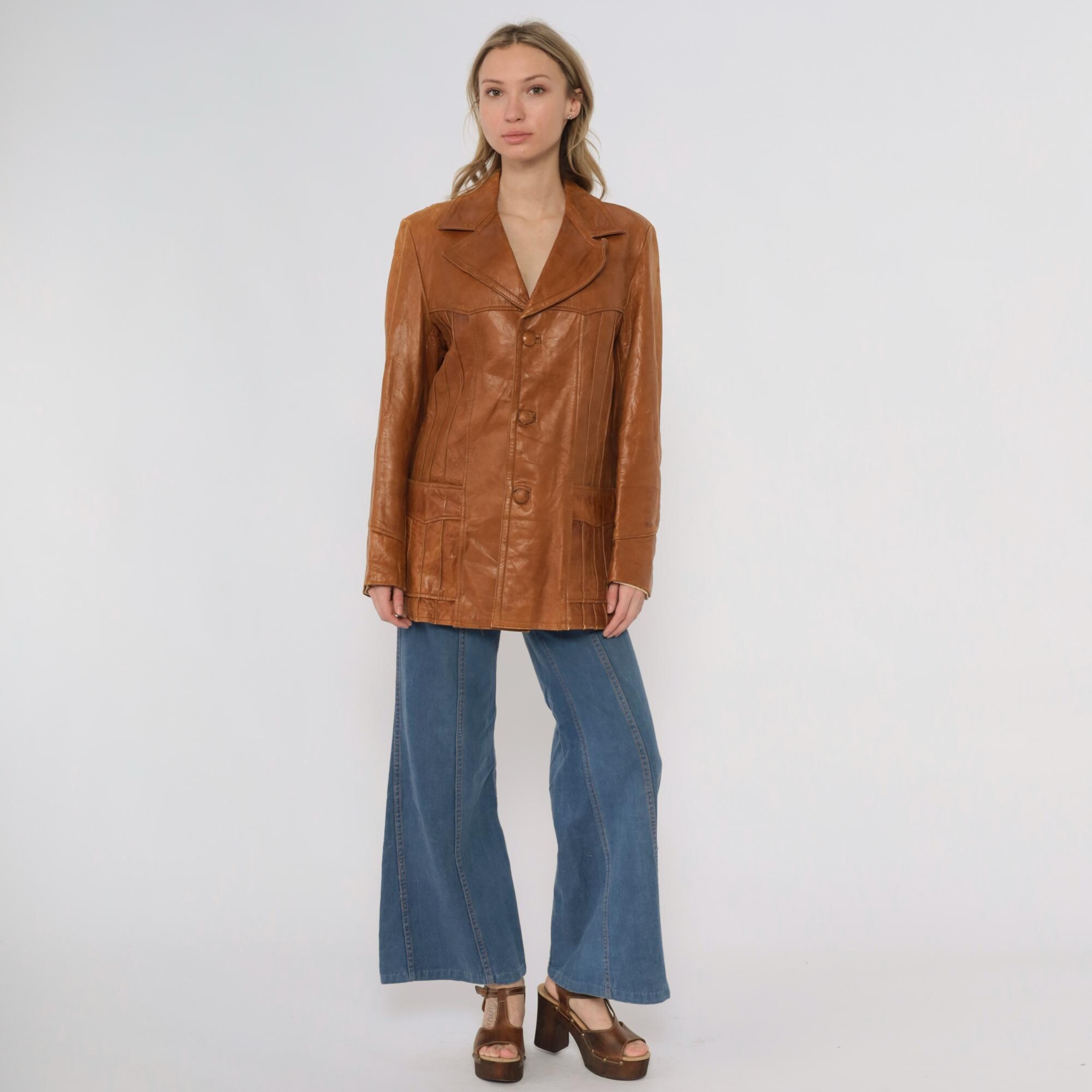 70s brown leather blazer by Roberts Fine Leather. Features button front closure with wide lapels and detailed stitching on front panels. Patch pockets at hip. Long sleeves with clean cuffs. Soft, genuine leather in caramel tan color. Has distressed areas and wear throughout