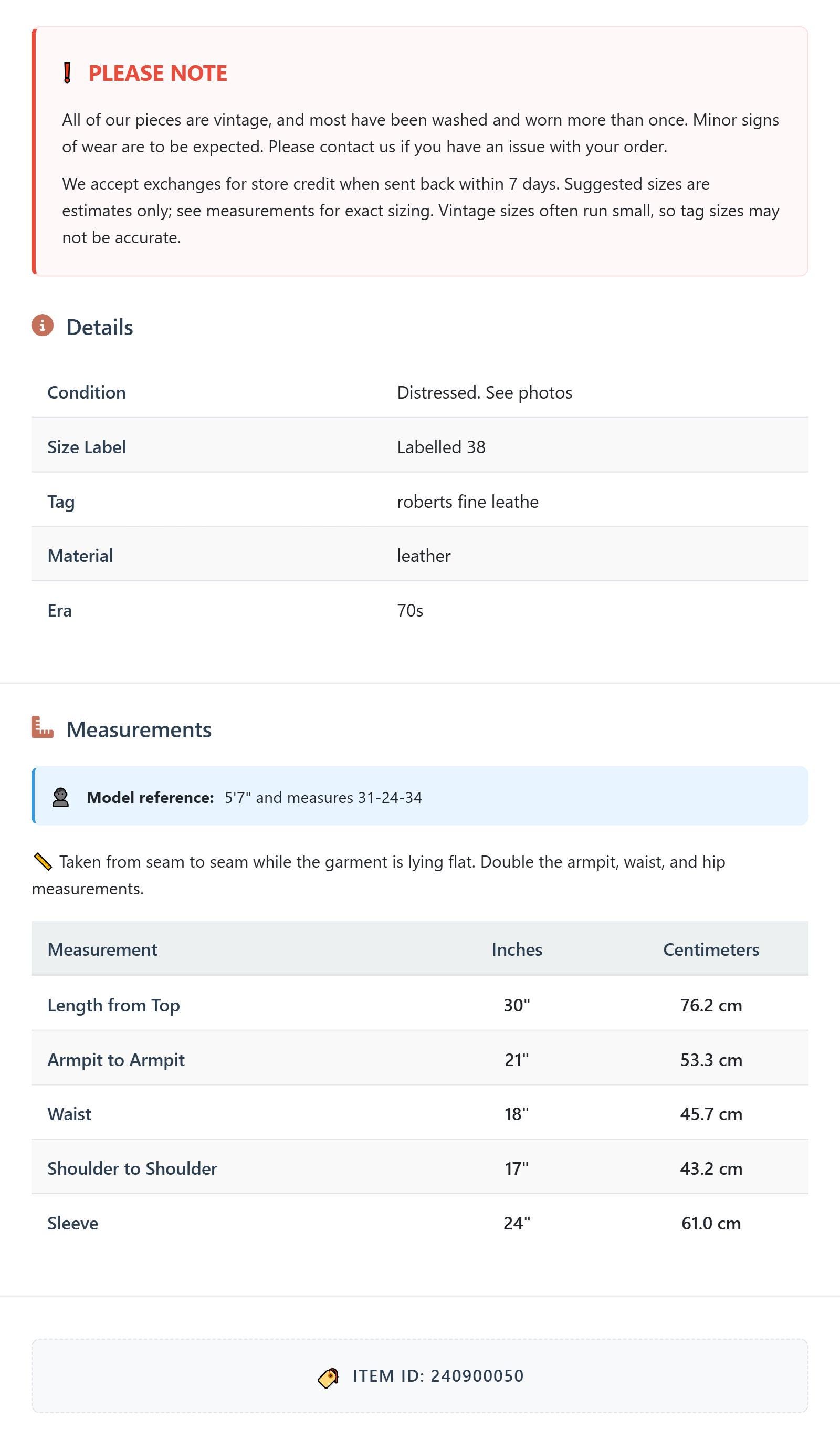 Suggested sizes are estimates only; see measurements for exact sizing. Vintage sizes often run small, so tag sizes may not be accurate.