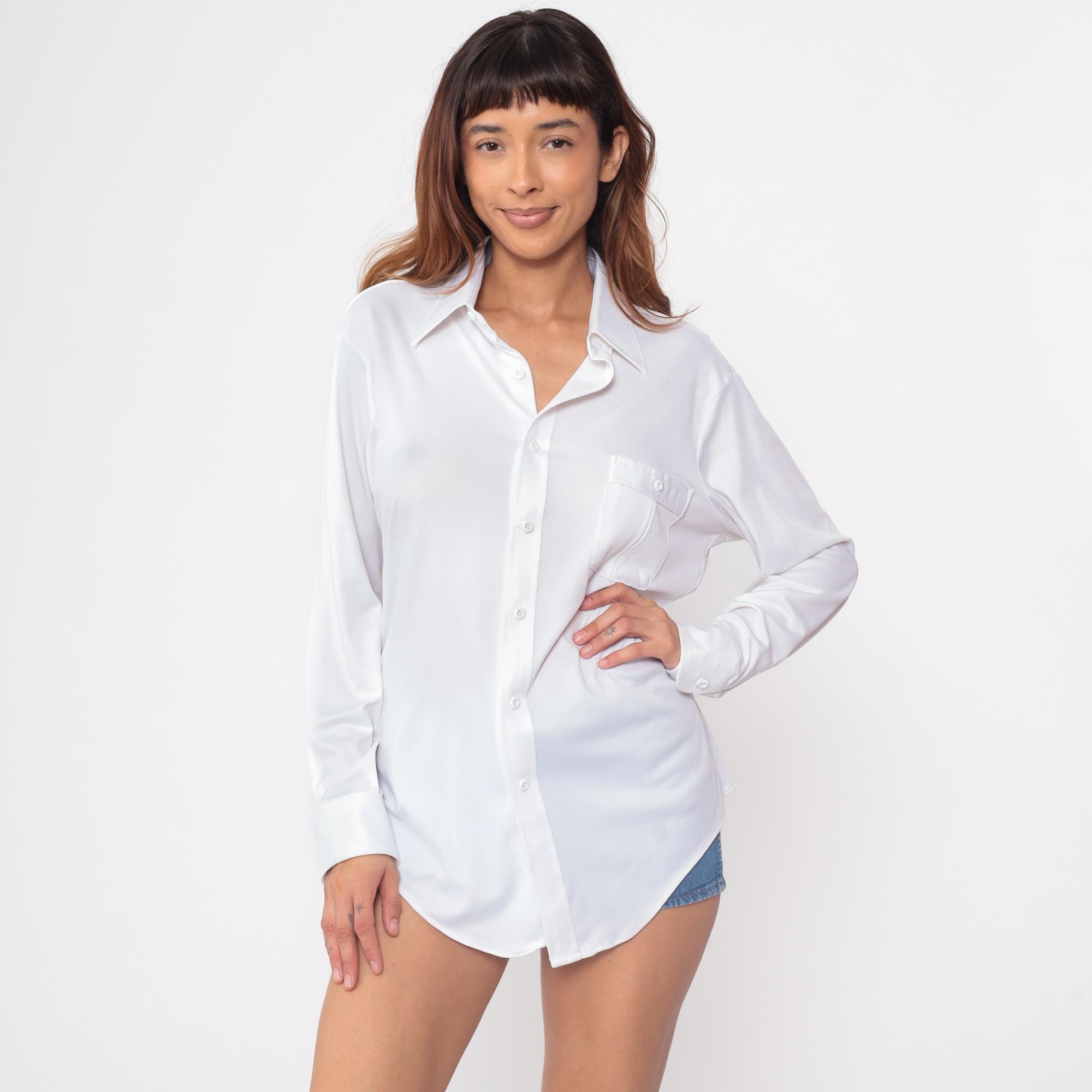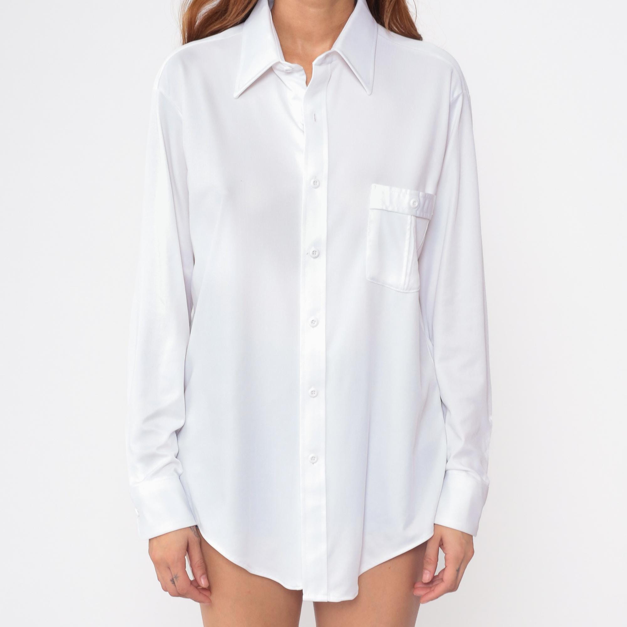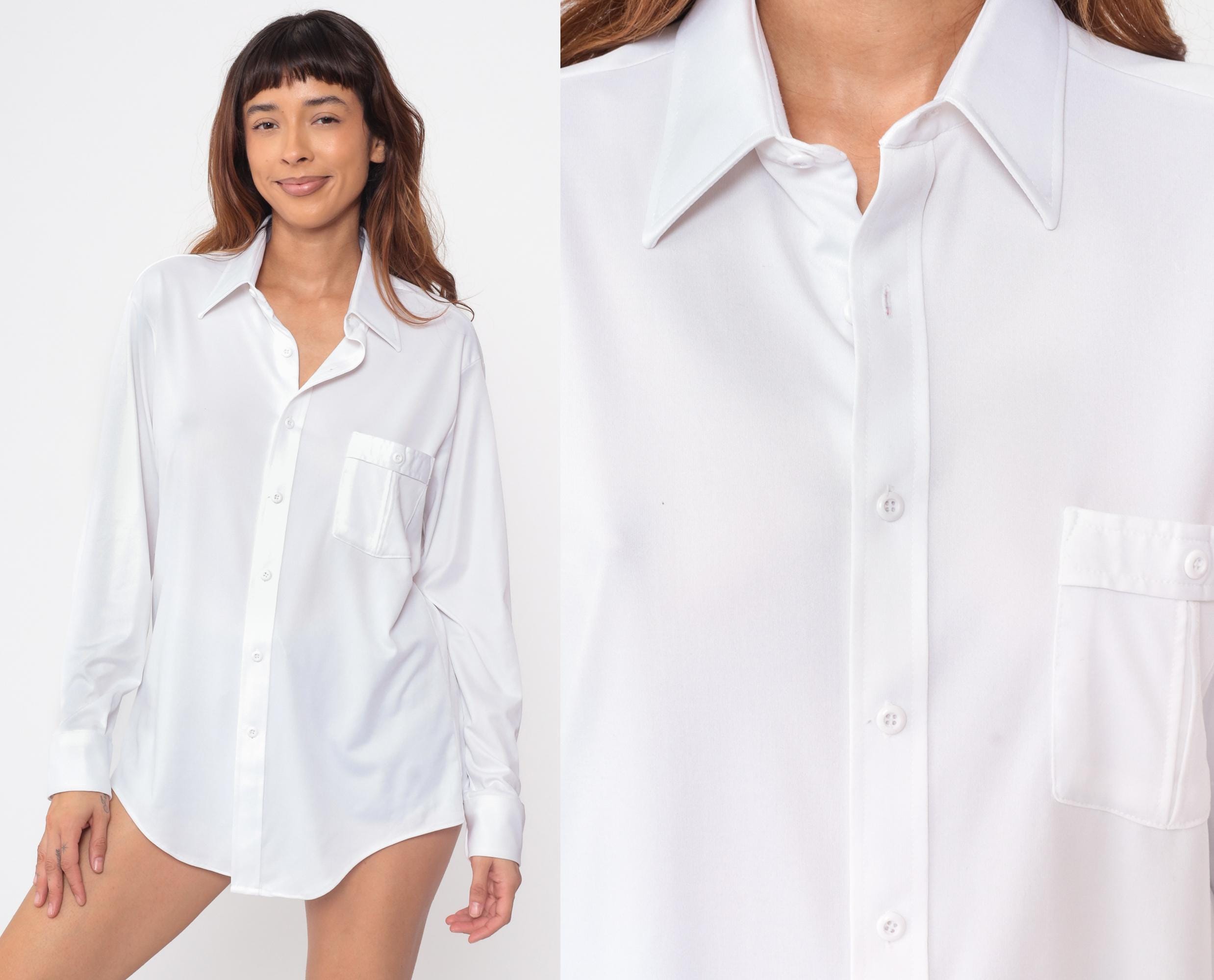 70s white button-down shirt from Ultrassa JCPenney. Classic pointed collar with full front button closure. Chest pocket with button tab. Long sleeves with button cuffs.