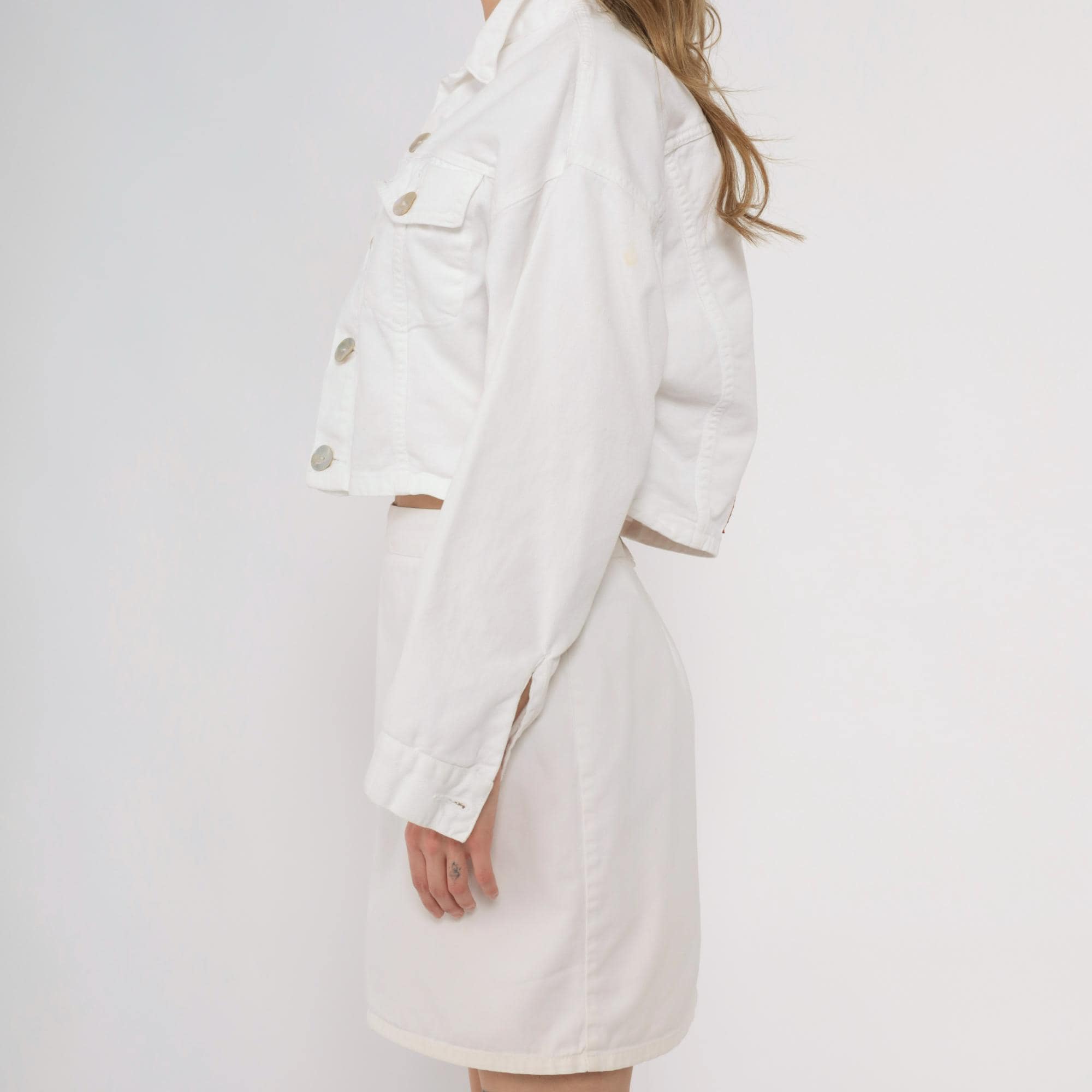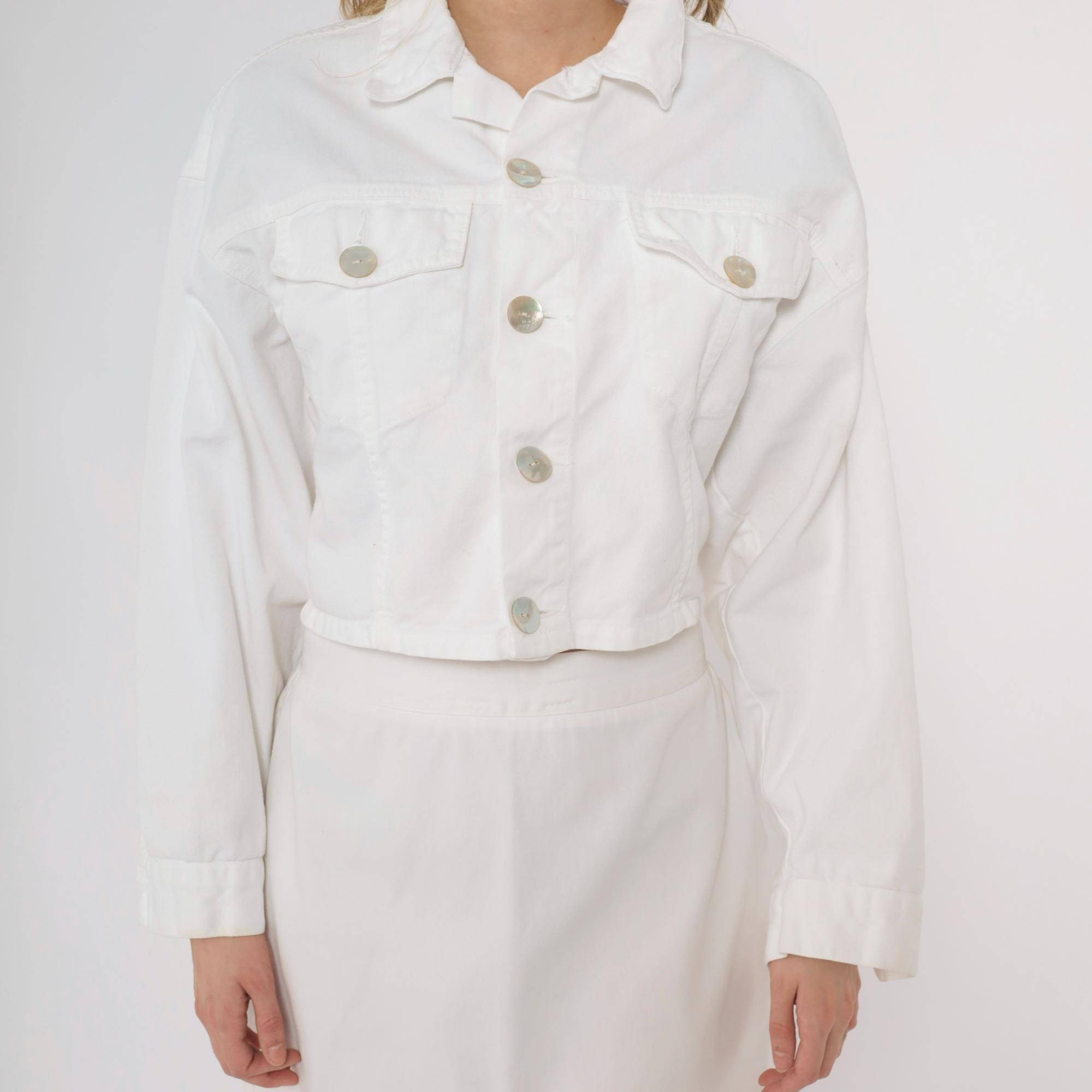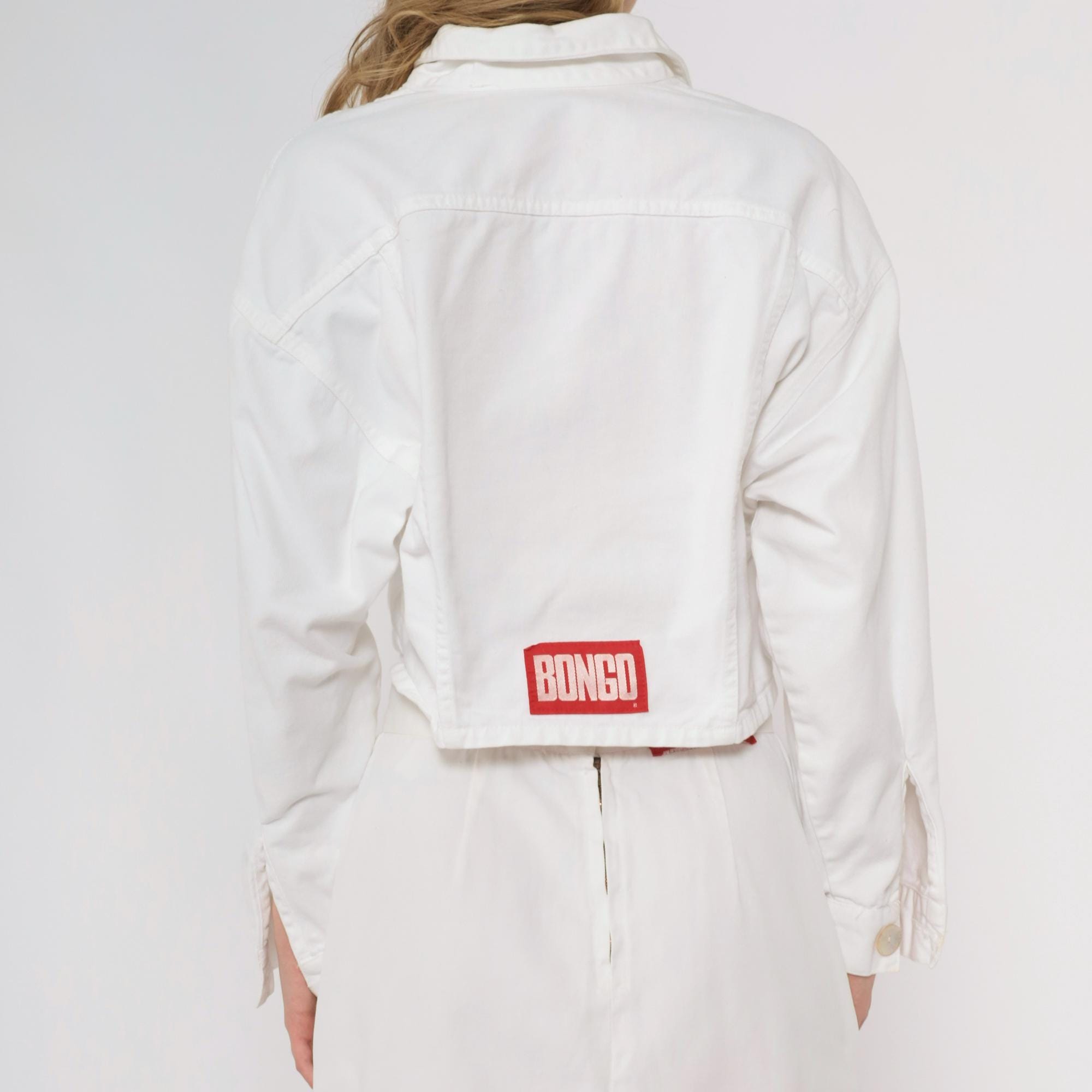 90s white denim crop jacket by Bongo. Features button front closure with collar and chest pockets. Cropped length hits at waist.