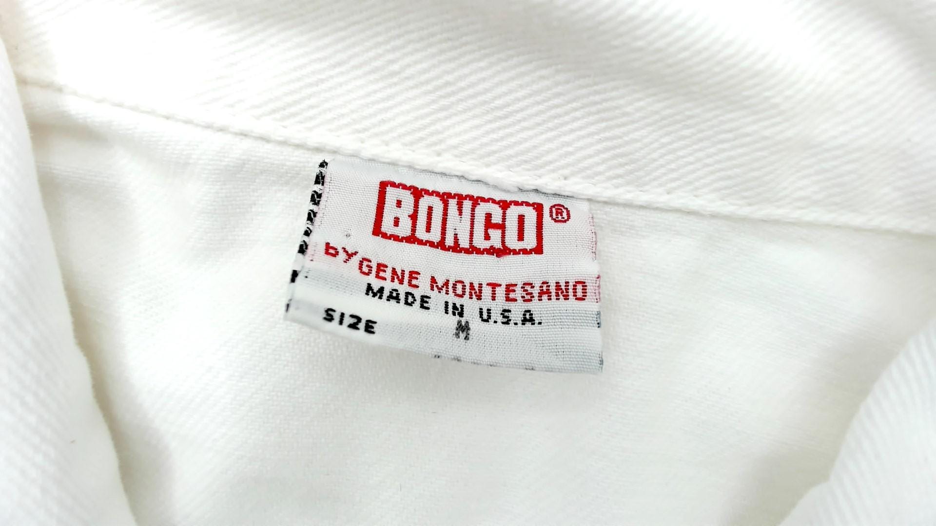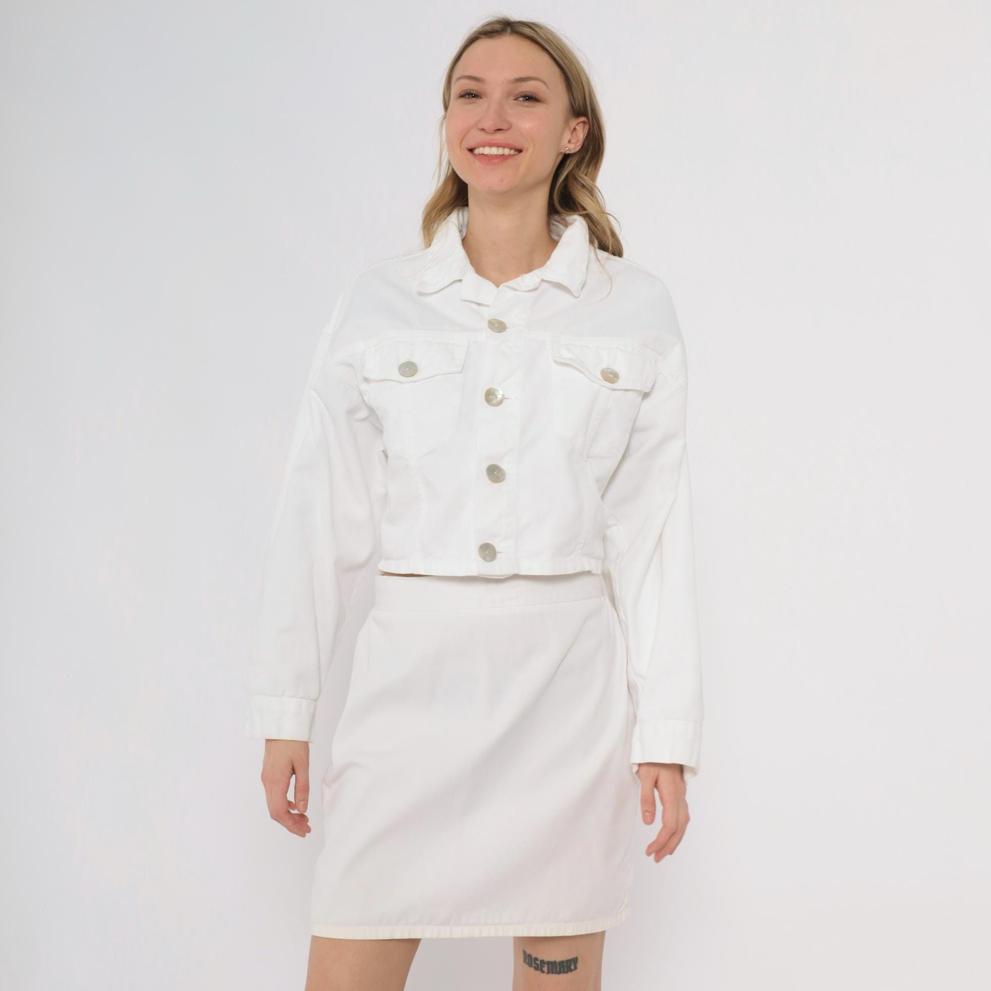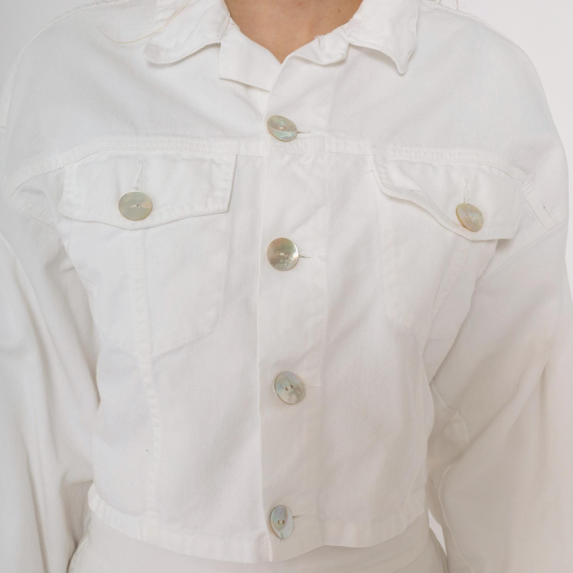 90s white denim crop jacket by Bongo. Features button front closure with collar and chest pockets. Cropped length hits at waist.