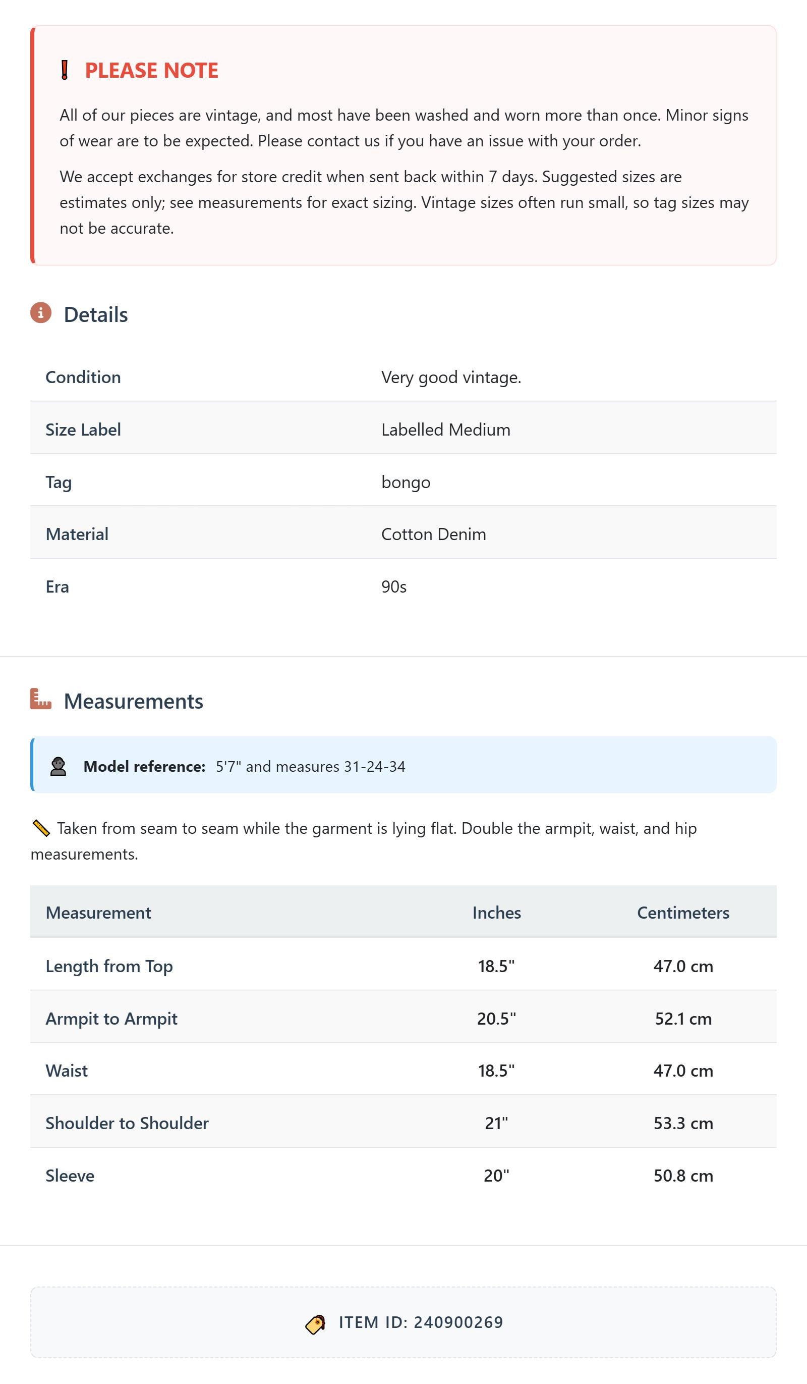 All of our pieces are vintage, and most have been washed and worn more than once. Minor signs of wear are to be expected. Please contact us if you have an issue with your order. We accept exchanges for store credit when sent back within 7 days.