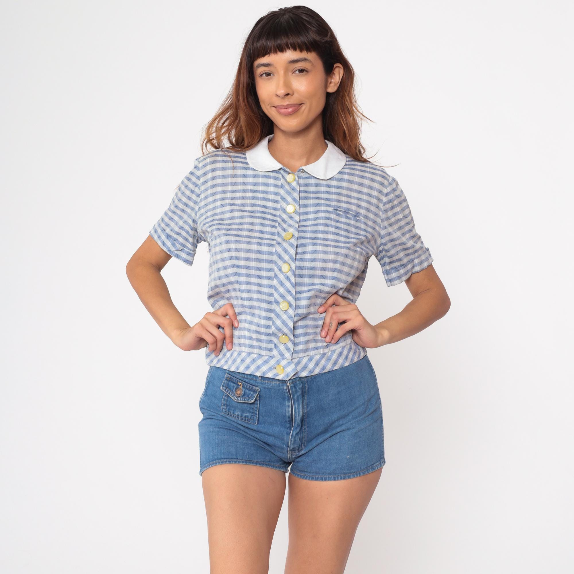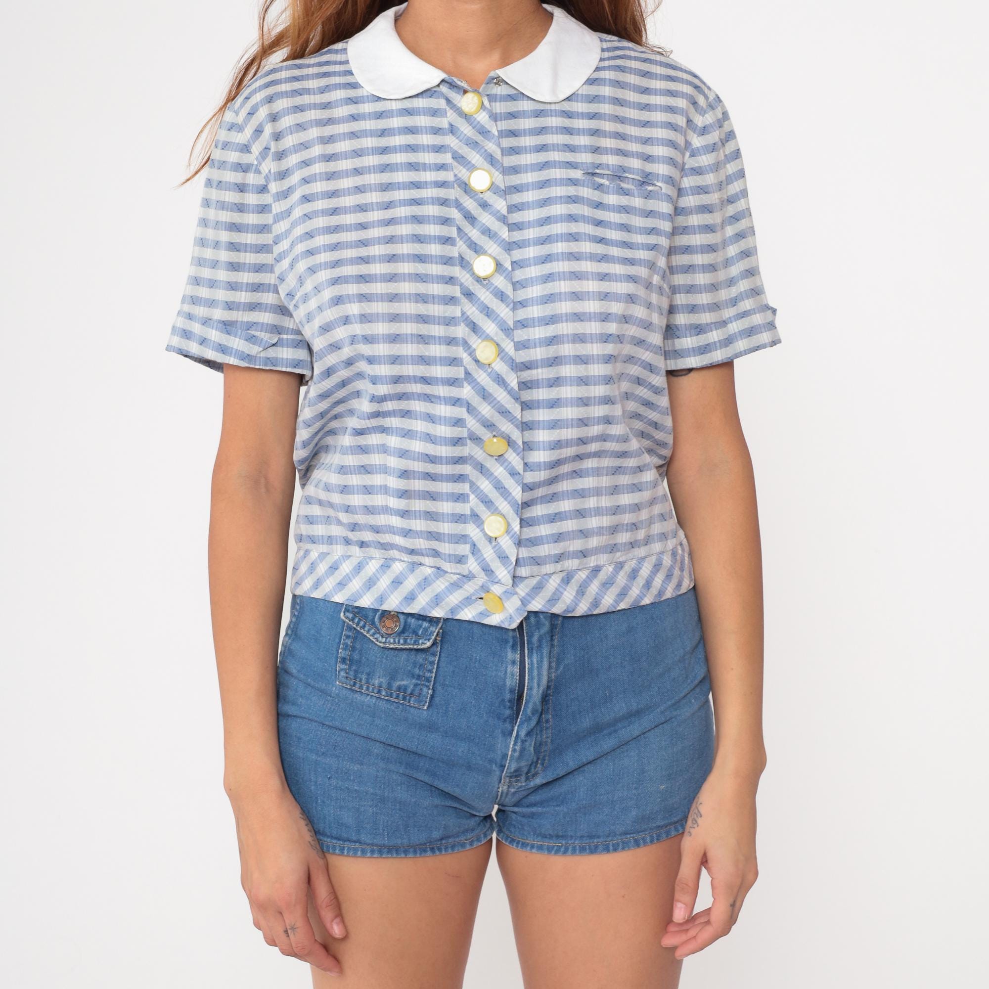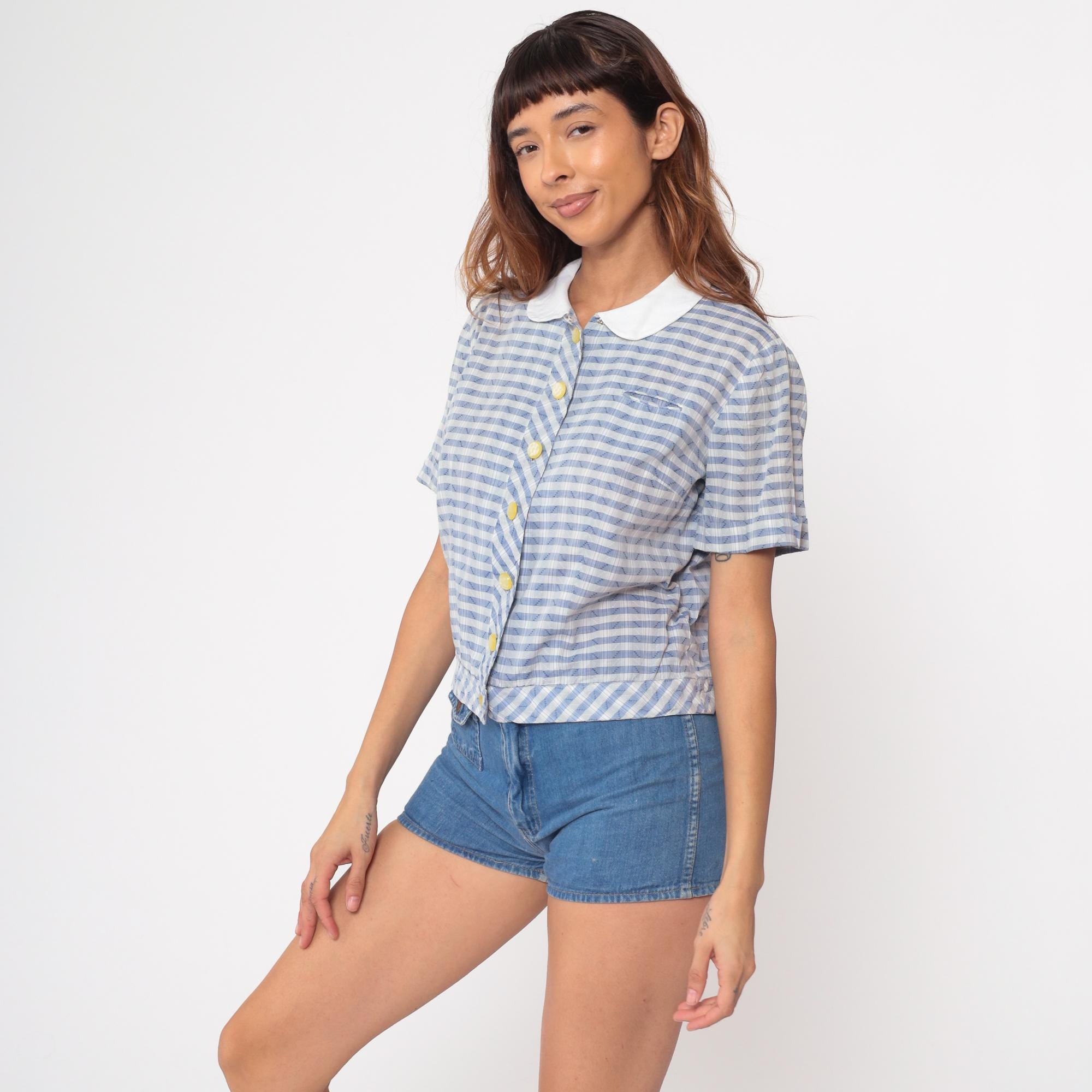 60s blue and white gingham blouse by Nelly Don. Features a classic white peter pan collar with button-front closure. Short sleeves with a relaxed fit. Yellow pearlescent buttons add a charming detail.