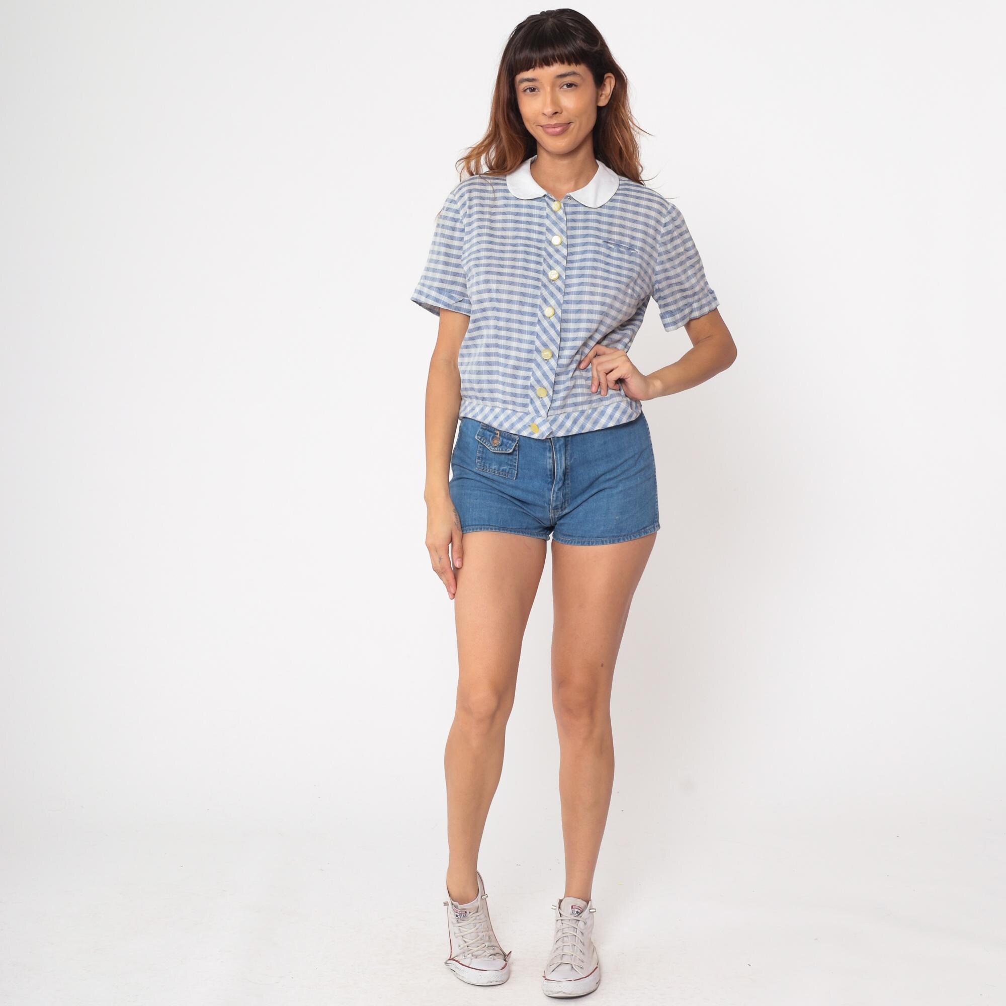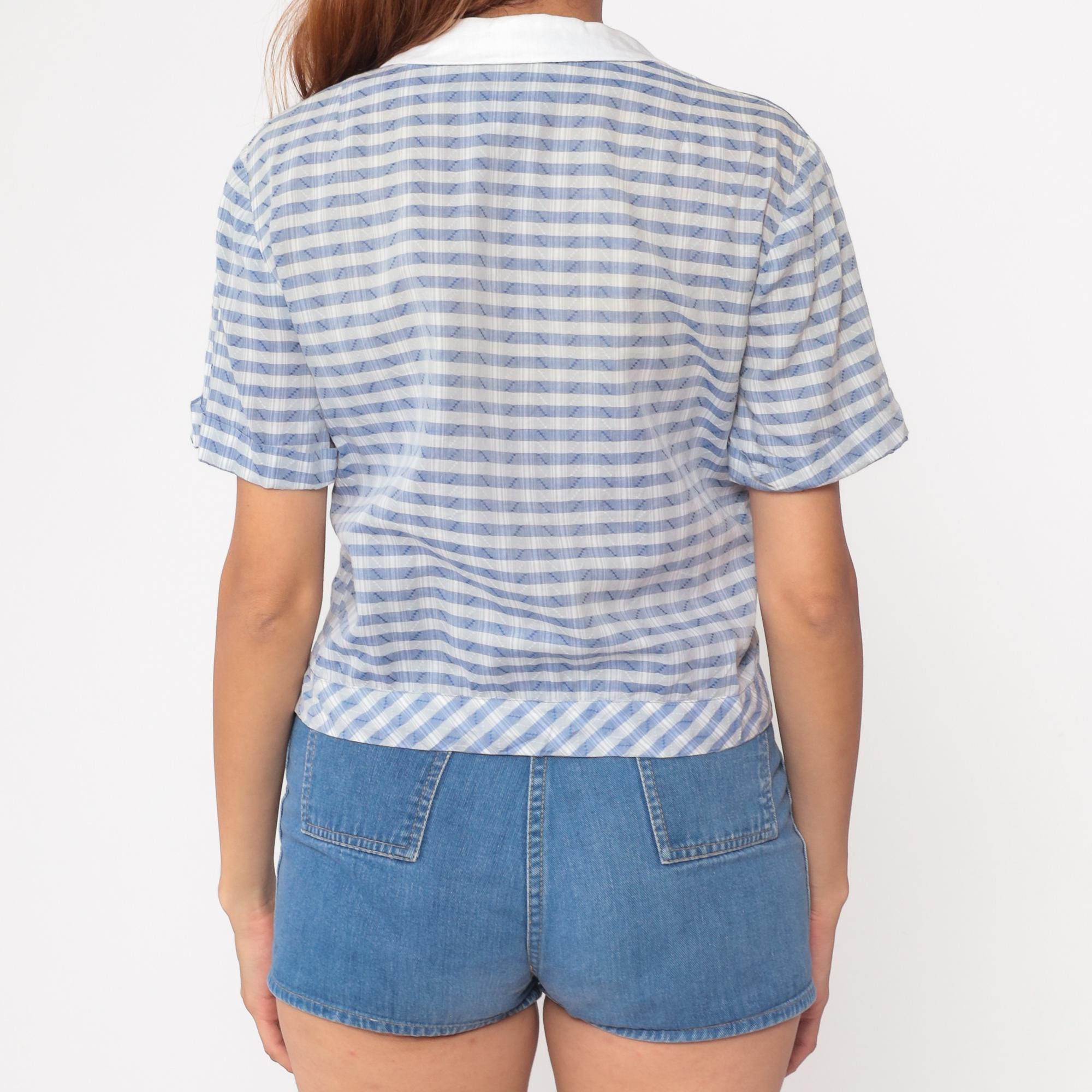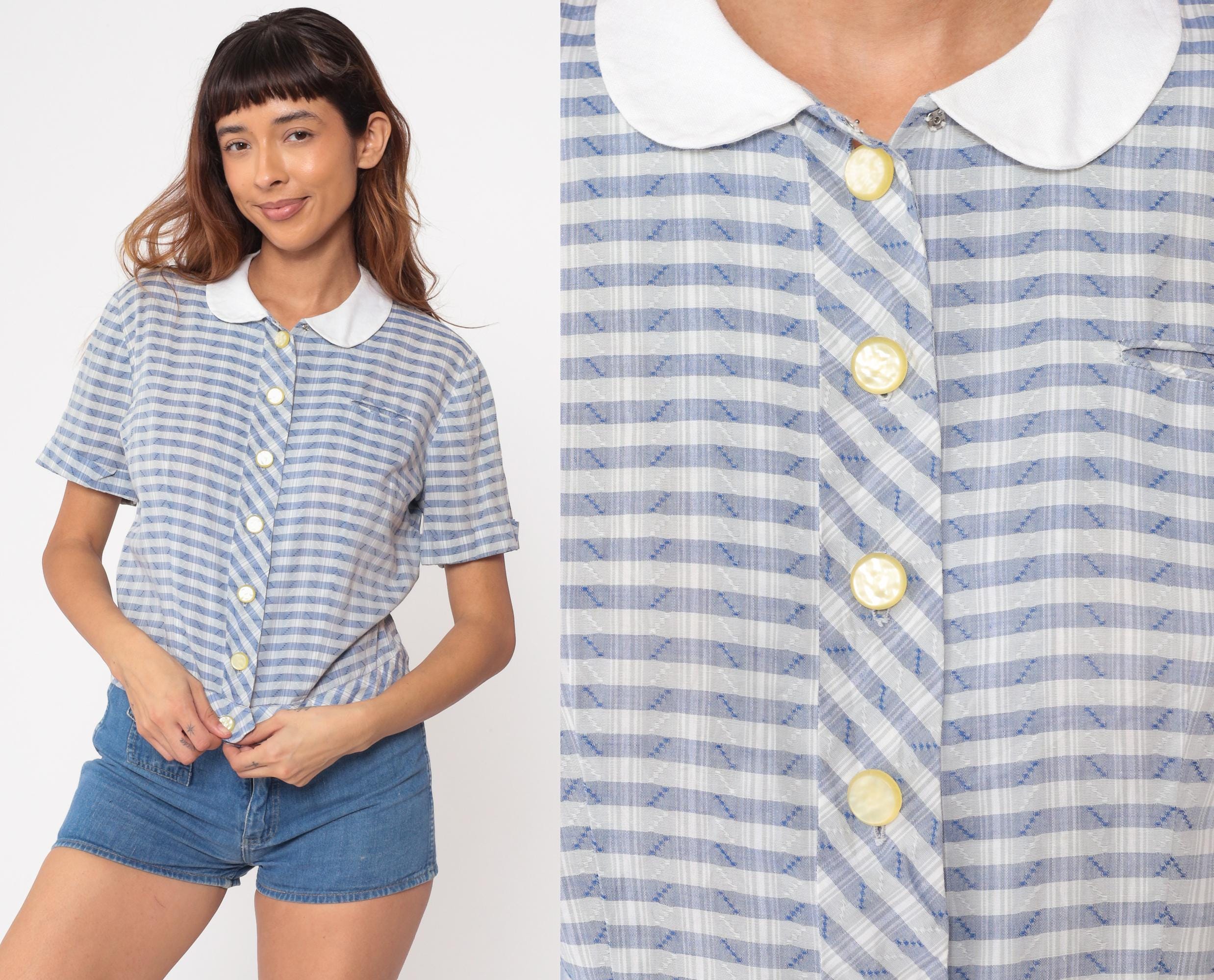 60s blue and white gingham blouse by Nelly Don. Features a classic white peter pan collar with button-front closure. Short sleeves with a relaxed fit. Yellow pearlescent buttons add a charming detail.
