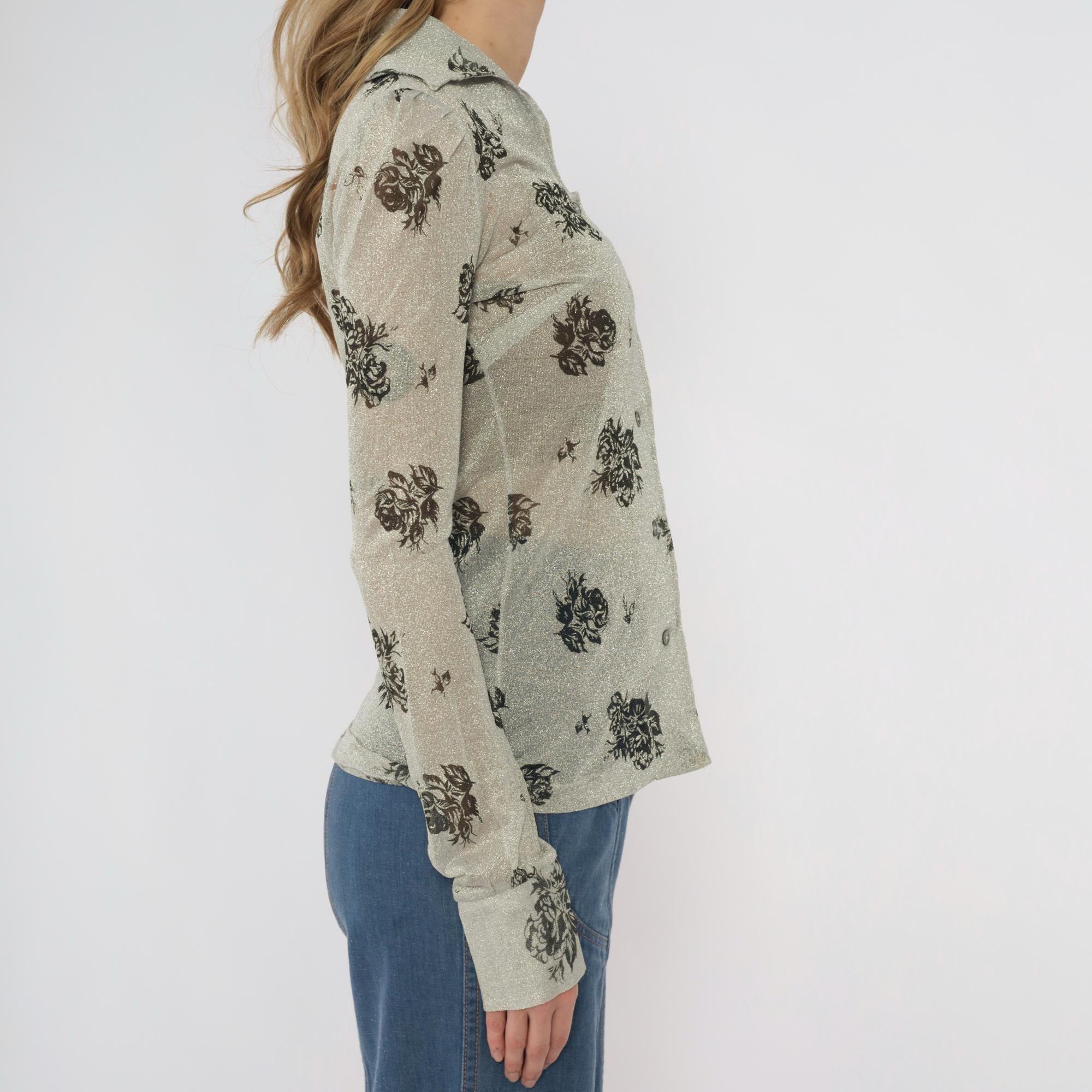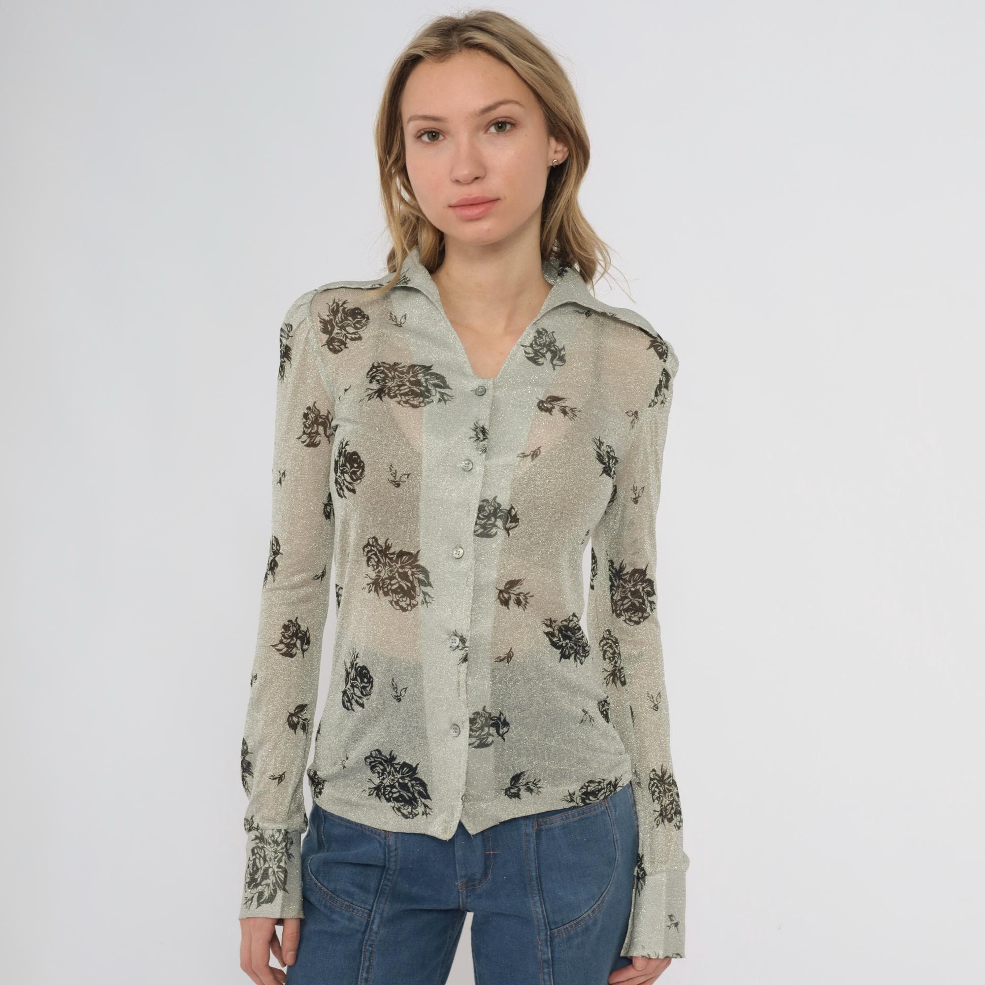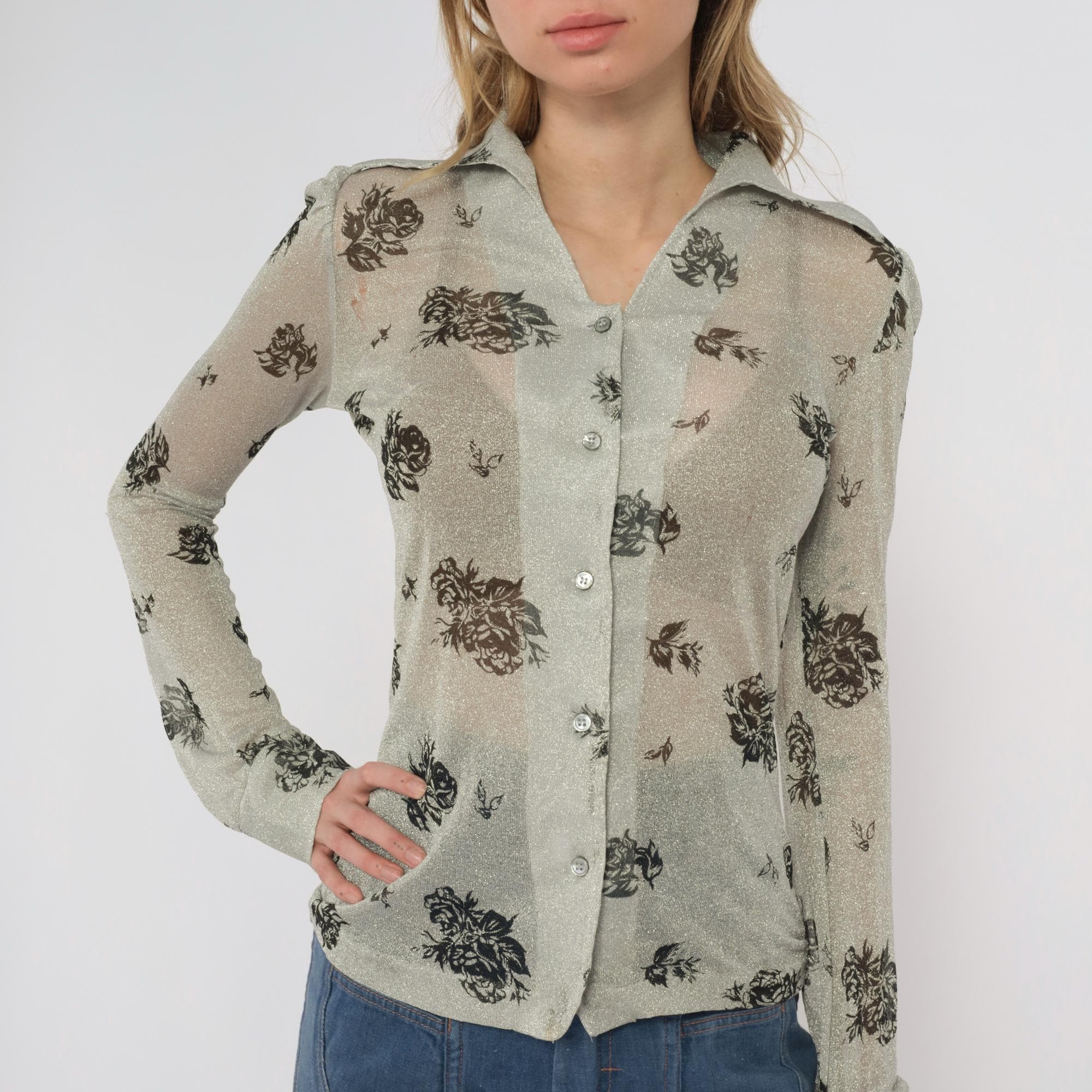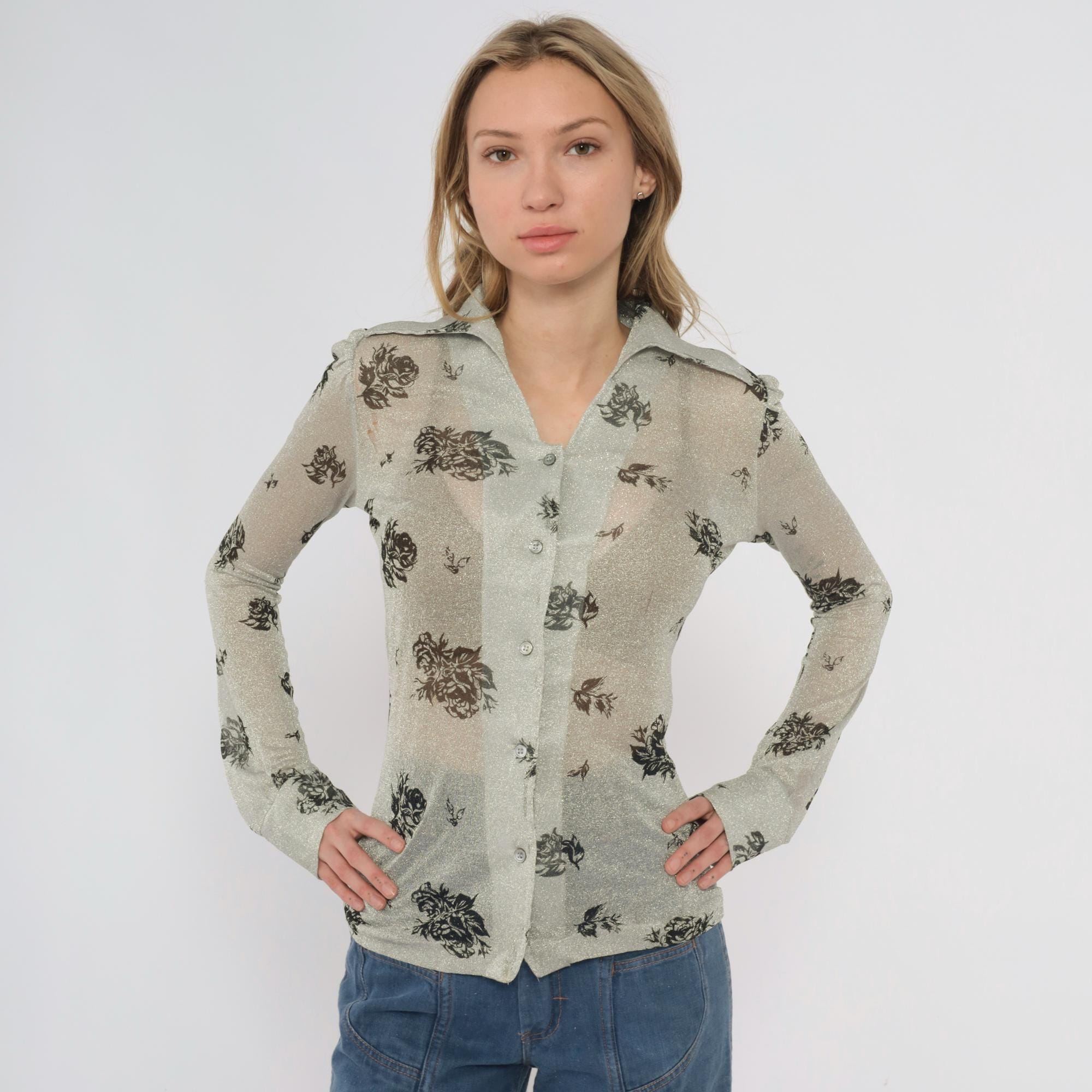 Vintage 70s lurex blouse in silver sage with black rose print. Button front closure. Long sleeves with button cuffs. Pointed collar. Semi-sheer metallic fabric. Straight hem.