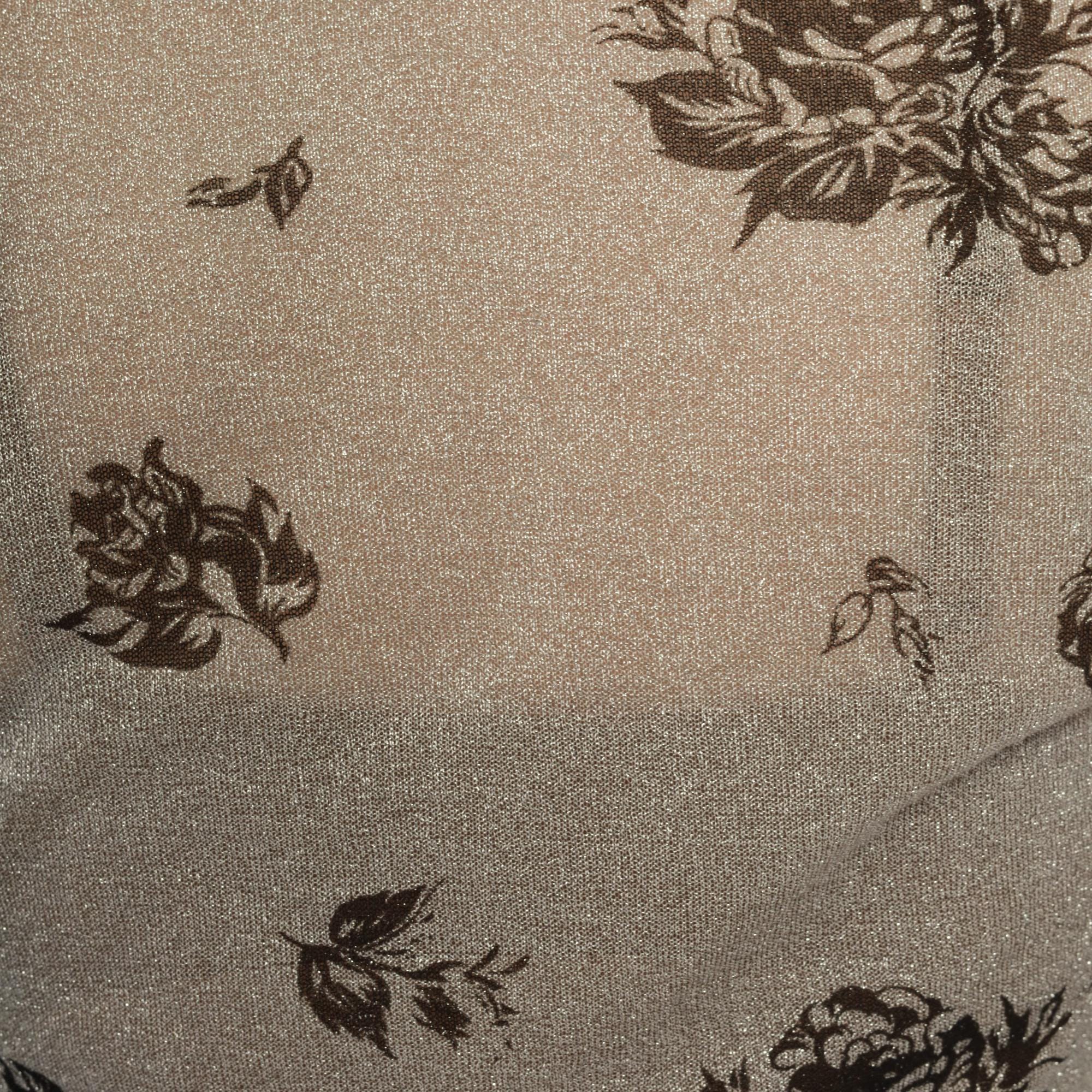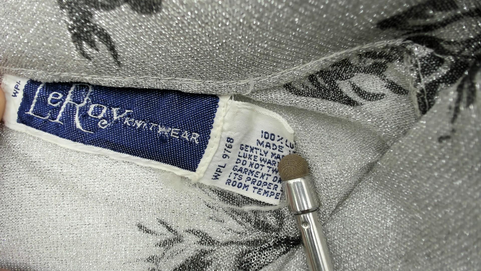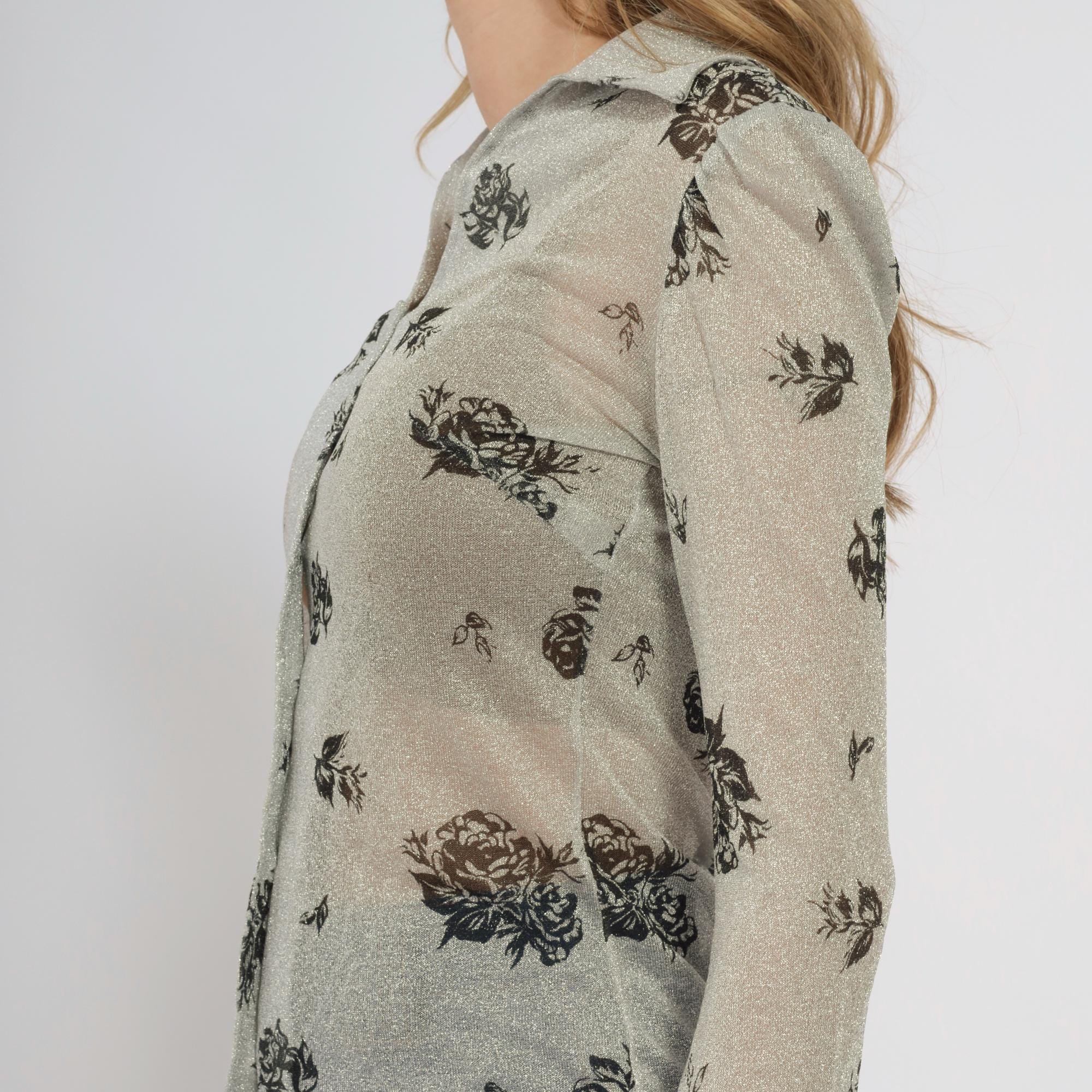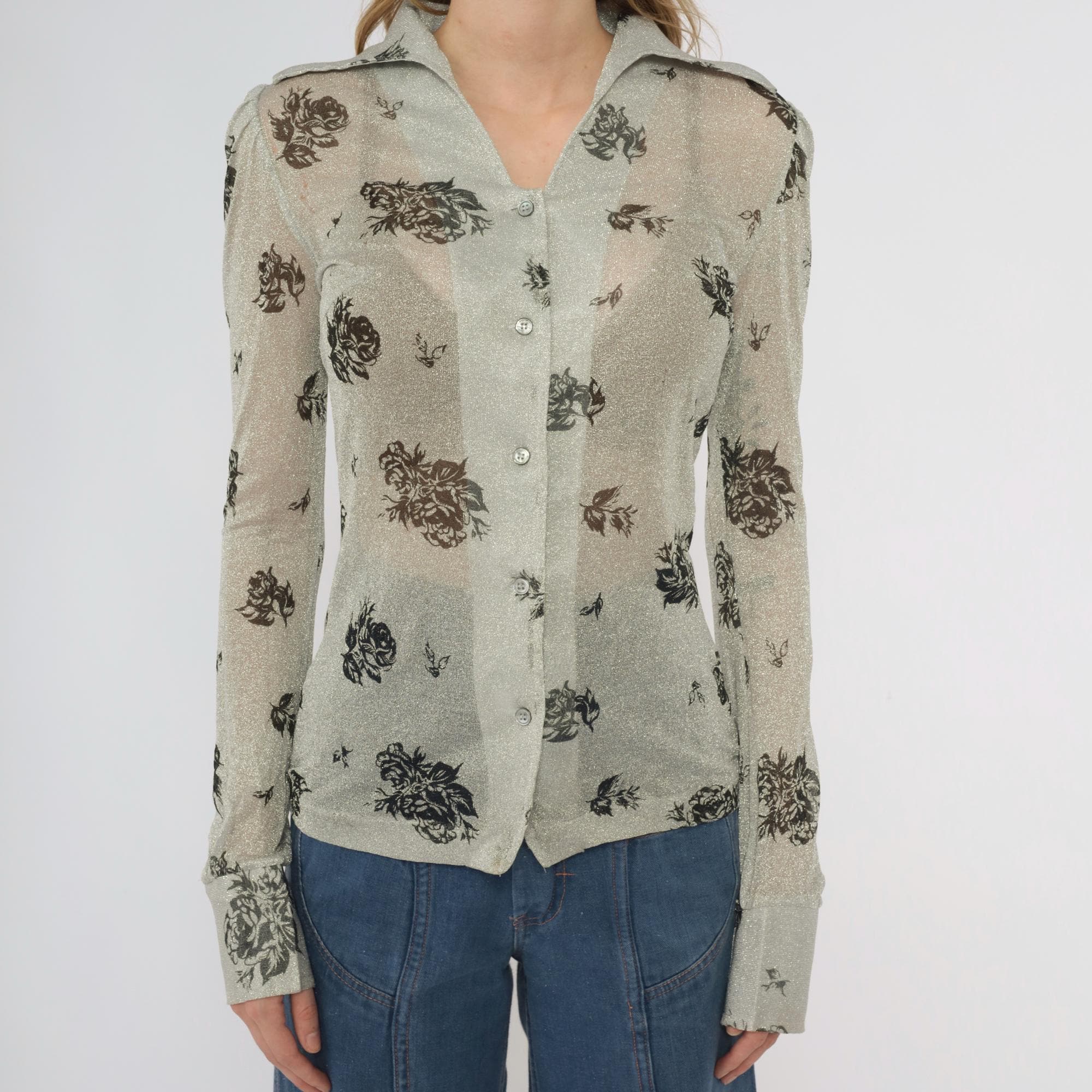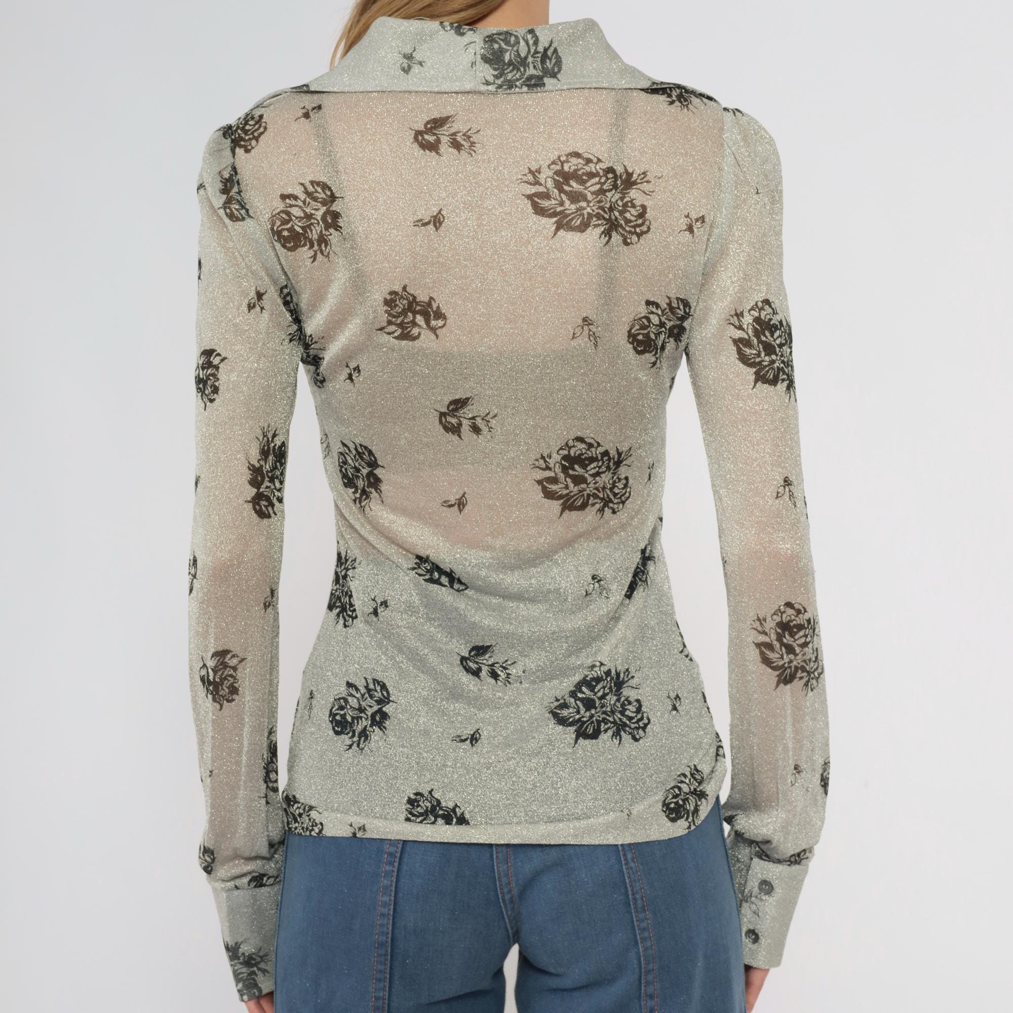 Vintage 70s lurex blouse in silver sage with black rose print. Button front closure. Long sleeves with button cuffs. Pointed collar. Semi-sheer metallic fabric. Straight hem.