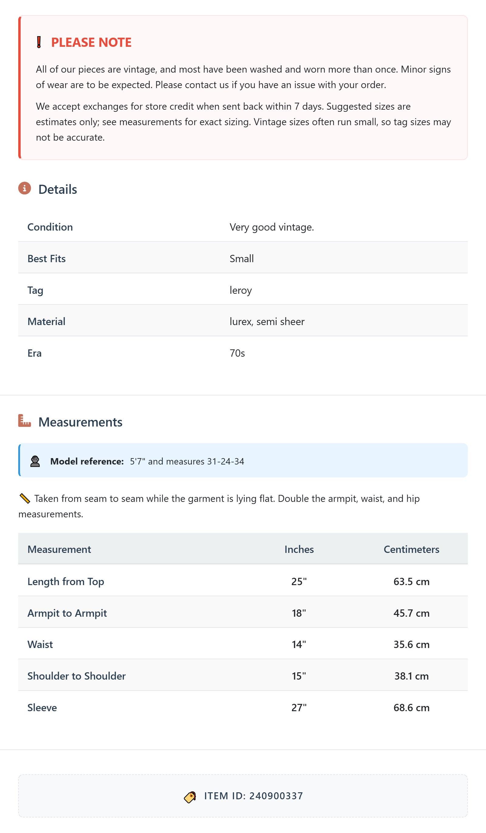 Suggested sizes are estimates only; see measurements for exact sizing. Vintage sizes often run small, so tag sizes may not be accurate.