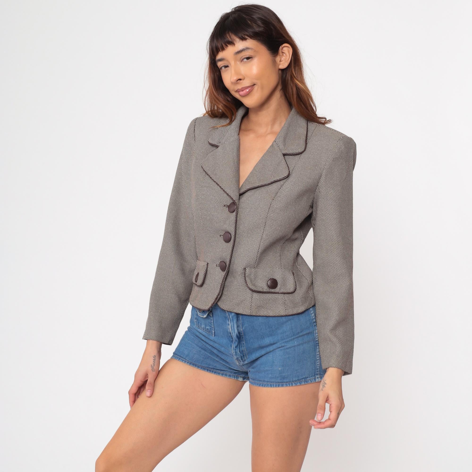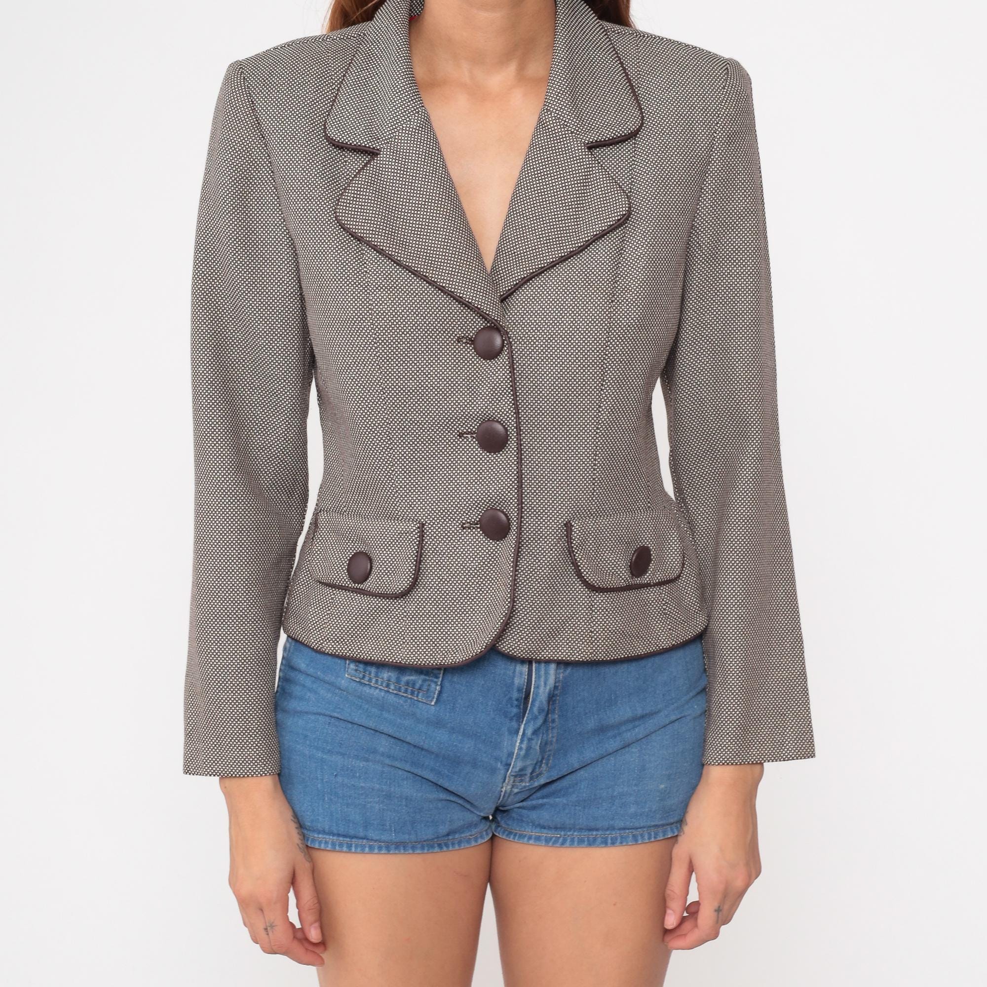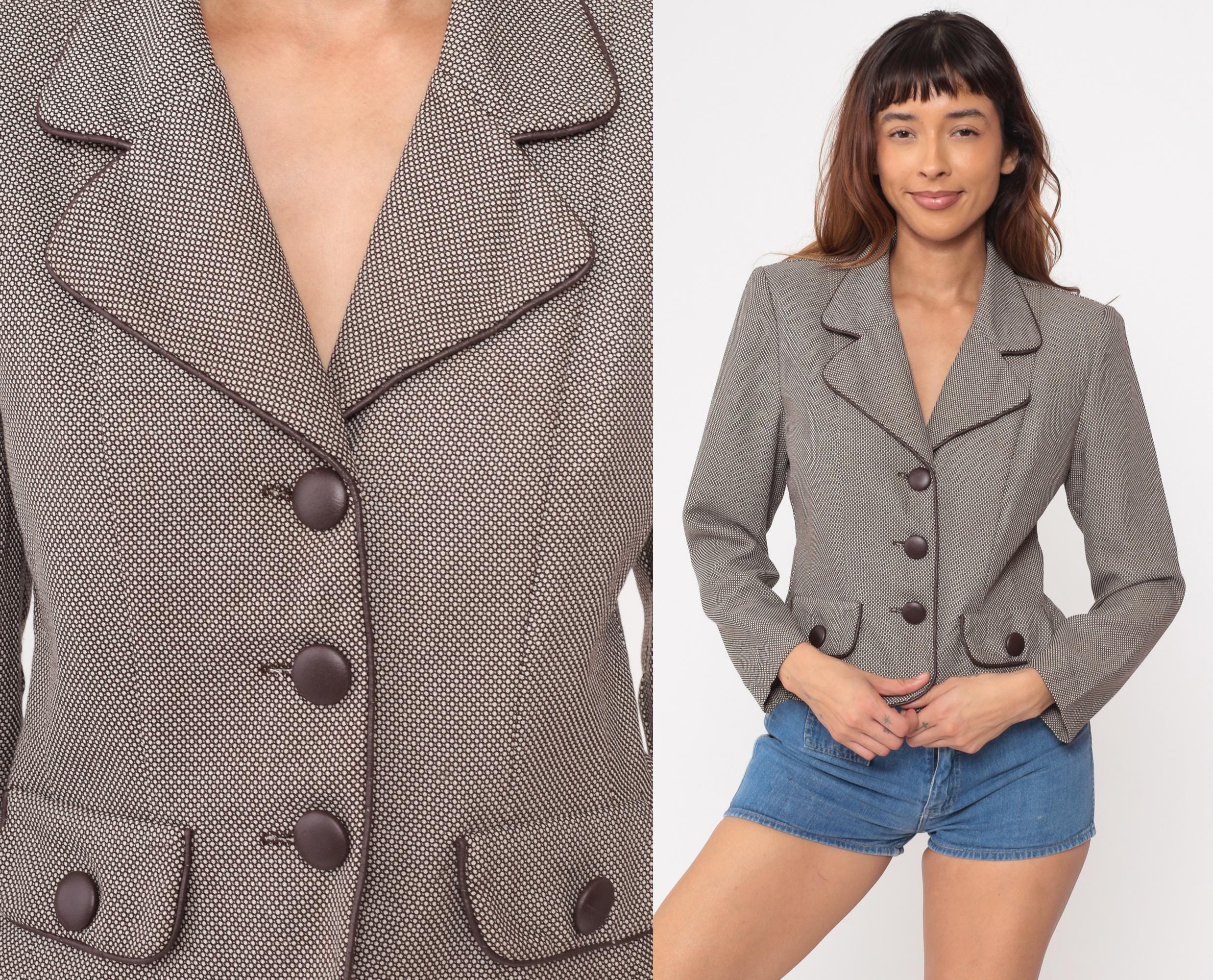 80s cropped blazer by Dani Max Petite for Lois Snyder. Features a subtle taupe and brown micro check pattern with contrasting dark brown piping throughout. Structured silhouette with defined shoulders. Three-button front closure with decorative buttons on front pockets.