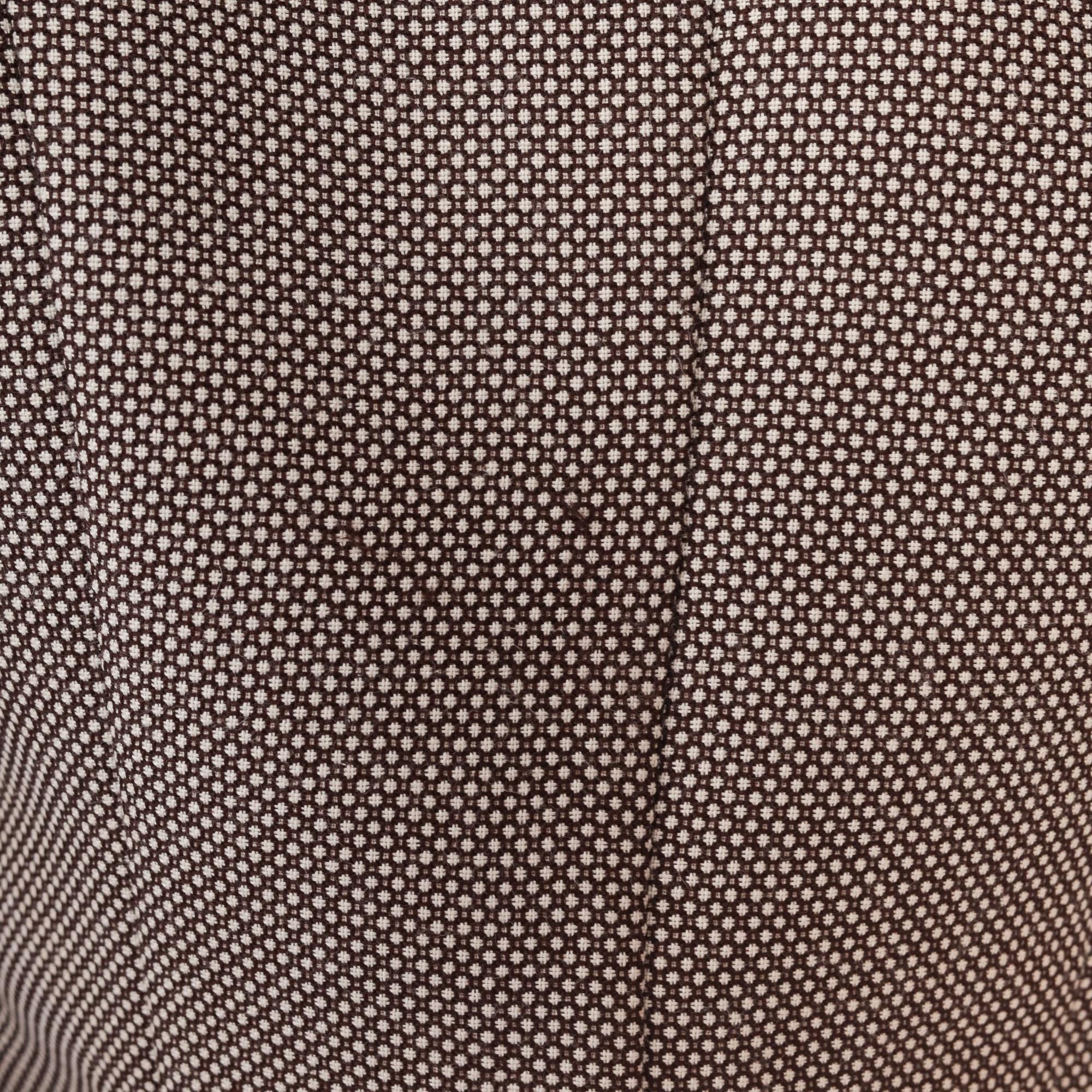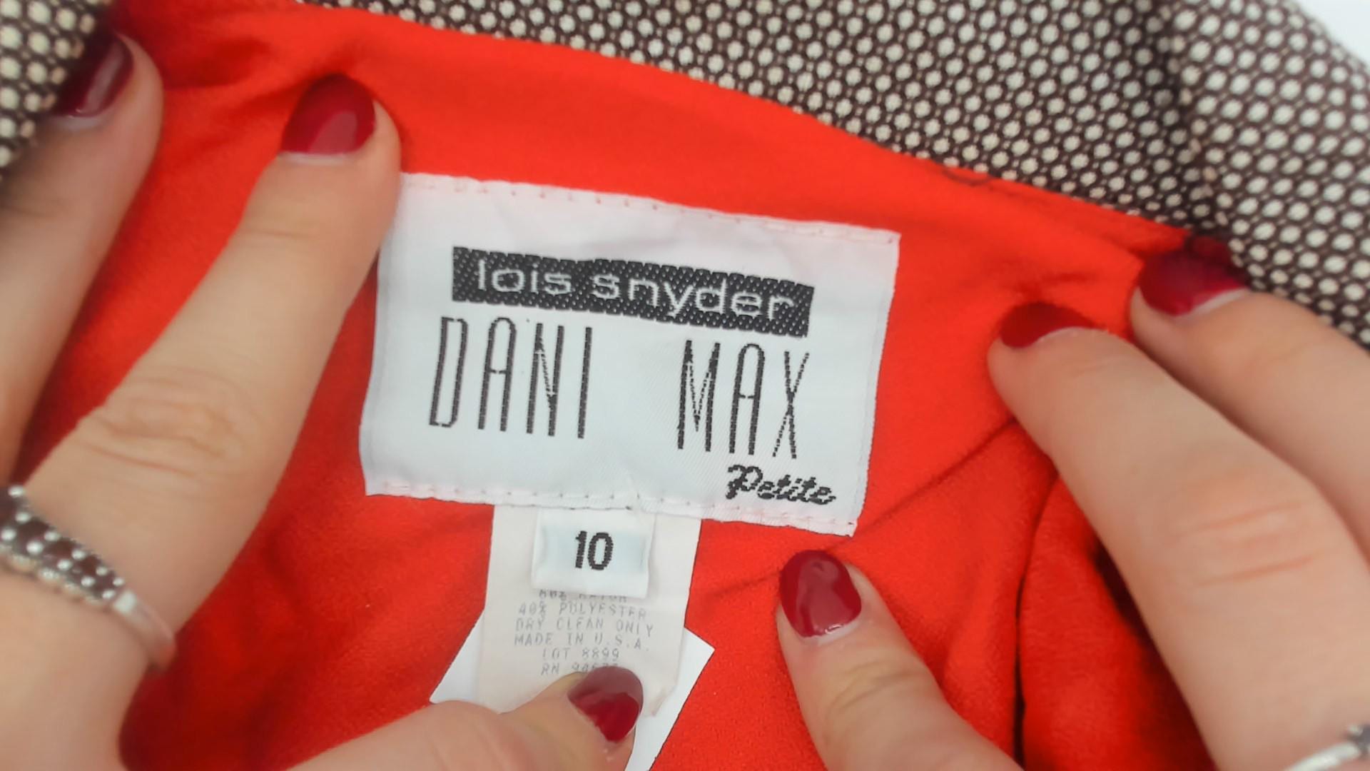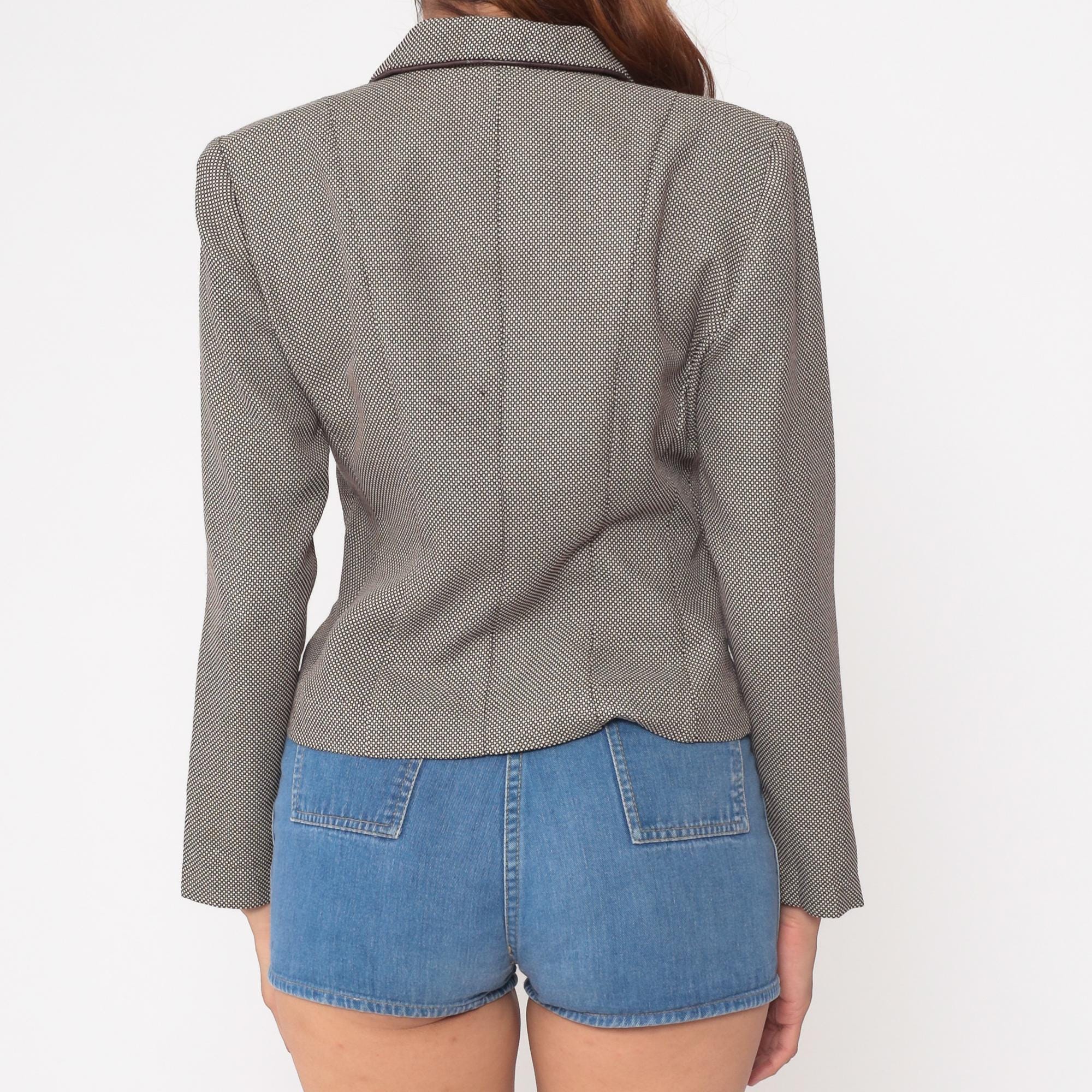 80s cropped blazer by Dani Max Petite for Lois Snyder. Features a subtle taupe and brown micro check pattern with contrasting dark brown piping throughout. Structured silhouette with defined shoulders. Three-button front closure with decorative buttons on front pockets.