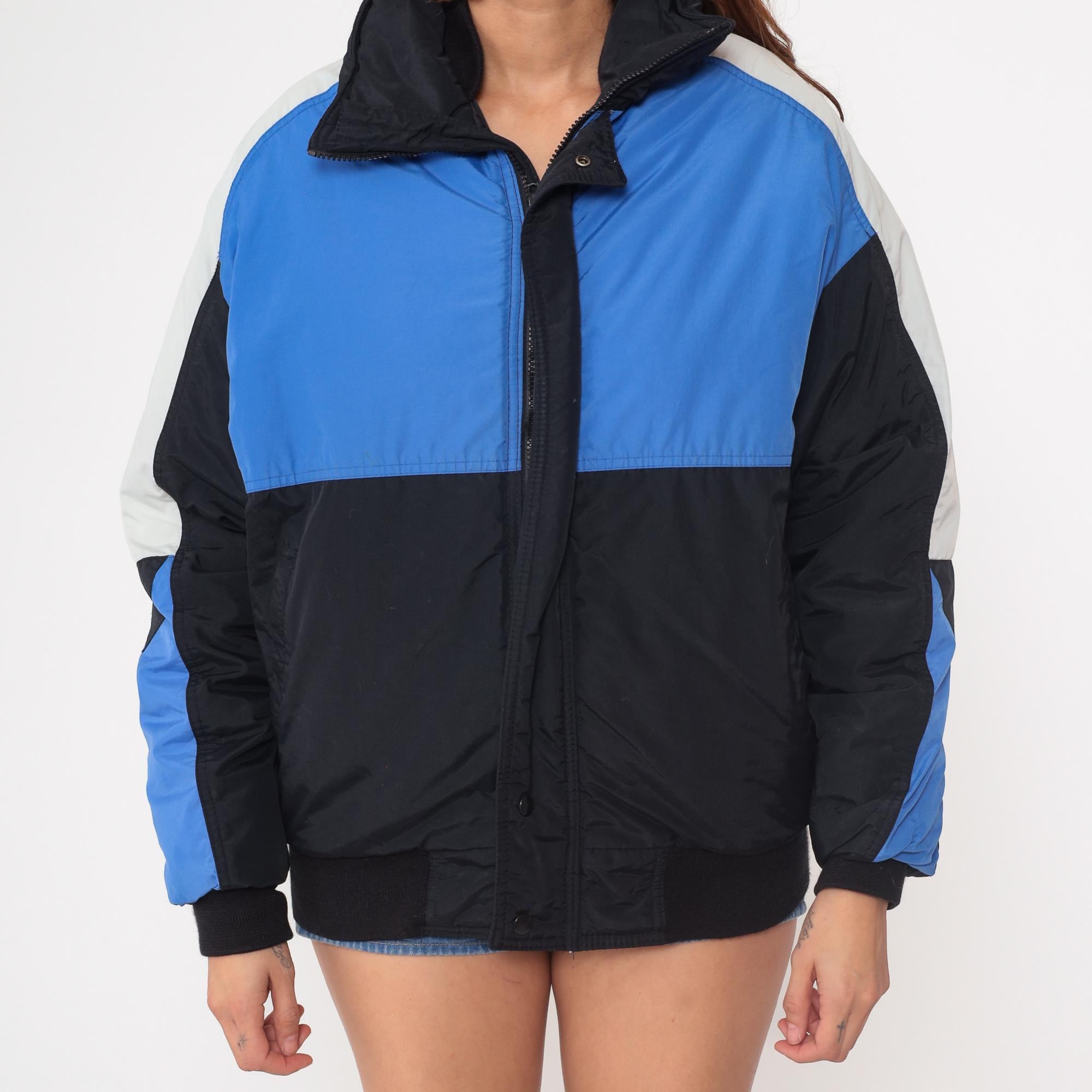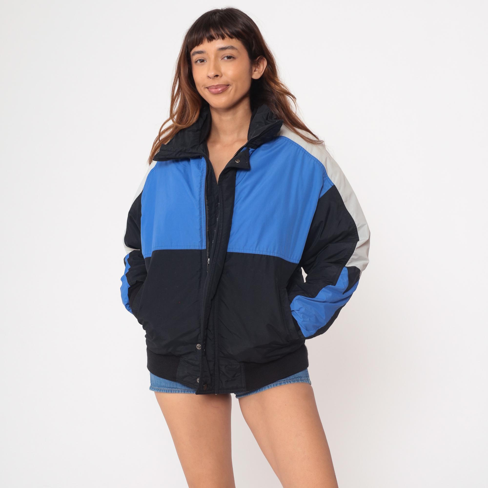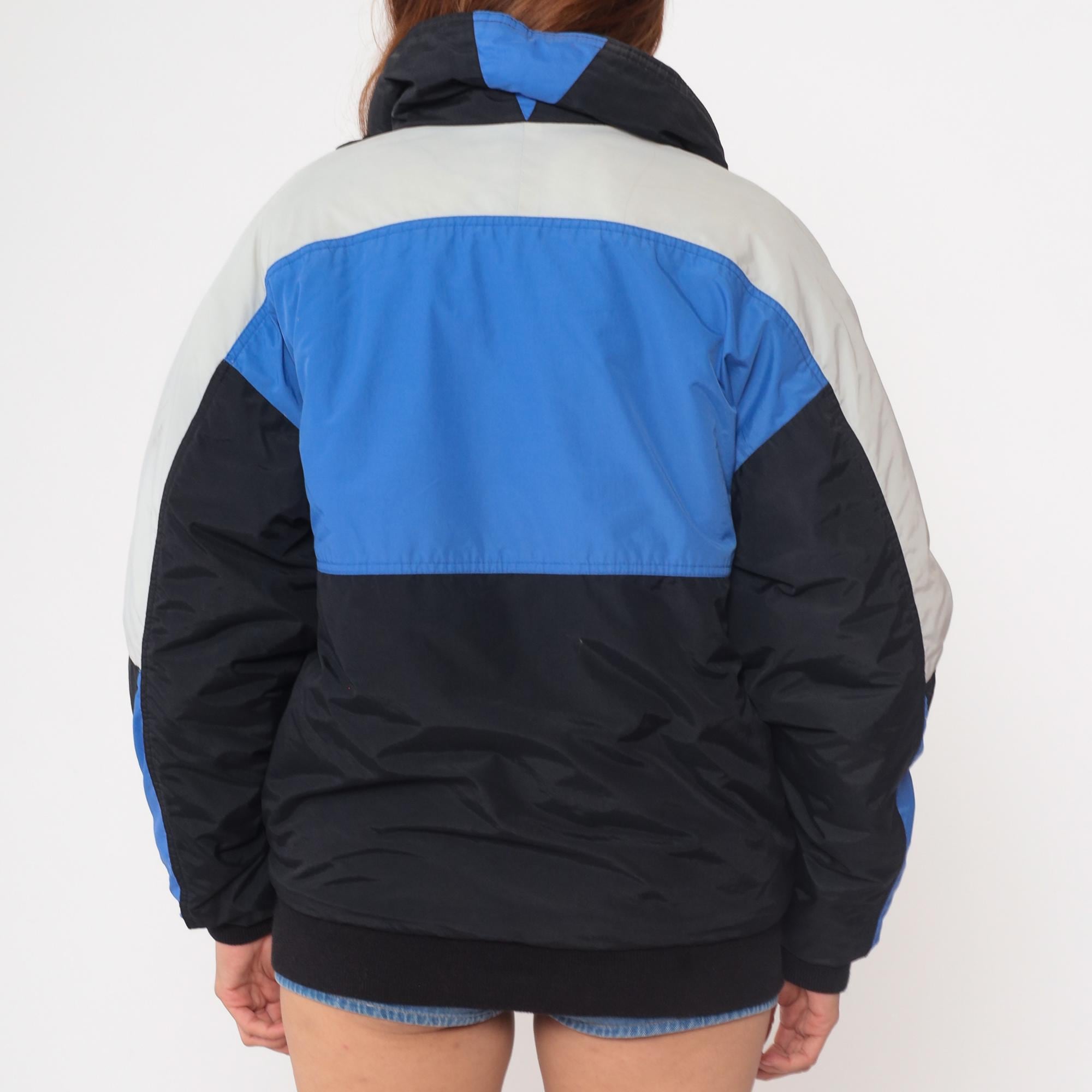 Vintage 90s color block windbreaker by Field and Stream. Blue, black, and white panels. Front zip closure. Stand-up collar. Elastic cuffs and waistband. Two front pockets. Nylon shell with polyester fill. Lined interior. Bomber jacket style.