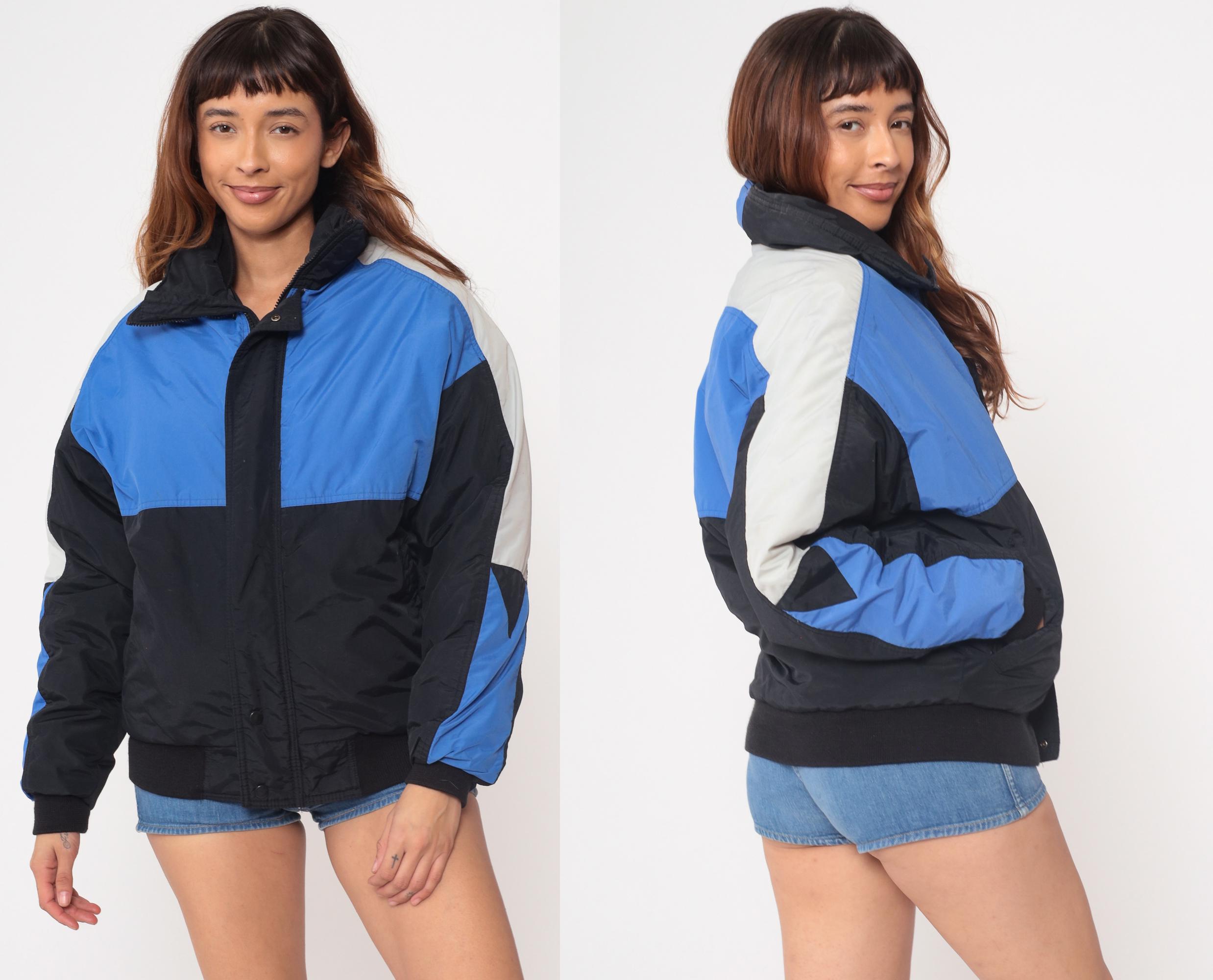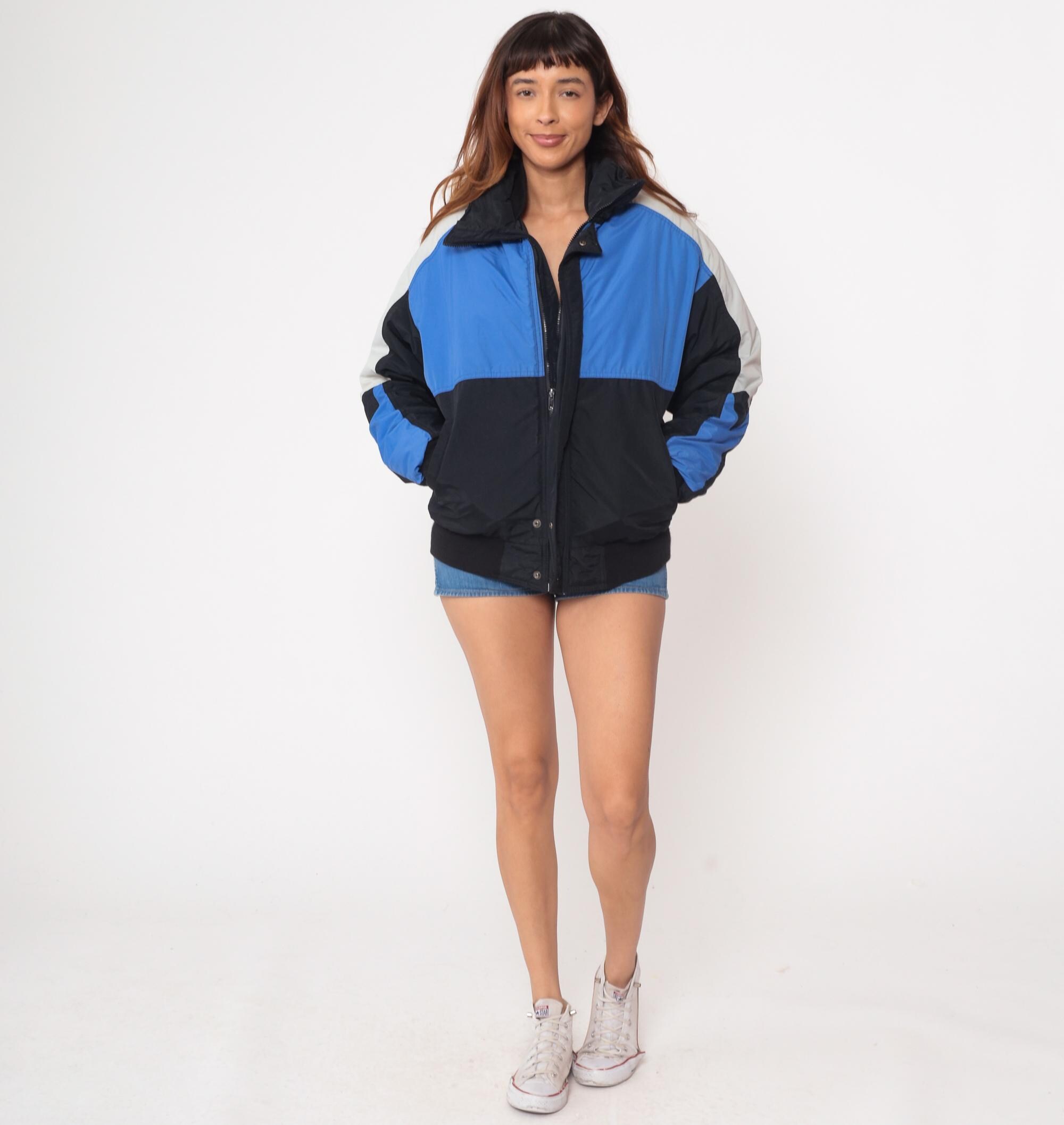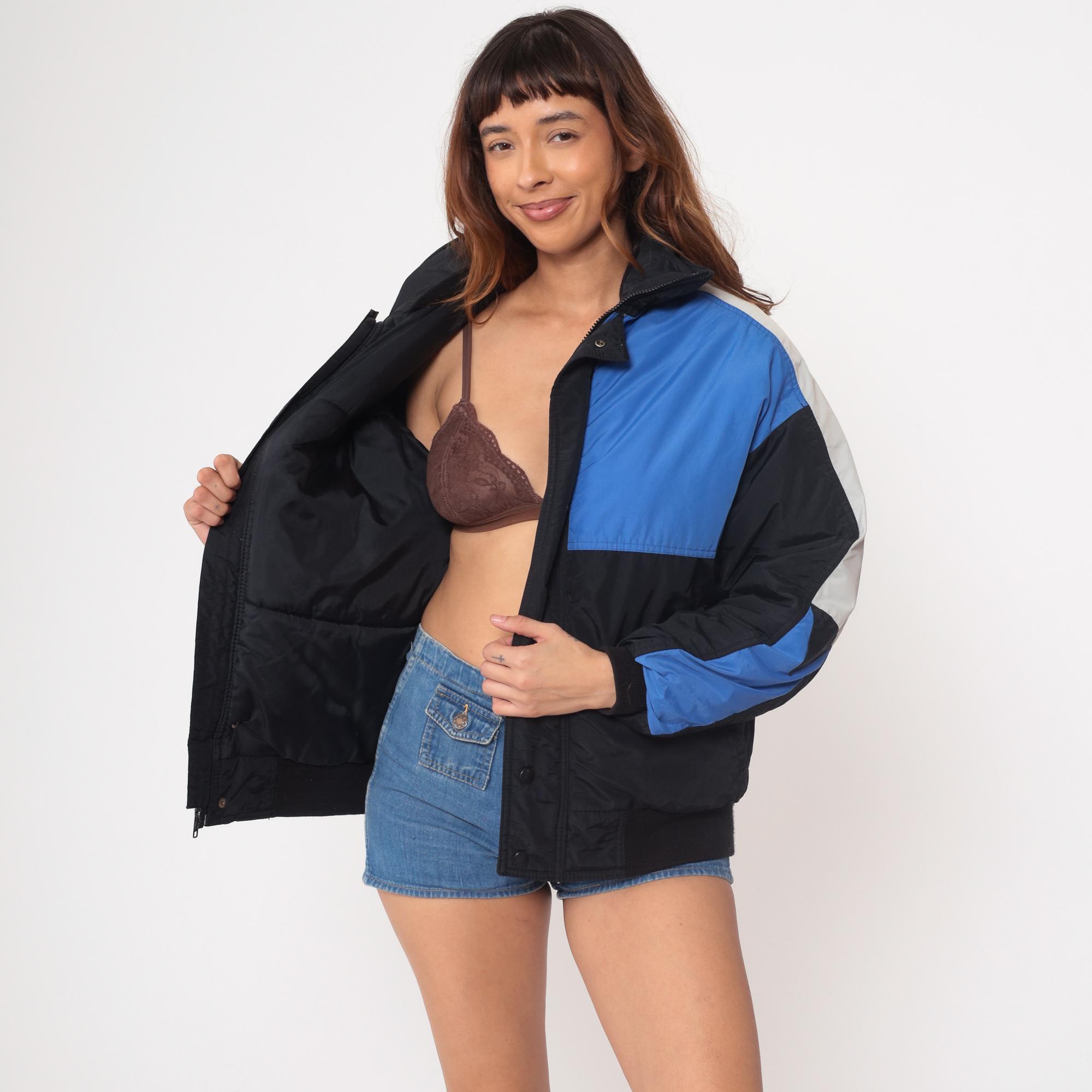 Vintage 90s color block windbreaker by Field and Stream. Blue, black, and white panels. Front zip closure. Stand-up collar. Elastic cuffs and waistband. Two front pockets. Nylon shell with polyester fill. Lined interior. Bomber jacket style.