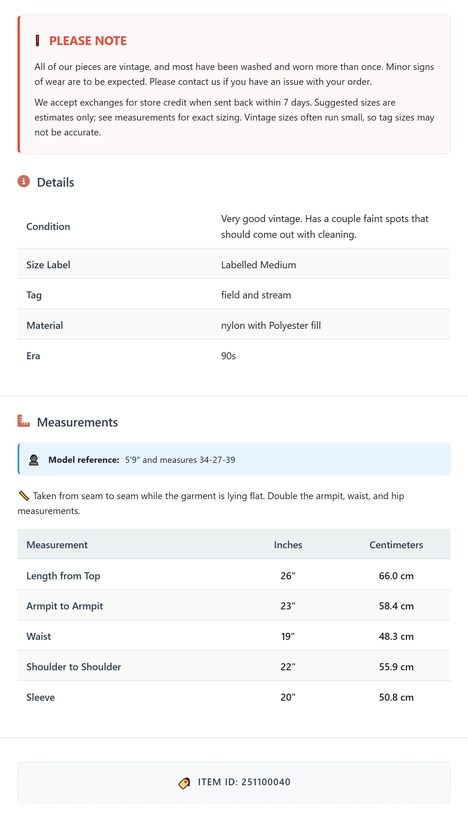 All of our pieces are vintage, and most have been washed and worn more than once. Minor signs of wear are to be expected. Please contact us if you have an issue with your order. We accept exchanges for store credit when sent back within 7 days.