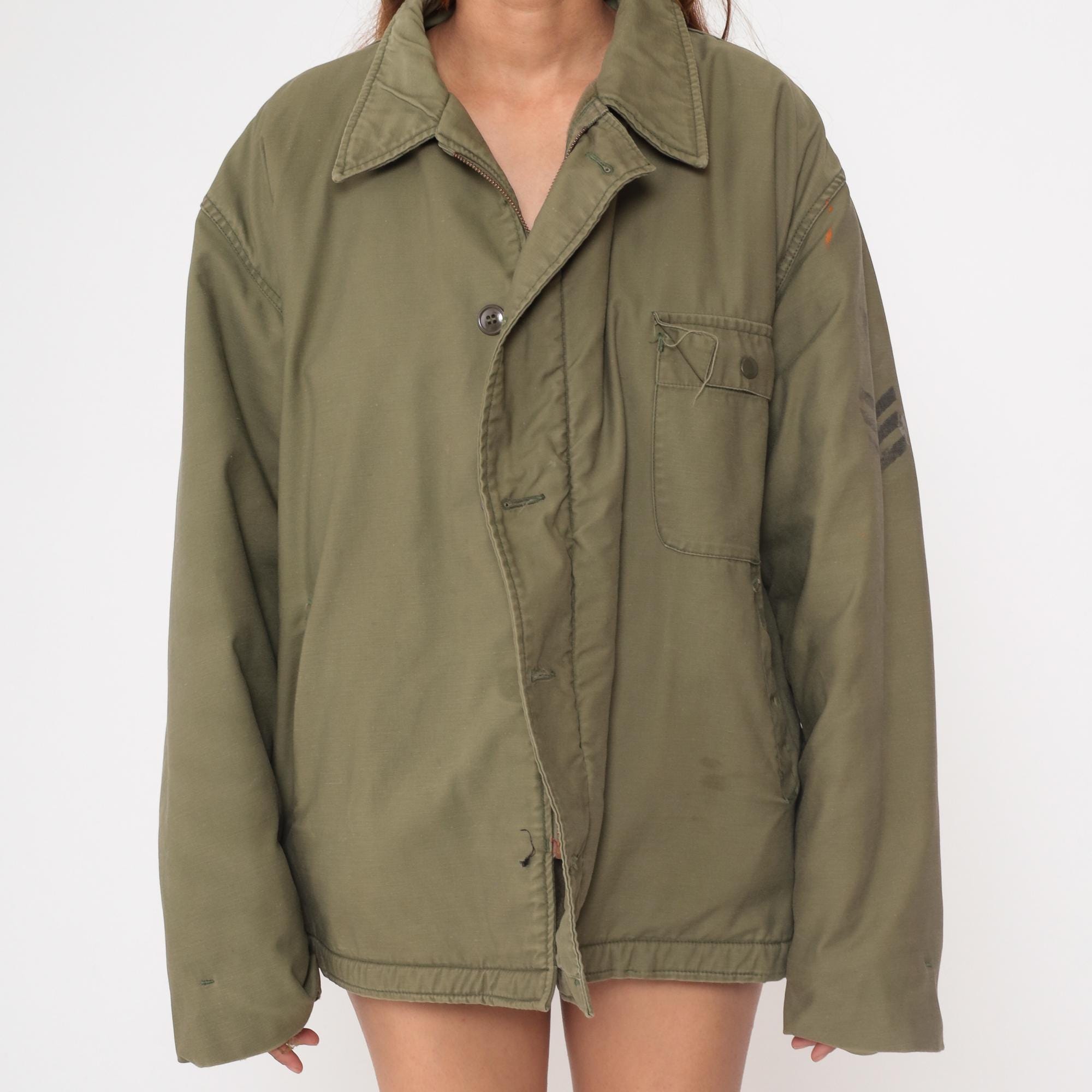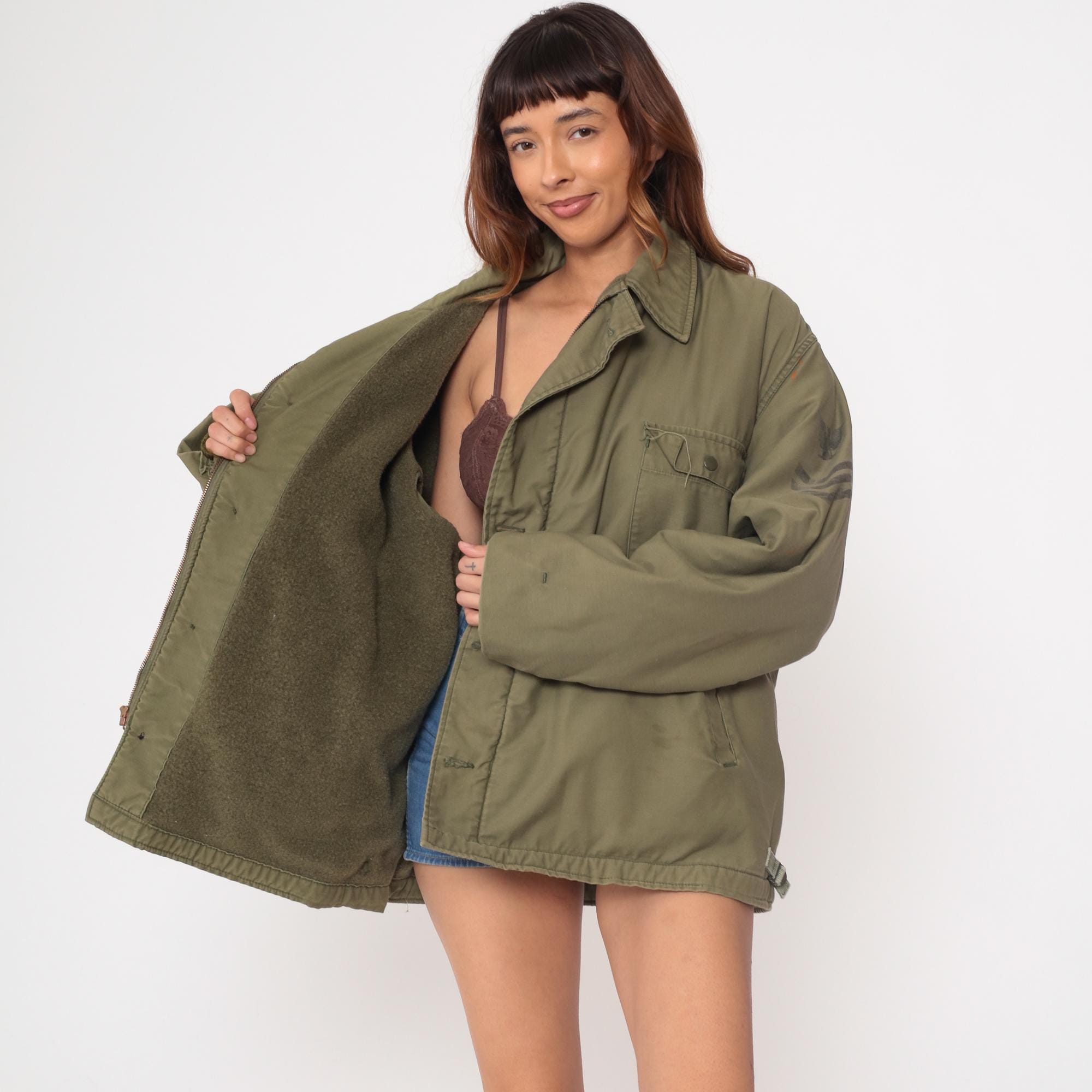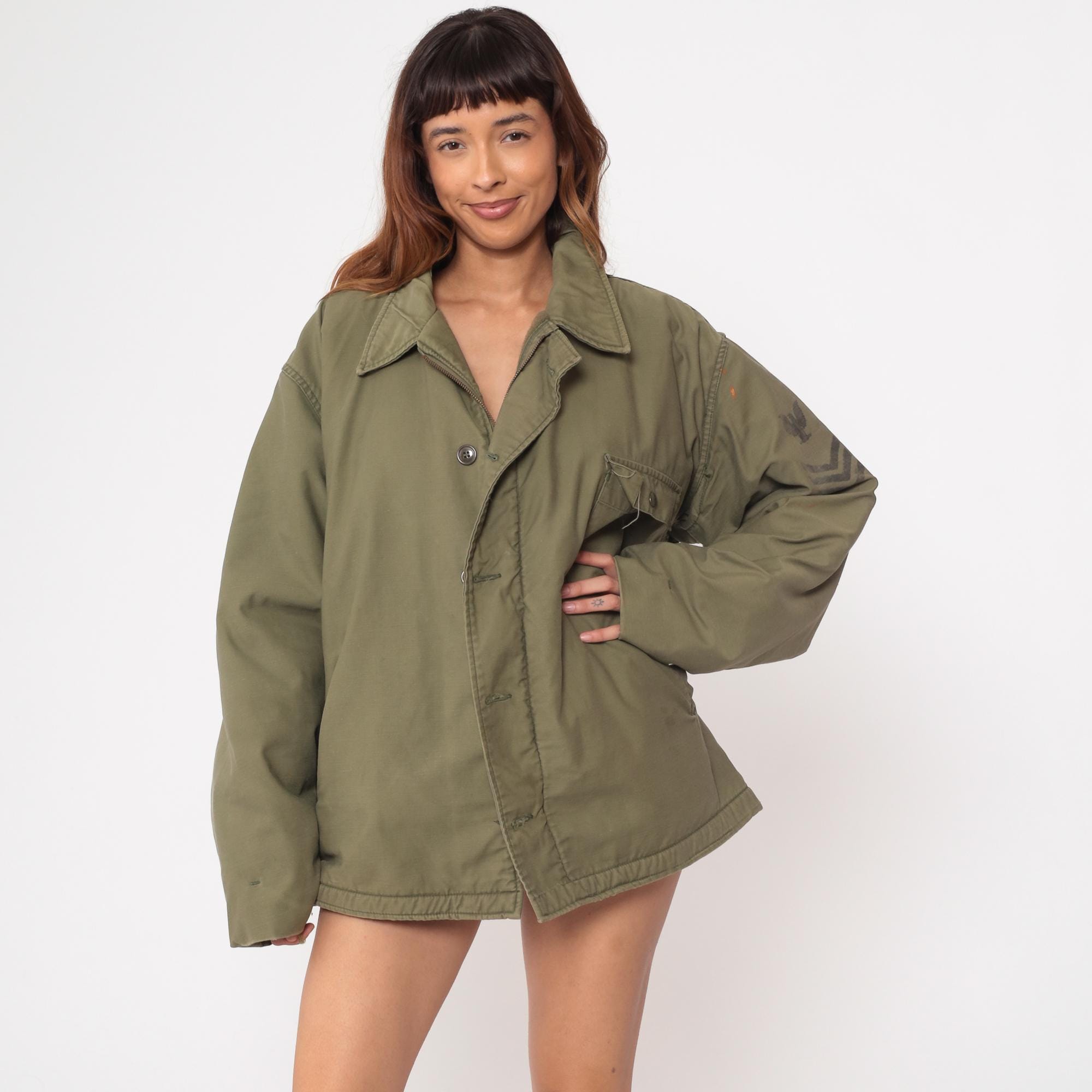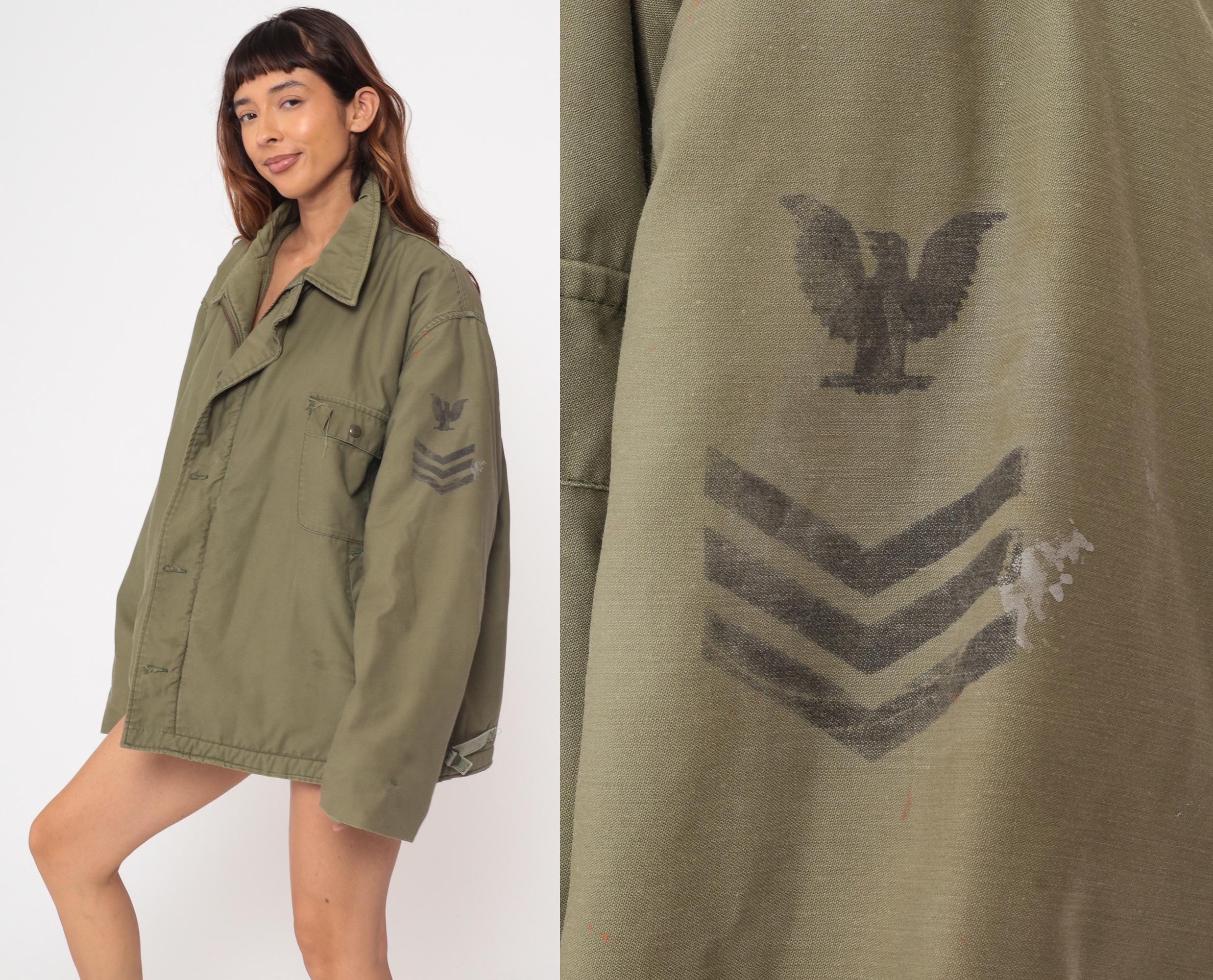 Vintage 70s military field jacket. Olive drab/army green color. US Navy with sergeant chevron rank patches on sleeve. Front button closure. Fleece/wool lined for cold weather. Collar. Front flap pocket. Distressed condition with some paint marks and missing buttons.