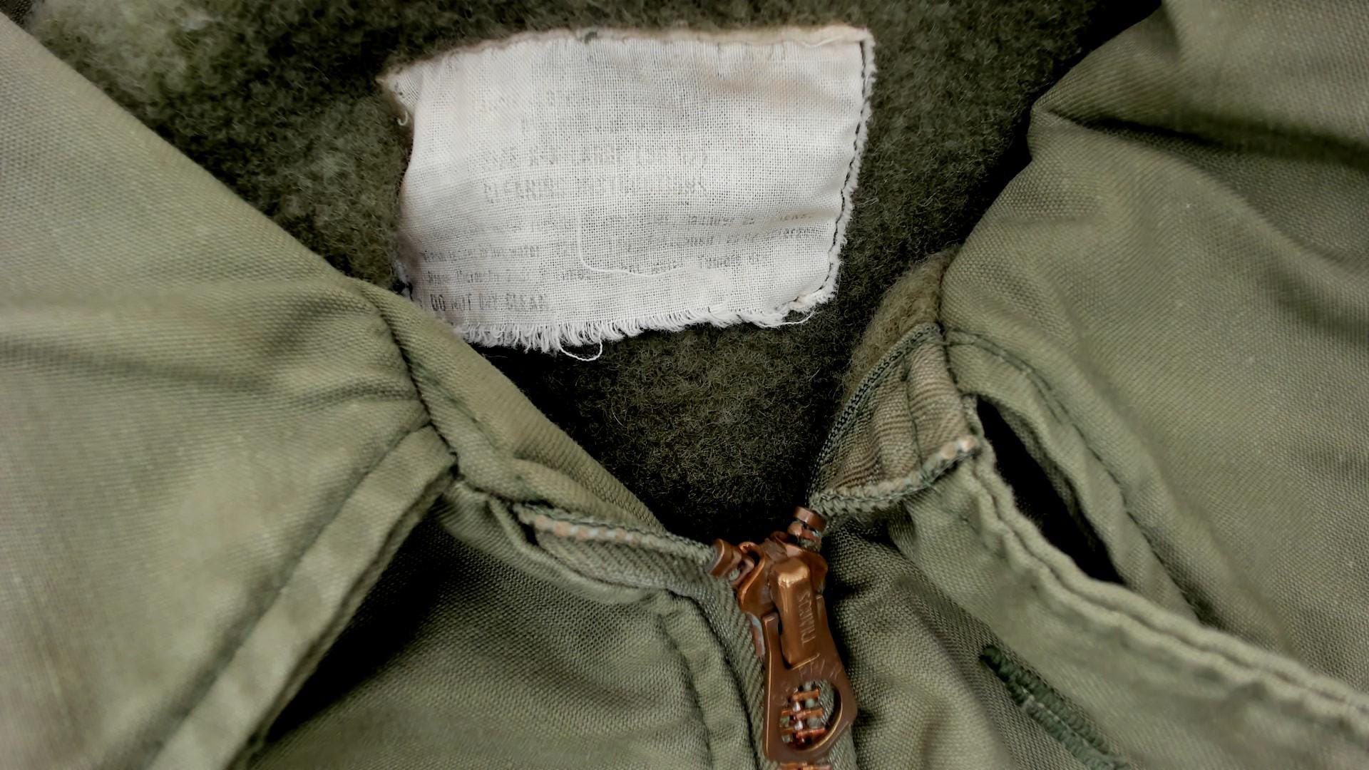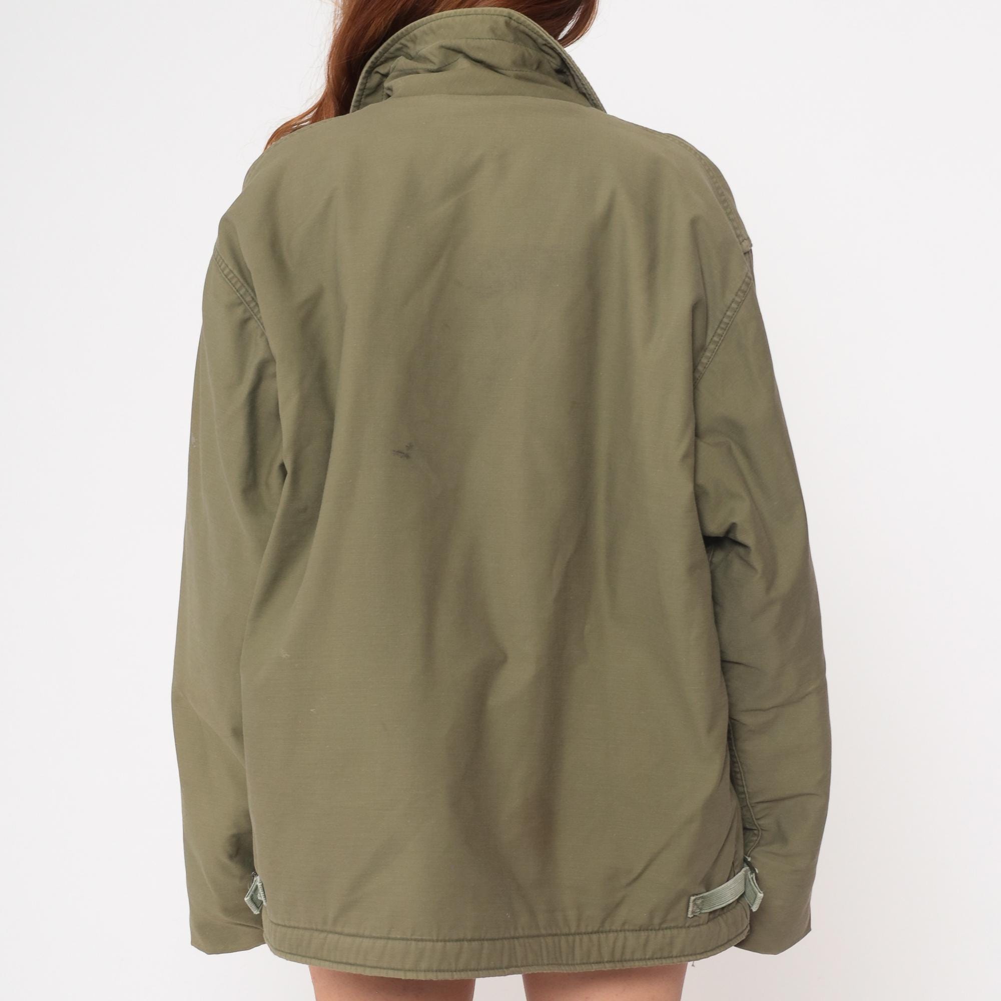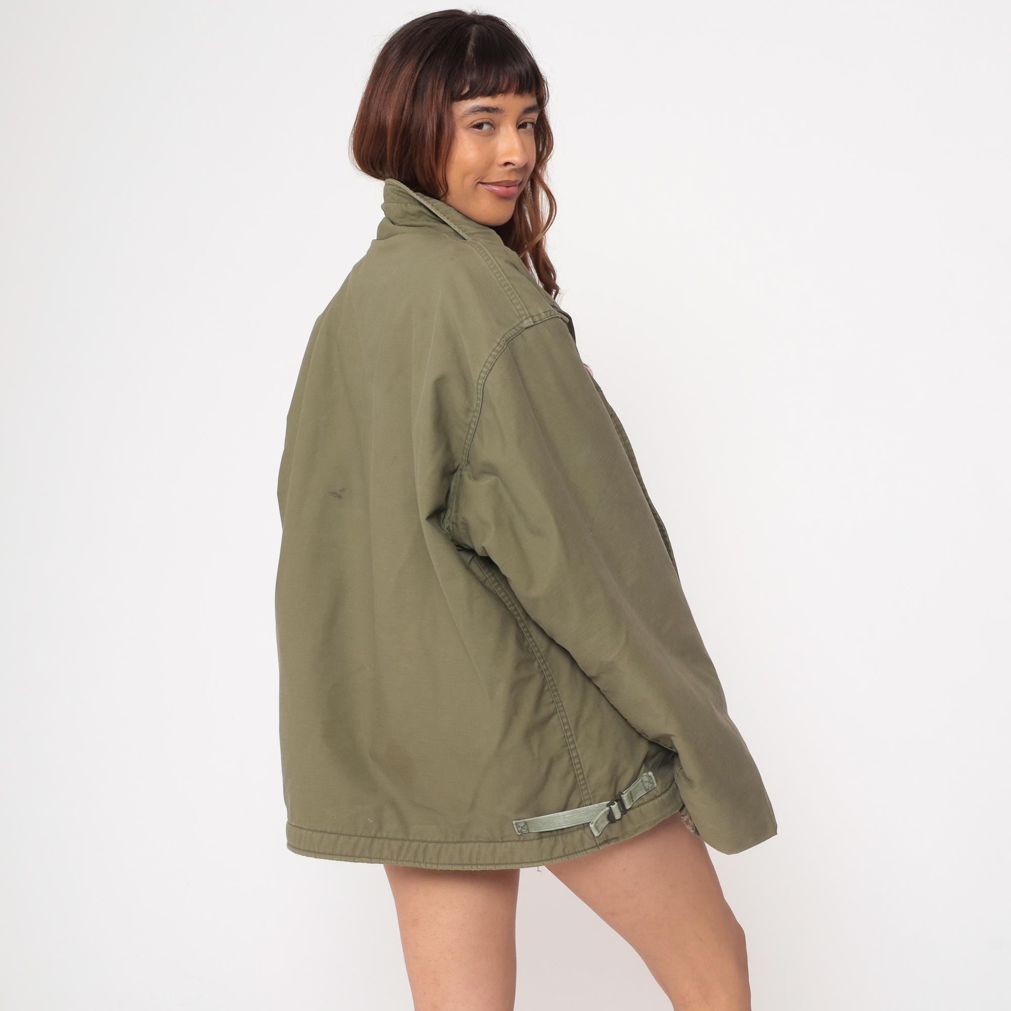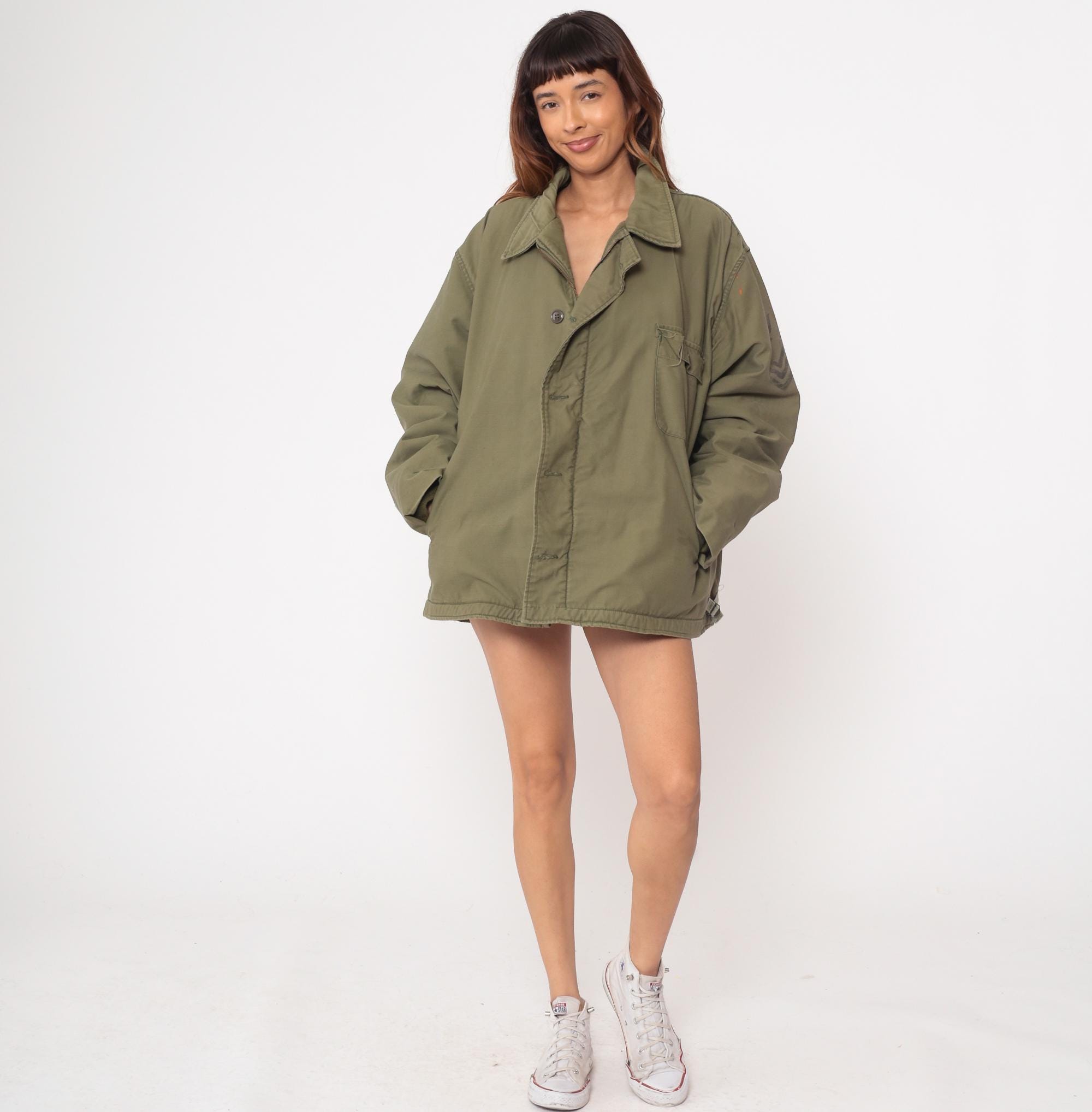 Vintage 70s military field jacket. Olive drab/army green color. US Navy with sergeant chevron rank patches on sleeve. Front button closure. Fleece/wool lined for cold weather. Collar. Front flap pocket. Distressed condition with some paint marks and missing buttons.