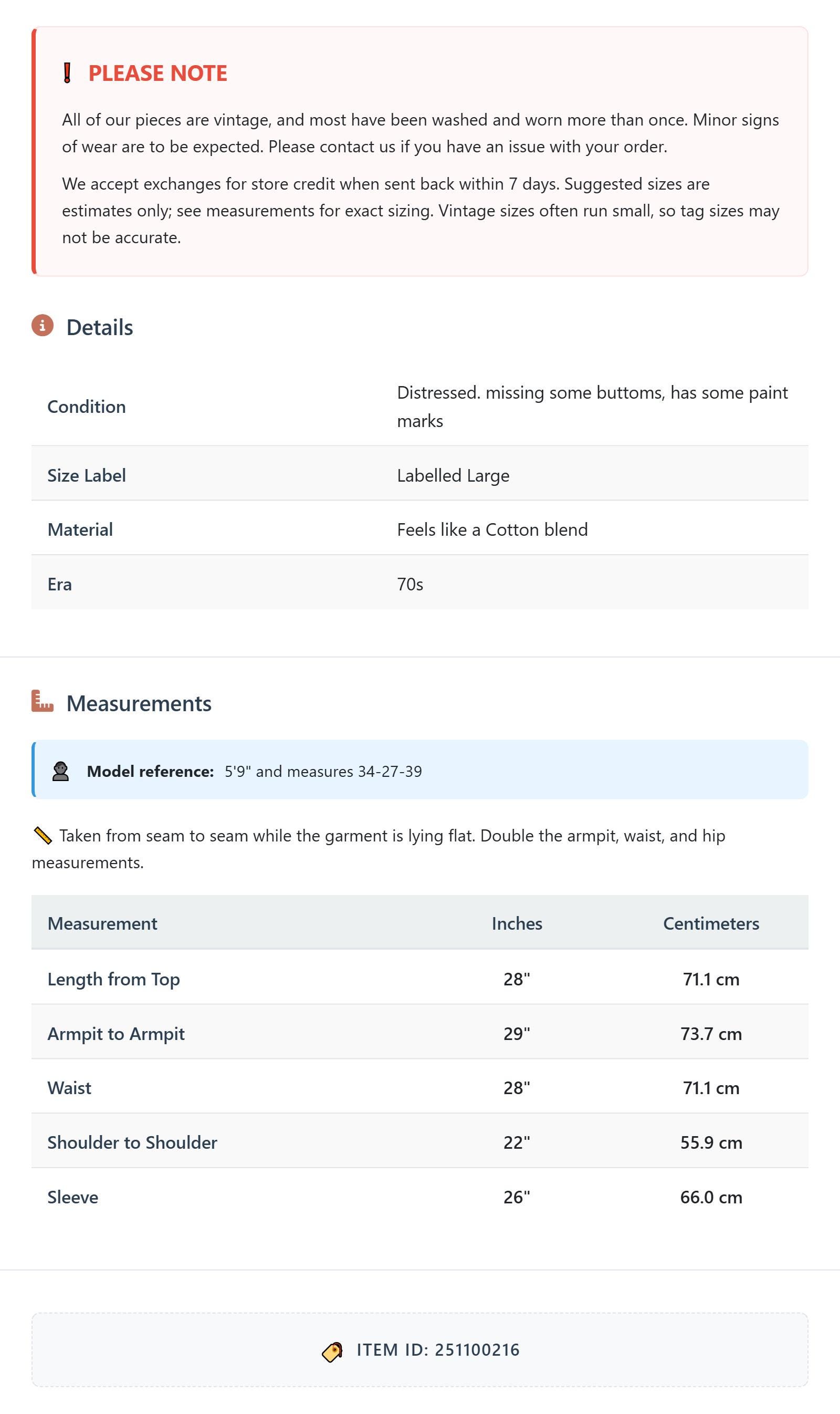 All of our pieces are vintage, and most have been washed and worn more than once. Minor signs of wear are to be expected. Please contact us if you have an issue with your order. We accept exchanges for store credit when sent back within 7 days.