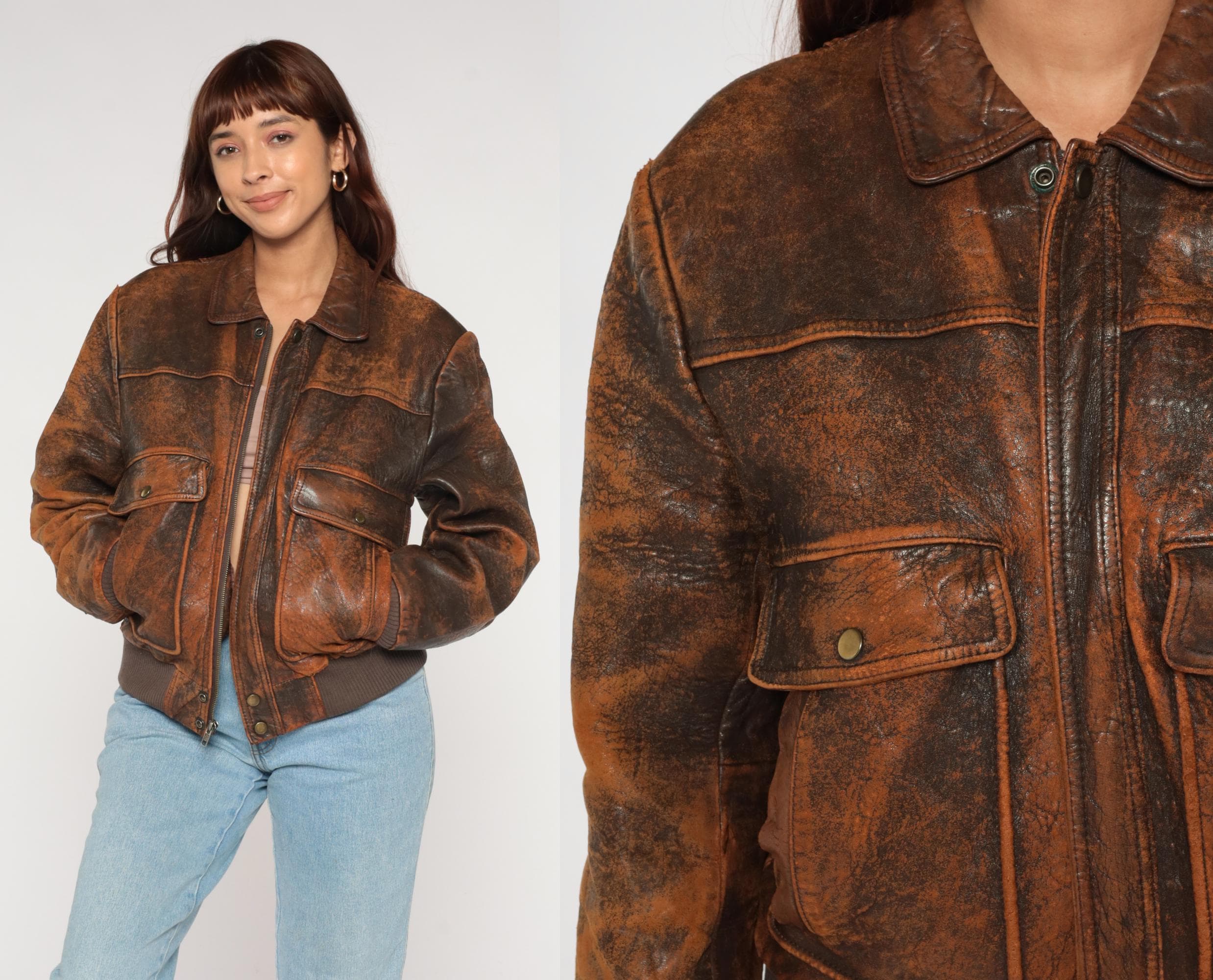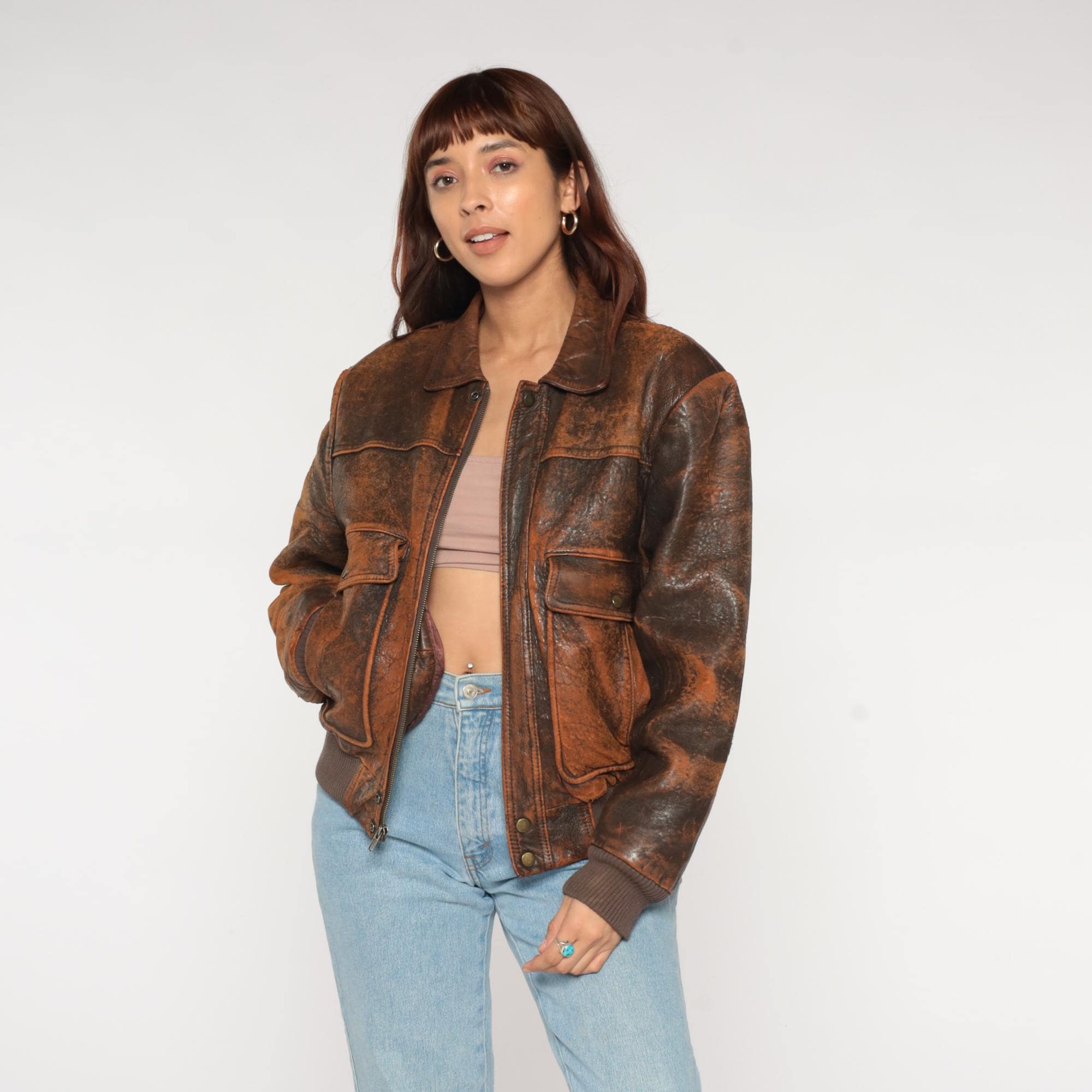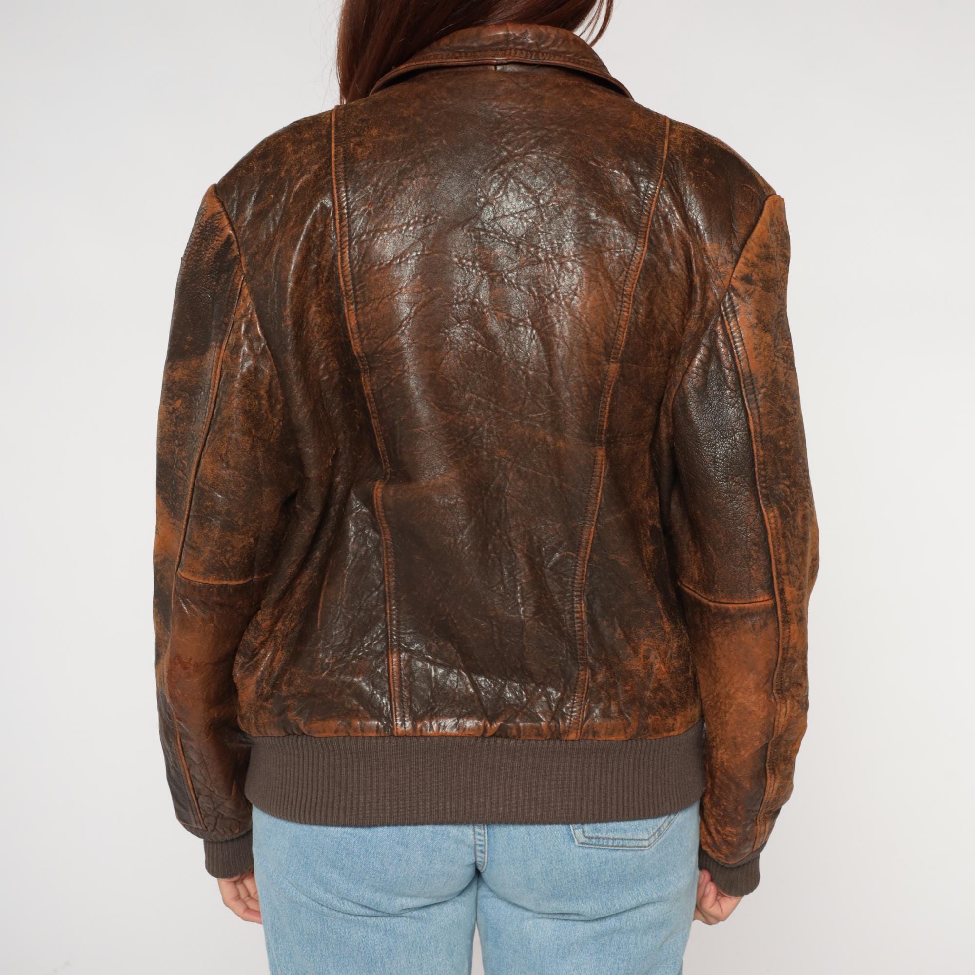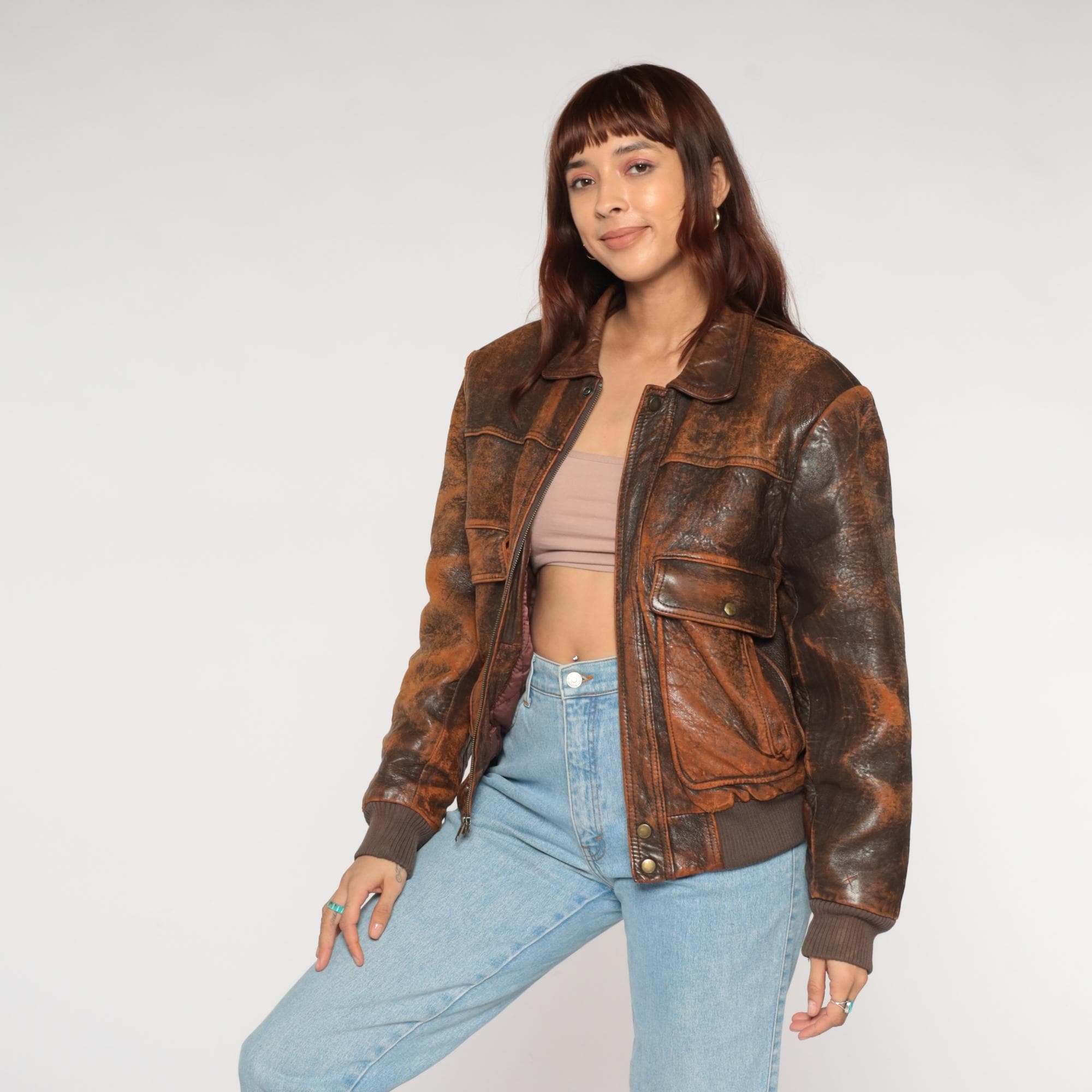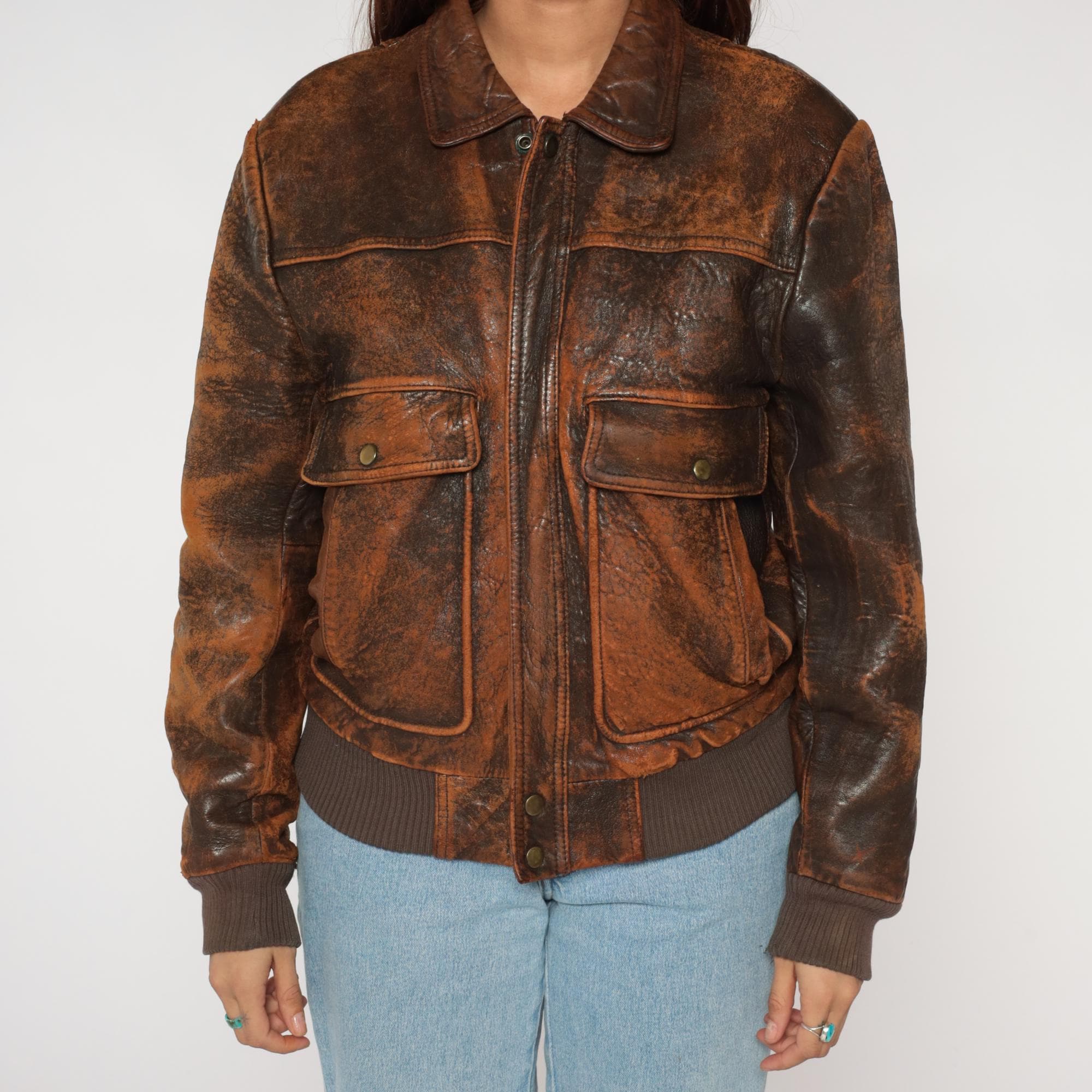 80s Chia brown leather bomber jacket with rich, time-earned patina throughout. Genuine leather exterior with beautiful natural aging and character-rich distressing. Features classic flight jacket silhouette with traditional pointed collar, front zip closure, and ribbed knit waistband and cuffs. Dual front snap-flap cargo pockets with authentic military-inspired design.