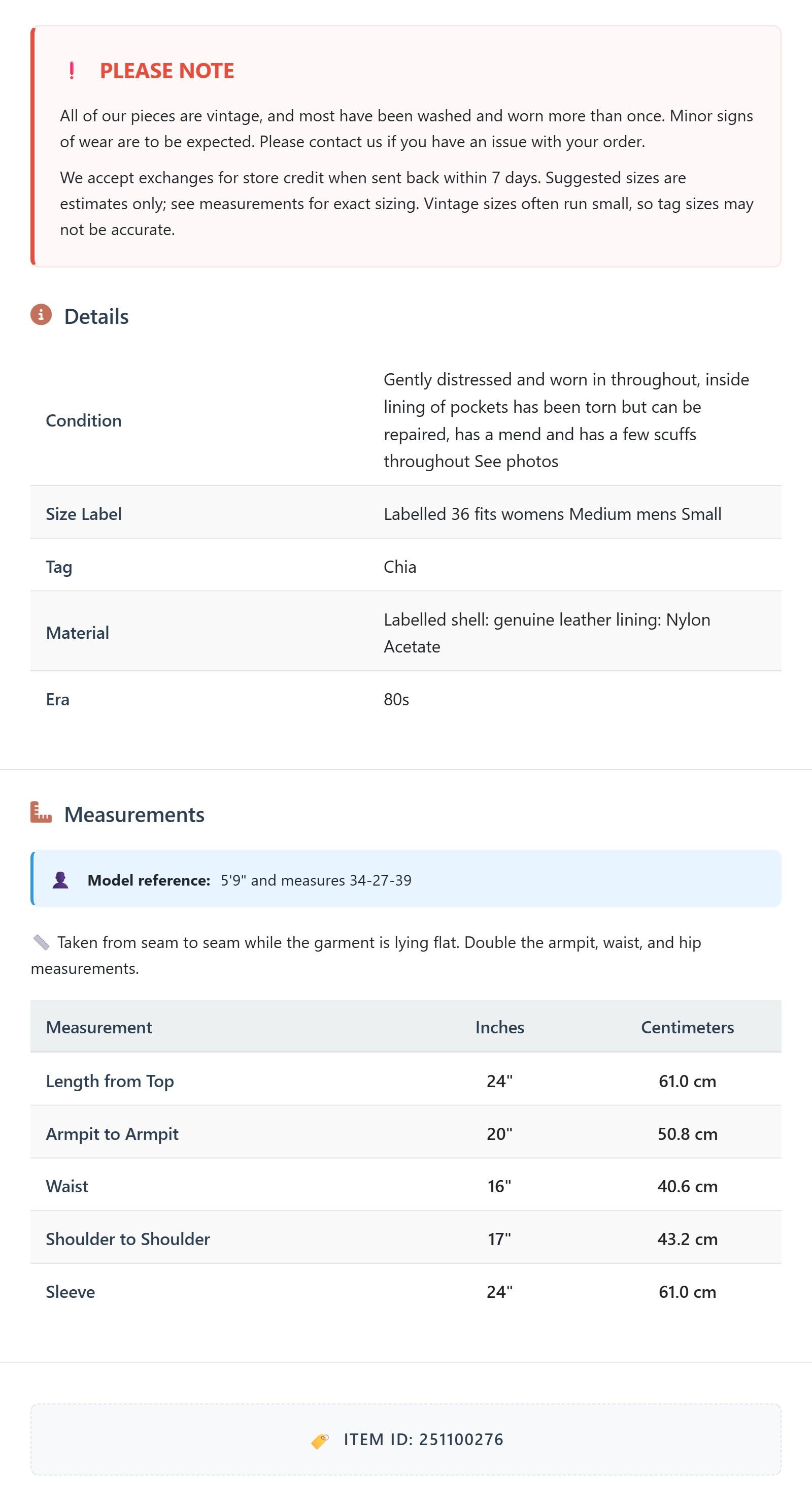 All of our pieces are vintage, and most have been washed and worn more than once. Minor signs of wear are to be expected. Please contact us if you have an issue with your order. We accept exchanges for store credit when sent back within 7 days.