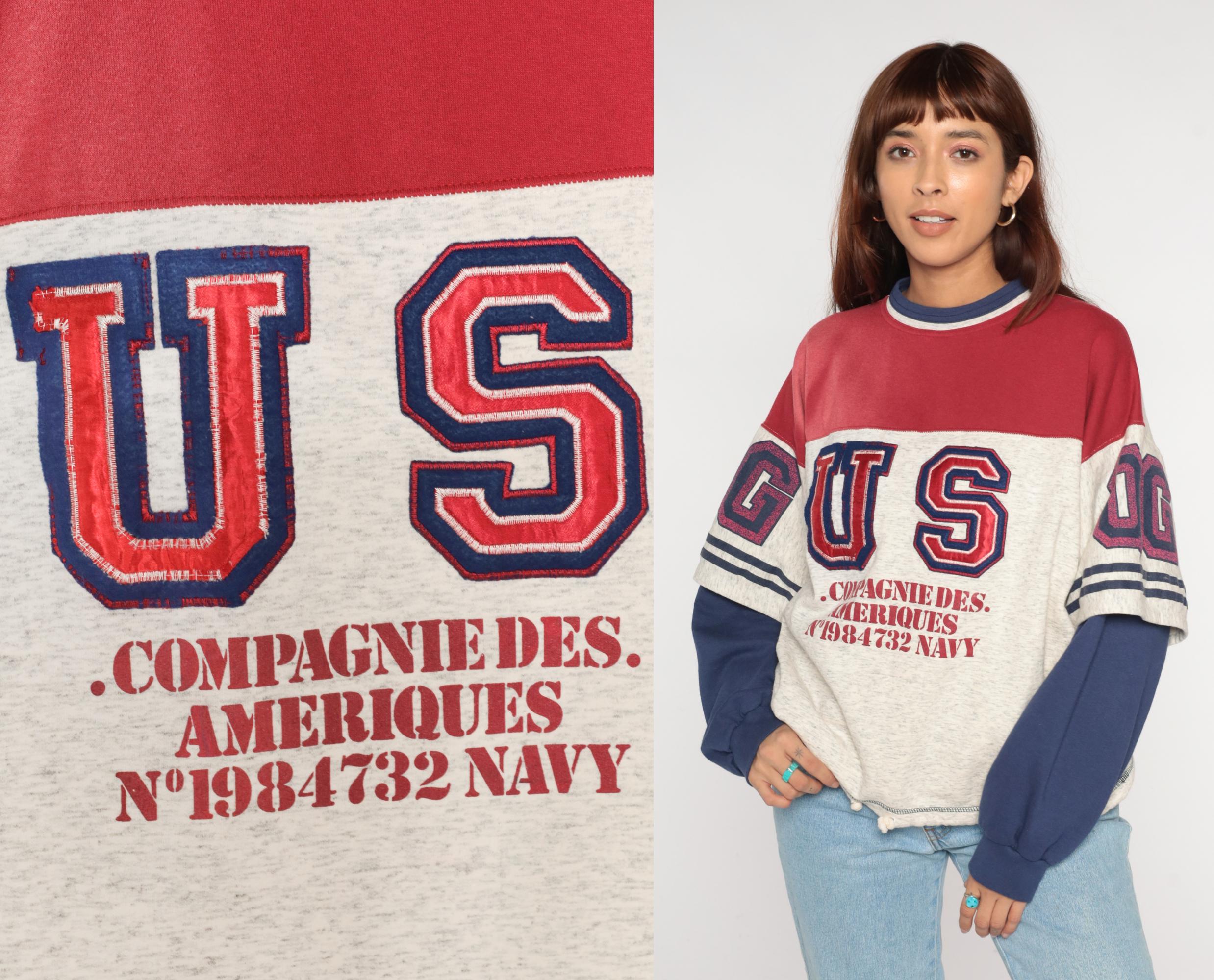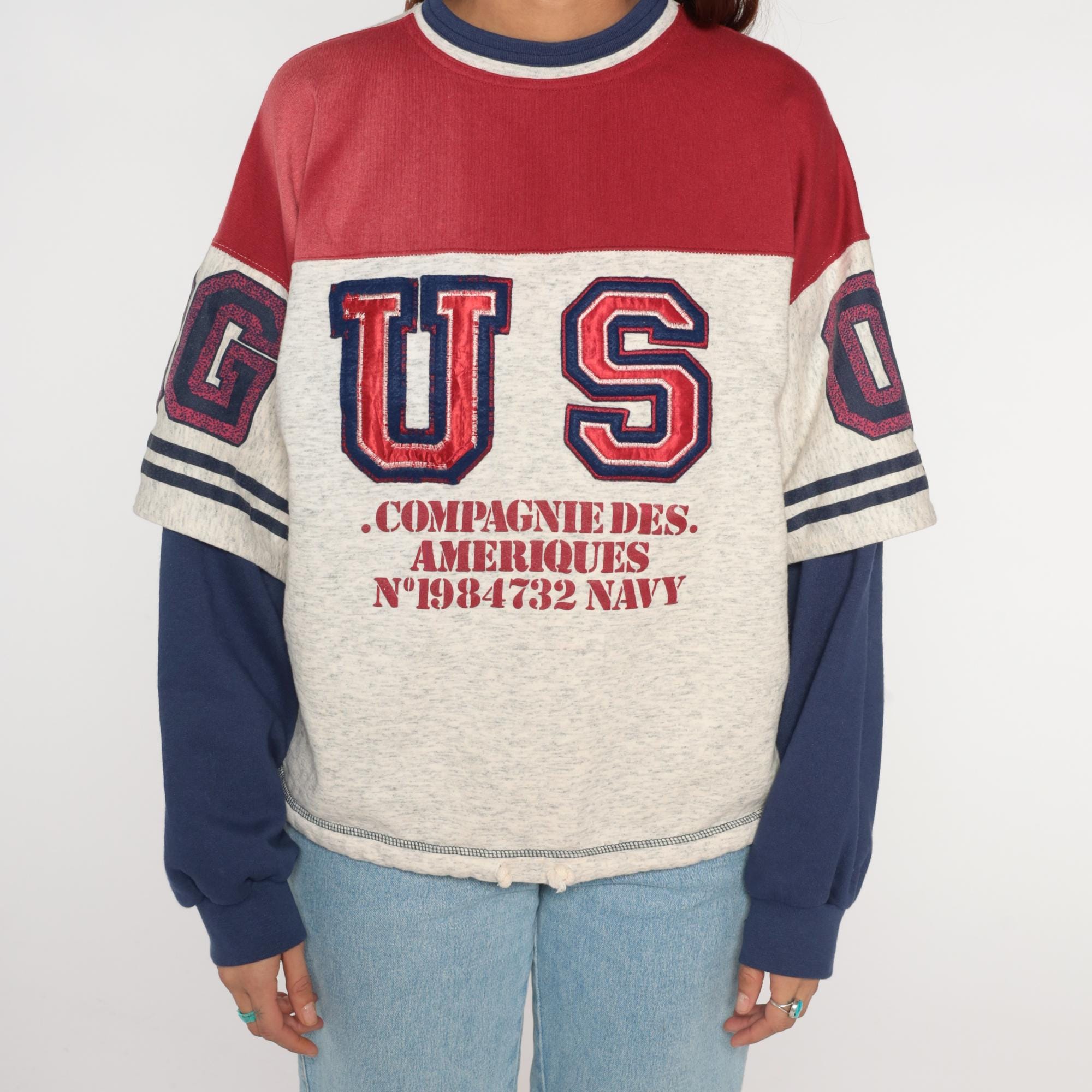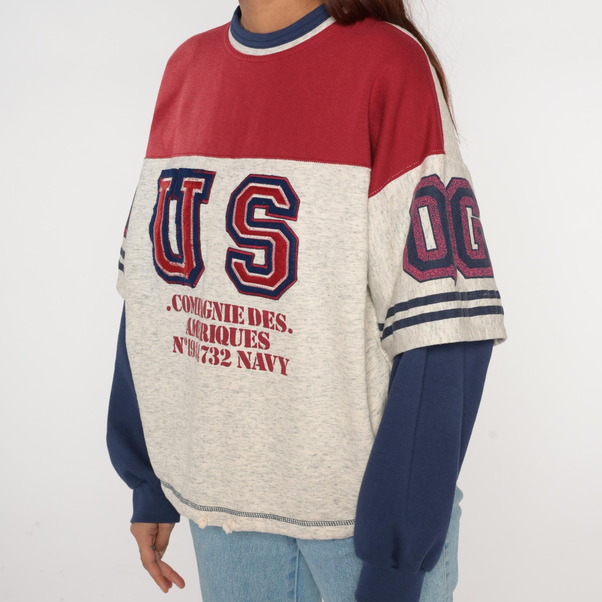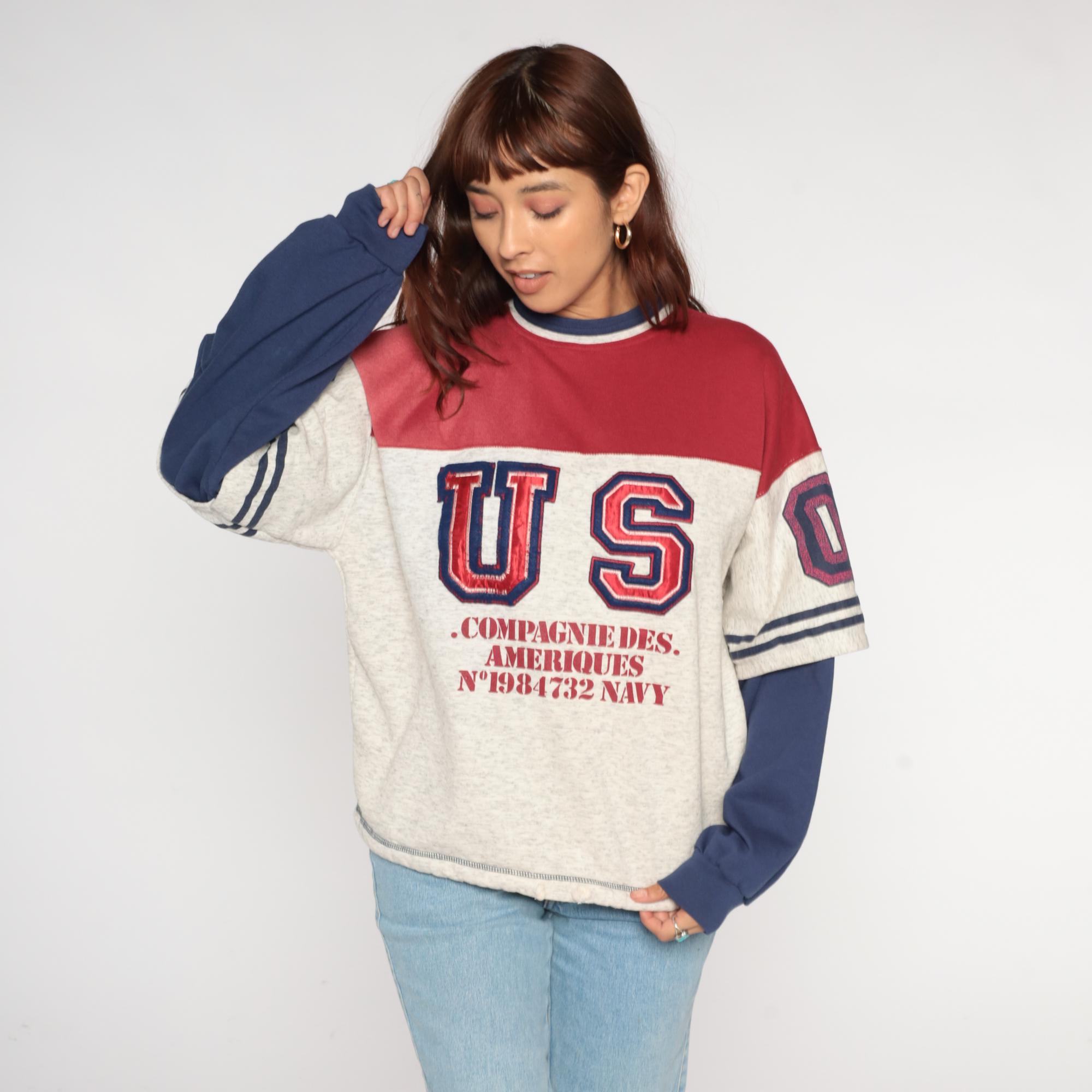 90s Compagnie Des Ameriques color block sweatshirt featuring bold "US" applique lettering in red and navy with white outline. Features classic sports jersey styling with red yoke, off-white body, and navy blue sleeves. Ribbed collar with contrast blue trim.
