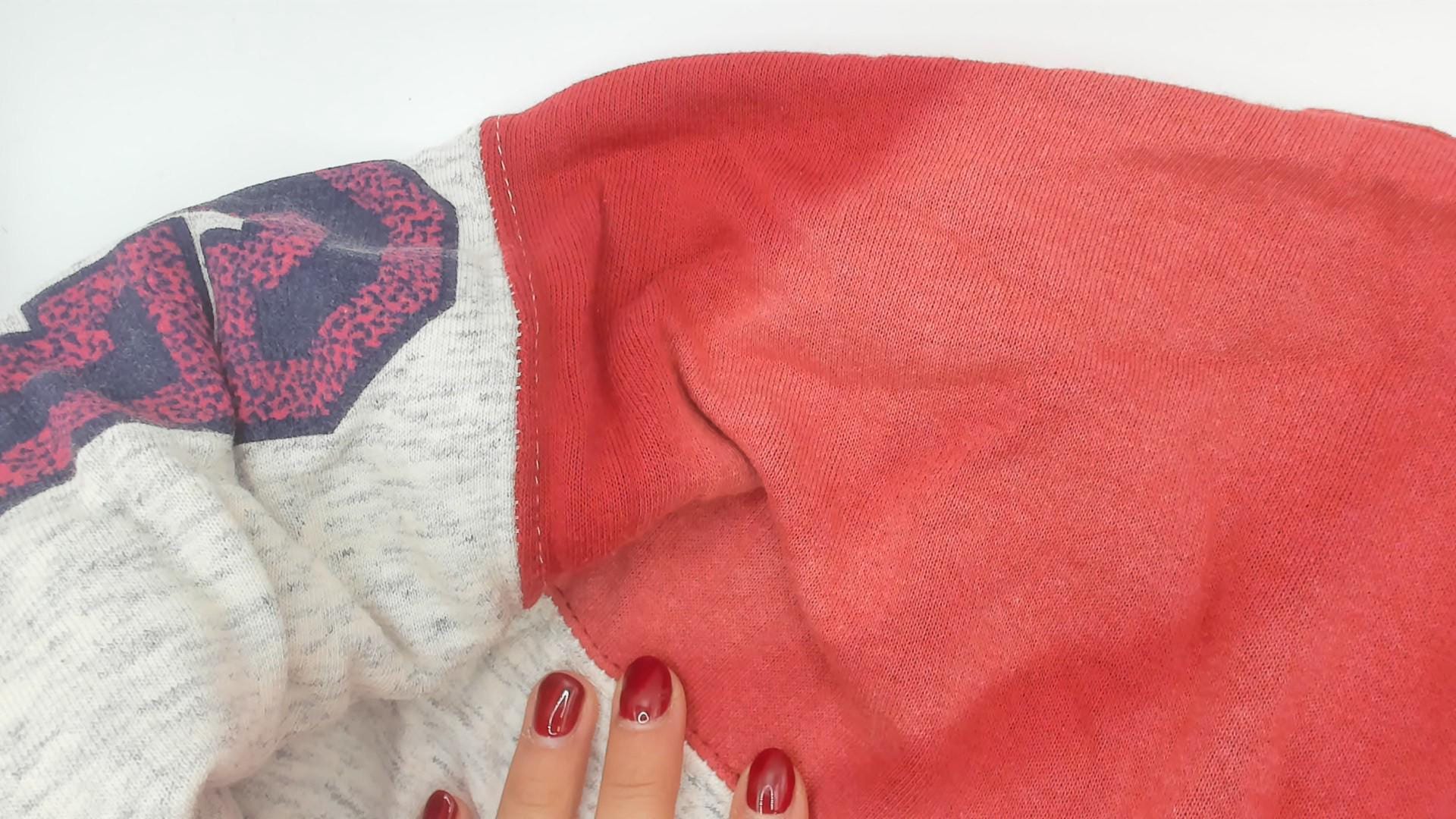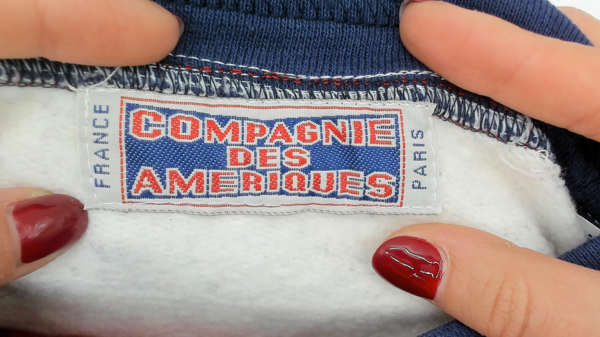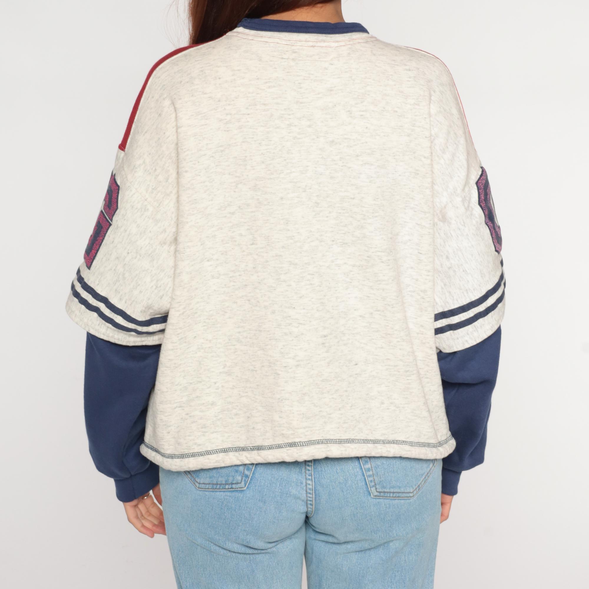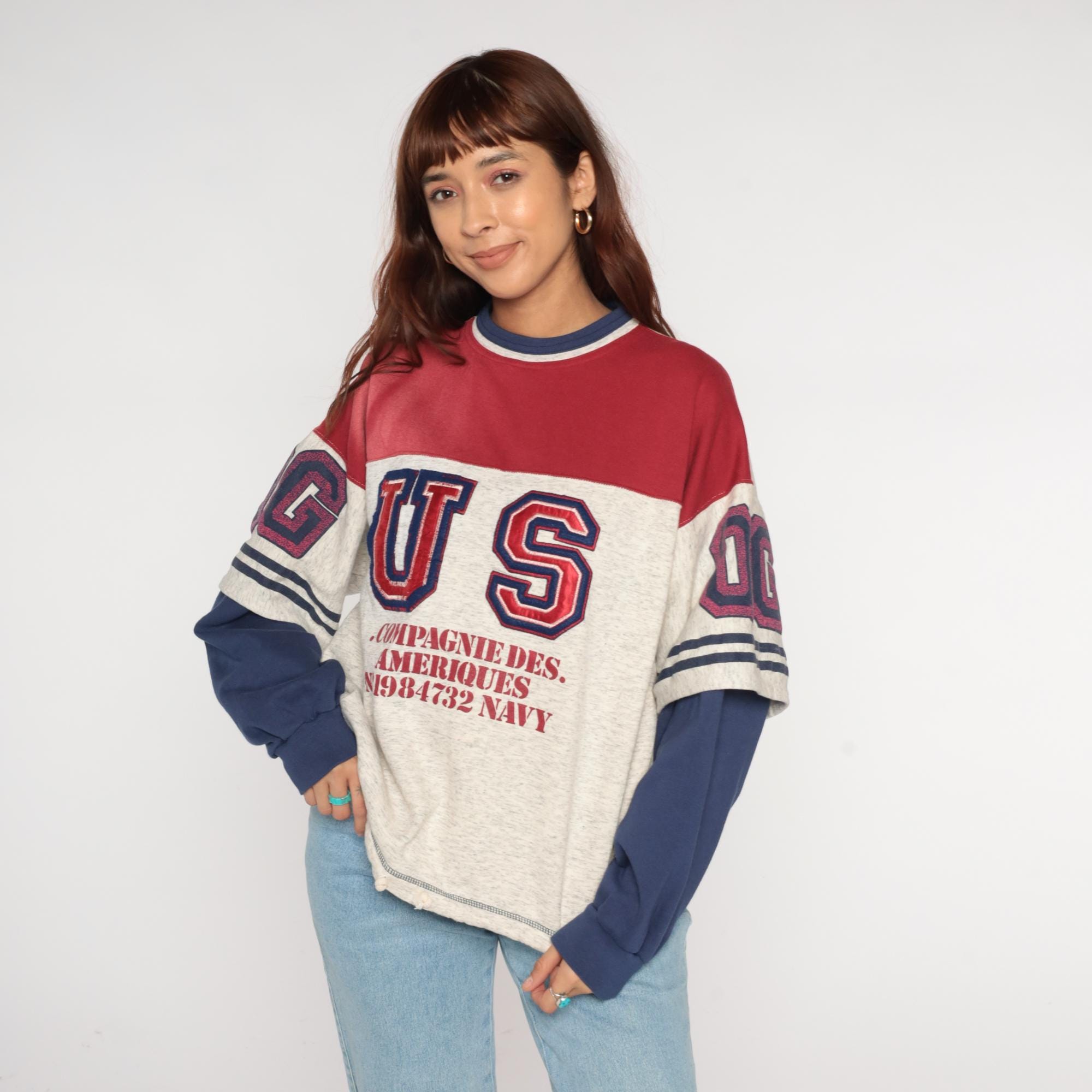 90s Compagnie Des Ameriques color block sweatshirt featuring bold "US" applique lettering in red and navy with white outline. Features classic sports jersey styling with red yoke, off-white body, and navy blue sleeves. Ribbed collar with contrast blue trim.