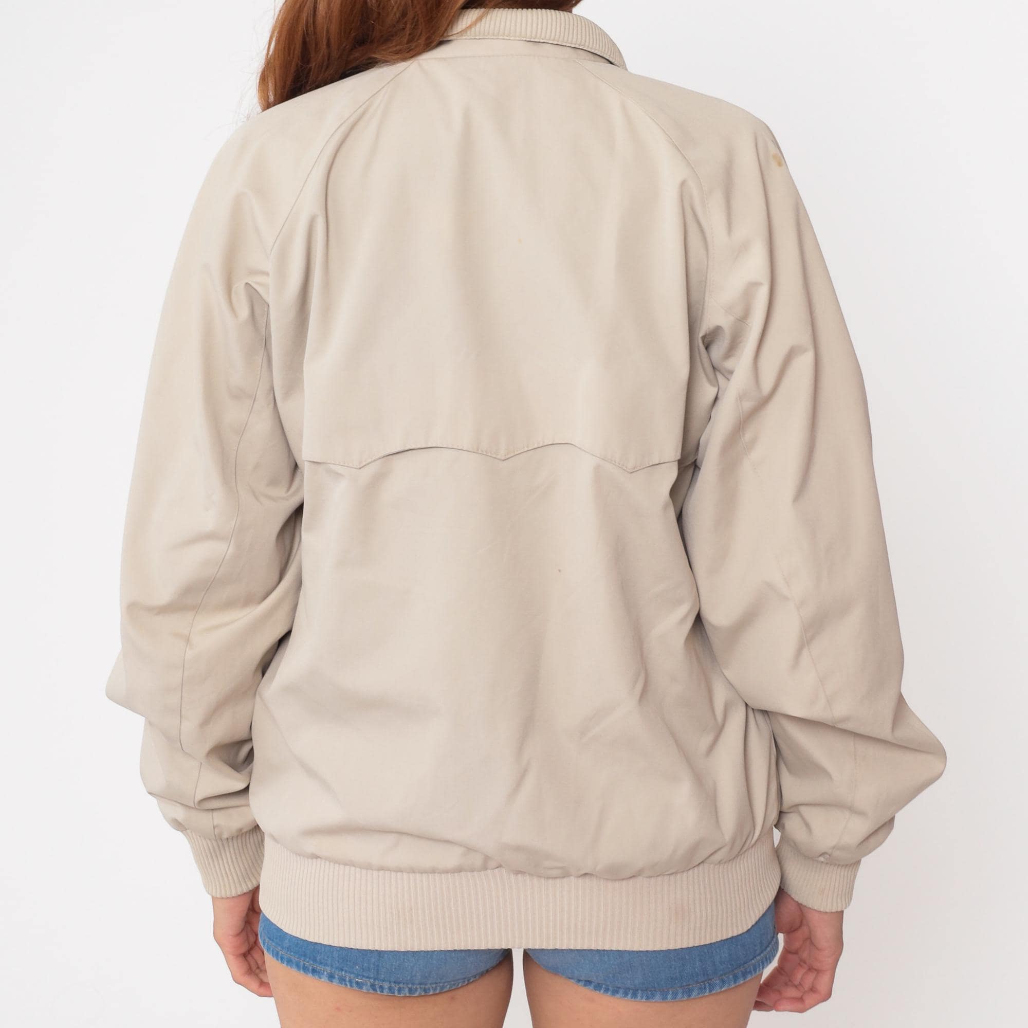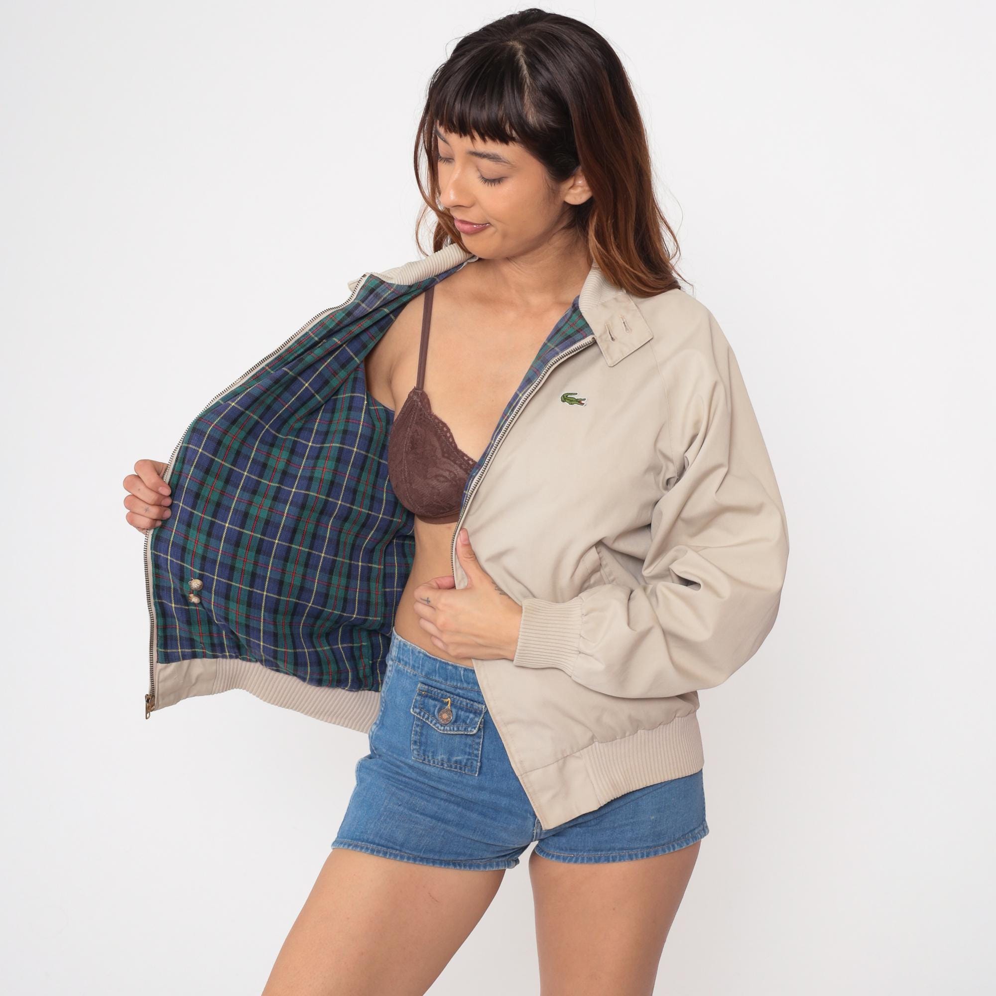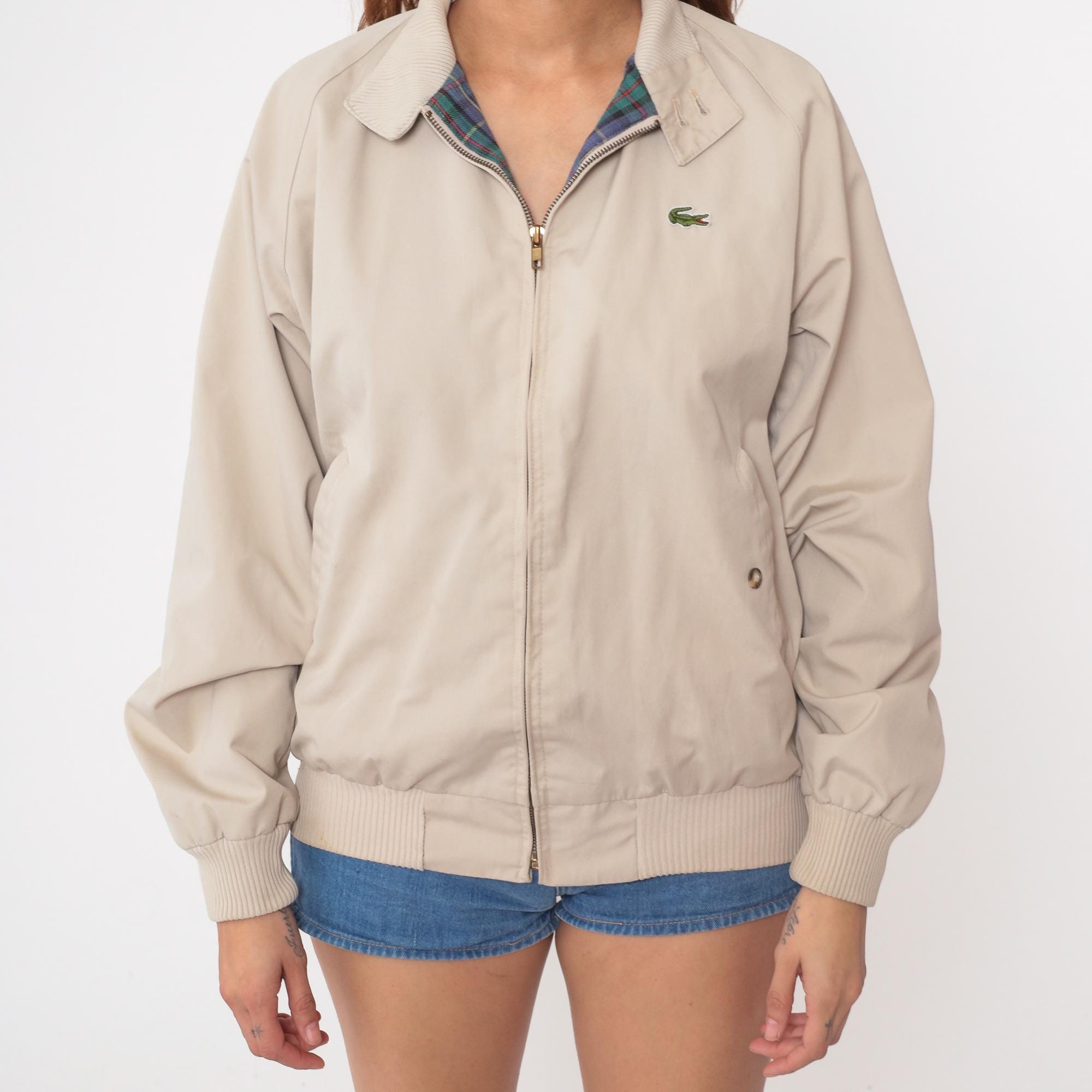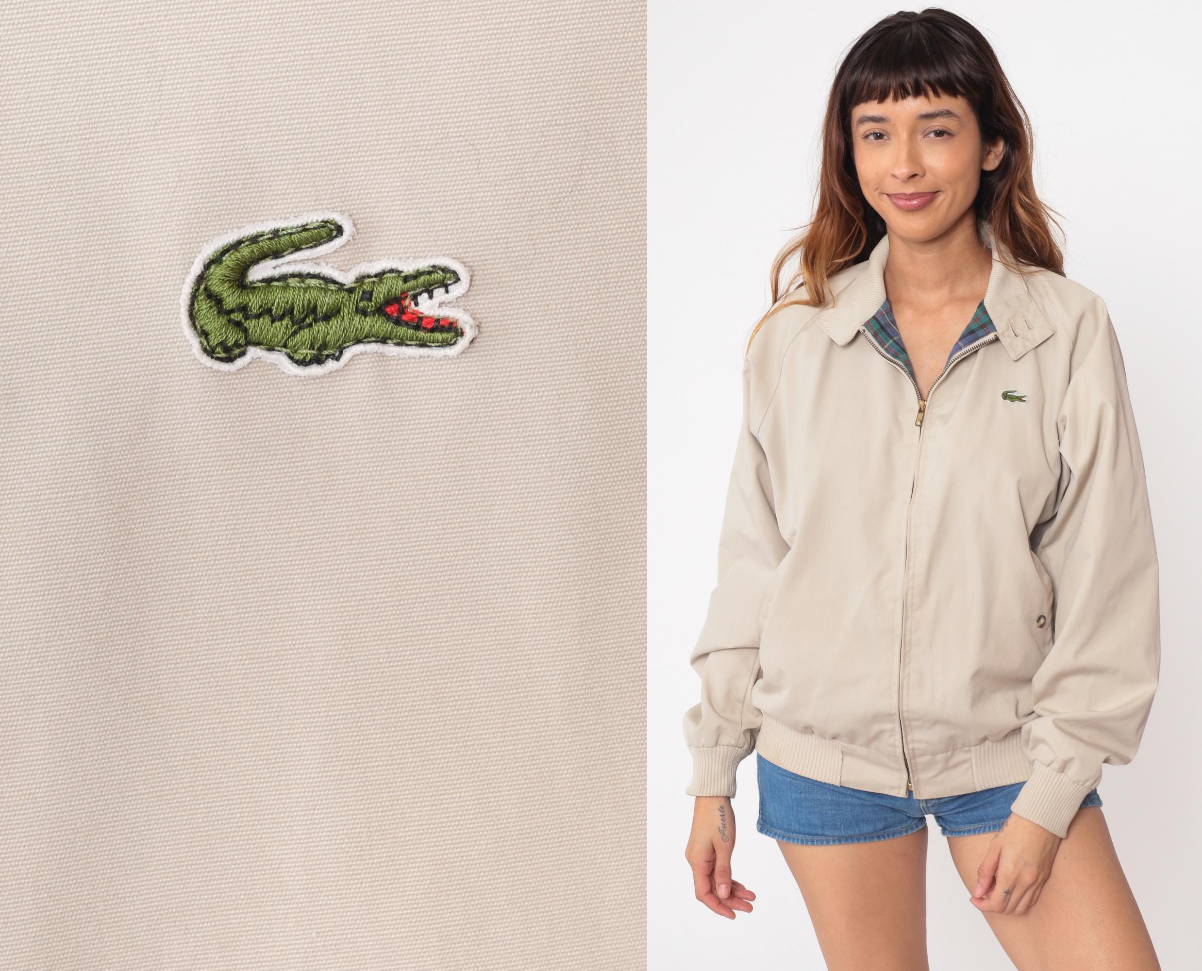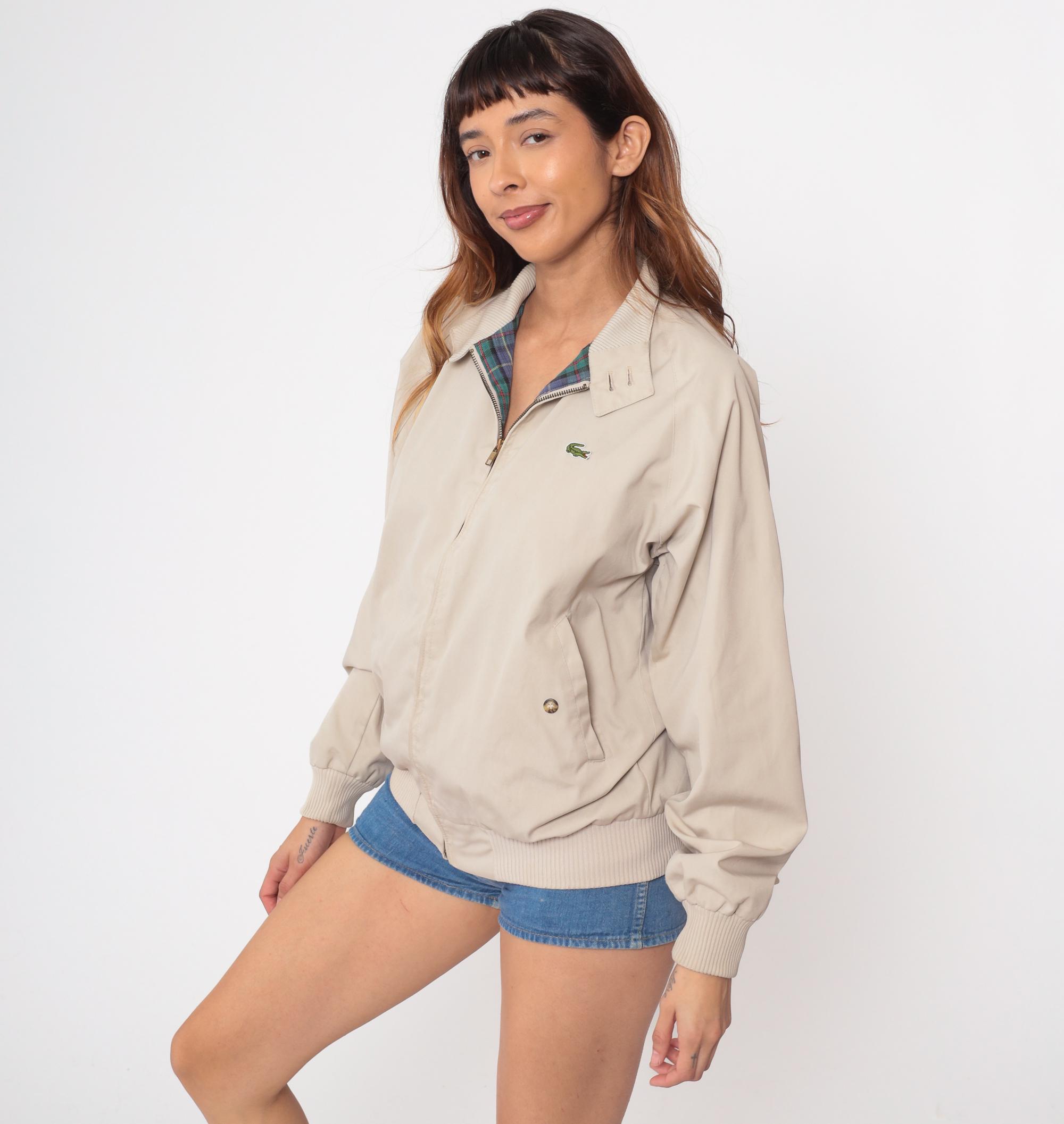 Vintage 80s bomber jacket by Lacoste in cream with a green crocodile on the chest. Zips up the front.