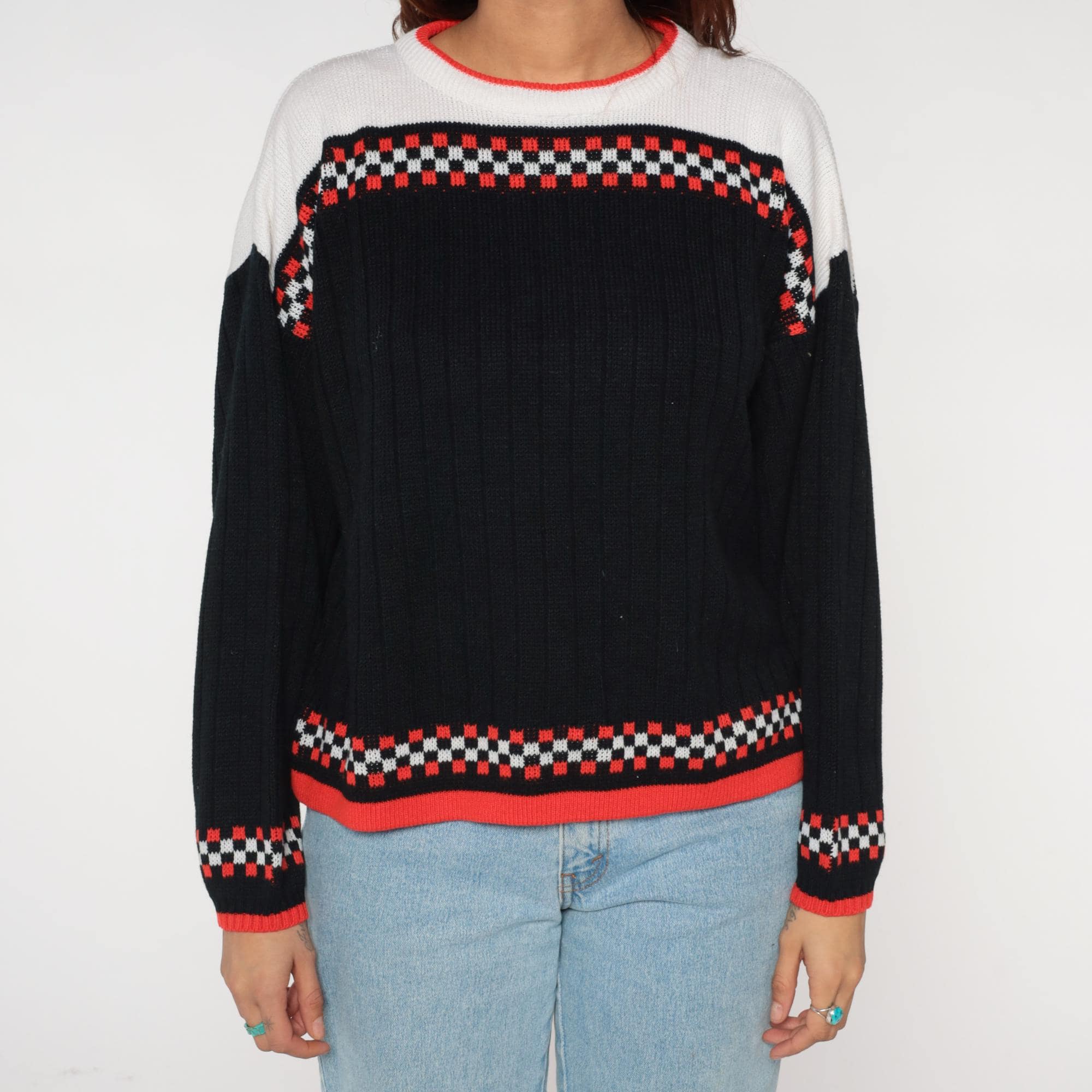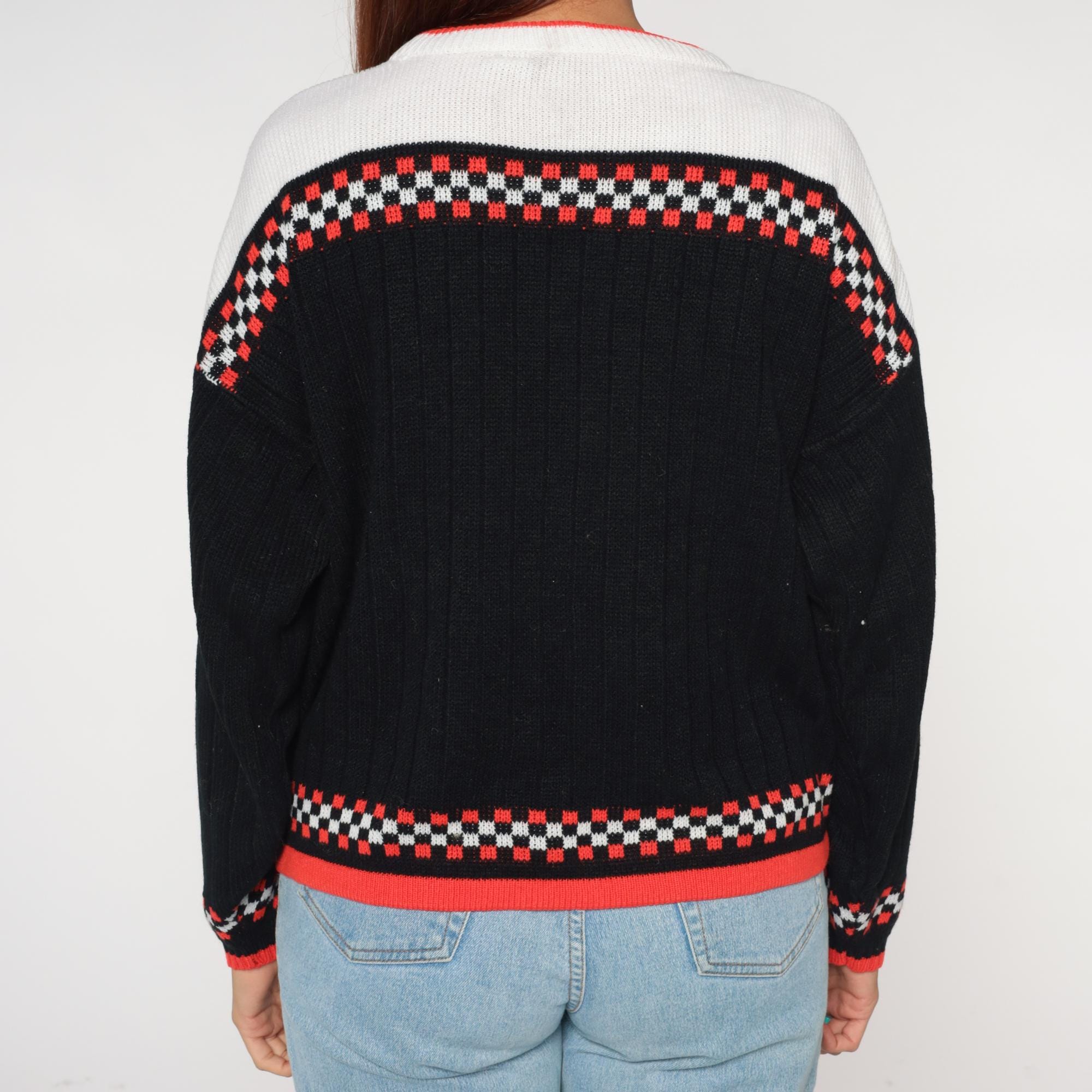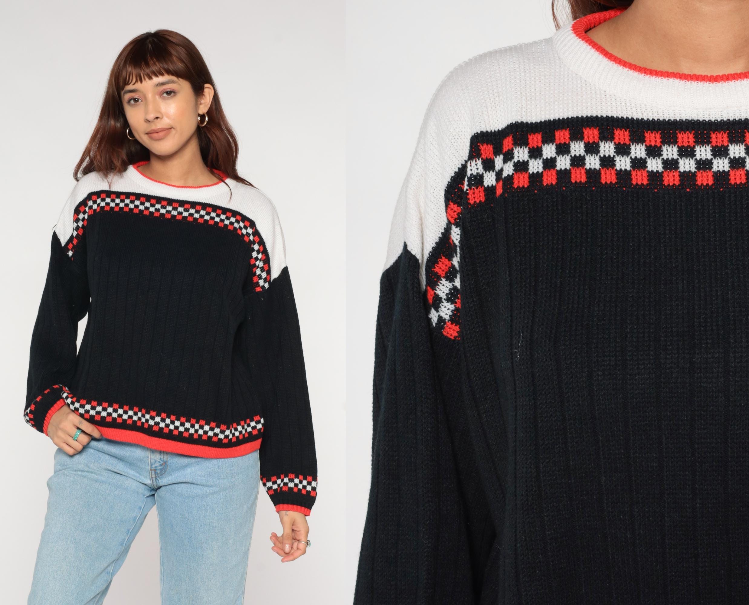 80s racing flag sweater featuring classic checkered pattern in black, white, and vibrant racing red. Authentic motorsport-inspired design with bold checkerboard bands across chest and cuffs. Distinctive white yoke with red contrast crew neckline for that authentic pit crew look.