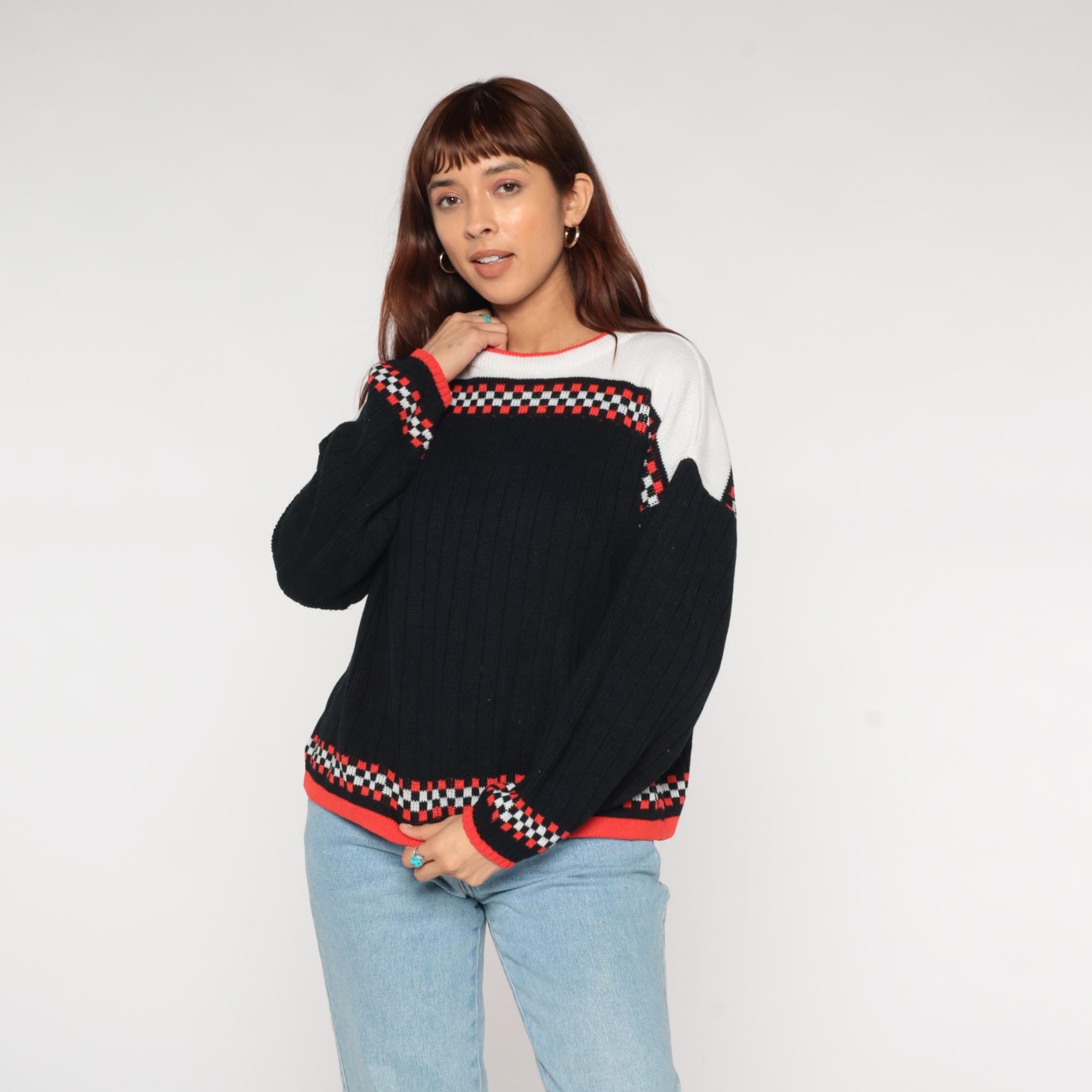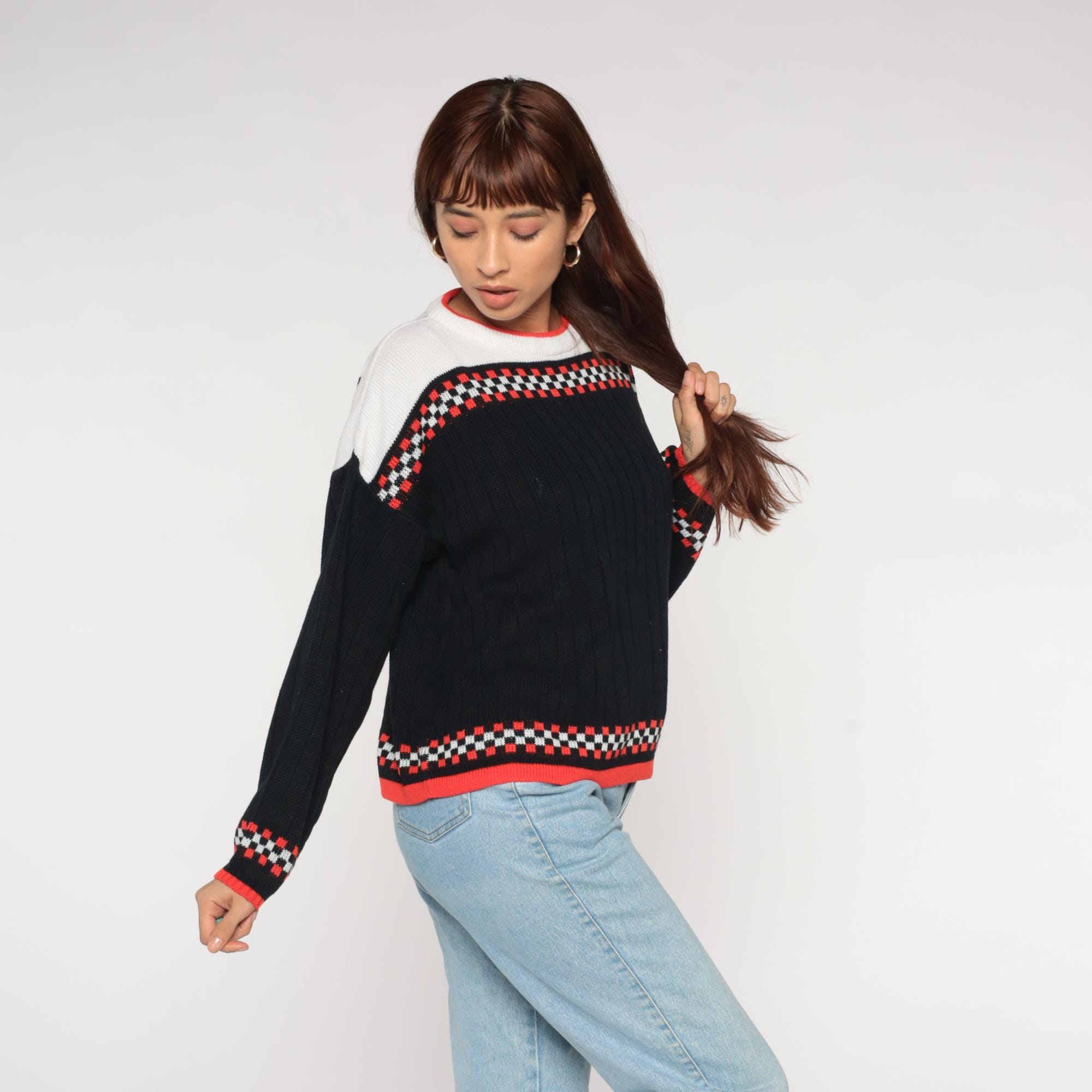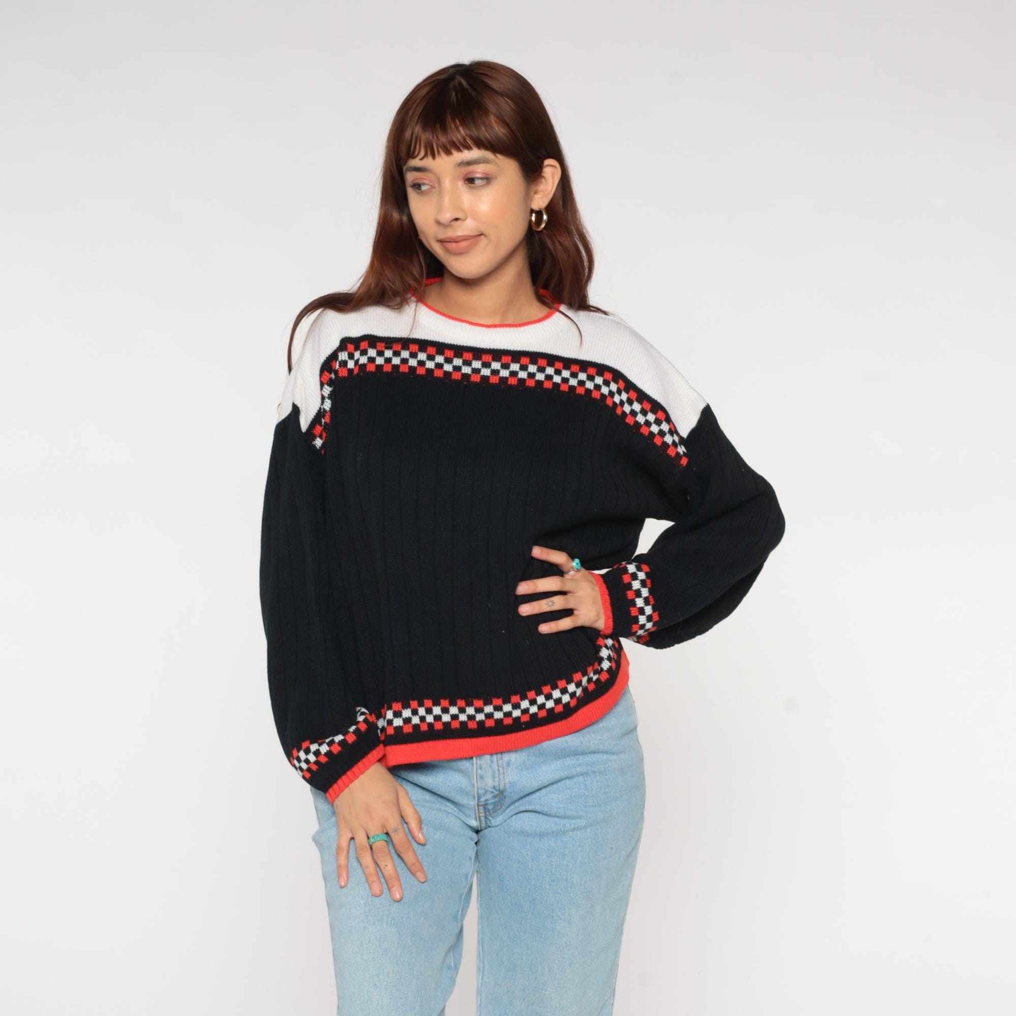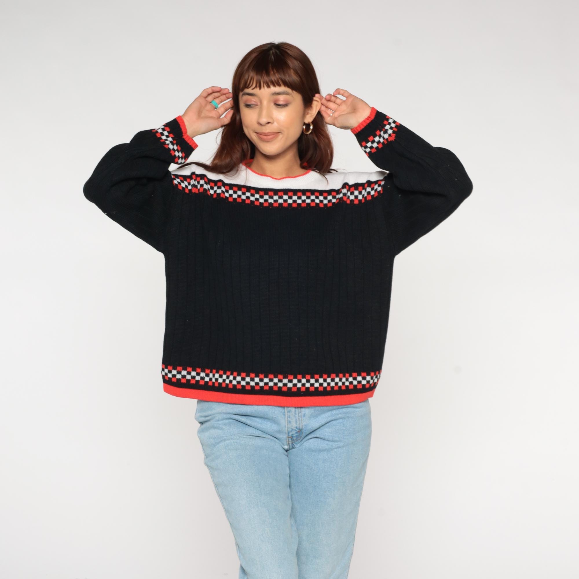 80s racing flag sweater featuring classic checkered pattern in black, white, and vibrant racing red. Authentic motorsport-inspired design with bold checkerboard bands across chest and cuffs. Distinctive white yoke with red contrast crew neckline for that authentic pit crew look.