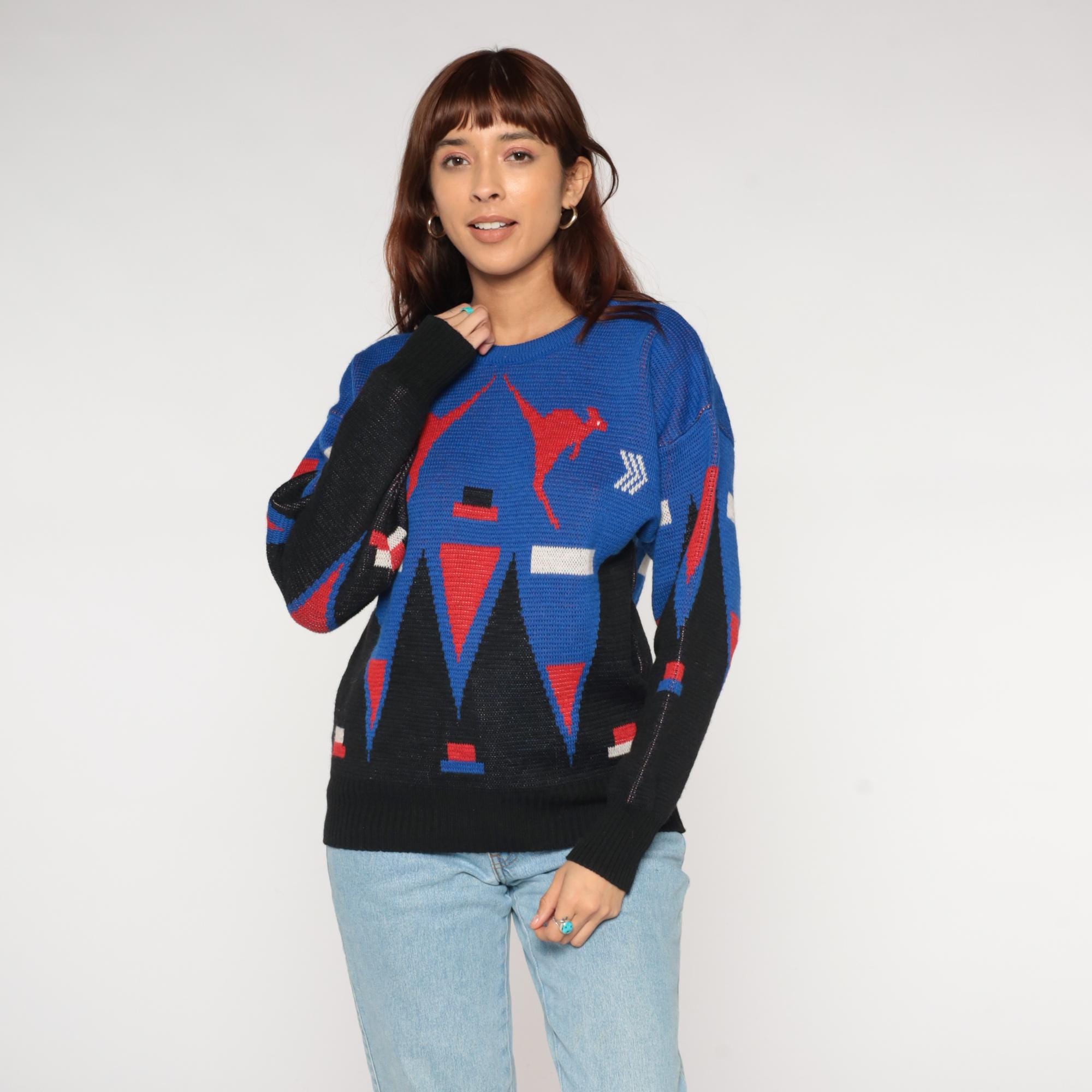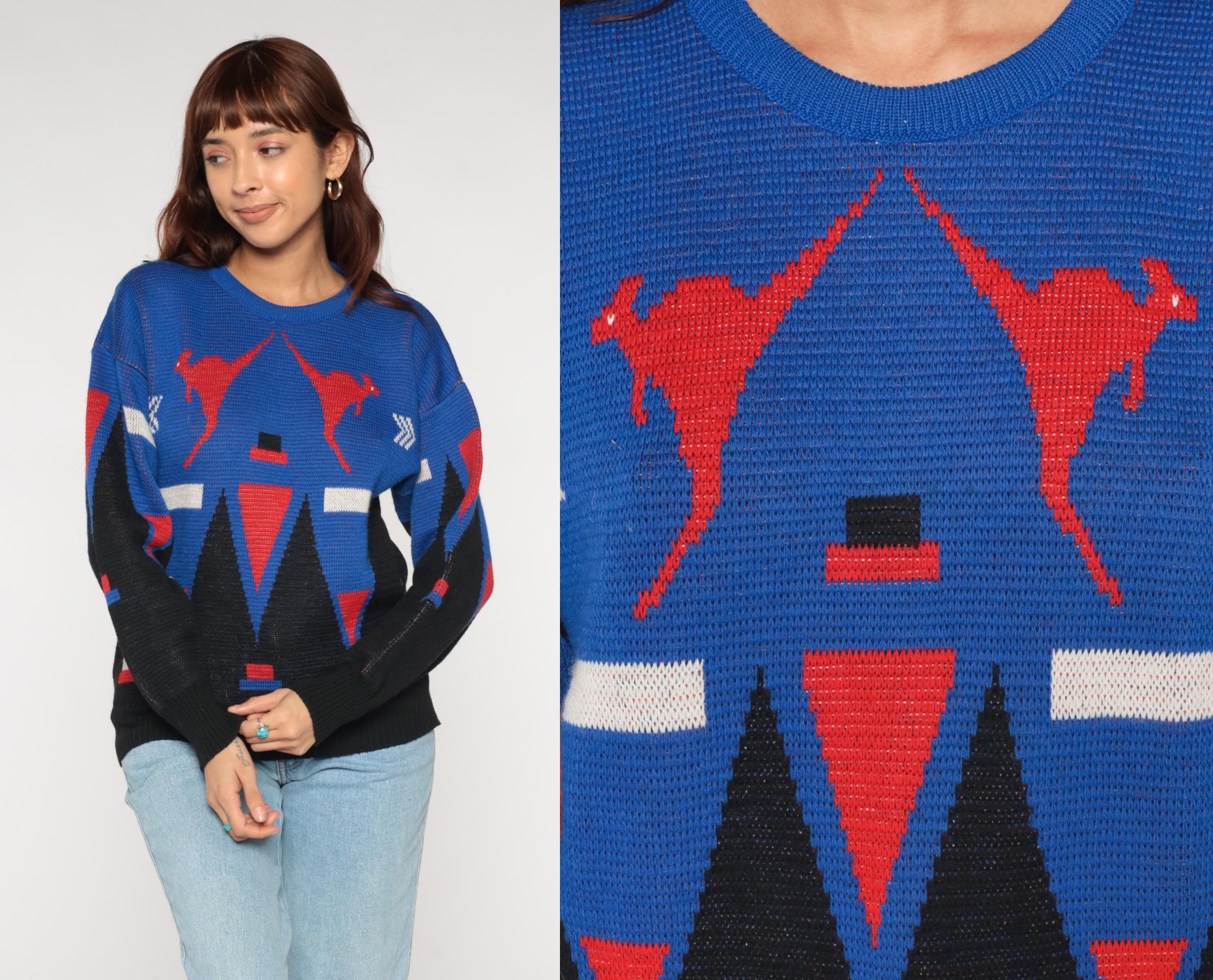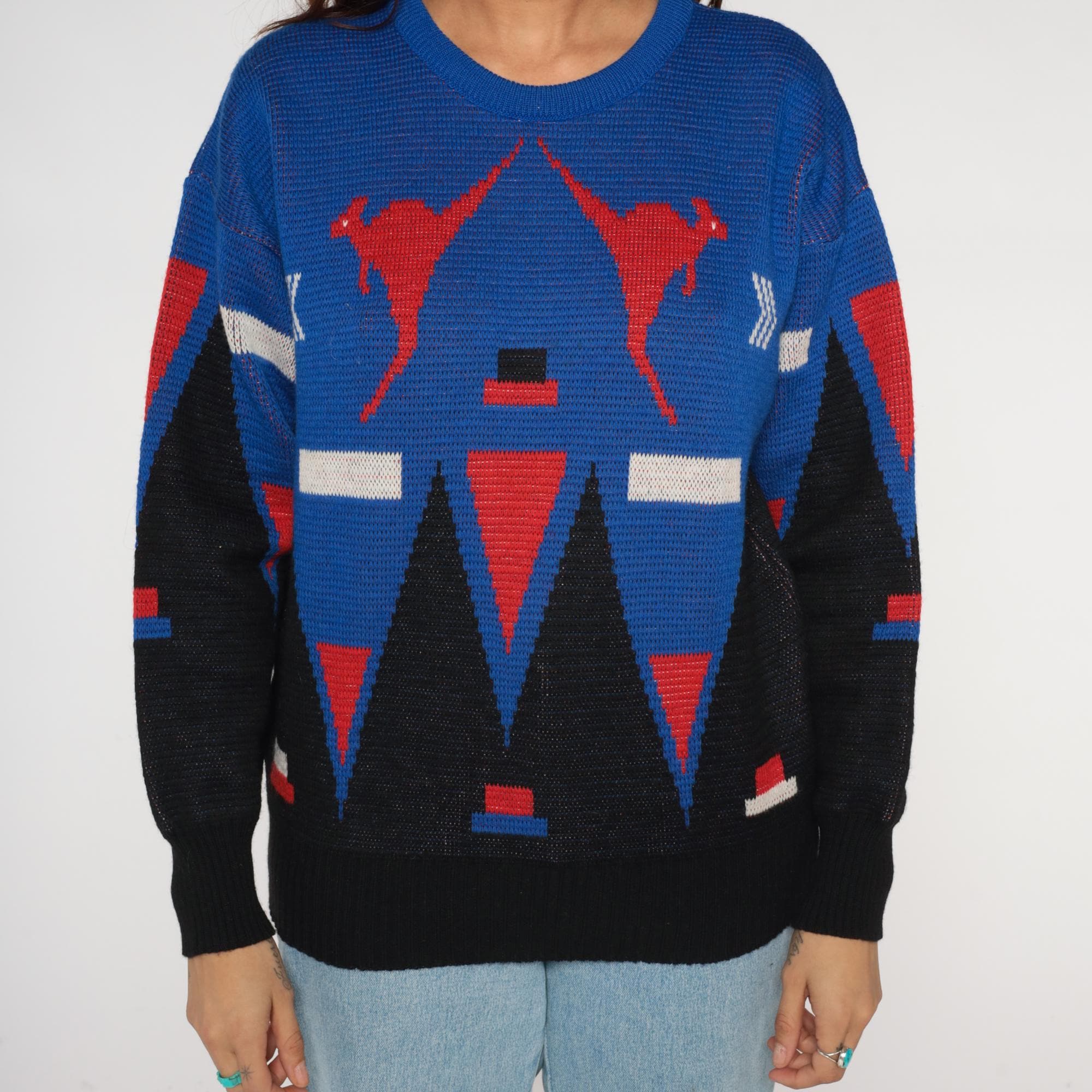 80s Australian Hysport pure new wool sweater featuring striking red kangaroo graphics against vibrant royal blue. Bold geometric pattern with red, black, and white color blocking in traditional Australiana style.