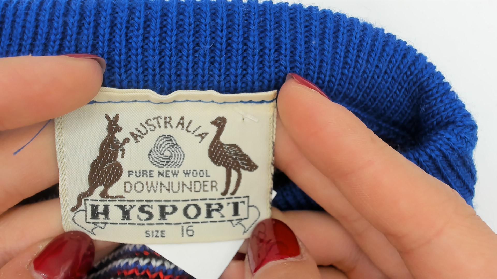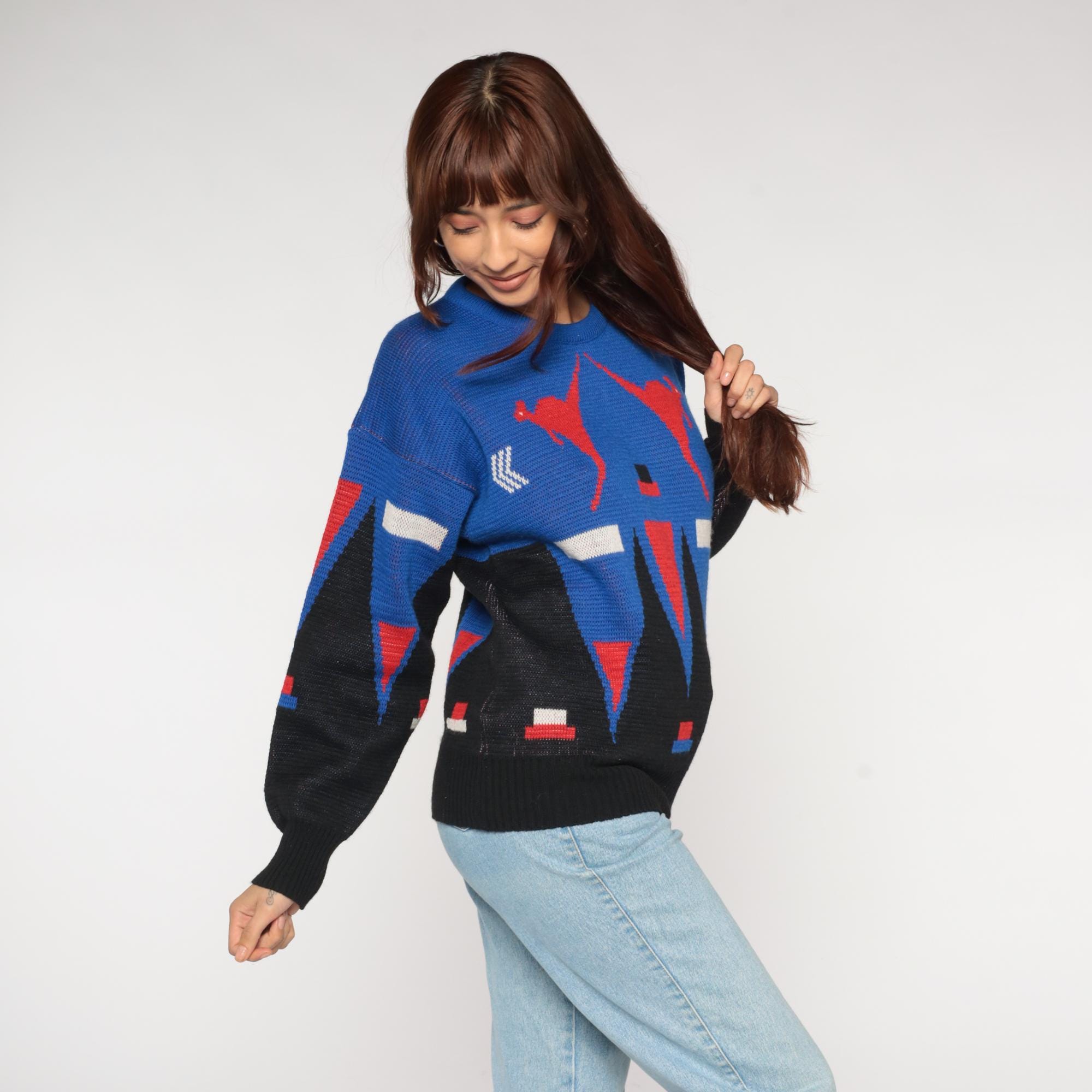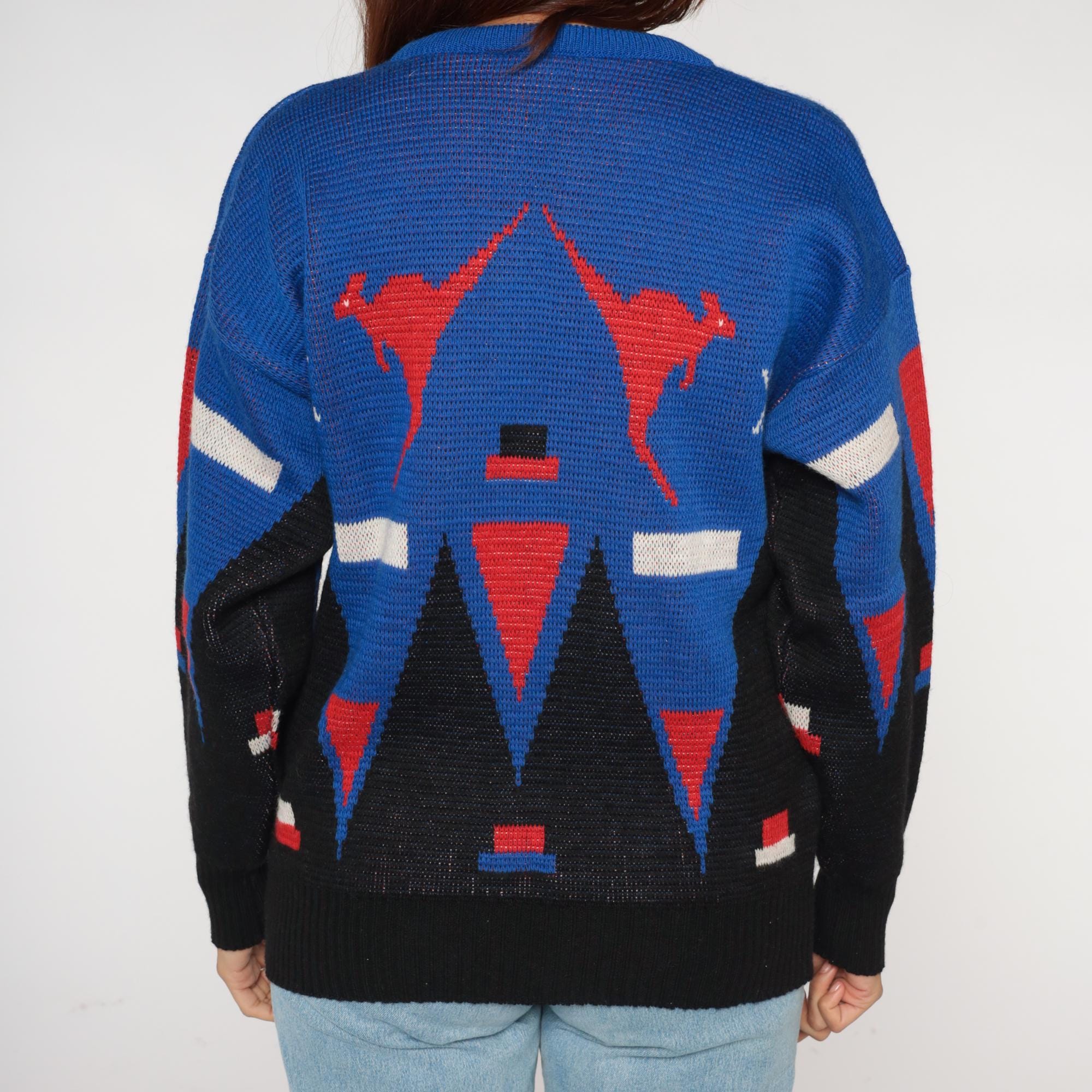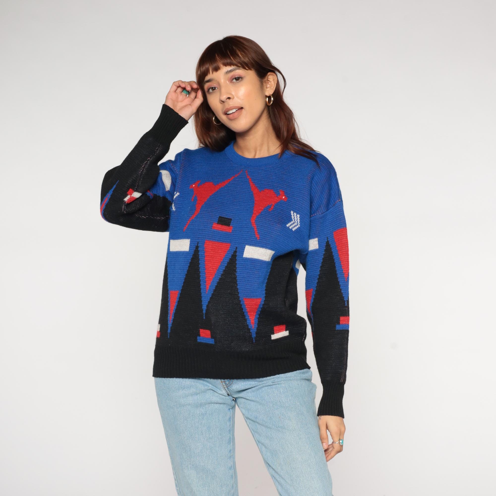 80s Australian Hysport pure new wool sweater featuring striking red kangaroo graphics against vibrant royal blue. Bold geometric pattern with red, black, and white color blocking in traditional Australiana style.