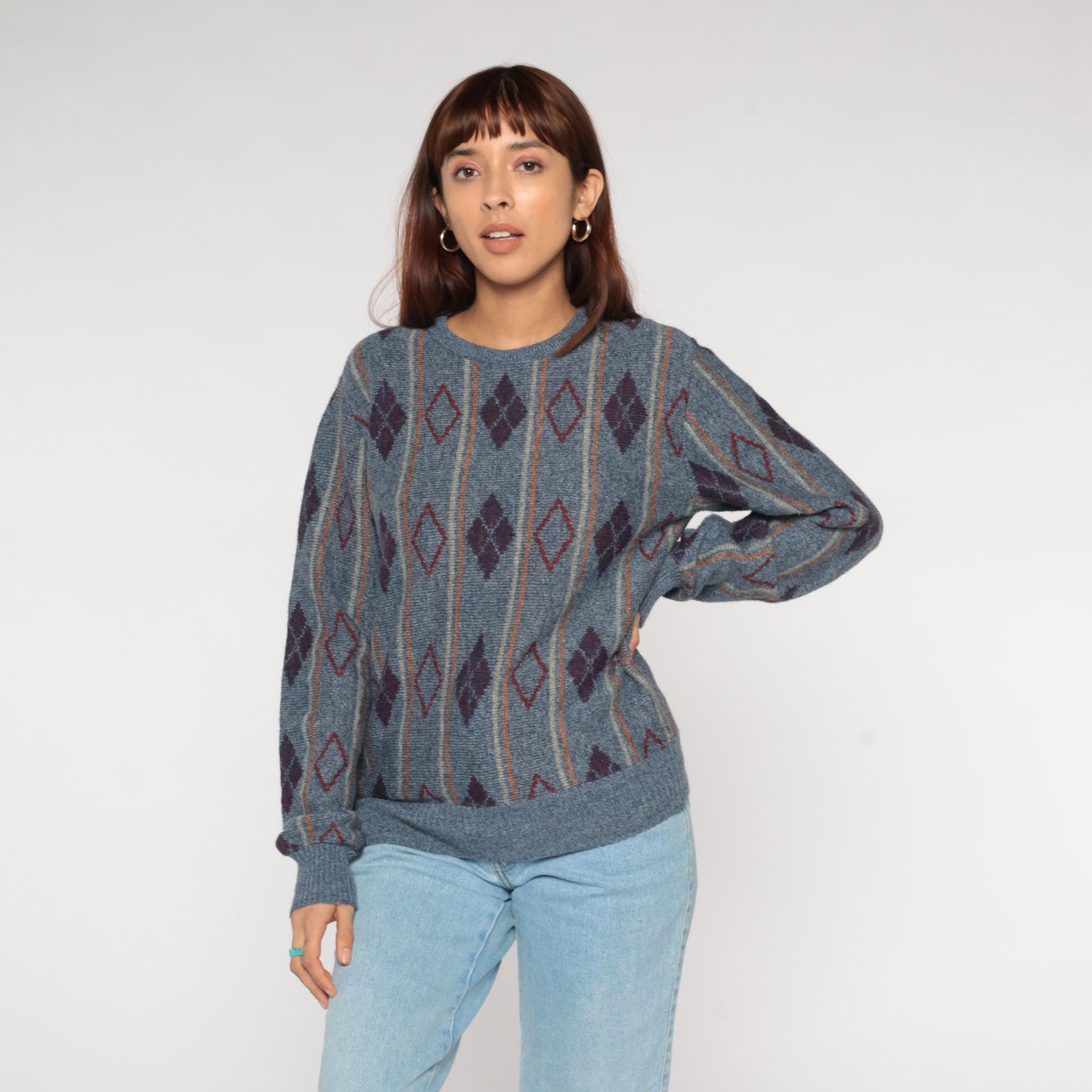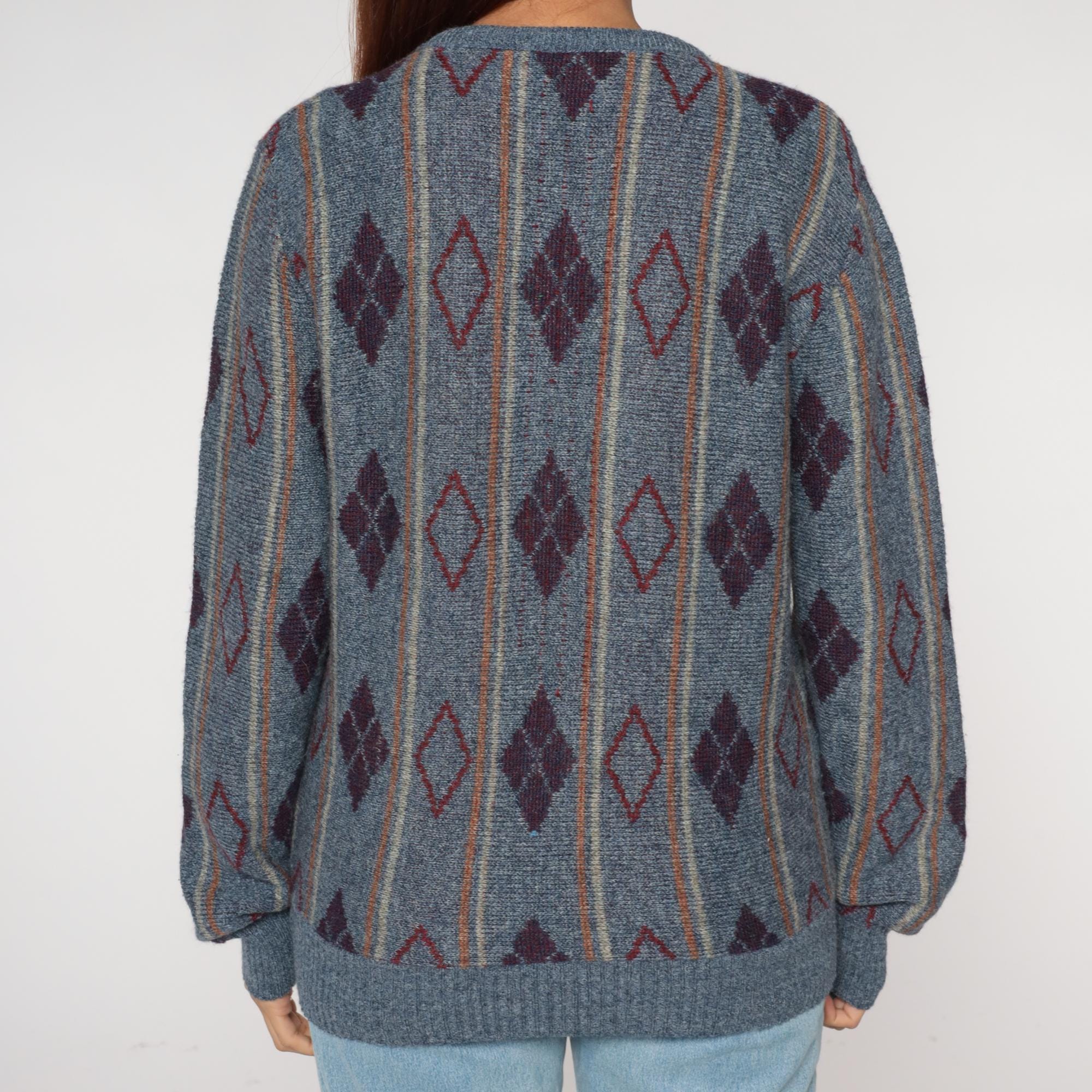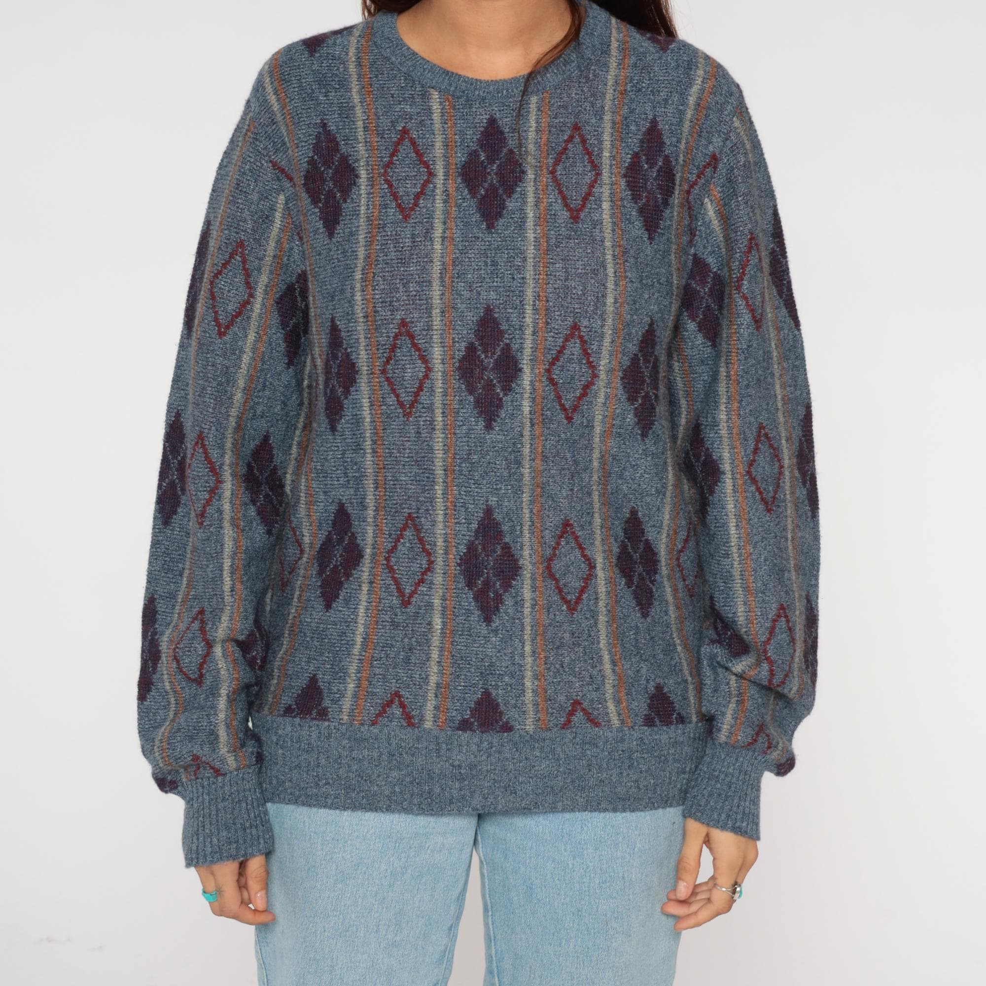 80s argyle sweater featuring sophisticated diamond pattern in slate blue, deep burgundy, and clay accents. Classic geometric diamond design arranged in traditional argyle layout with contrasting outline details. Perfect crewneck silhouette with ribbed collar, cuffs, and hem for timeless collegiate appeal.