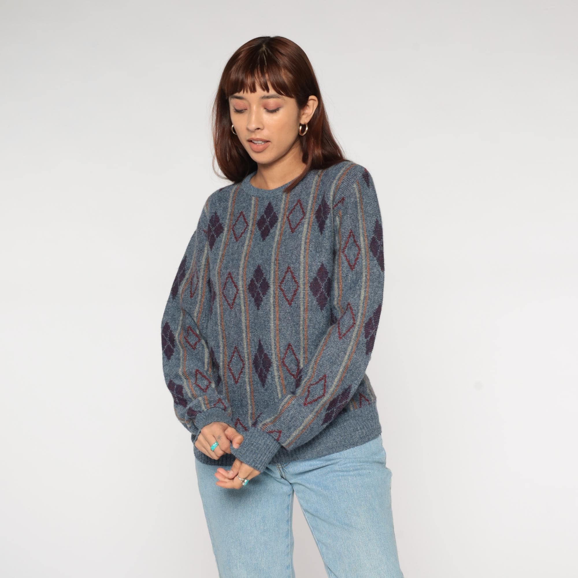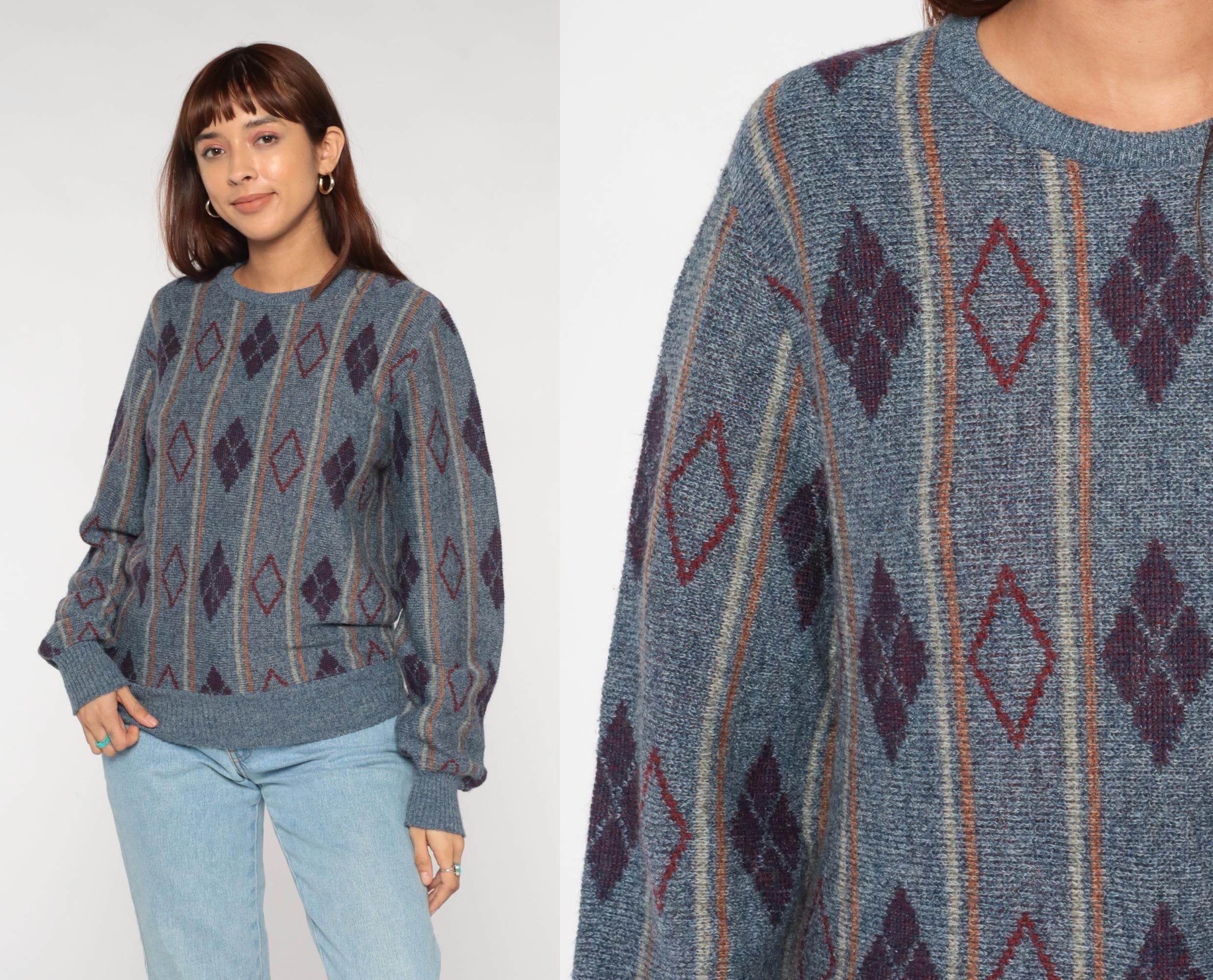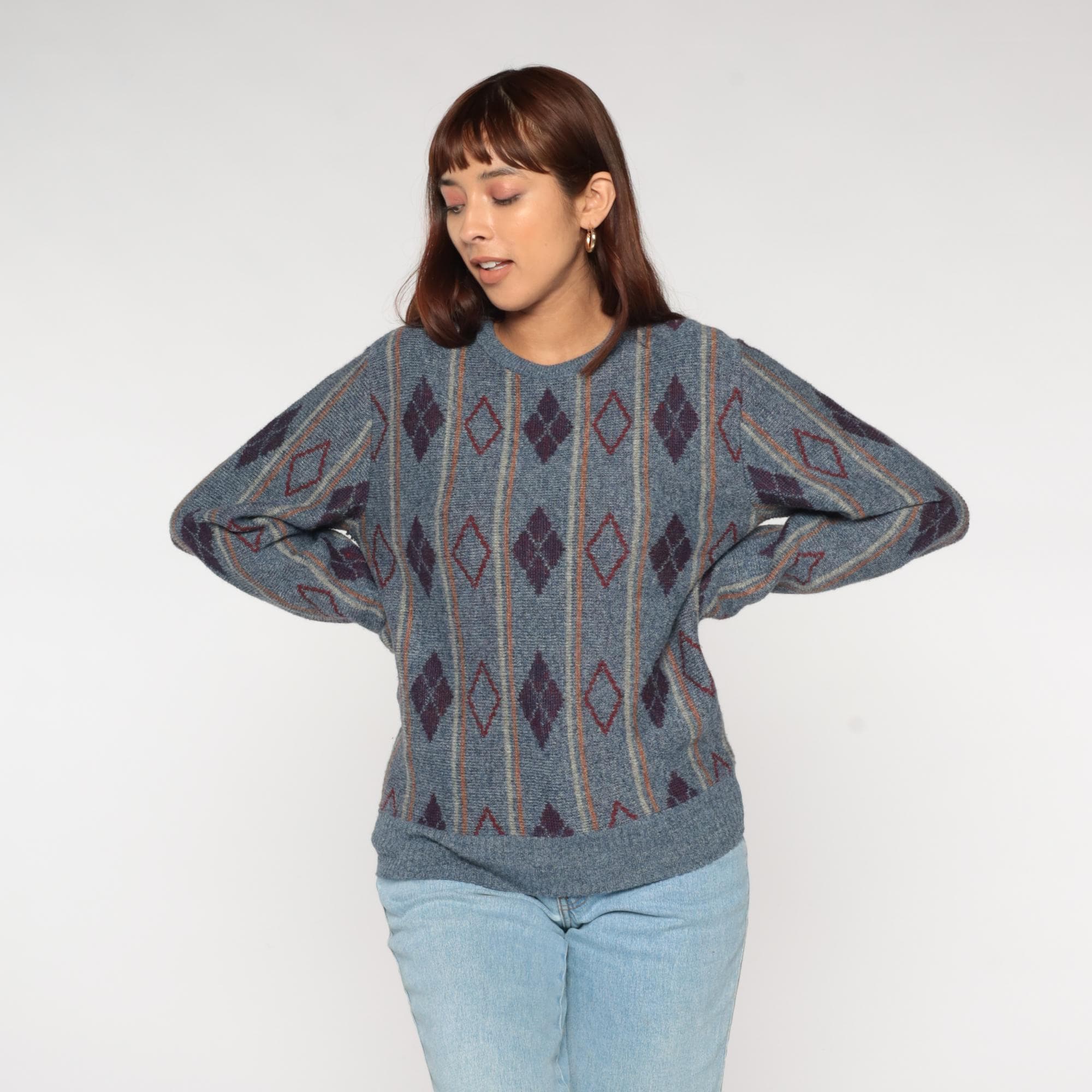 80s argyle sweater featuring sophisticated diamond pattern in slate blue, deep burgundy, and clay accents. Classic geometric diamond design arranged in traditional argyle layout with contrasting outline details. Perfect crewneck silhouette with ribbed collar, cuffs, and hem for timeless collegiate appeal.