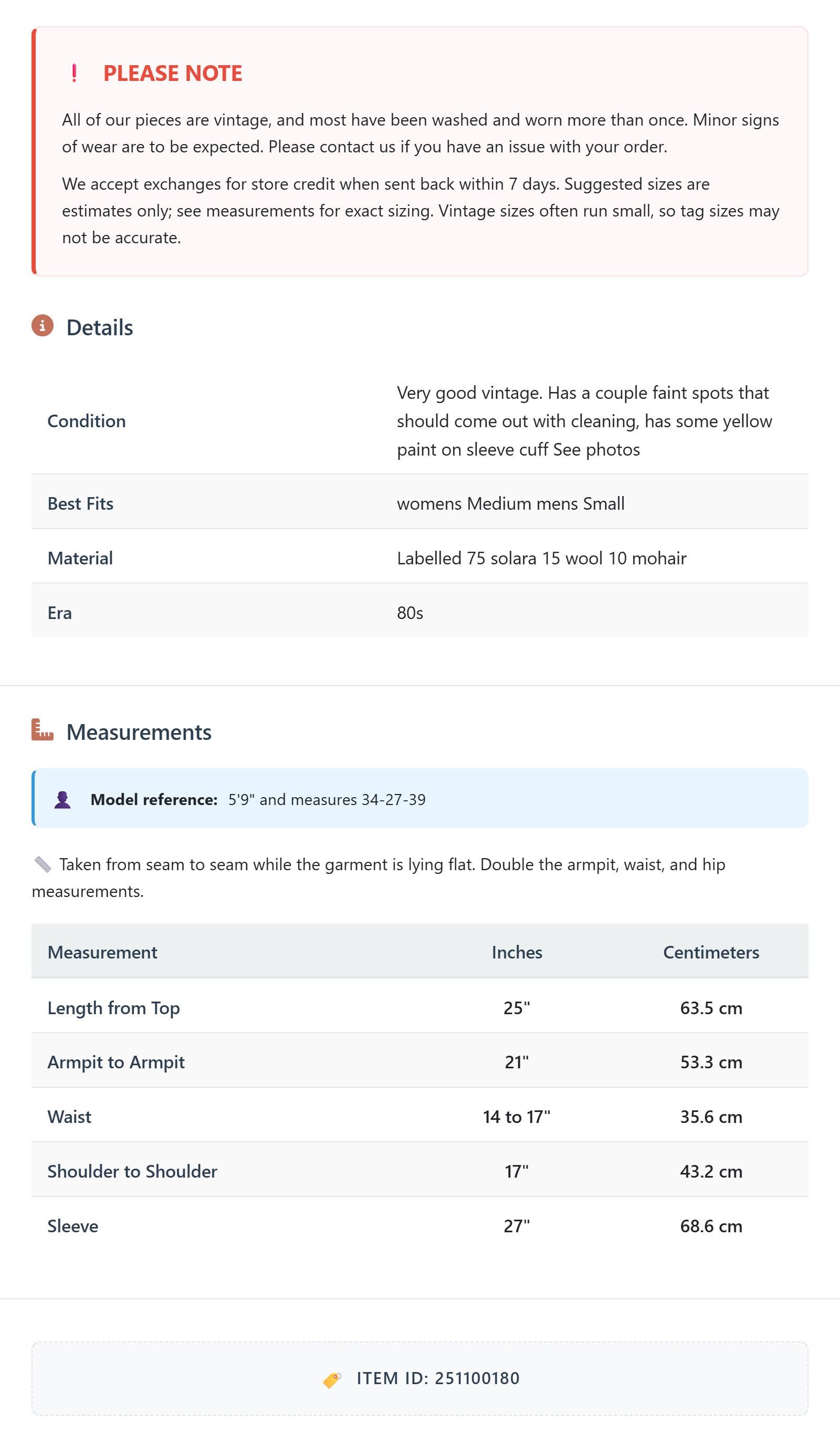 Condition: Very good vintage. Has a couple faint spots that should come out with cleaning, has some yellow paint on sleeve cuff See photos