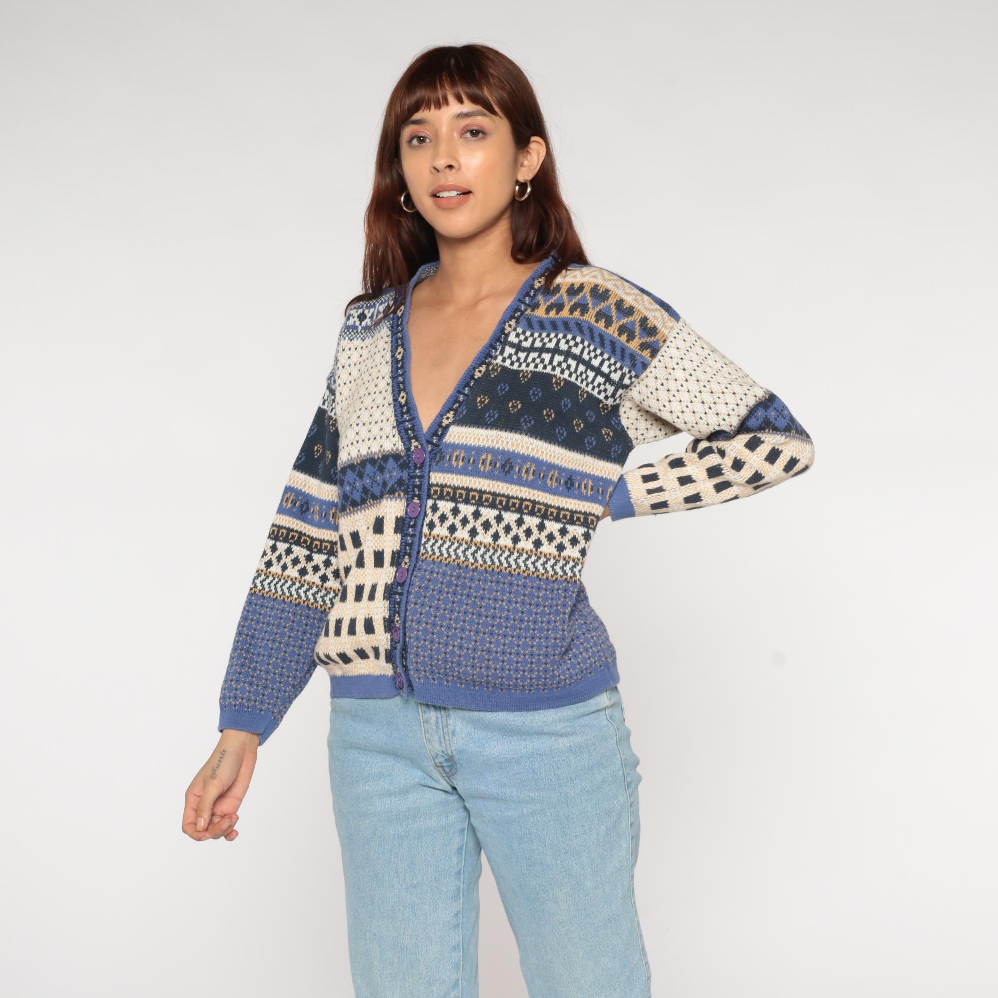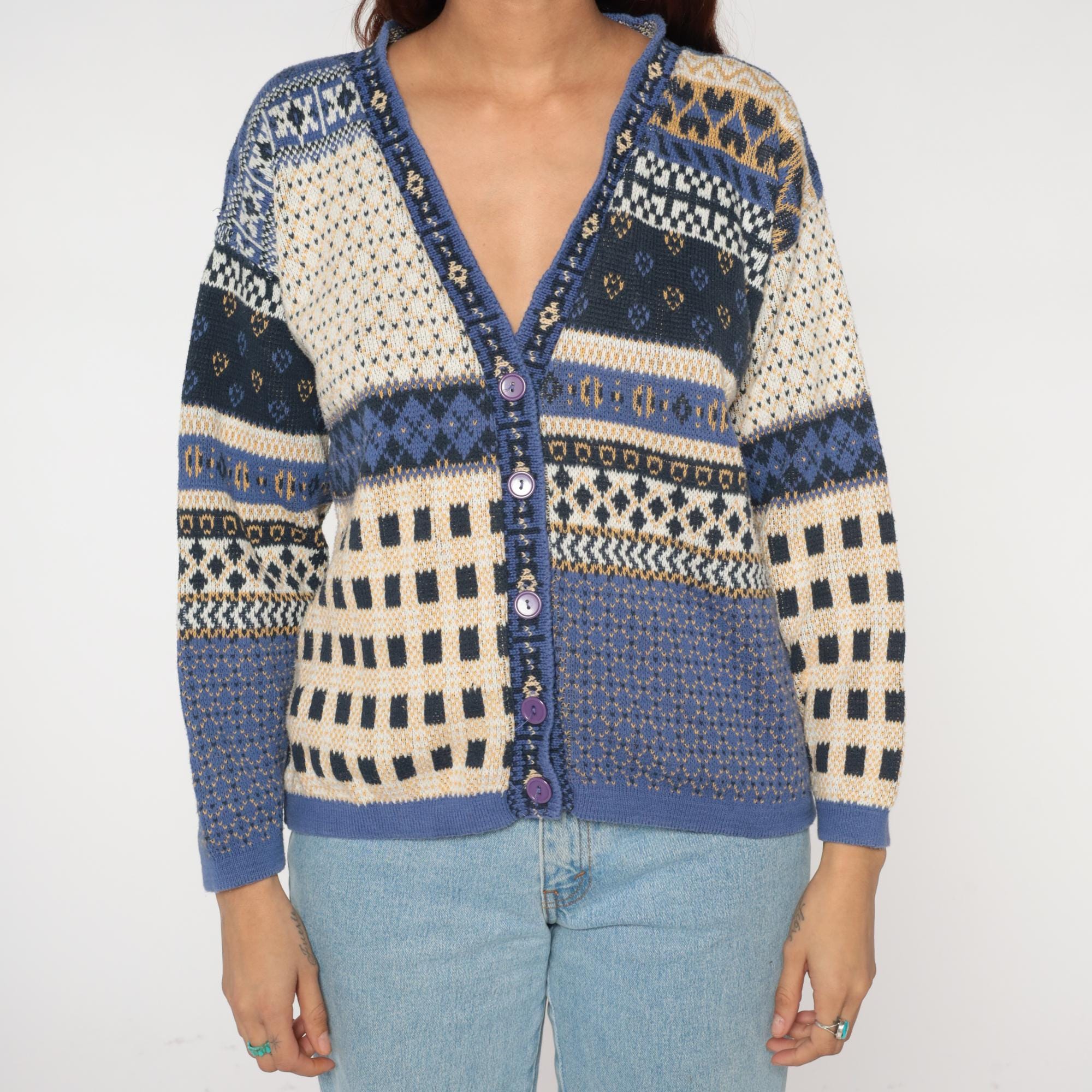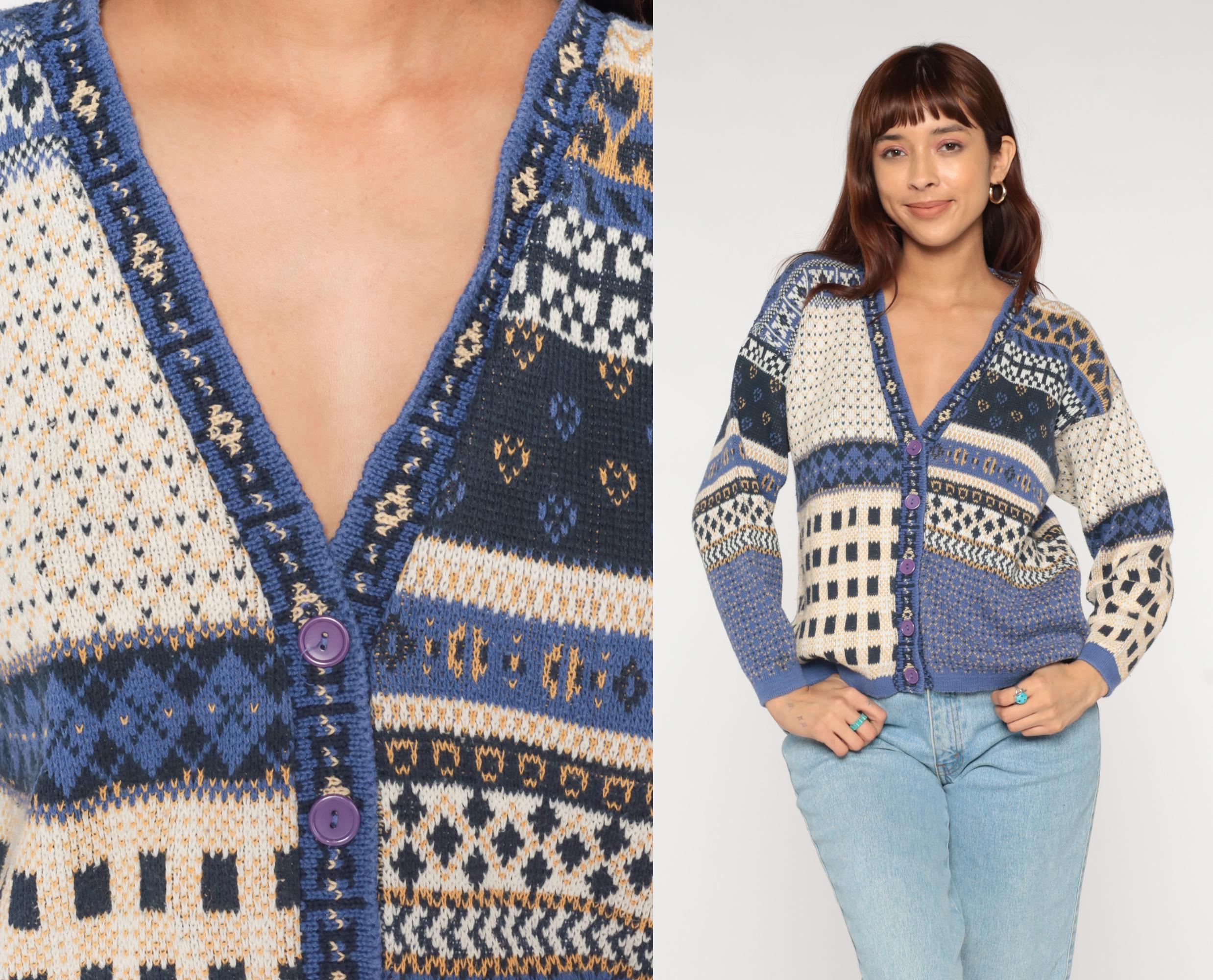90s cardigan from Cabin Creek featuring a geometric fair isle pattern in blue, cream, and navy with gold accent details. Classic V-neck with button closure and purple buttons. Long sleeves with ribbed cuffs and hem.