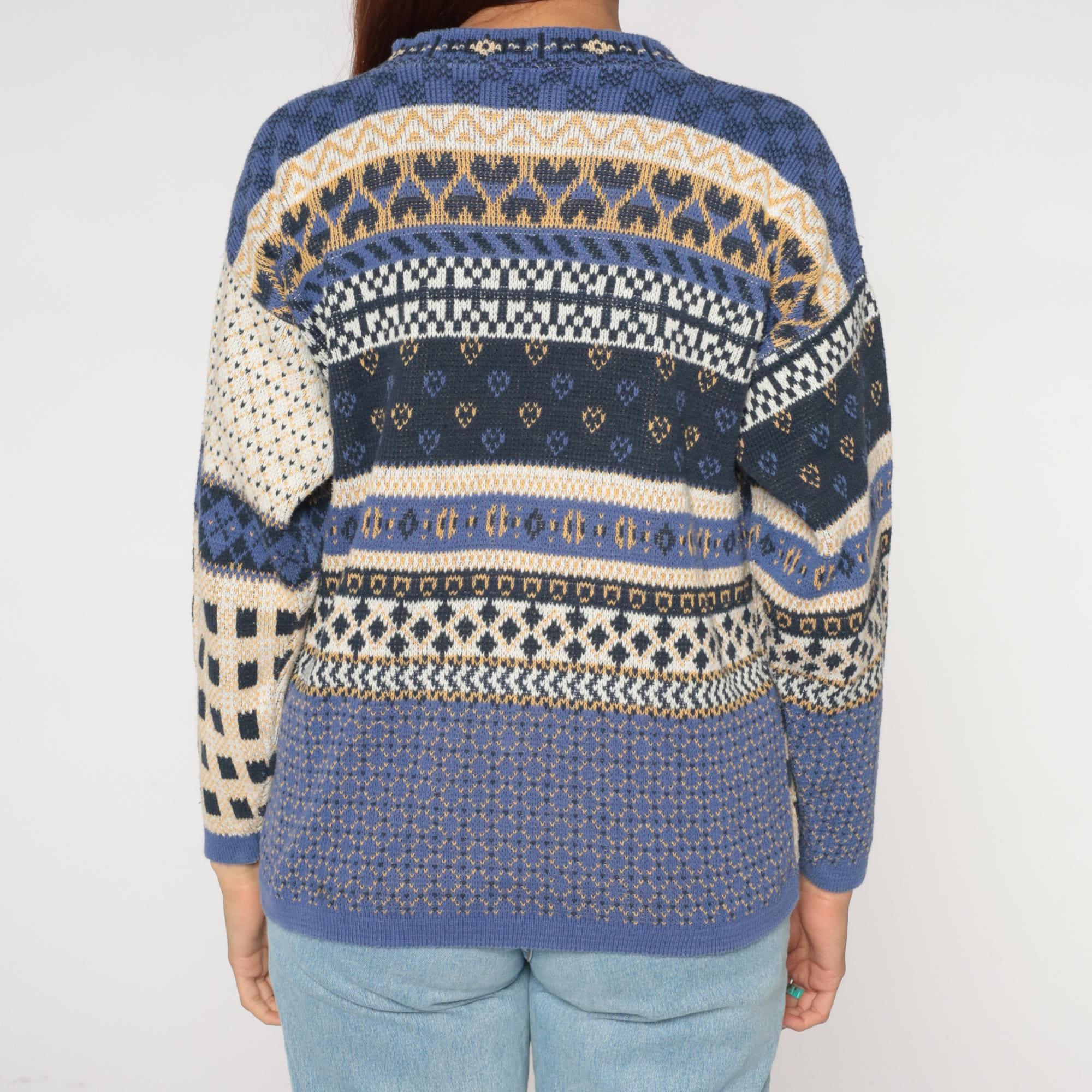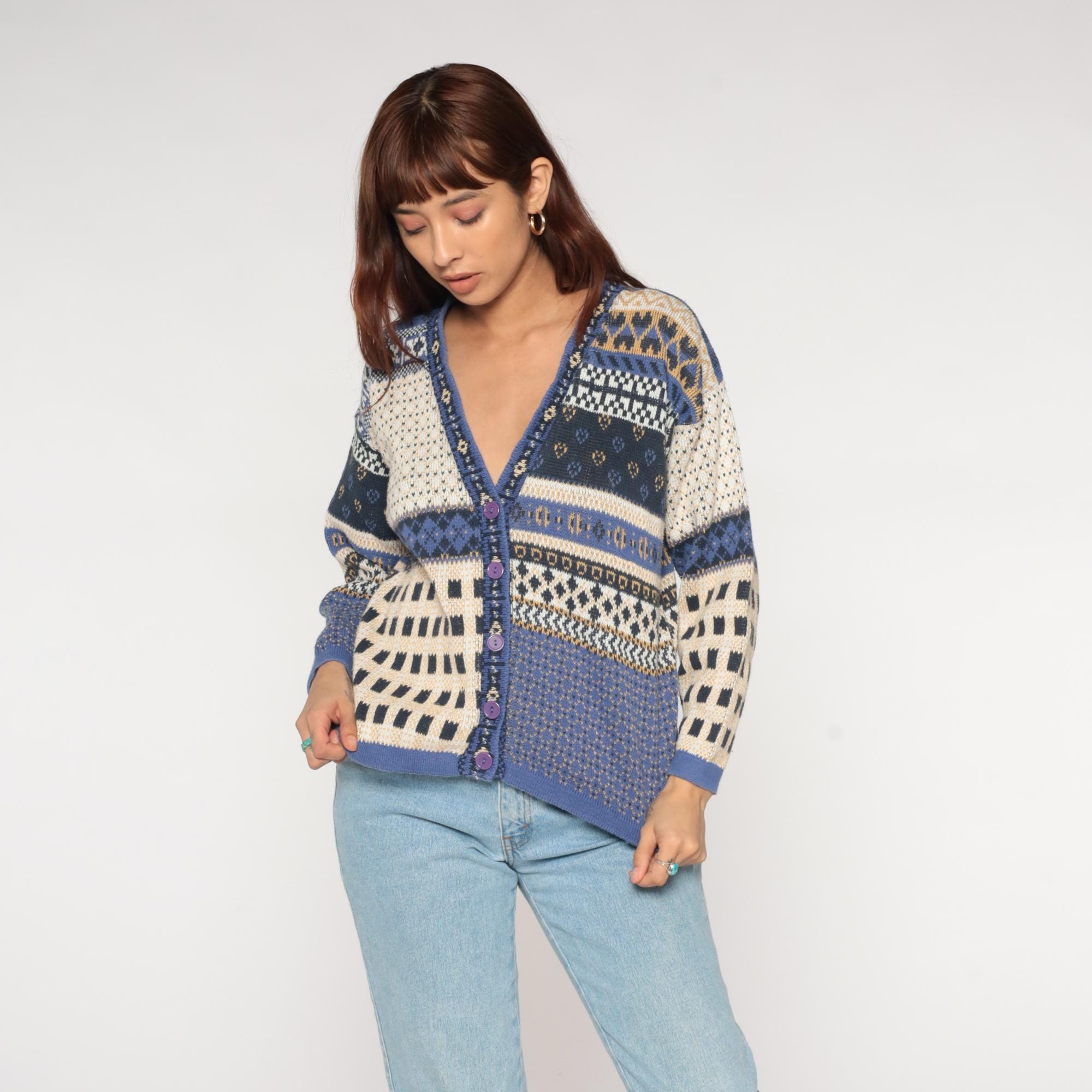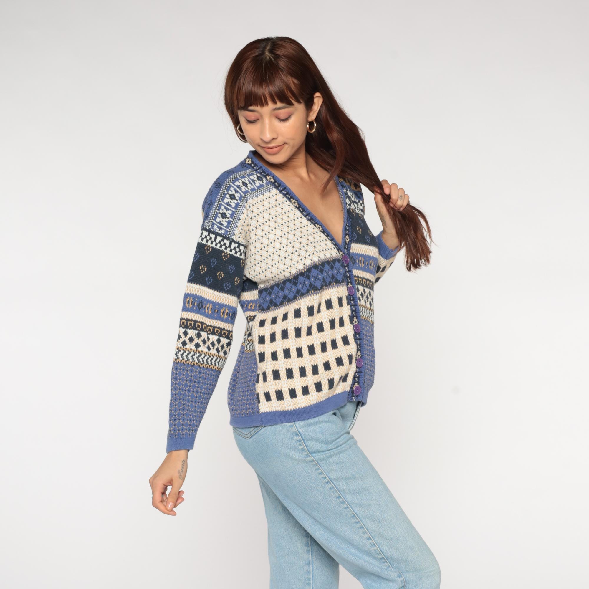 90s cardigan from Cabin Creek featuring a geometric fair isle pattern in blue, cream, and navy with gold accent details. Classic V-neck with button closure and purple buttons. Long sleeves with ribbed cuffs and hem.