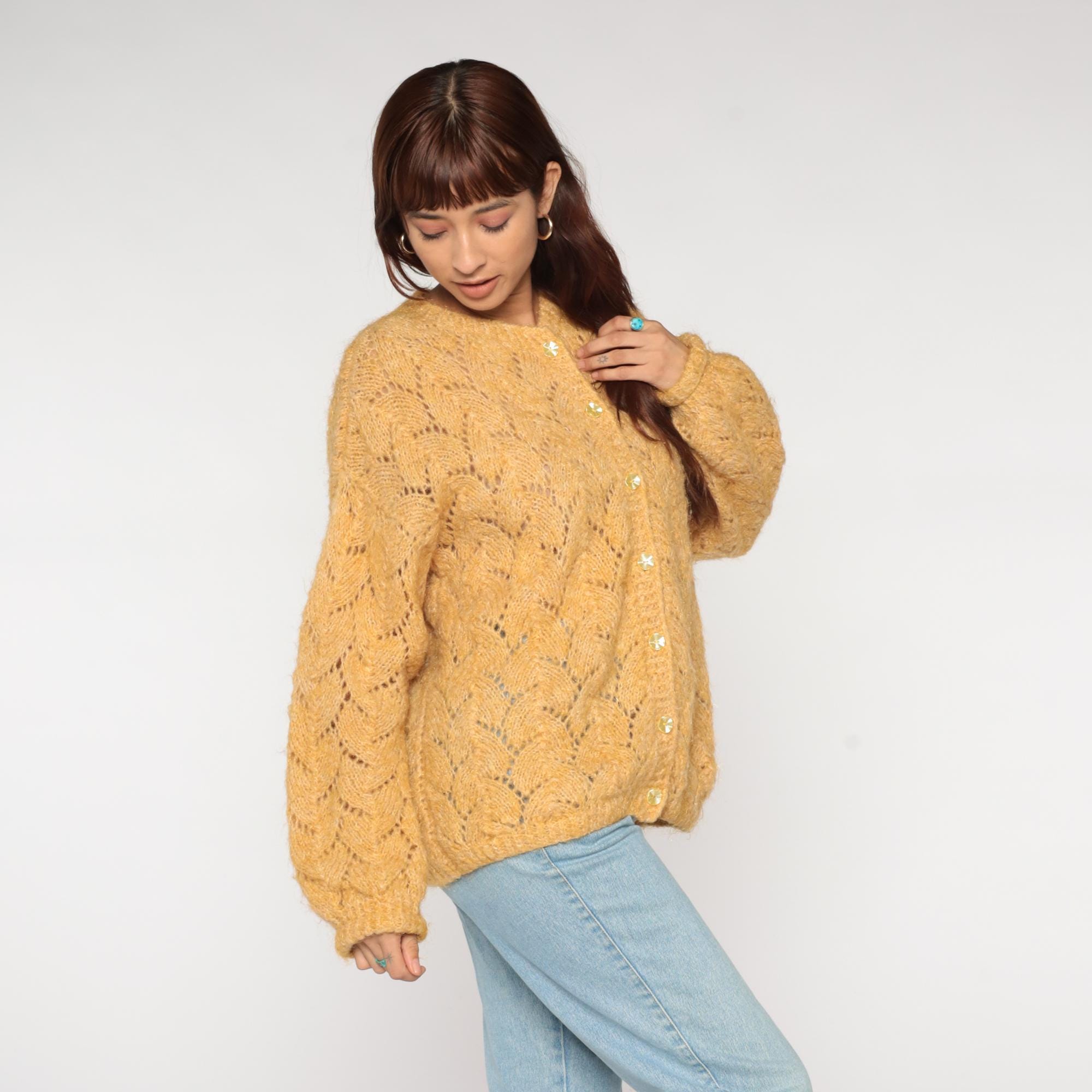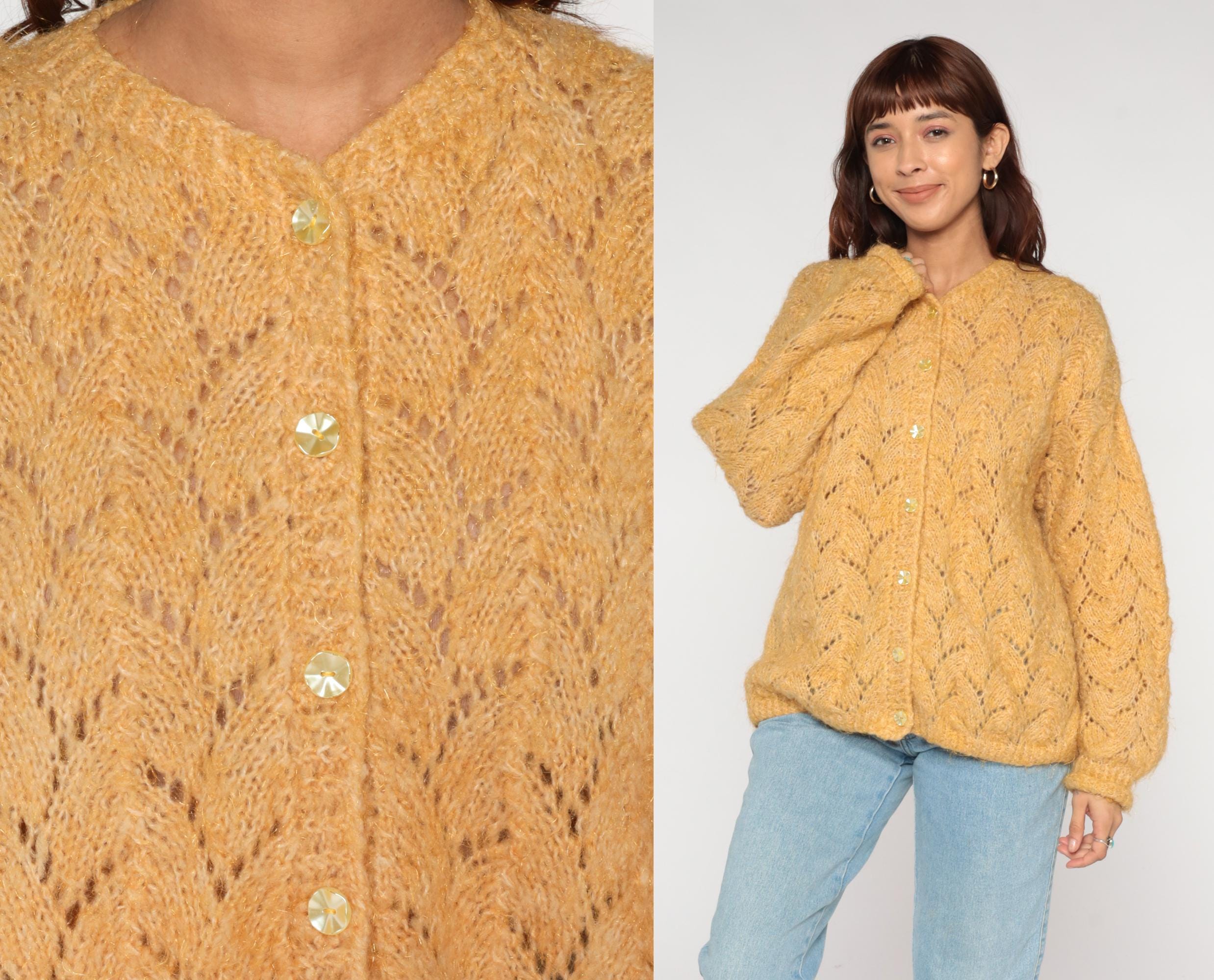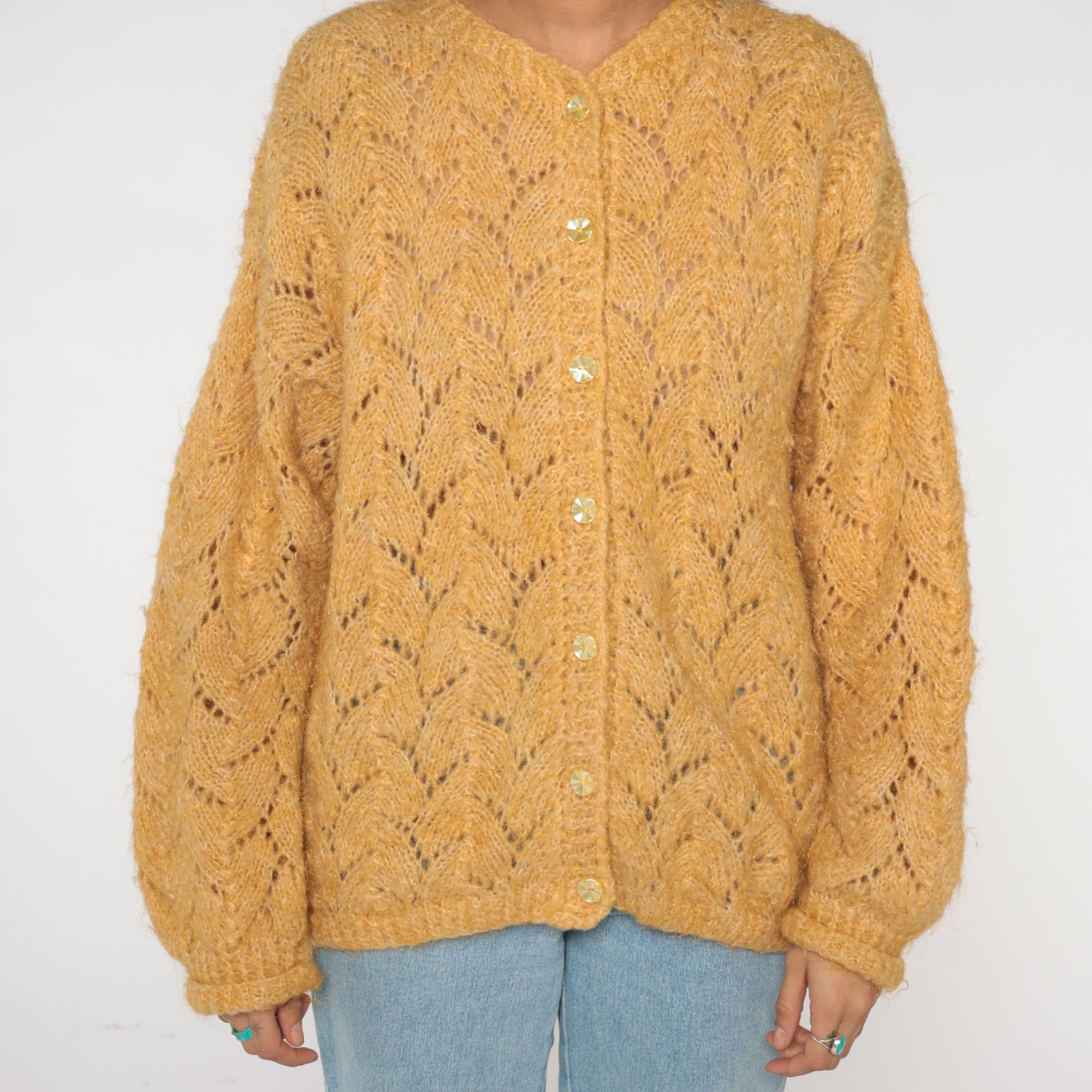 70s mustard gold cardigan featuring delicate pointelle lace knit pattern throughout. V-neckline with crystal-look faceted button closure. Oversized silhouette with ribbed cuffs and hem.