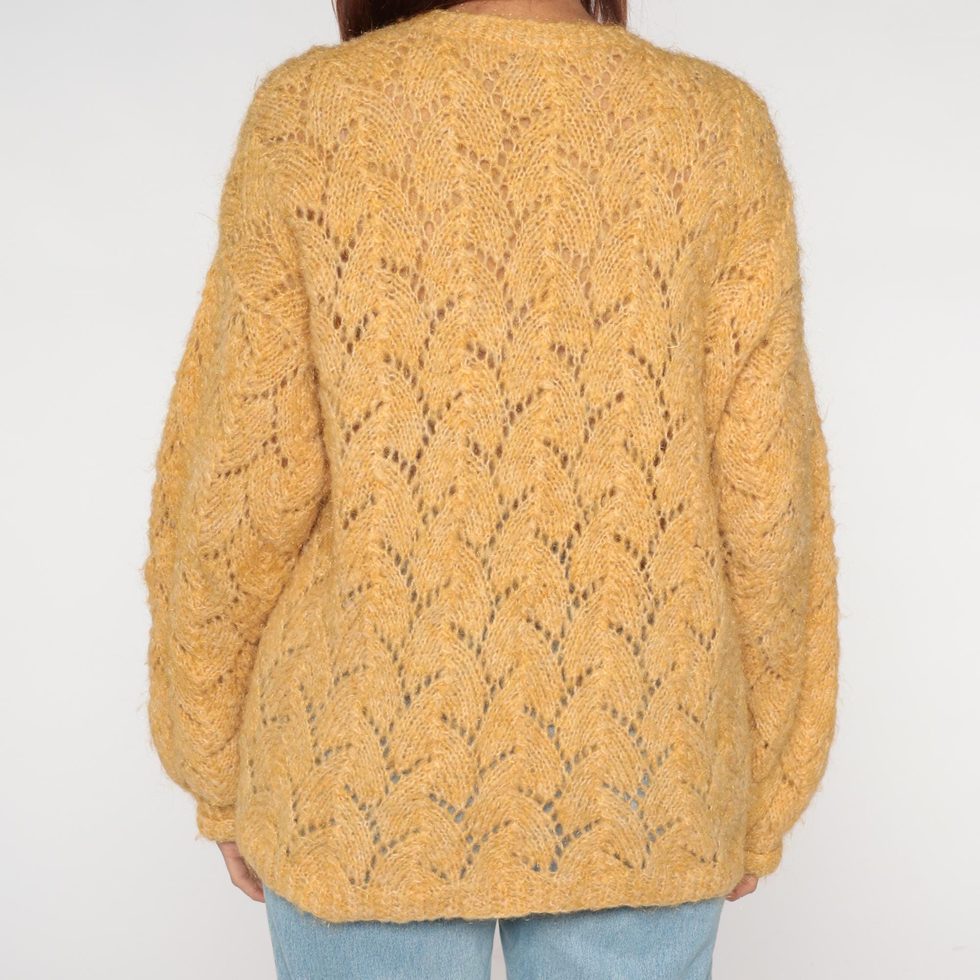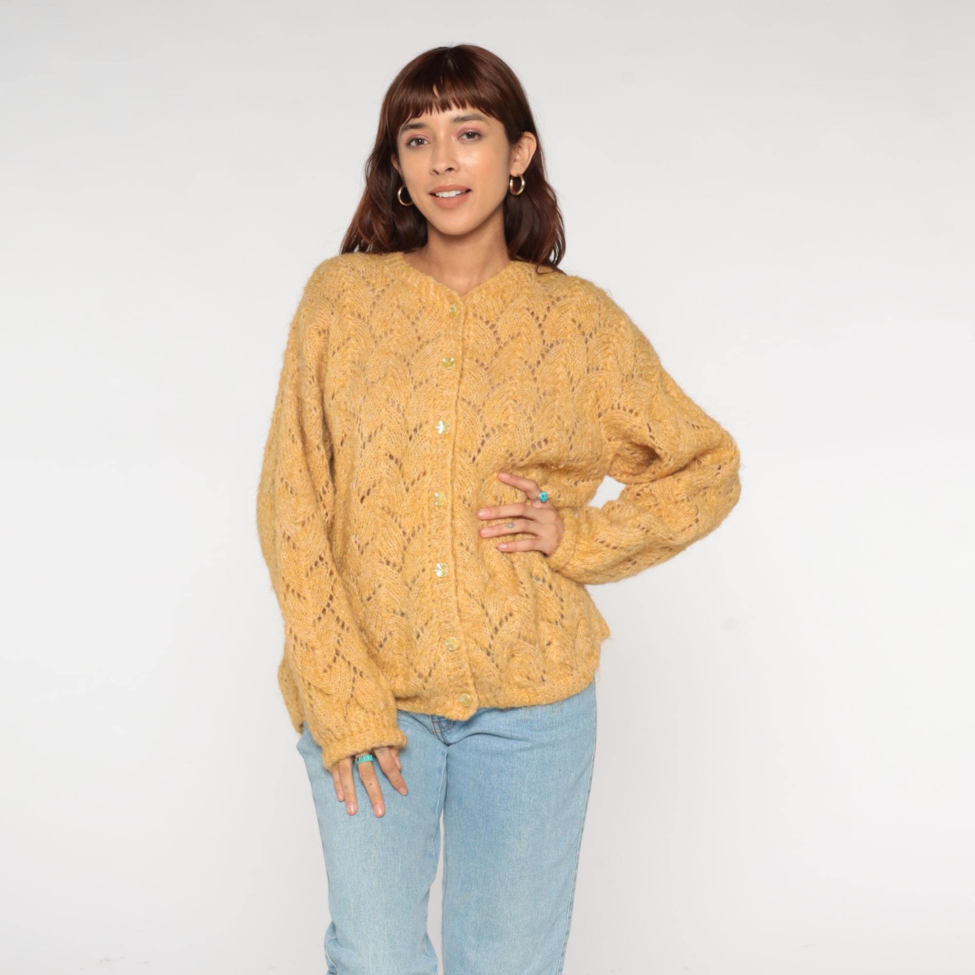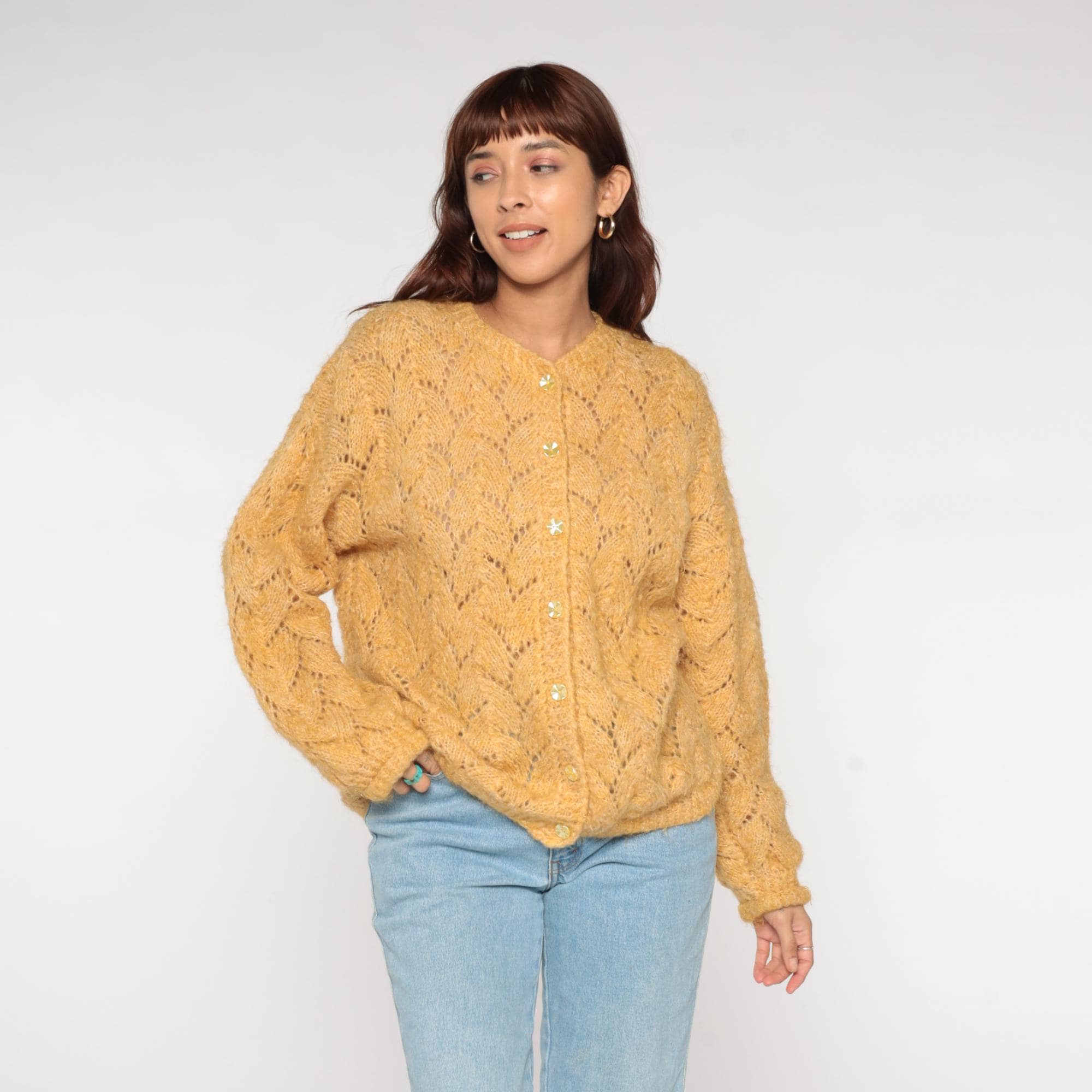 70s mustard gold cardigan featuring delicate pointelle lace knit pattern throughout. V-neckline with crystal-look faceted button closure. Oversized silhouette with ribbed cuffs and hem.