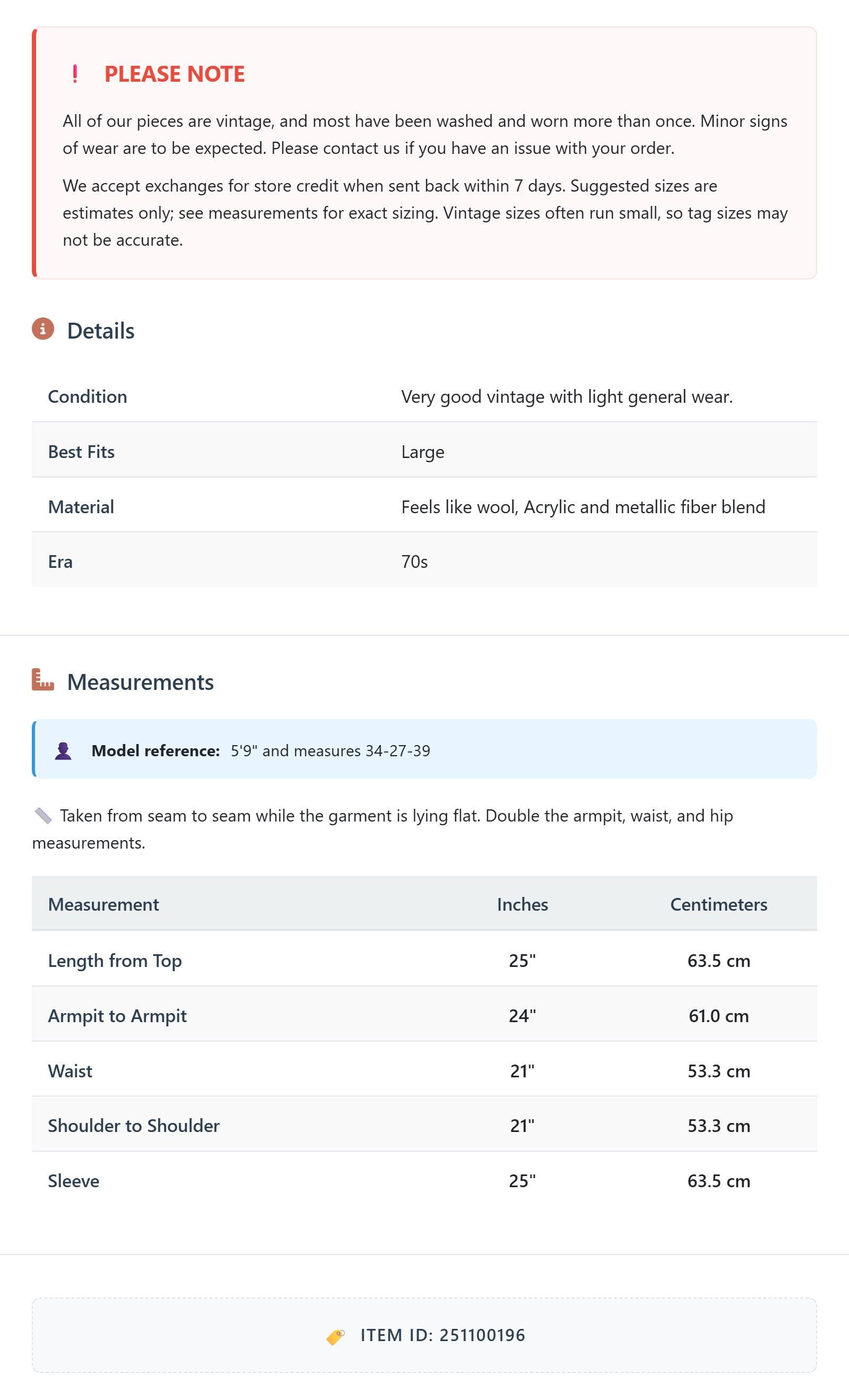 Measurements are taken laying flat and should be doubled where applicable. The "best fits" size is just an estimate, and vintage sizing can vary from modern sizing. Please use measurements to ensure proper fit. The best thing to do is measure a similar item of your own, and compare. When an item has stretch, we will list the unstretched dimensions with the stretched measurement afterwards.