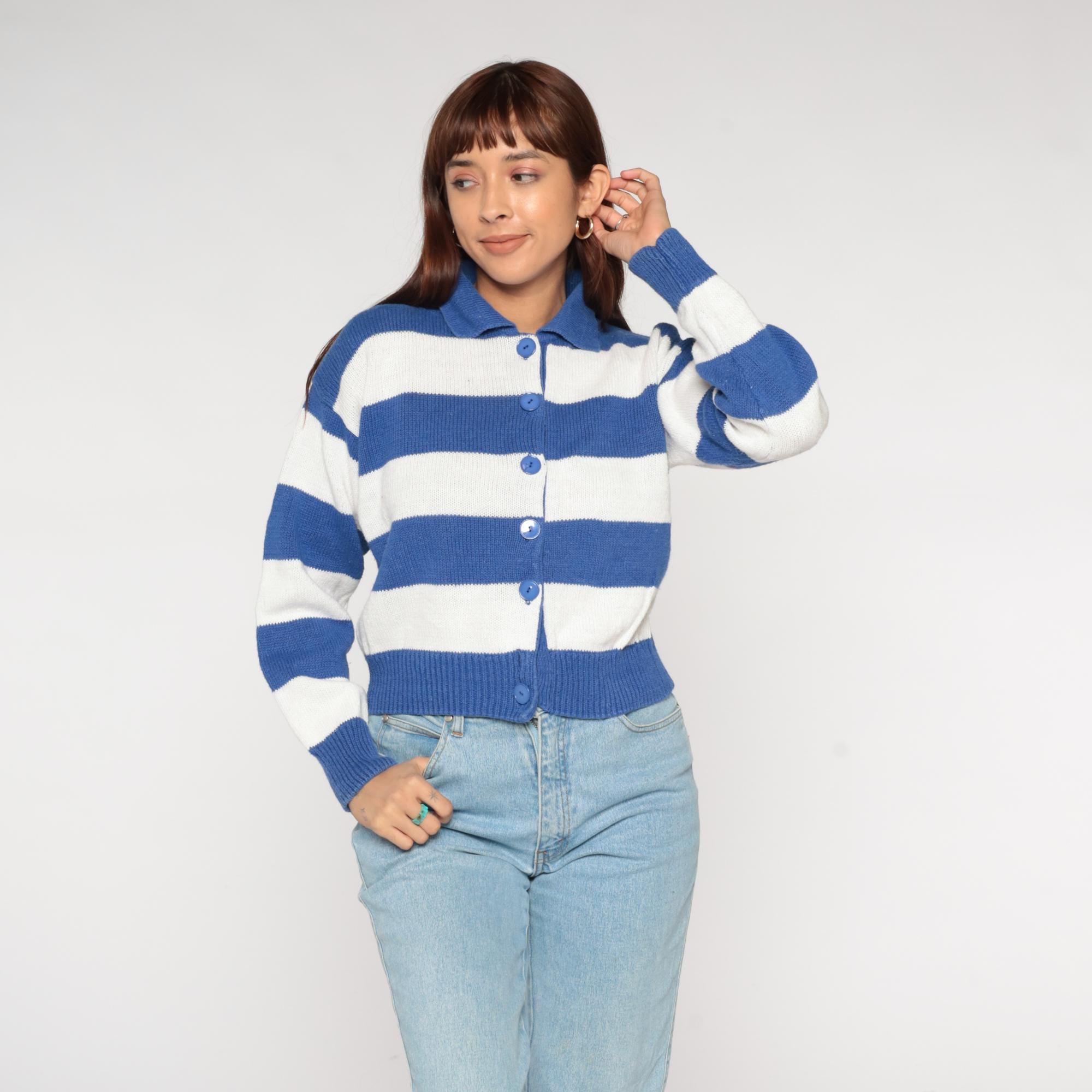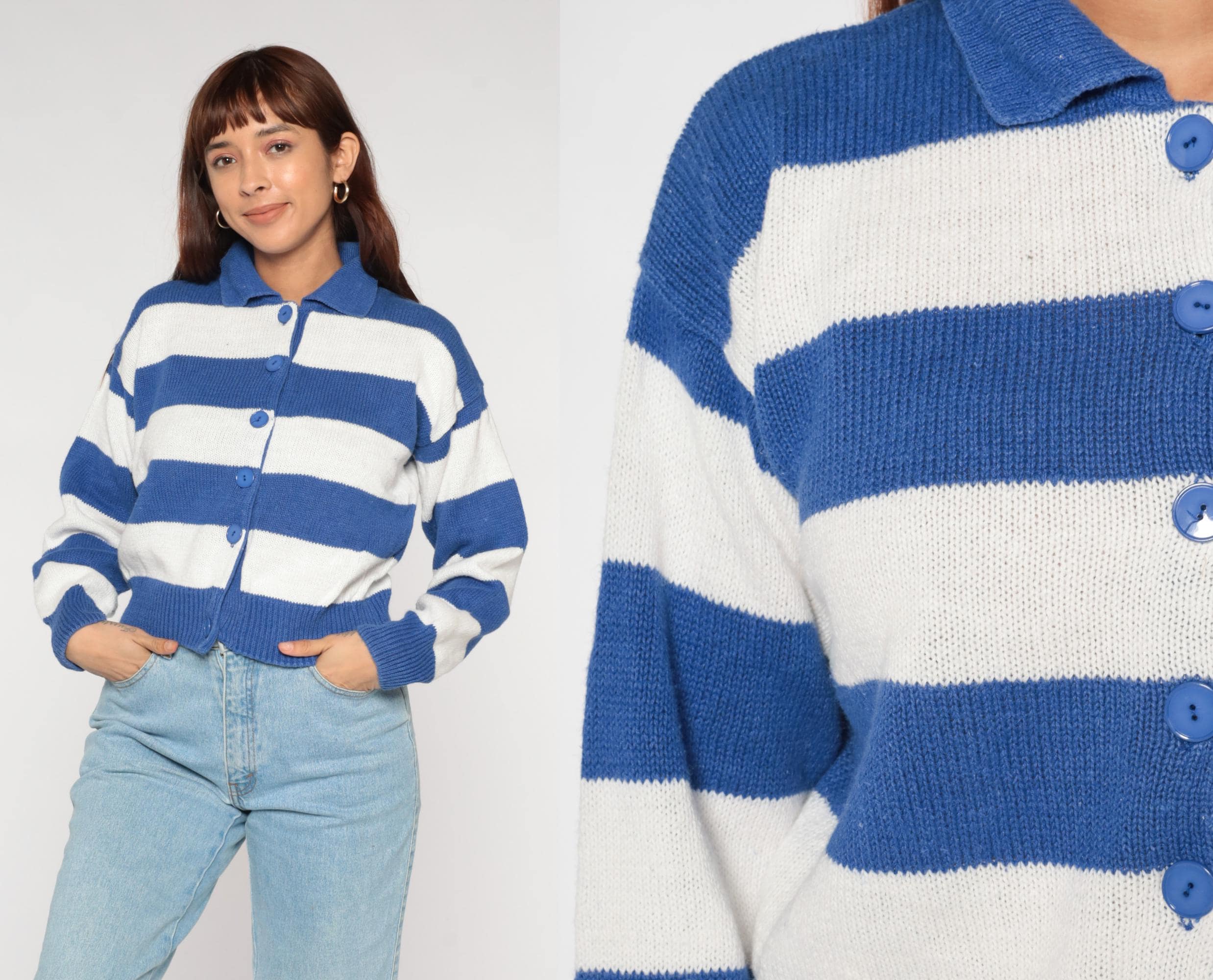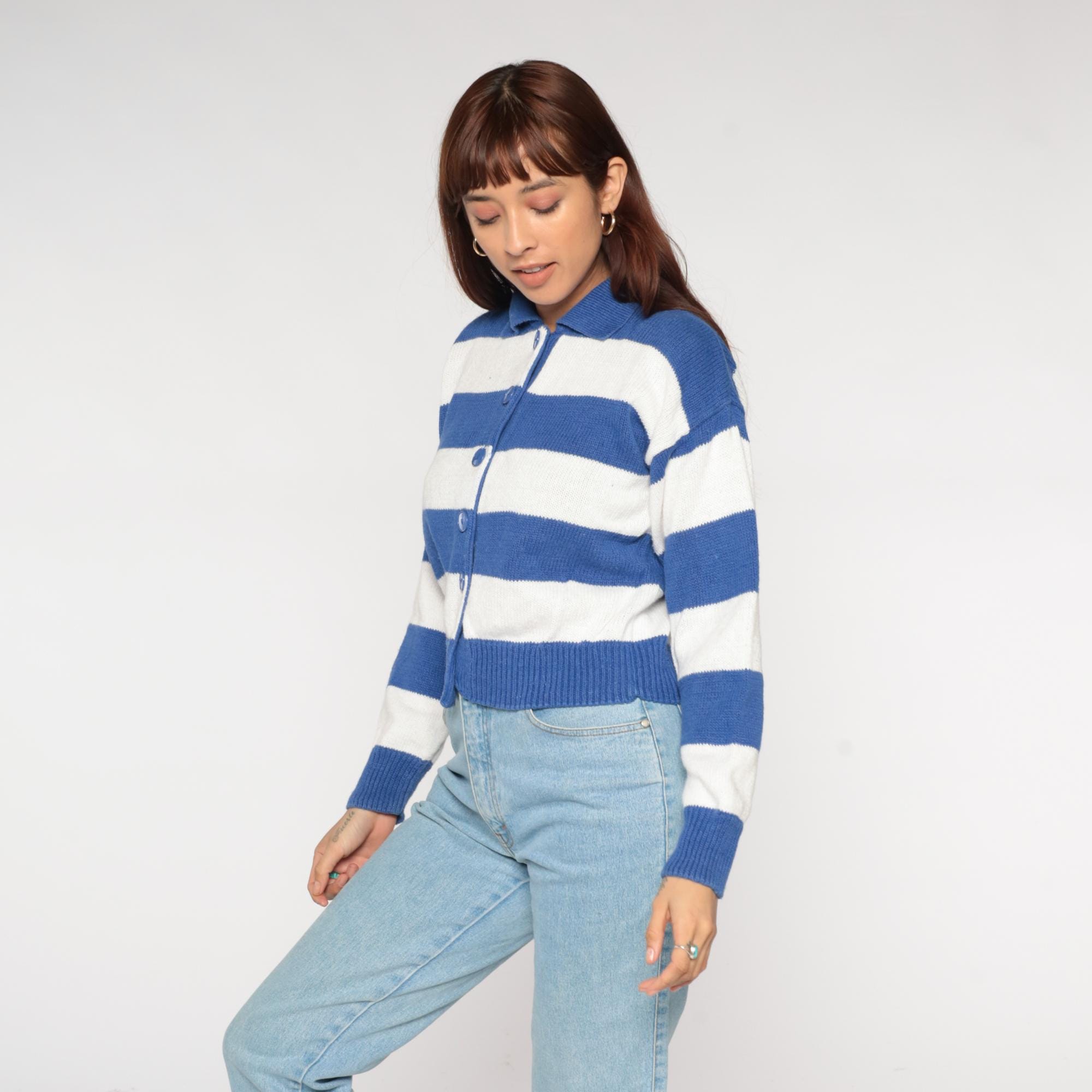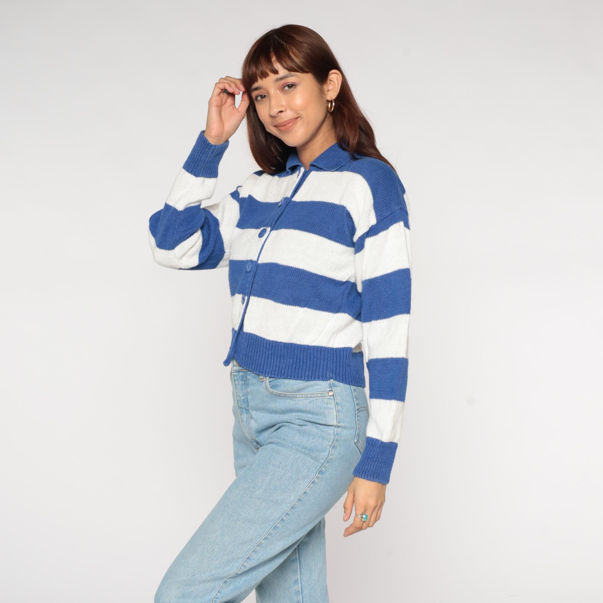 90s nautical cardigan from Gitano featuring bold blue and white horizontal stripes. Classic collar with button front closure and matching blue buttons. Cropped silhouette with ribbed cuffs and hem.