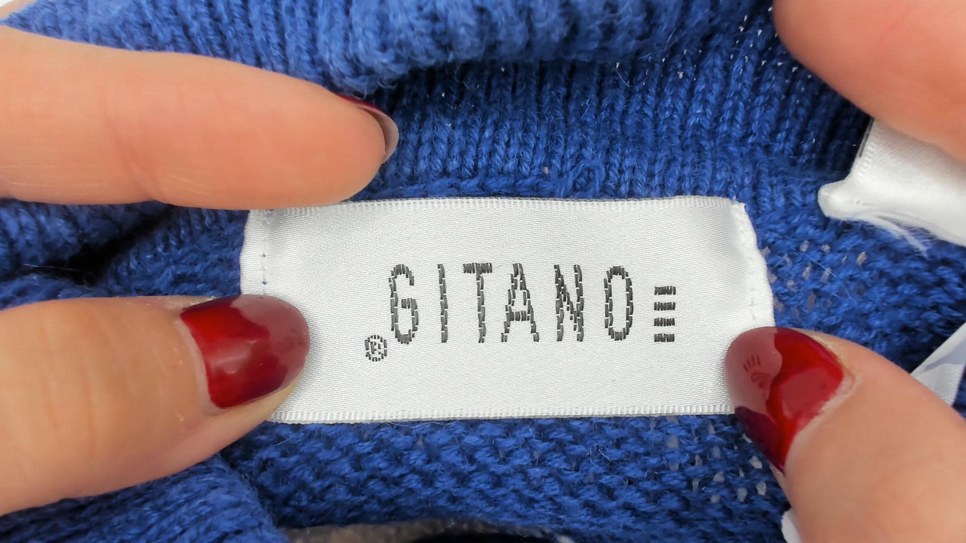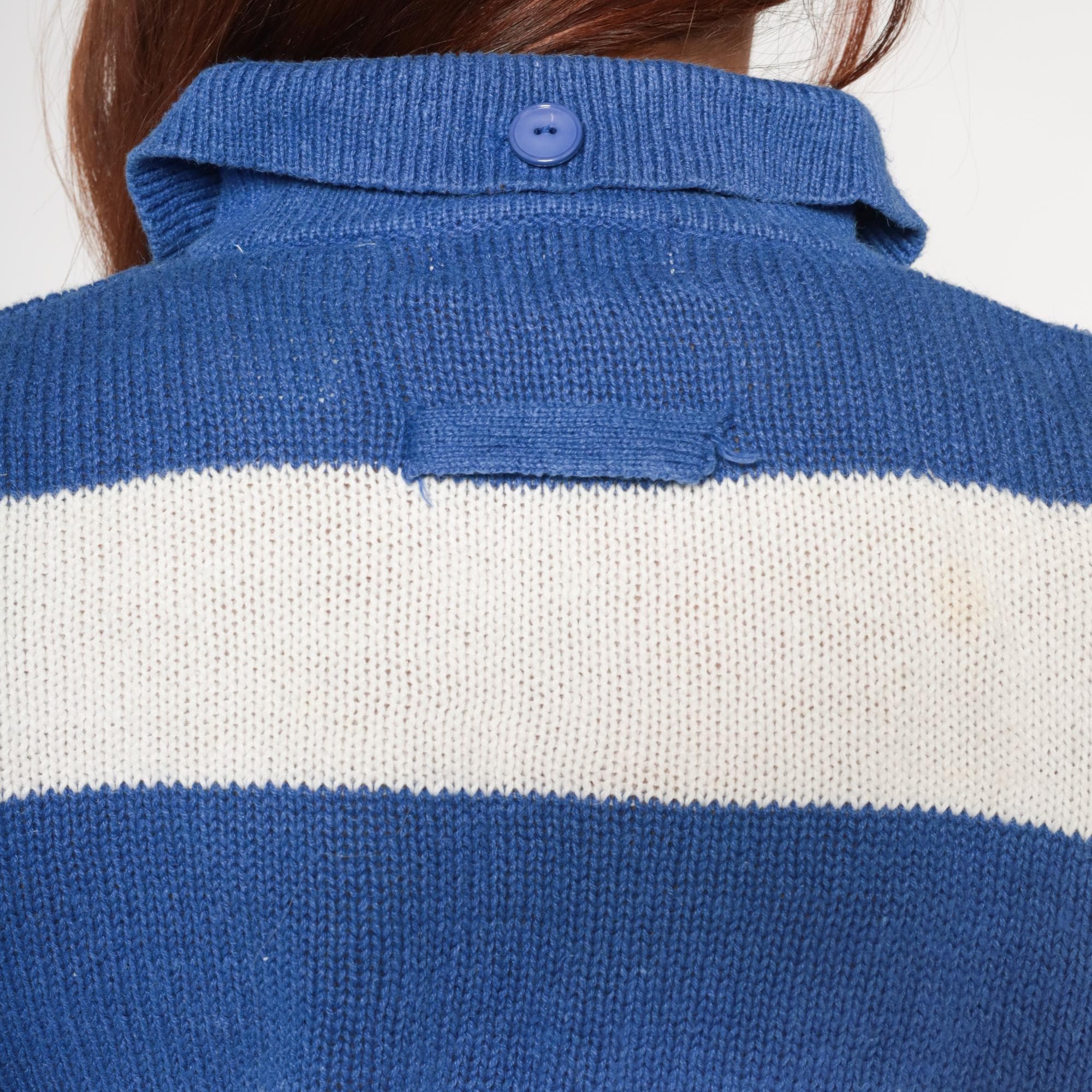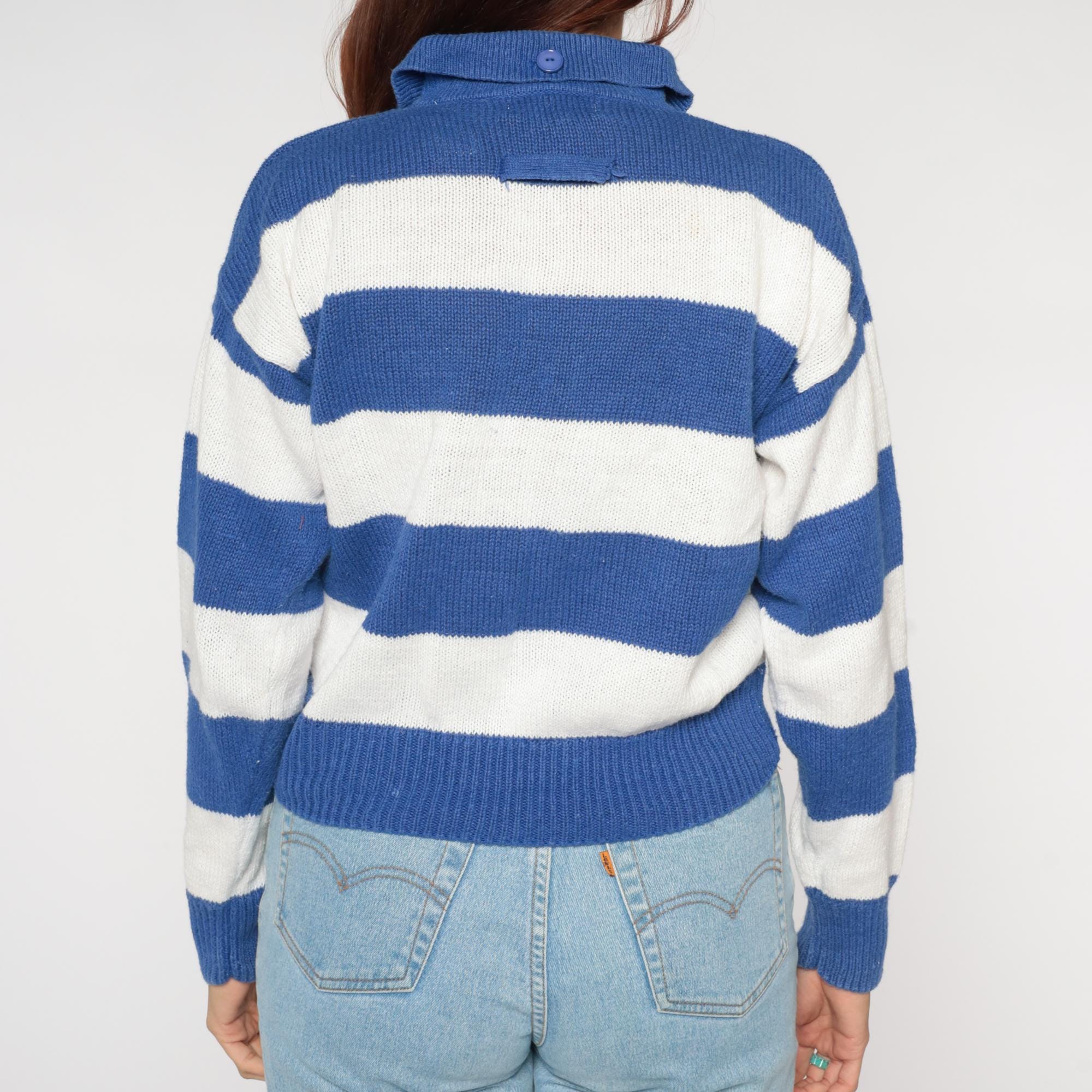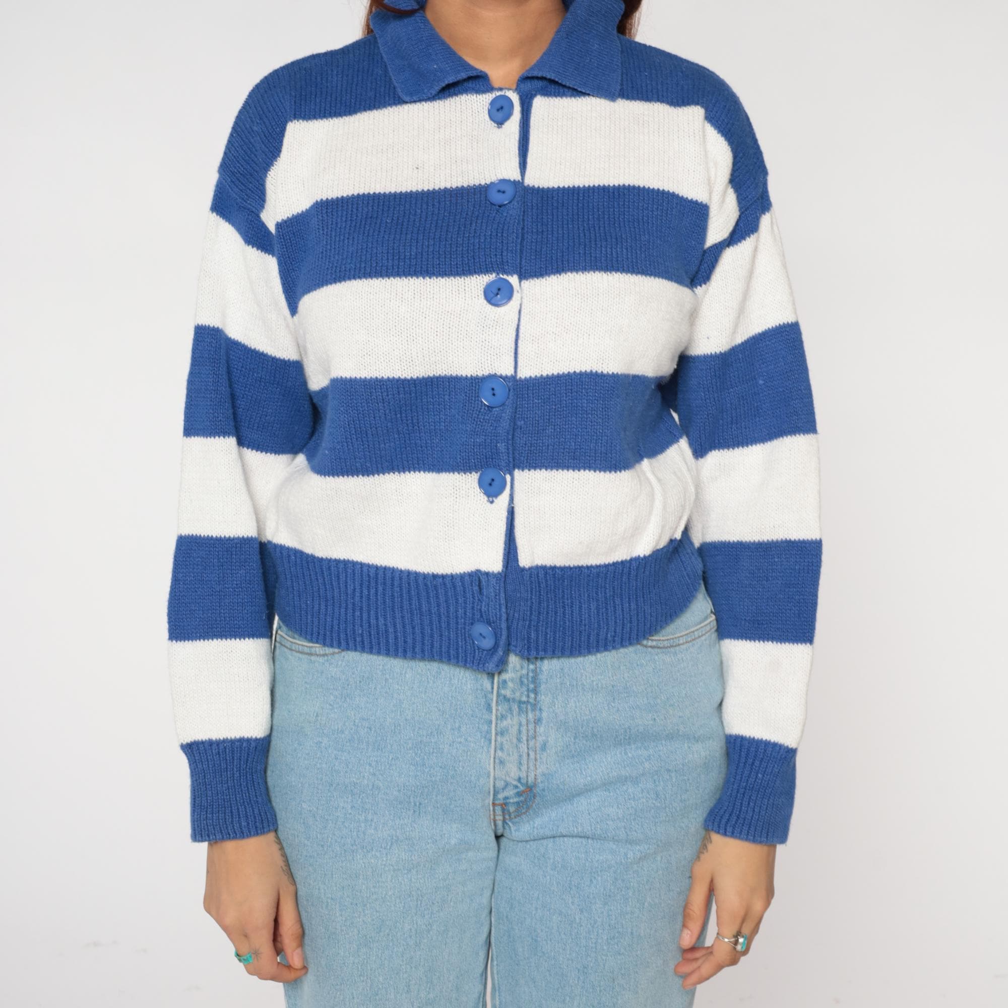 90s nautical cardigan from Gitano featuring bold blue and white horizontal stripes. Classic collar with button front closure and matching blue buttons. Cropped silhouette with ribbed cuffs and hem.