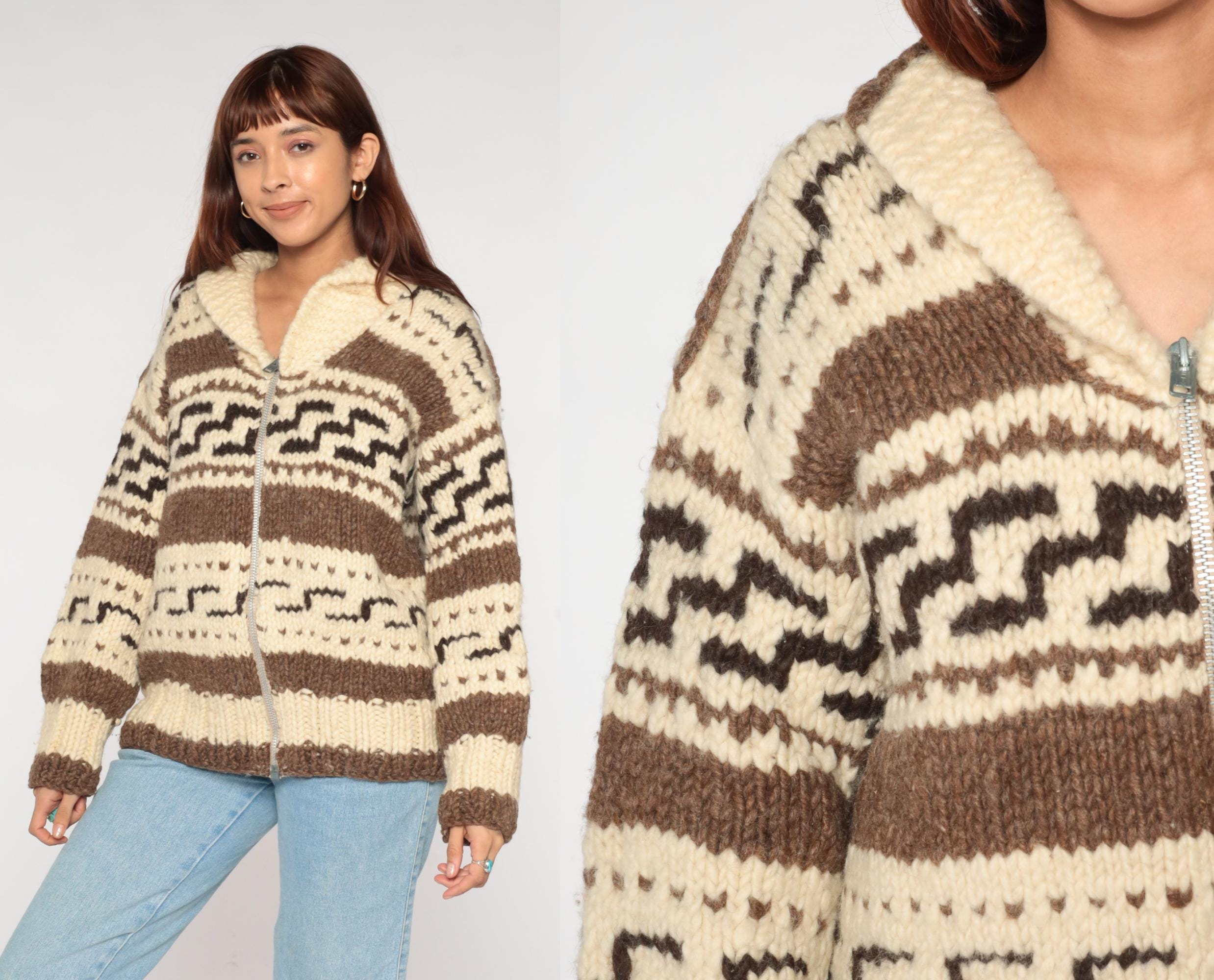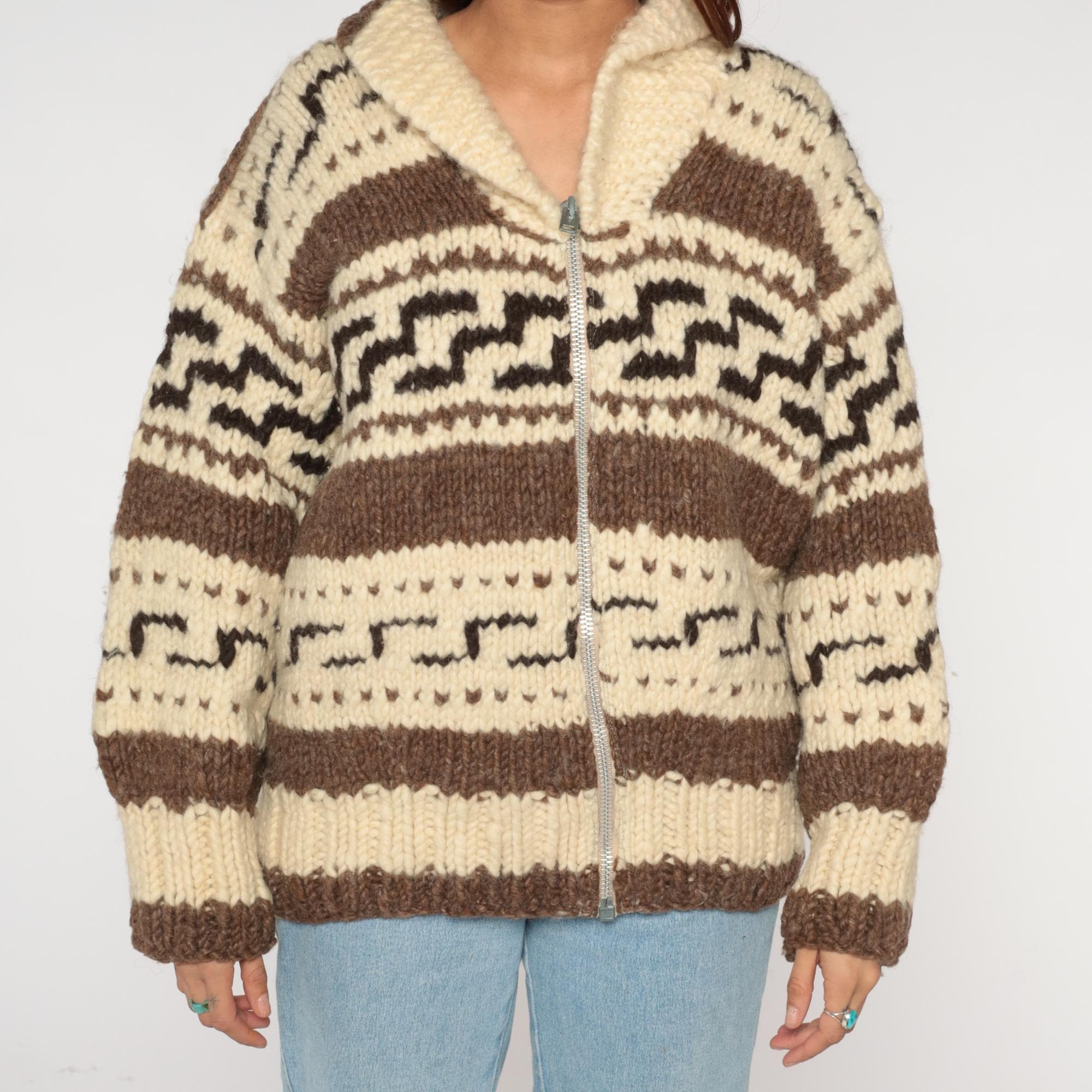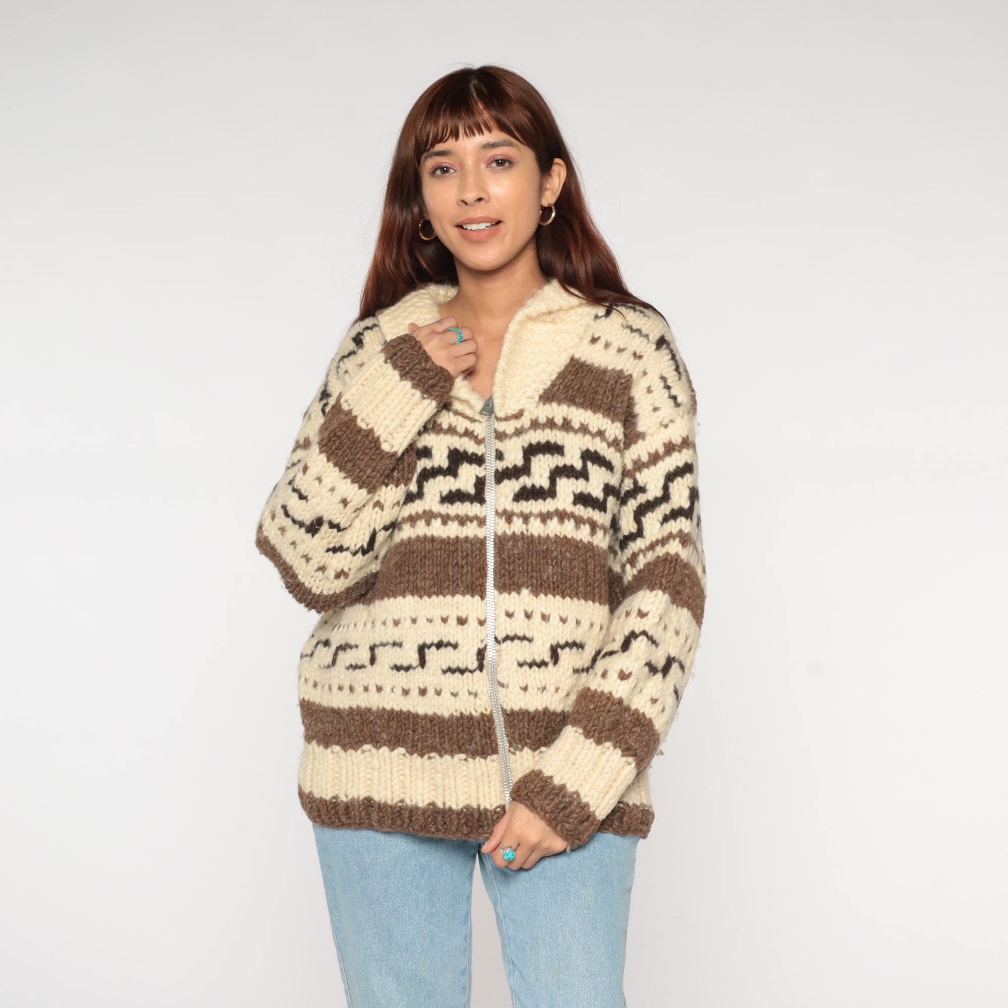 70s chunky knit cardigan in Cowichan style featuring cream and brown geometric patterns with black zigzag details. Cozy shawl collar with full metal zipper front closure. Made from wool that's substantial and warm. Ribbed cuffs and hem for structure.