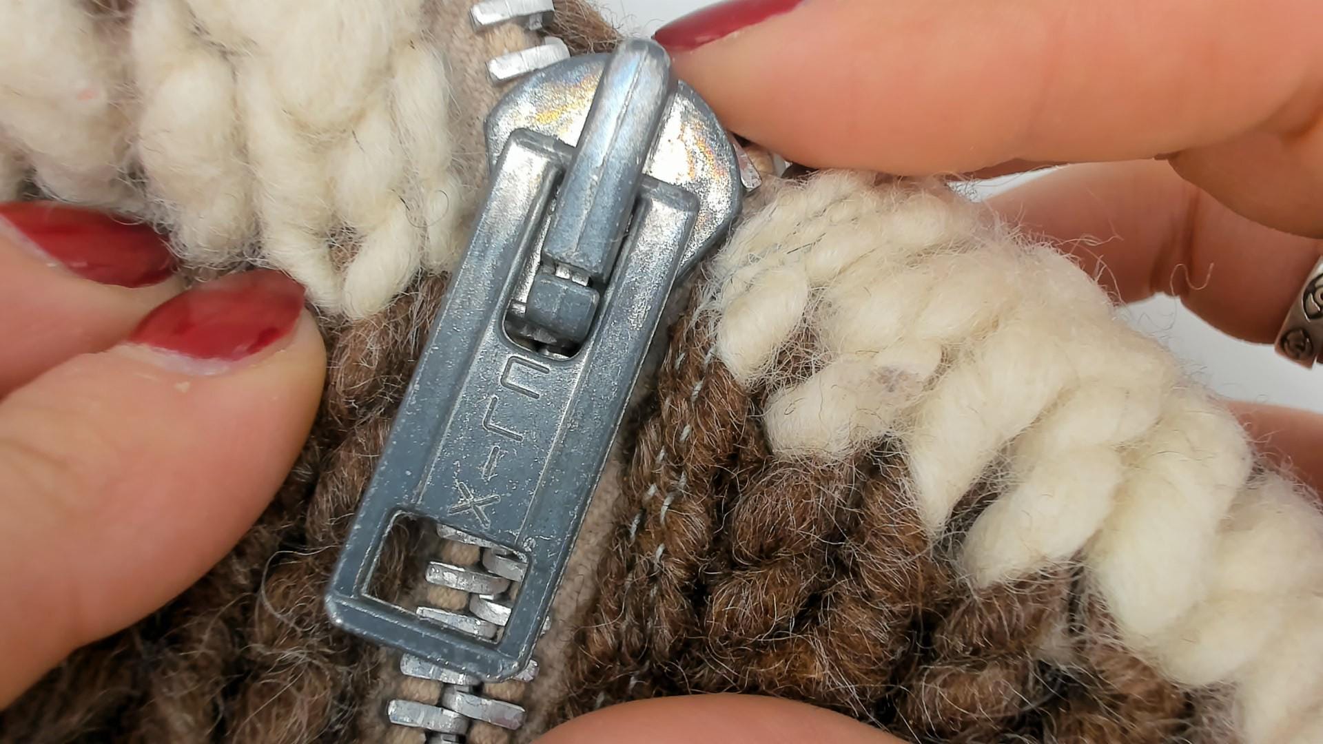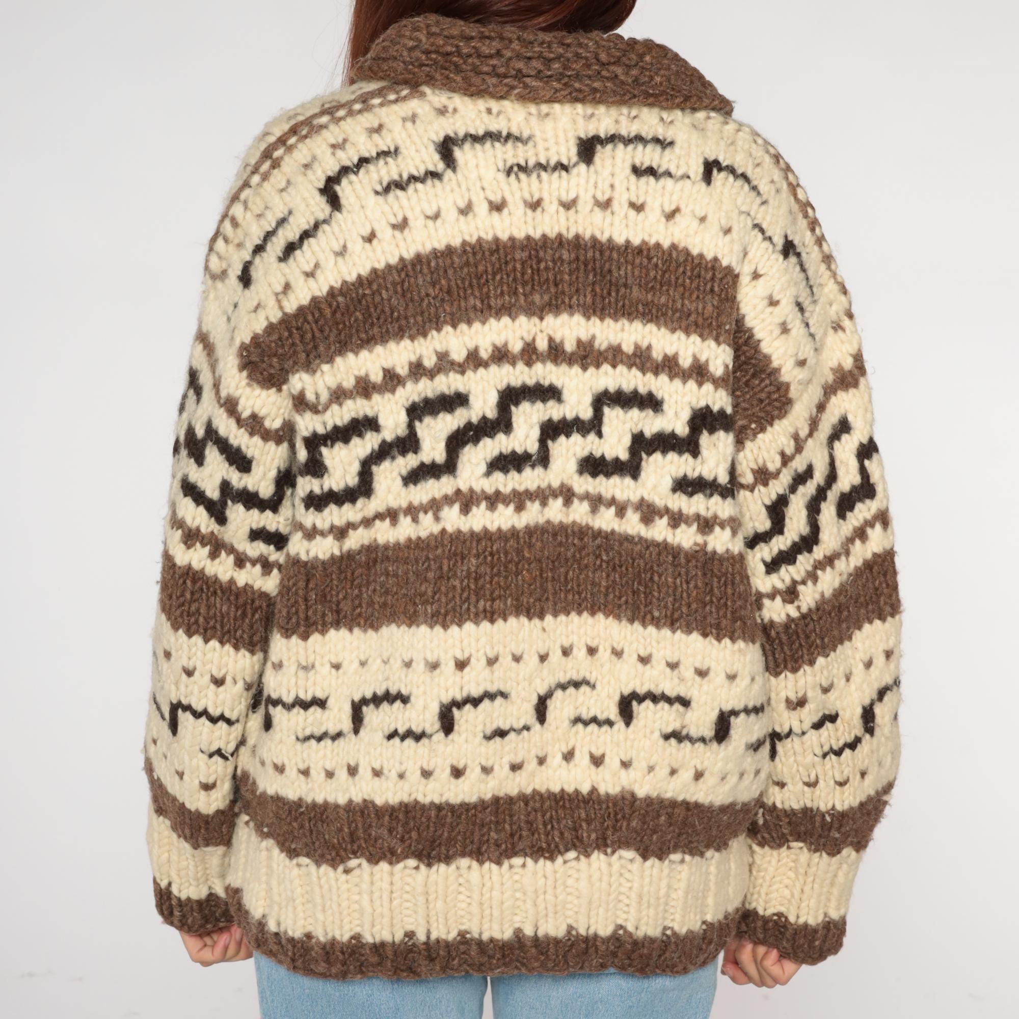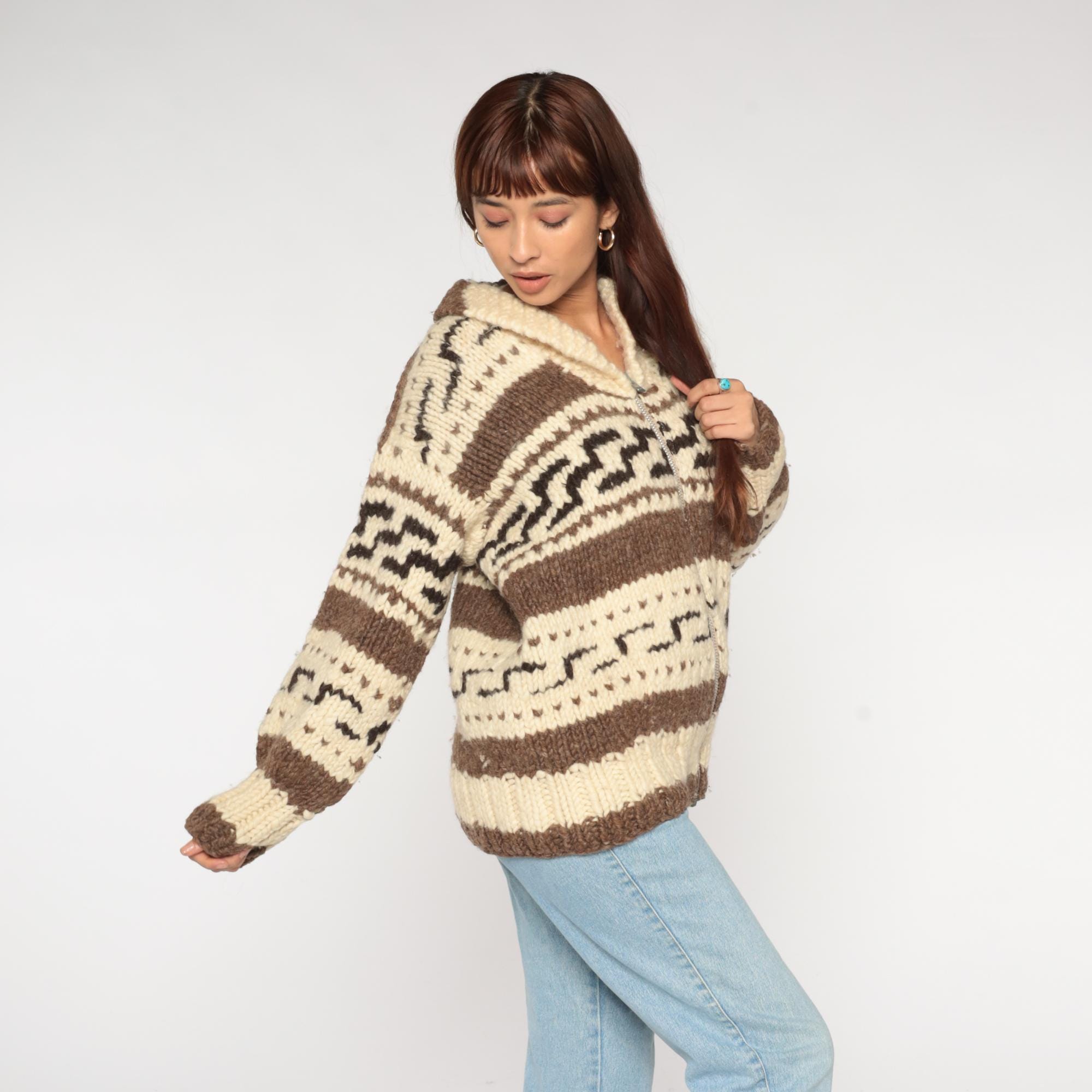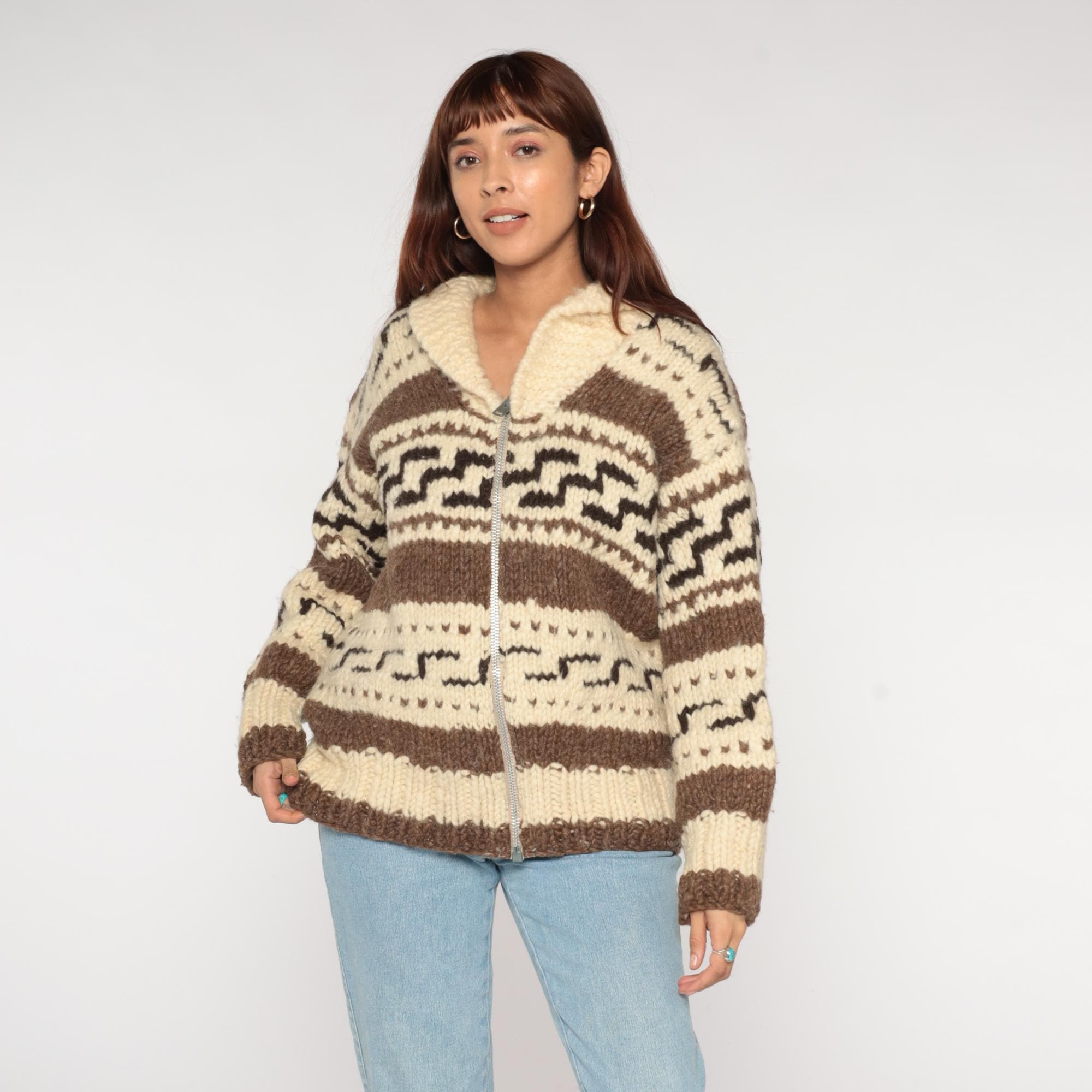 70s chunky knit cardigan in Cowichan style featuring cream and brown geometric patterns with black zigzag details. Cozy shawl collar with full metal zipper front closure. Made from wool that's substantial and warm. Ribbed cuffs and hem for structure.