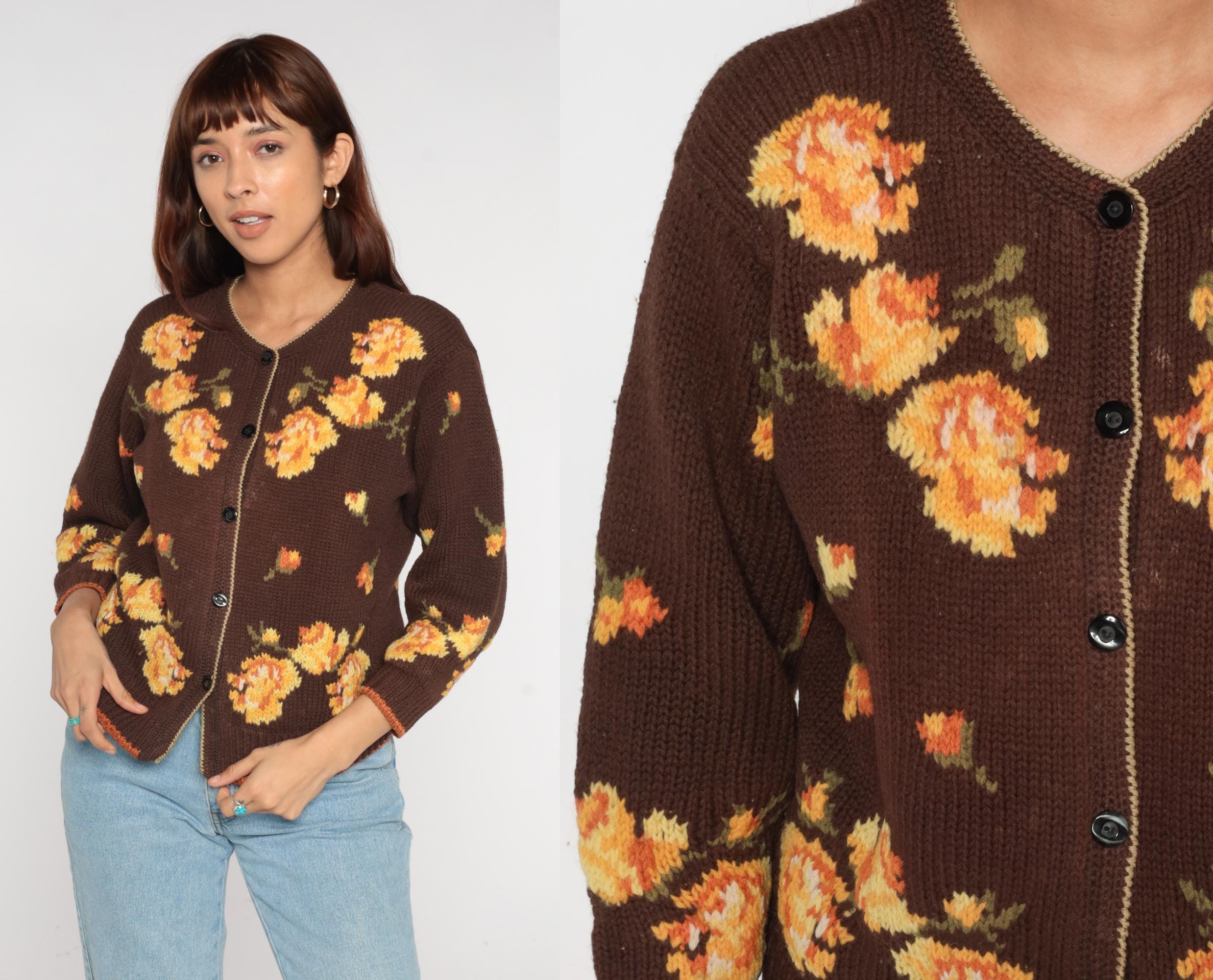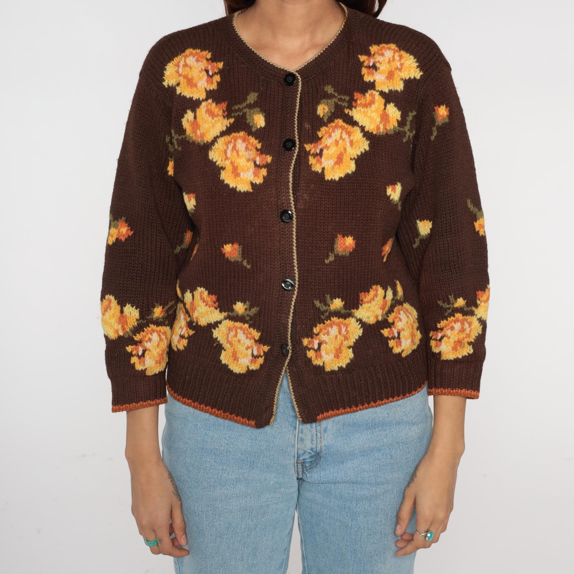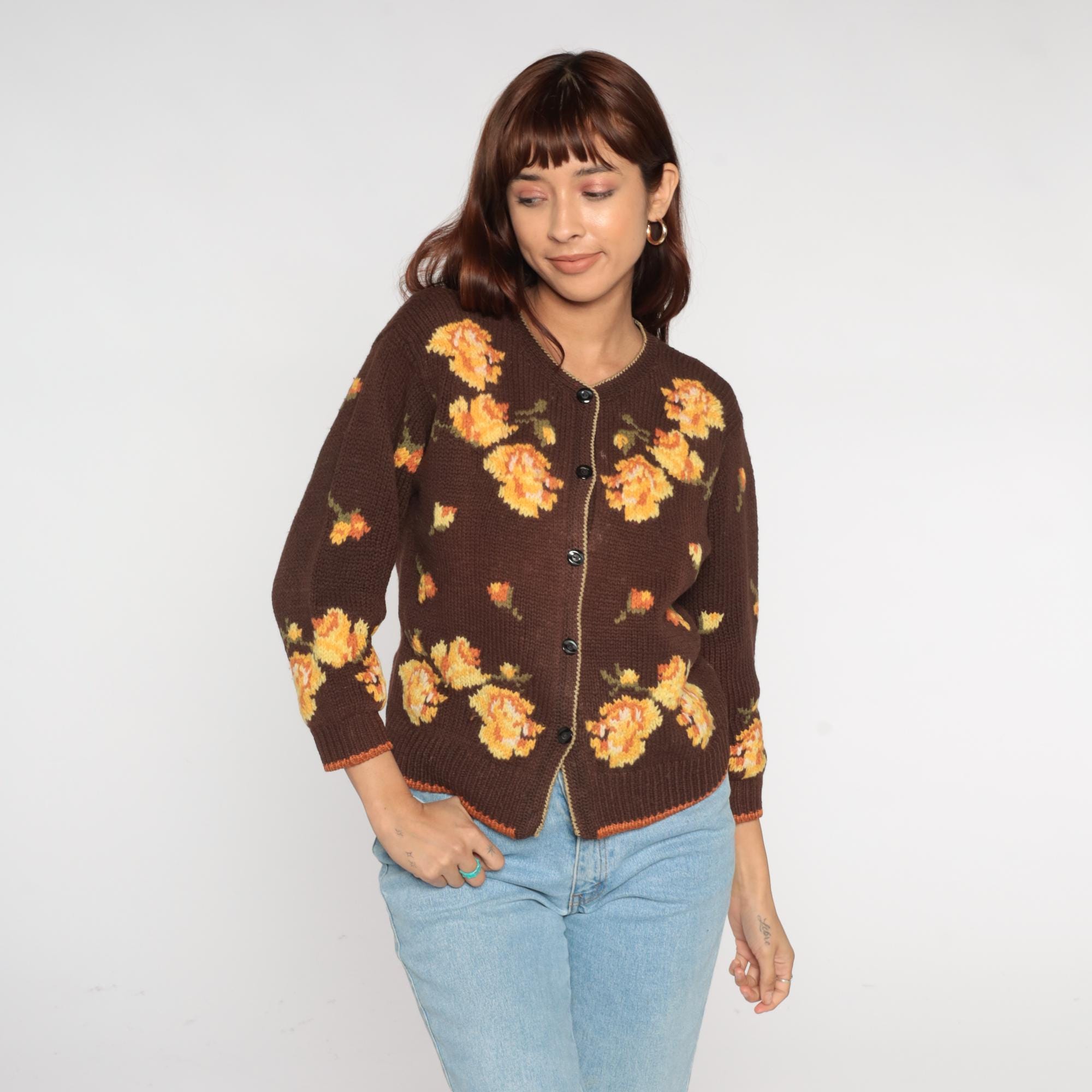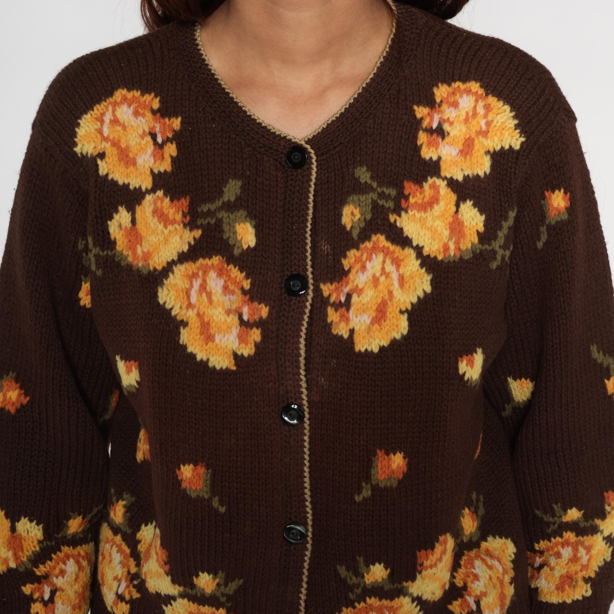 80s floral cardigan from Yirunyuan featuring vibrant orange and yellow flowers on a rich chocolate brown background. Classic V-neck with button front closure (missing bottom button). Contrasting orange trim along the hemline adds a pop of color.