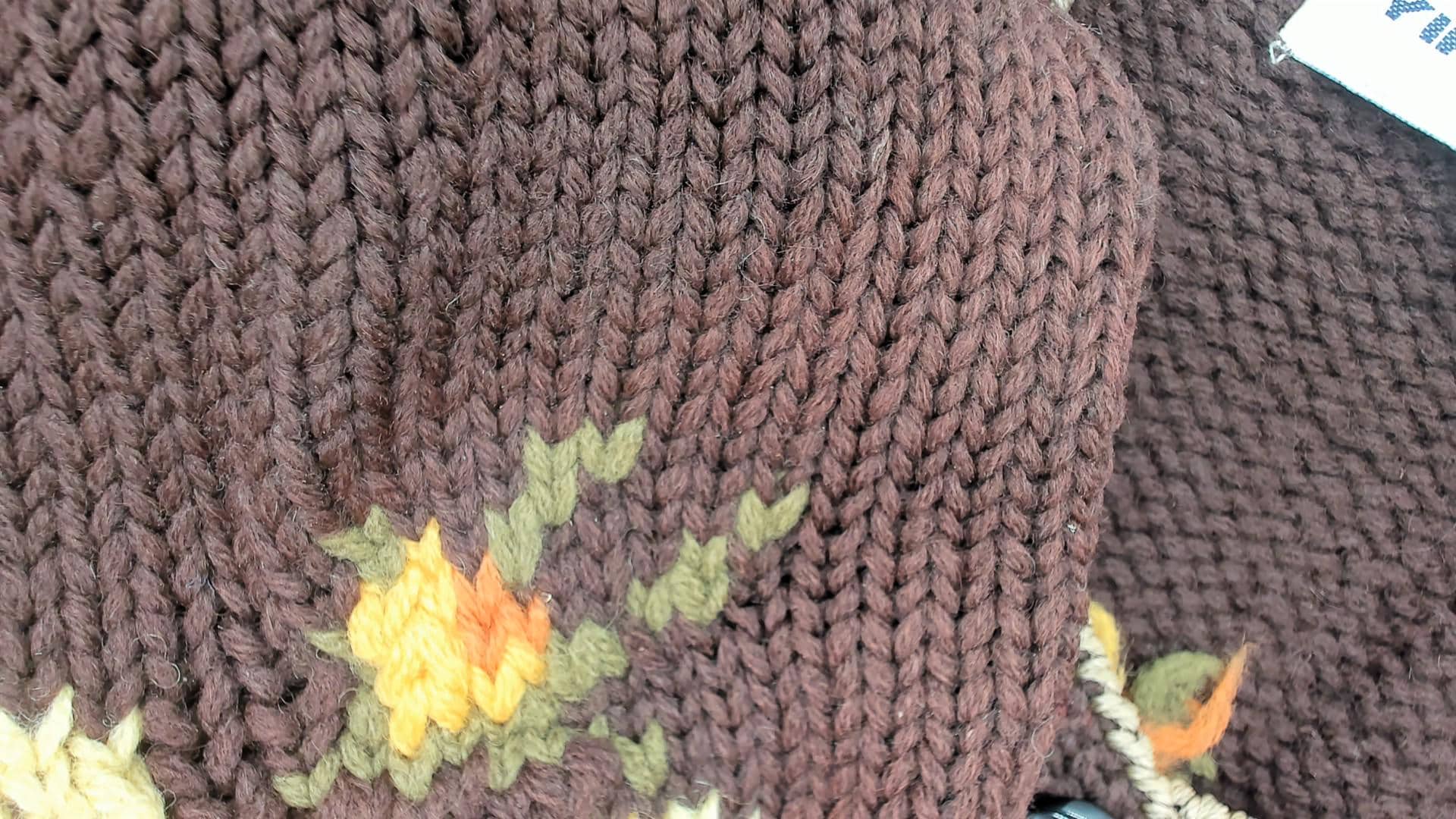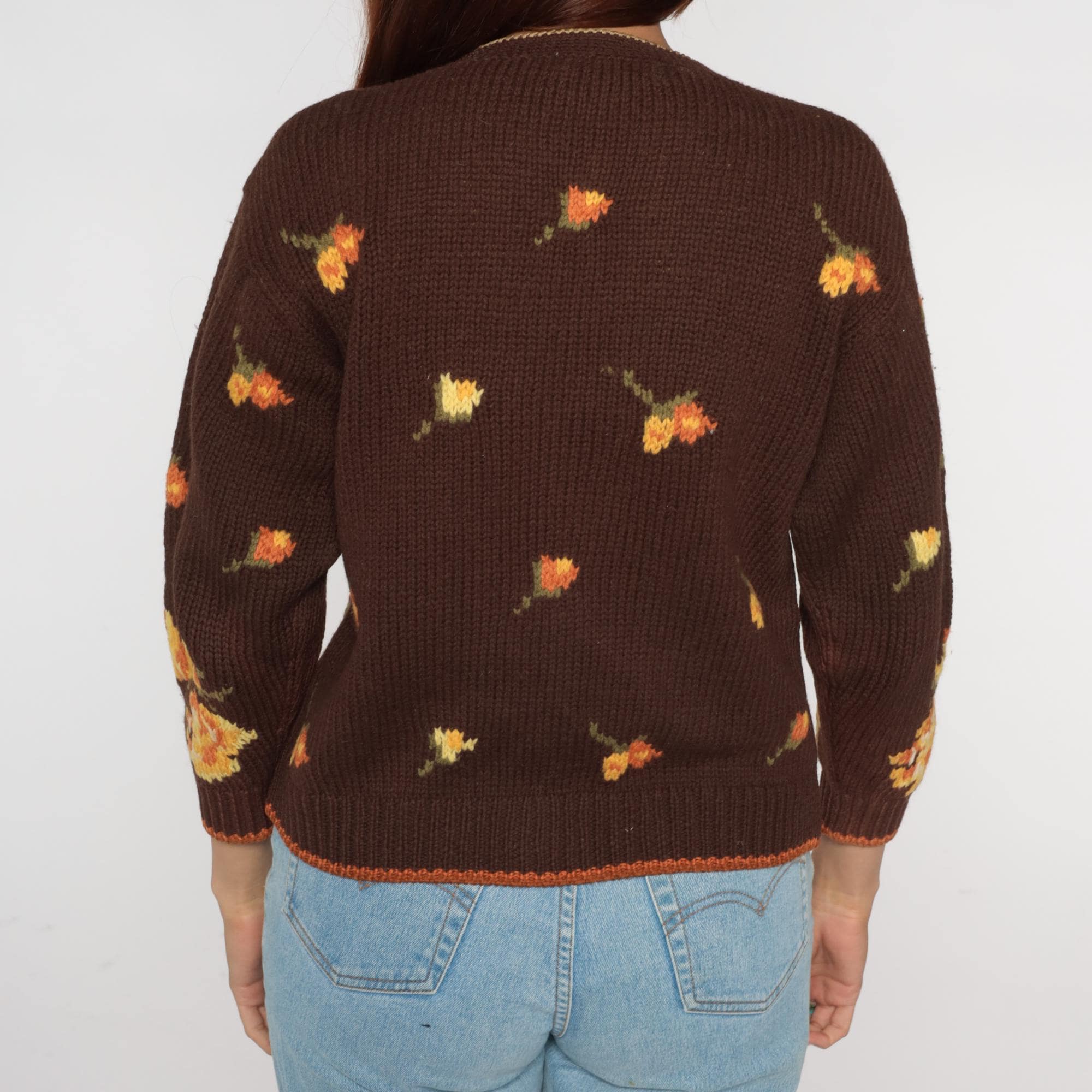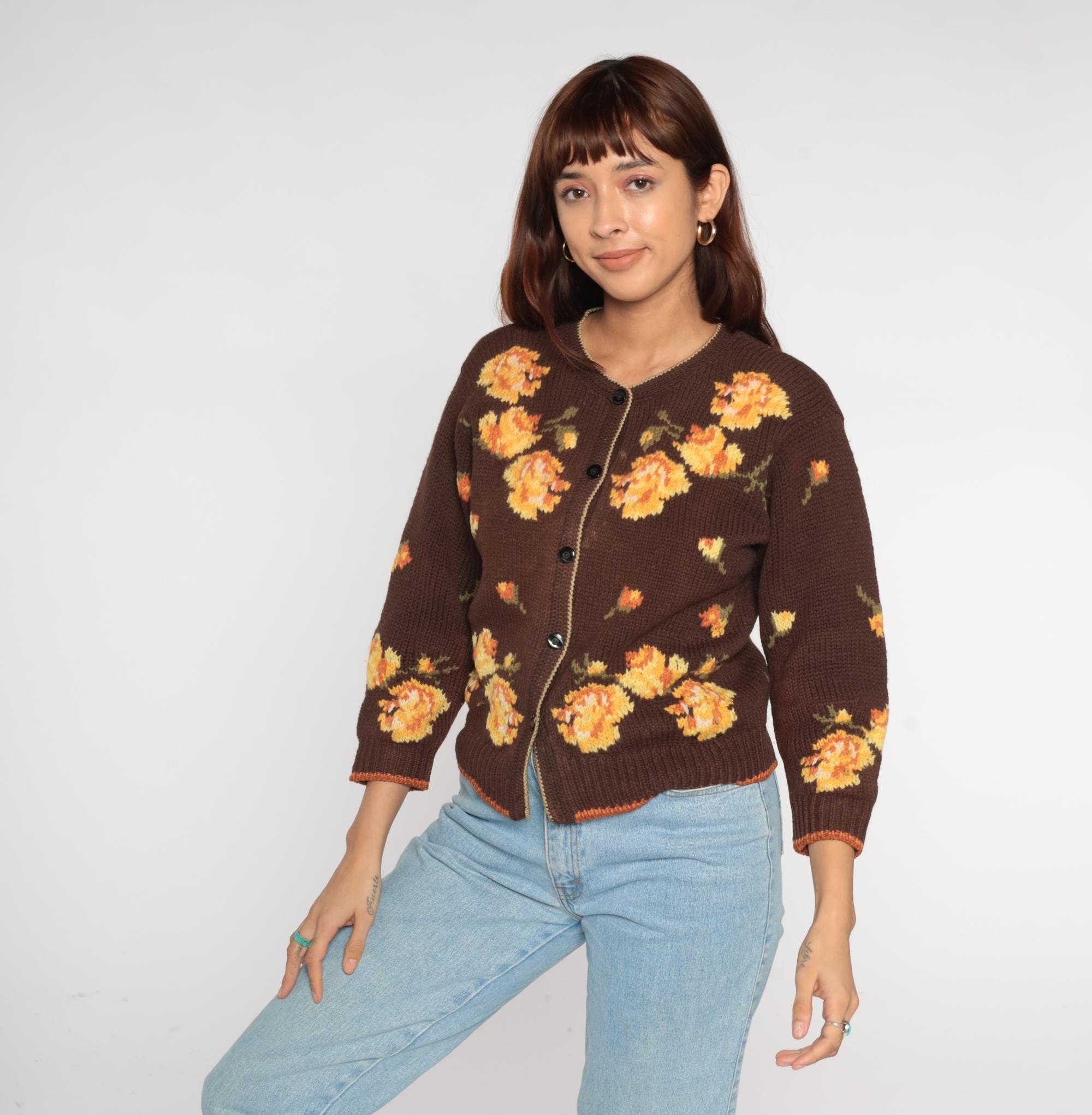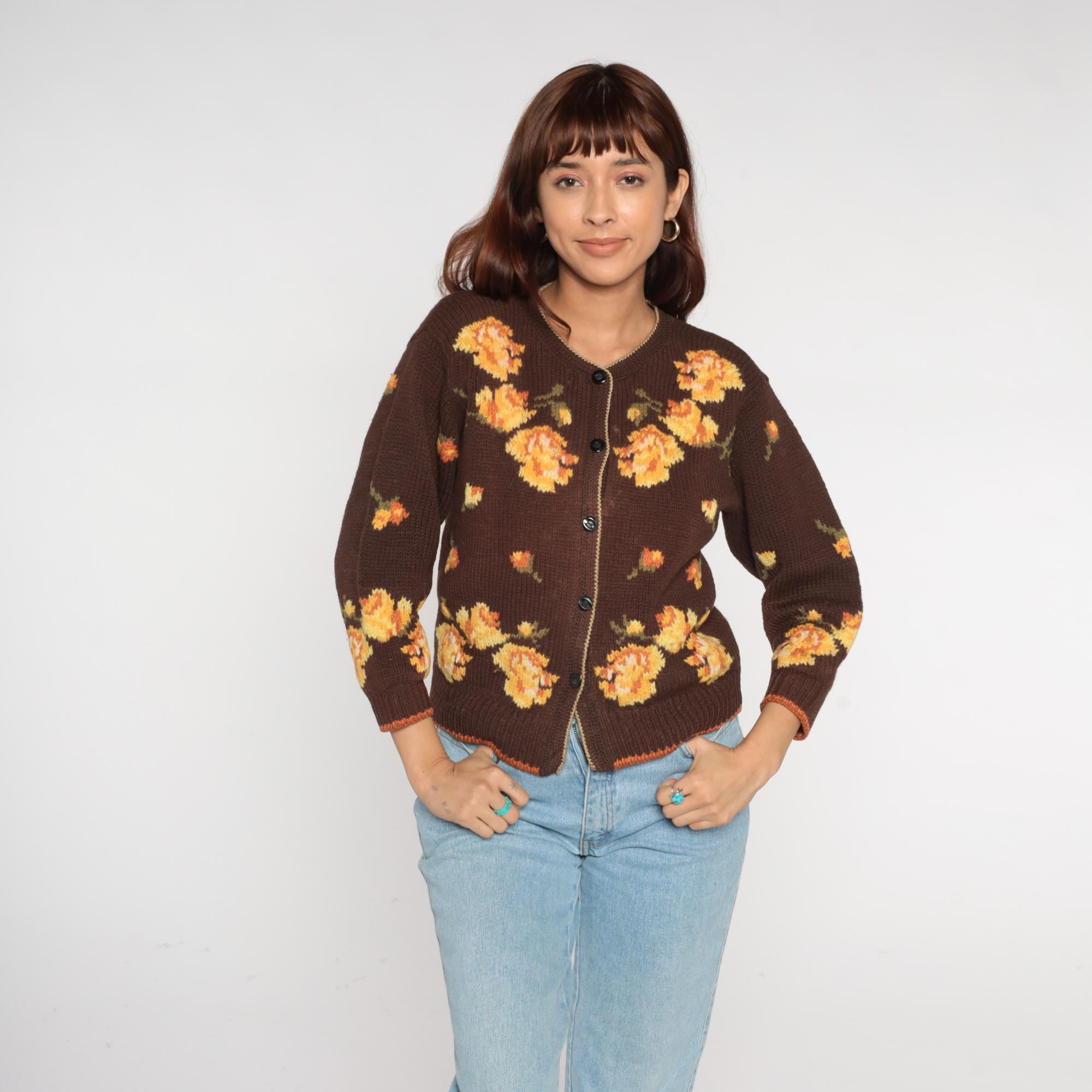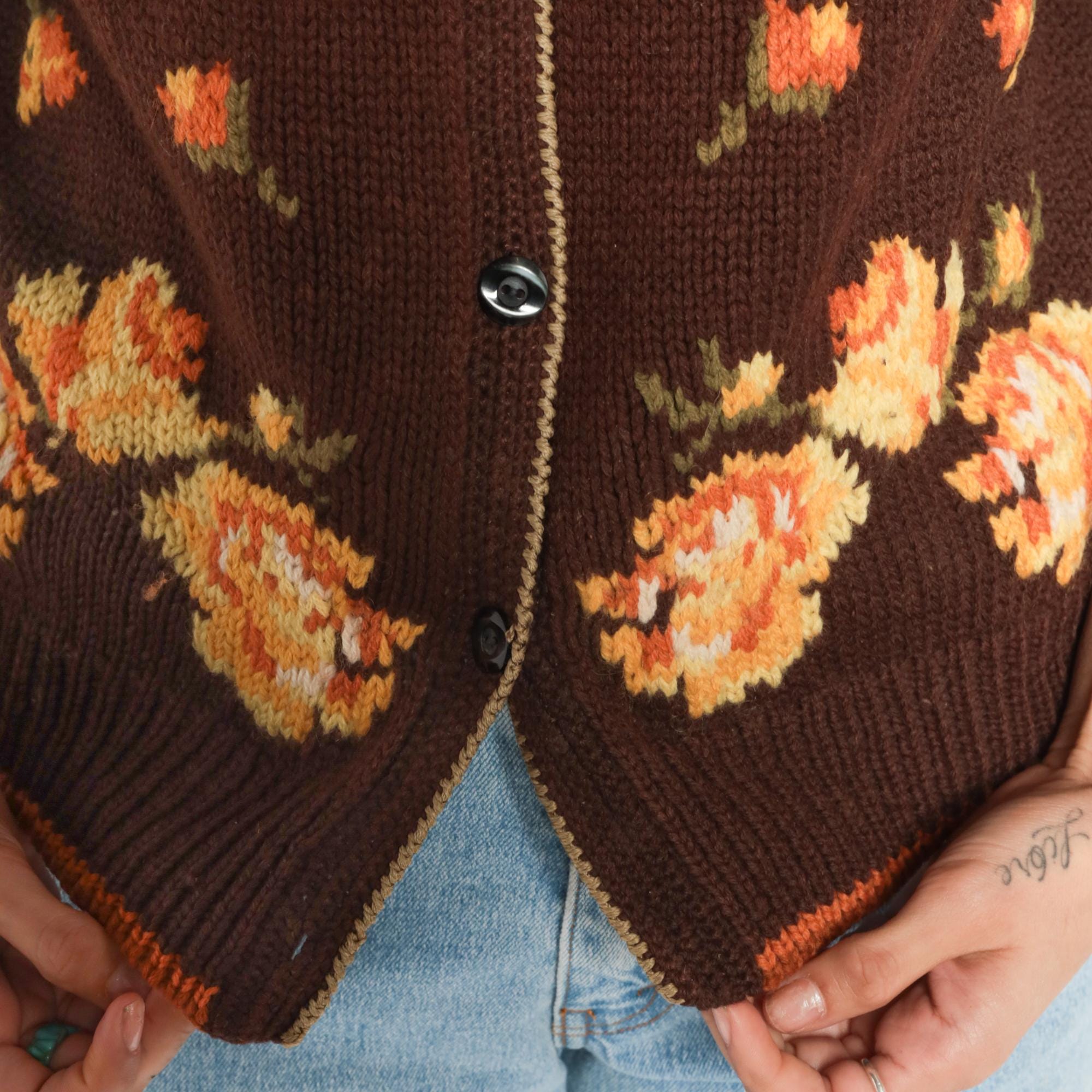 80s floral cardigan from Yirunyuan featuring vibrant orange and yellow flowers on a rich chocolate brown background. Classic V-neck with button front closure (missing bottom button). Contrasting orange trim along the hemline adds a pop of color.